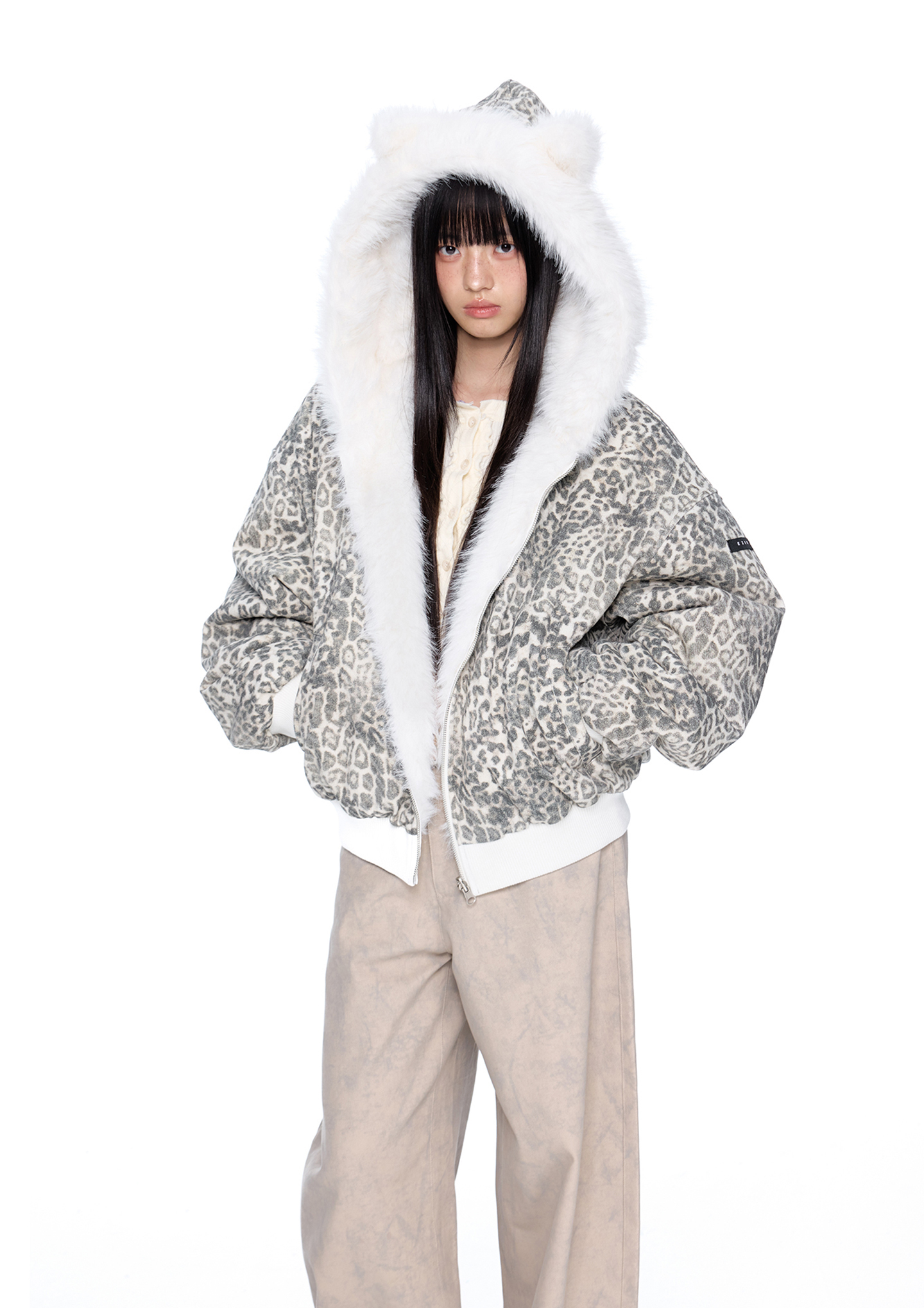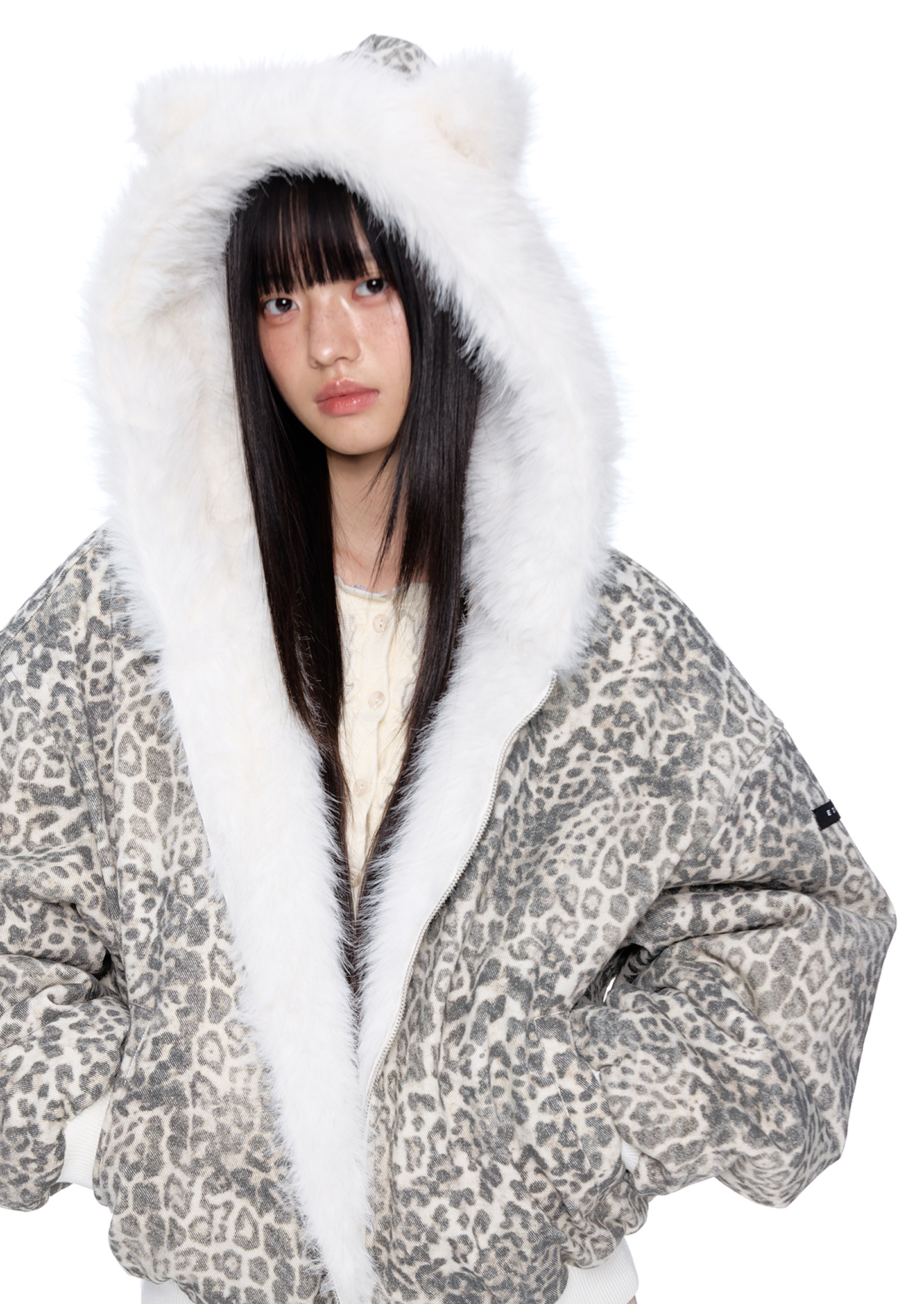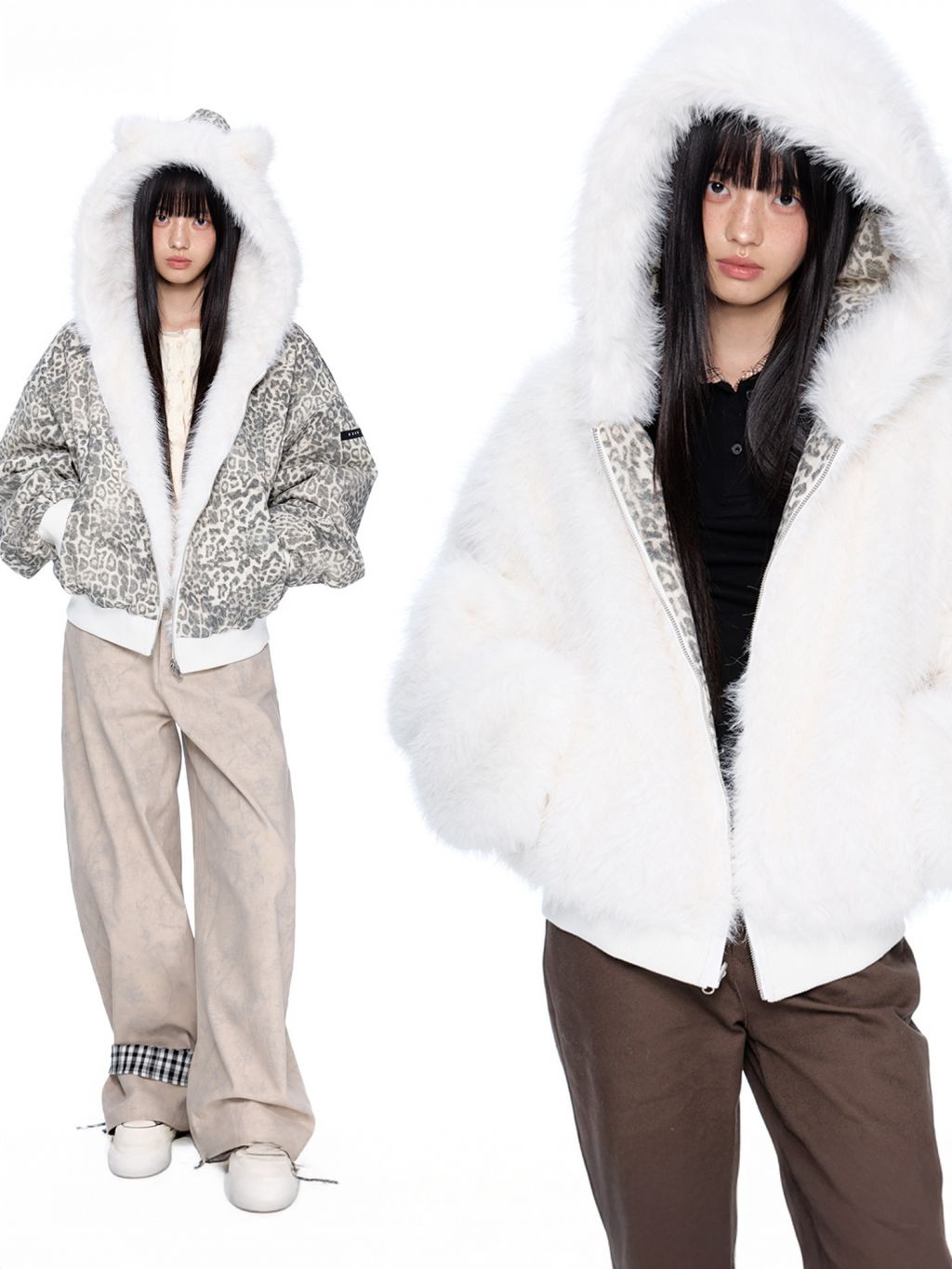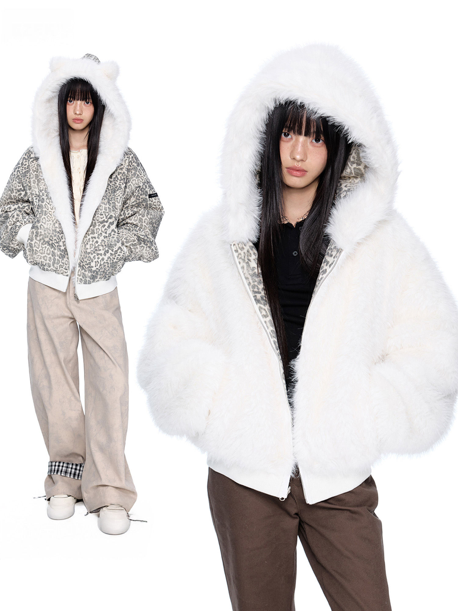 스노우 레오파드 패턴과 폭신한 화이트 퍼를 양면으로 즐길 수 있는 리버서블 디자인에 귀 달린 후드까지 더해진 러블리 윈터 퍼 자켓입니다.