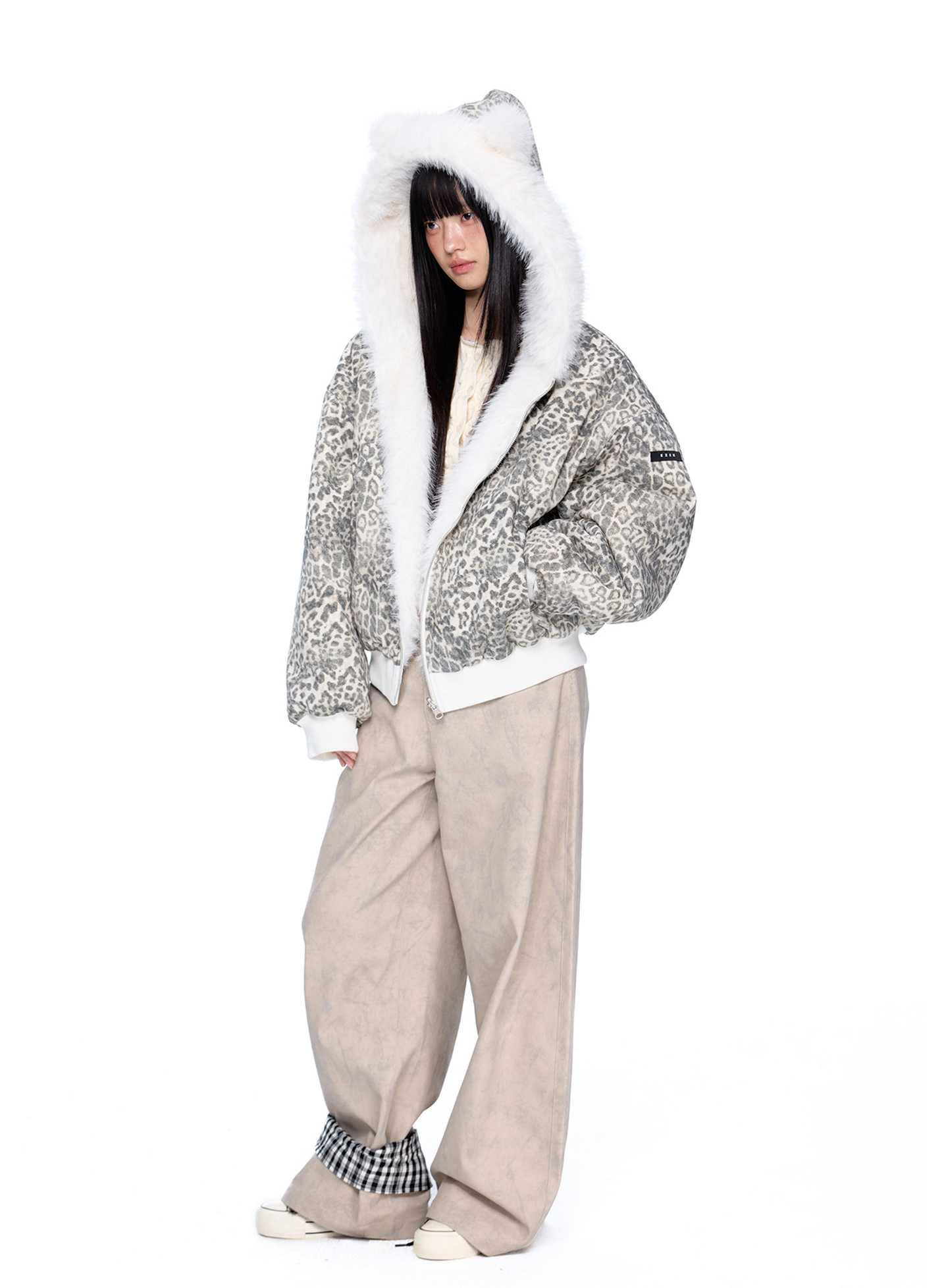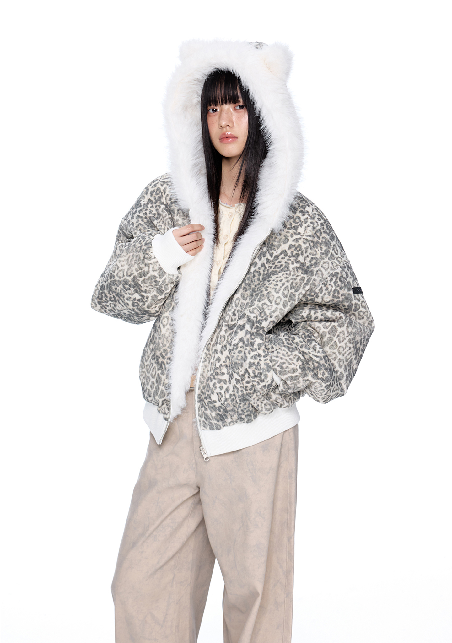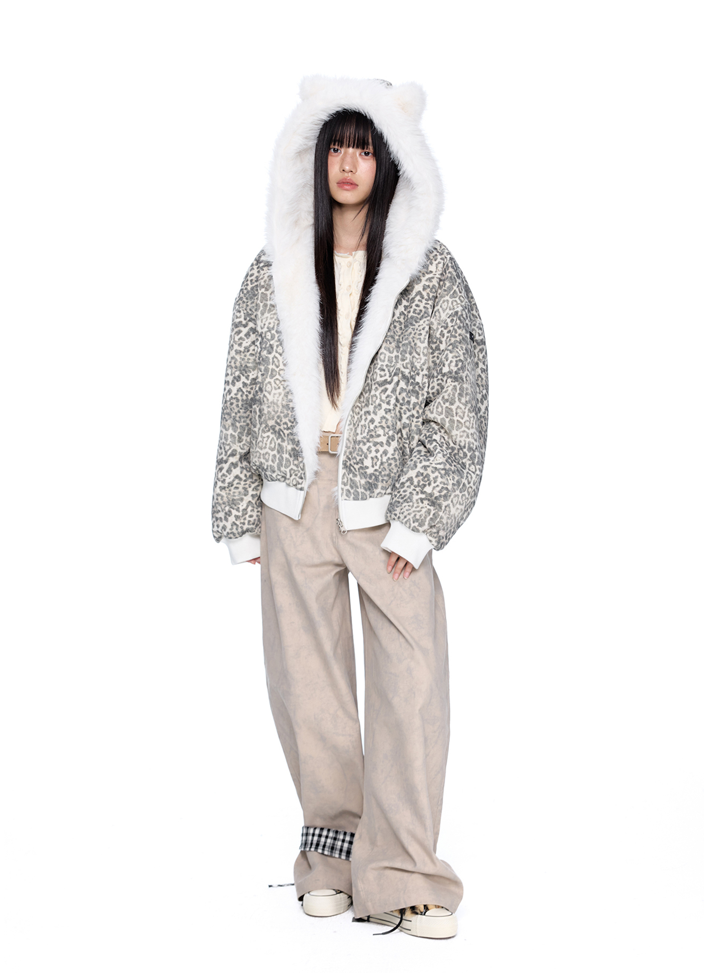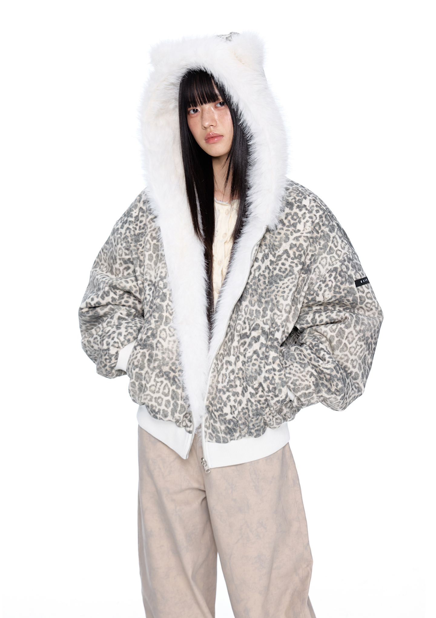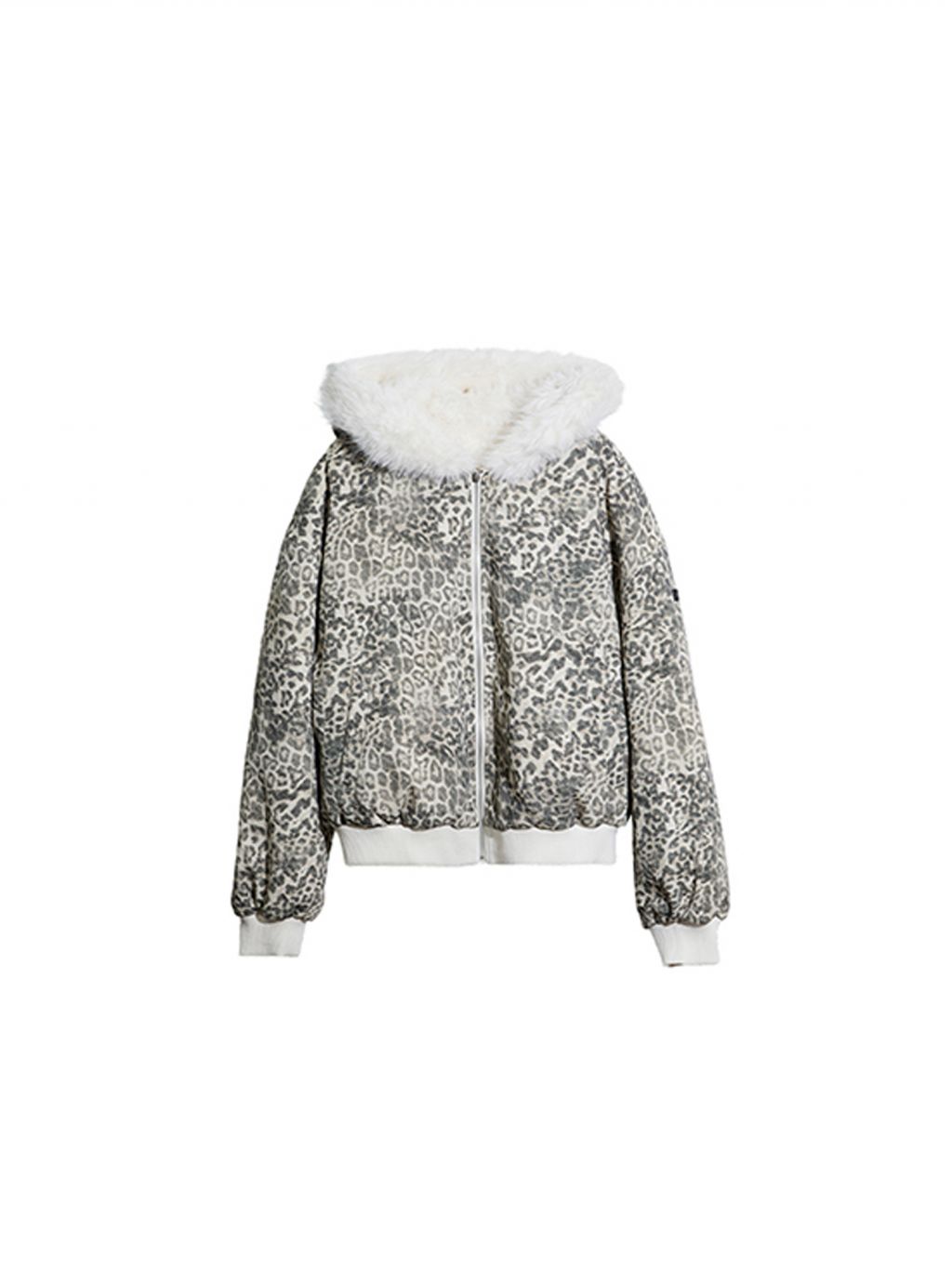 스노우 레오파드 패턴과 폭신한 화이트 퍼를 양면으로 즐길 수 있는 리버서블 디자인에 귀 달린 후드까지 더해진 러블리 윈터 퍼 자켓입니다.