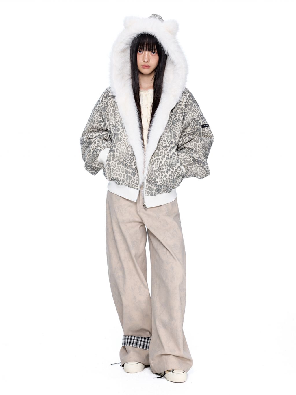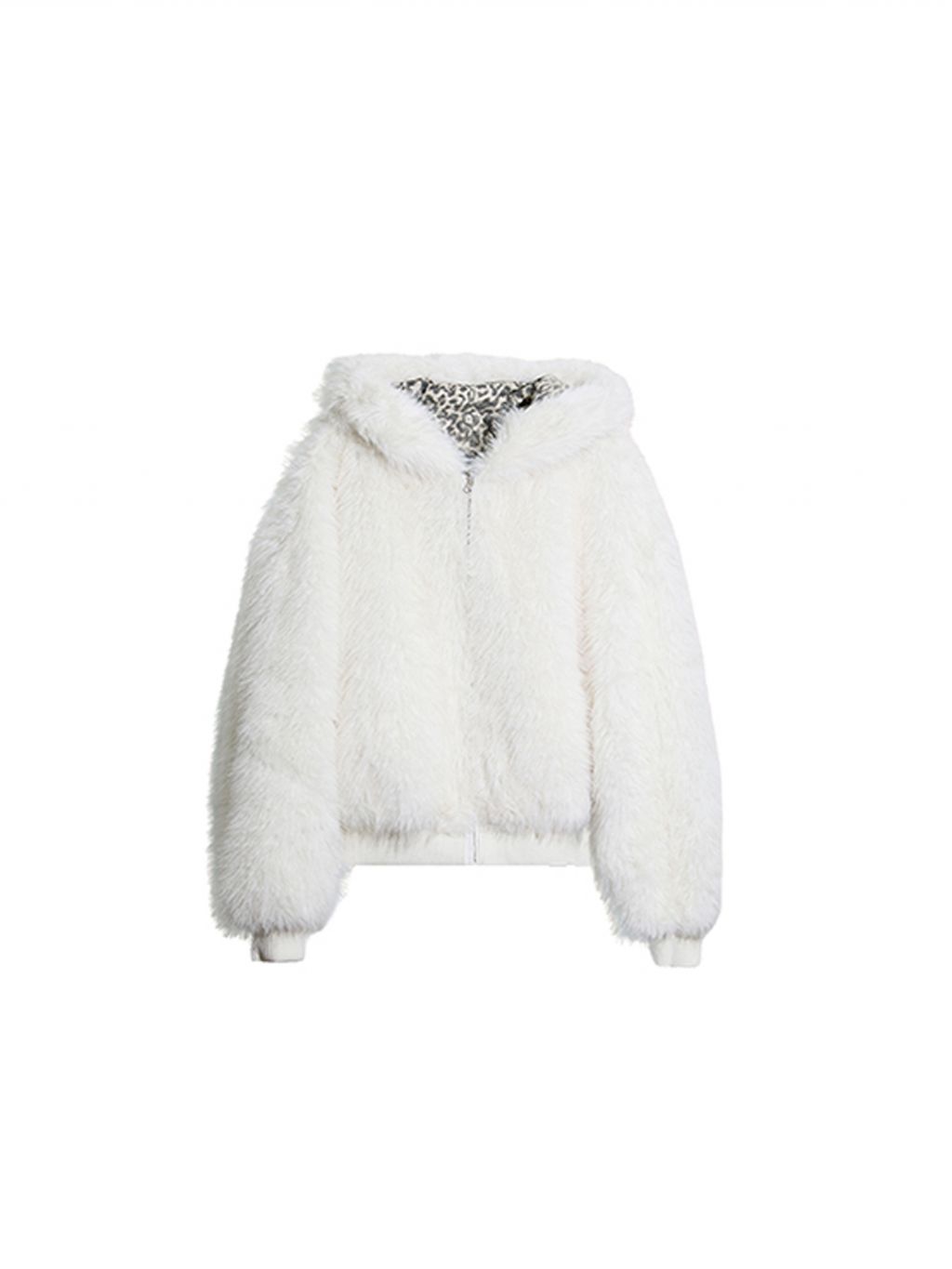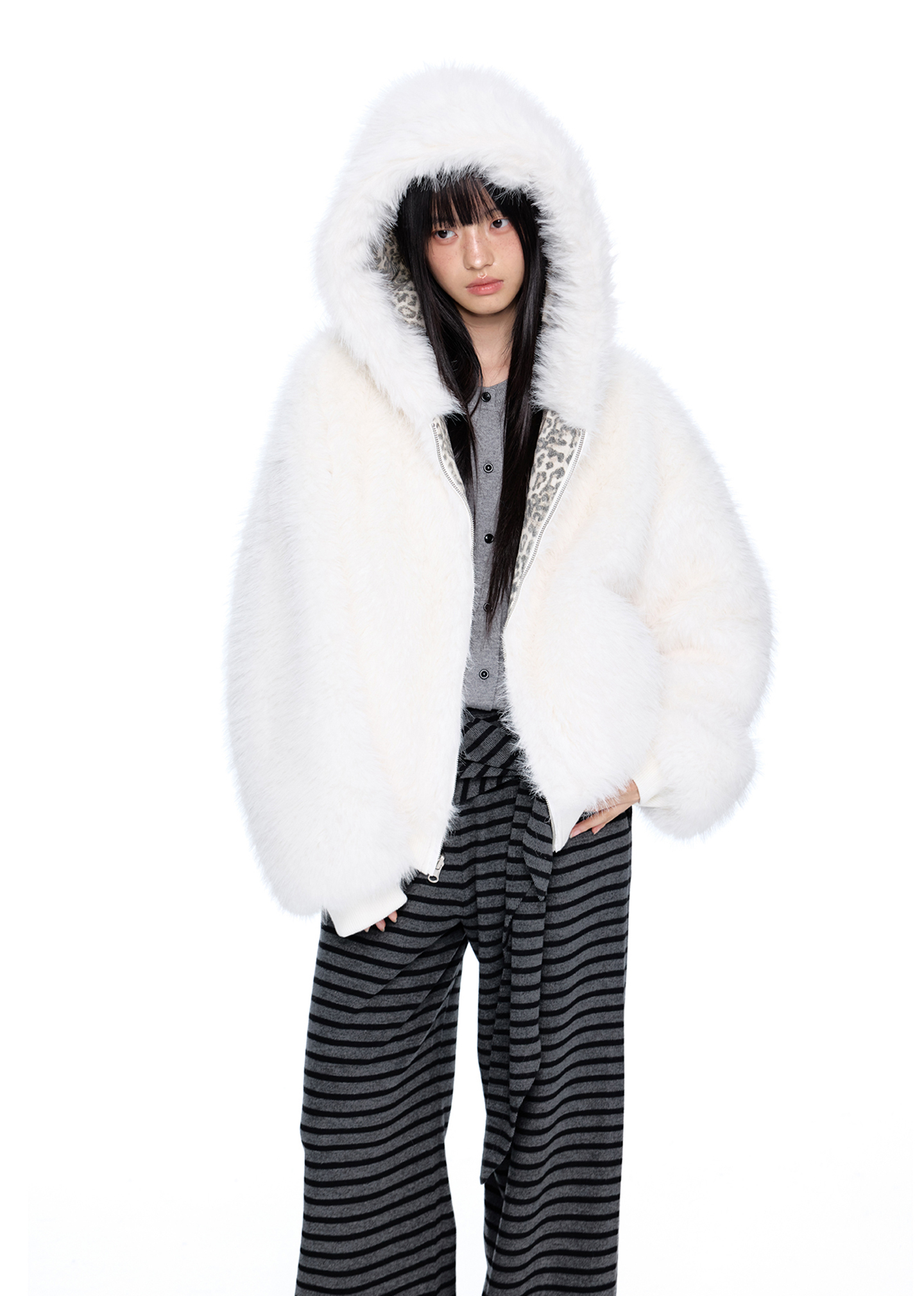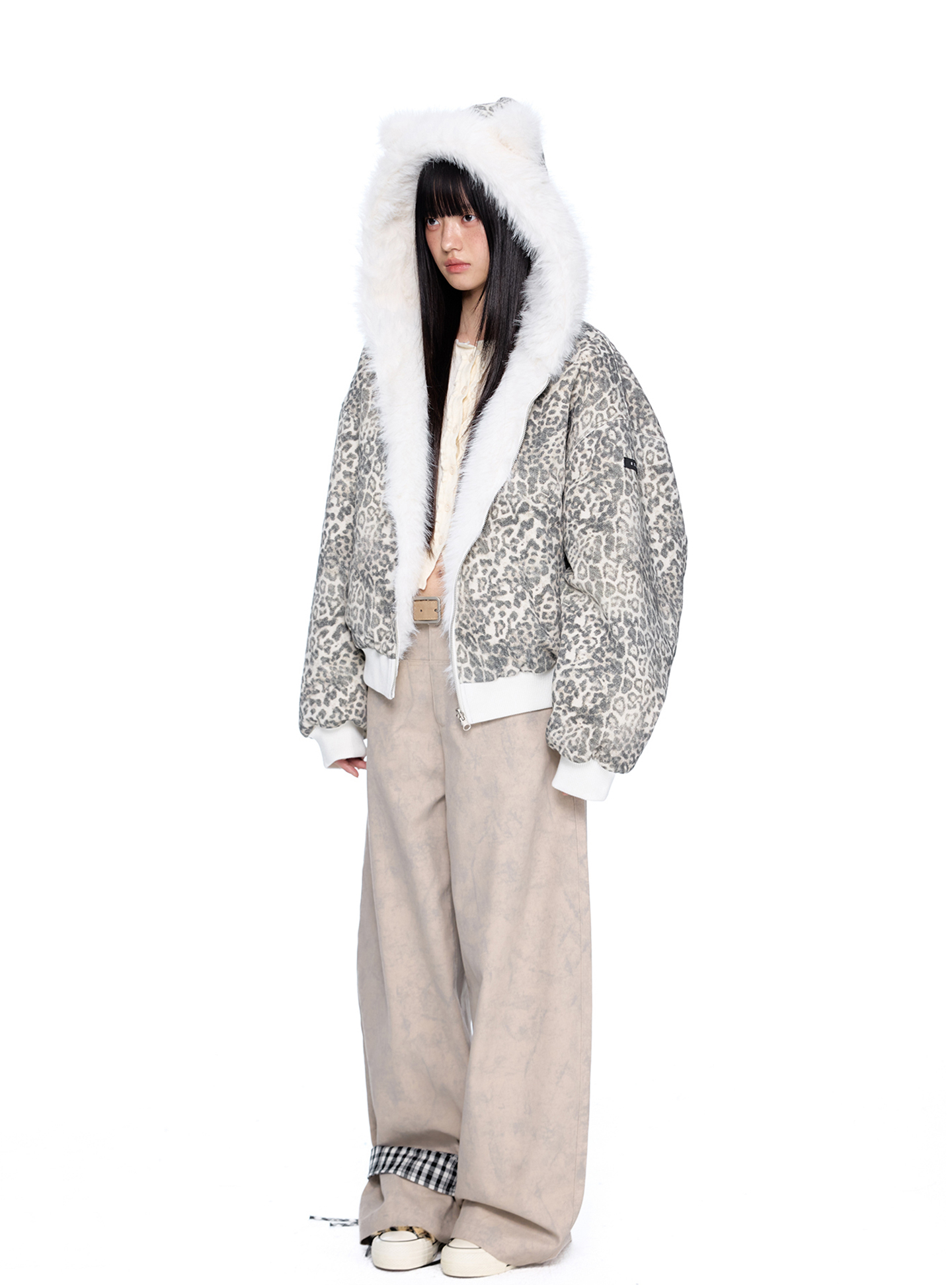 스노우 레오파드 패턴과 폭신한 화이트 퍼를 양면으로 즐길 수 있는 리버서블 디자인에 귀 달린 후드까지 더해진 러블리 윈터 퍼 자켓입니다.