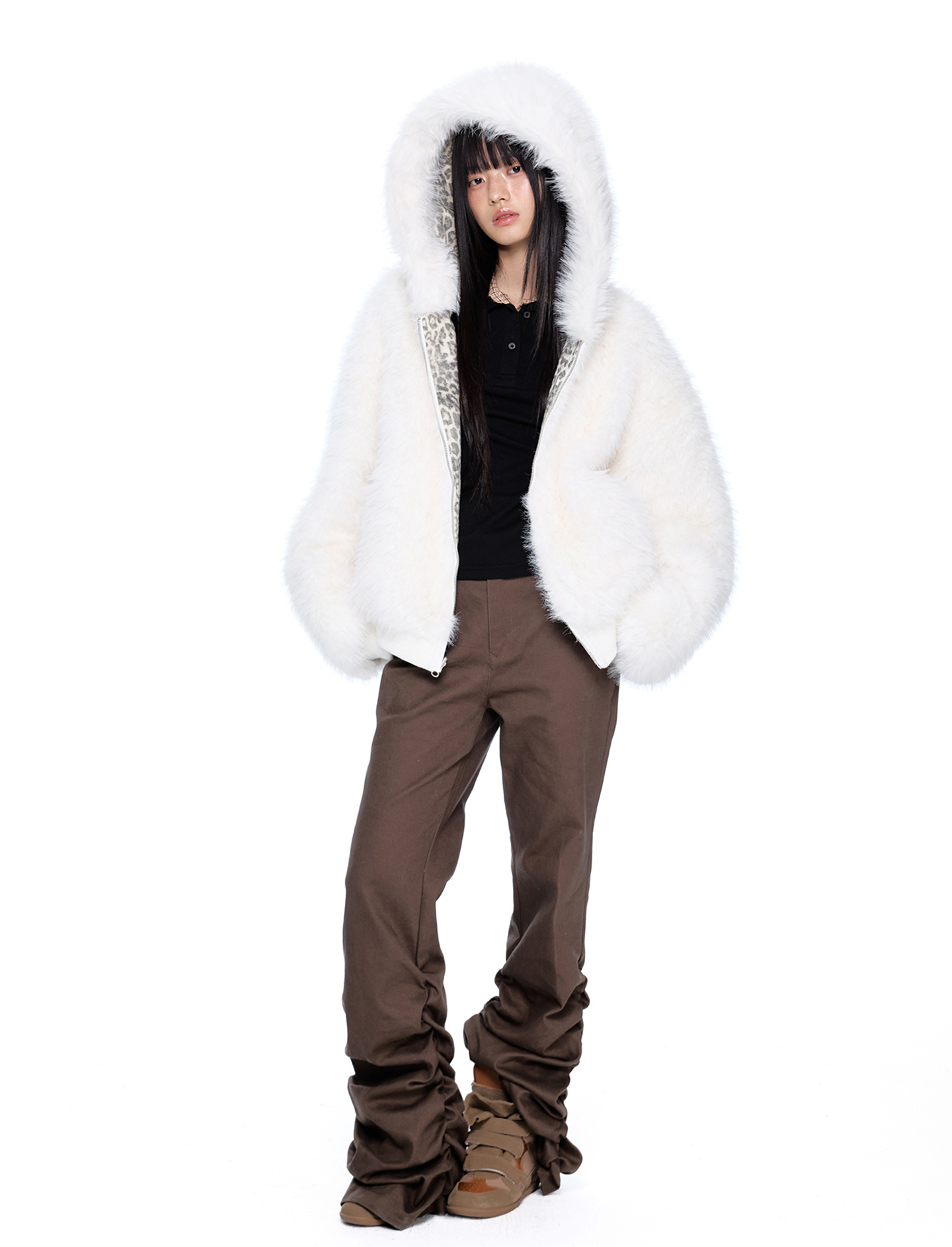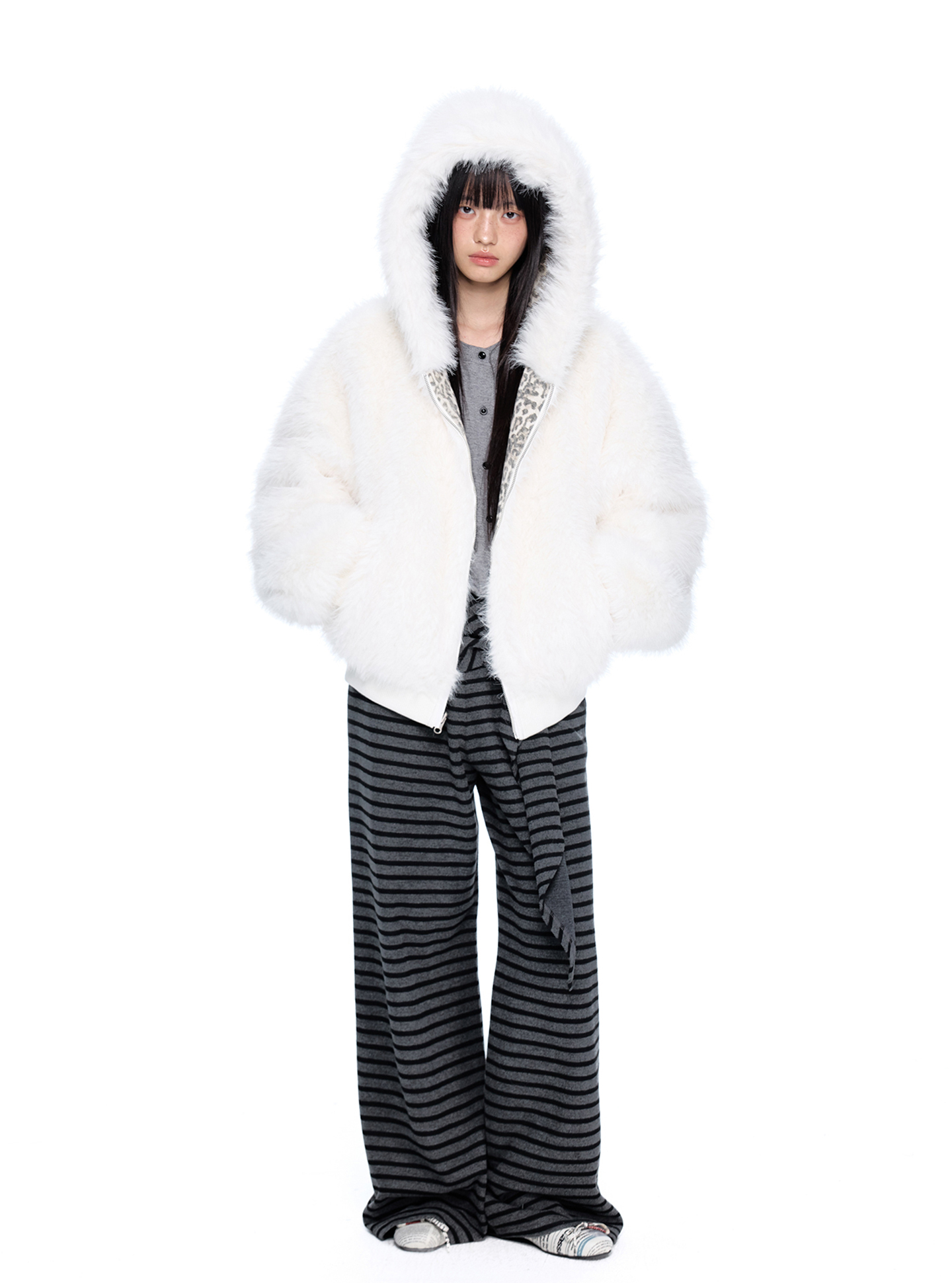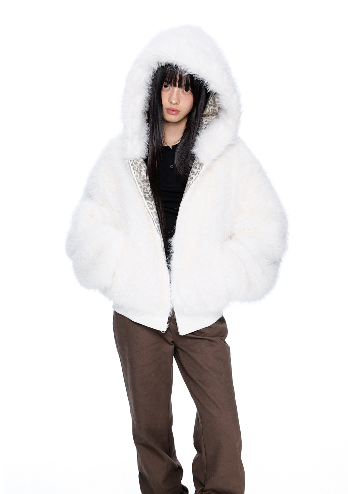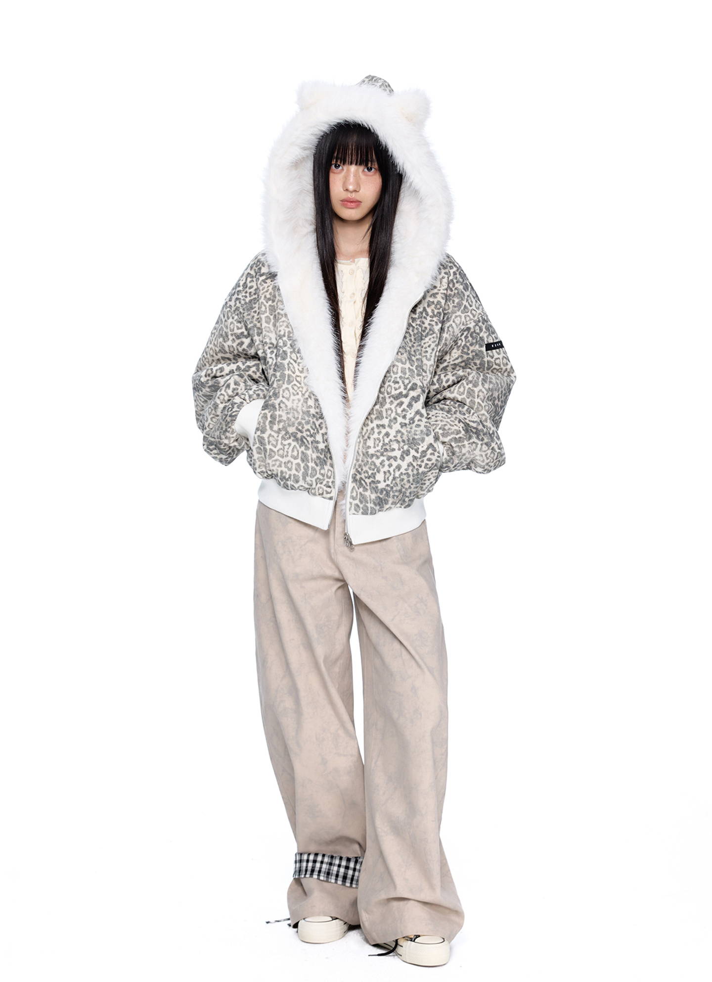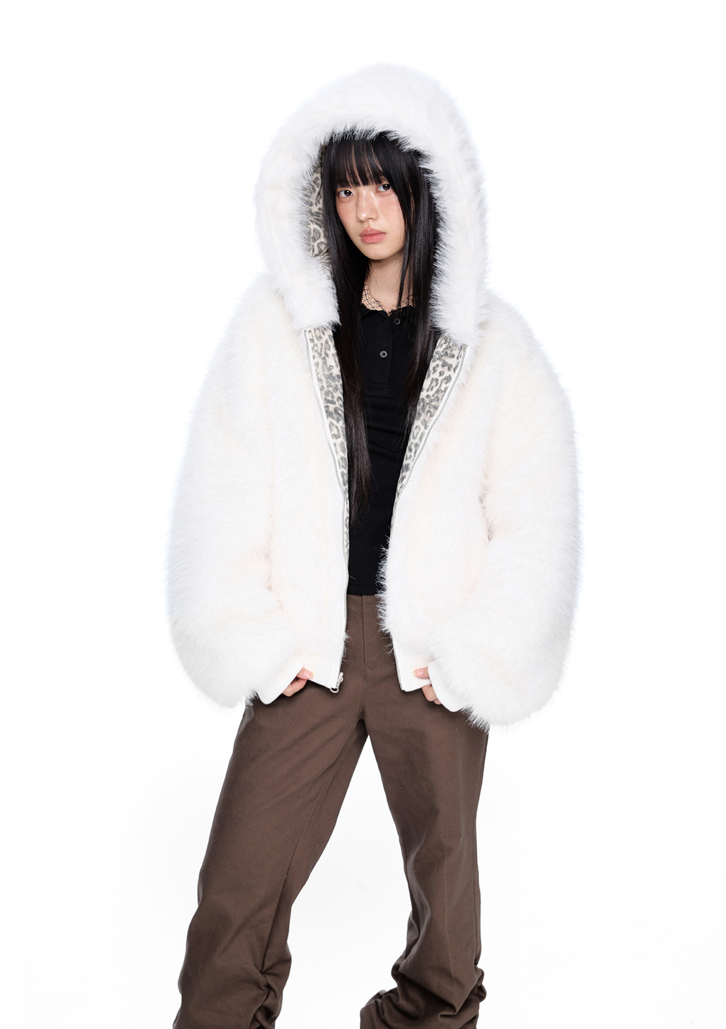 스노우 레오파드 패턴과 폭신한 화이트 퍼를 양면으로 즐길 수 있는 리버서블 디자인에 귀 달린 후드까지 더해진 러블리 윈터 퍼 자켓입니다.