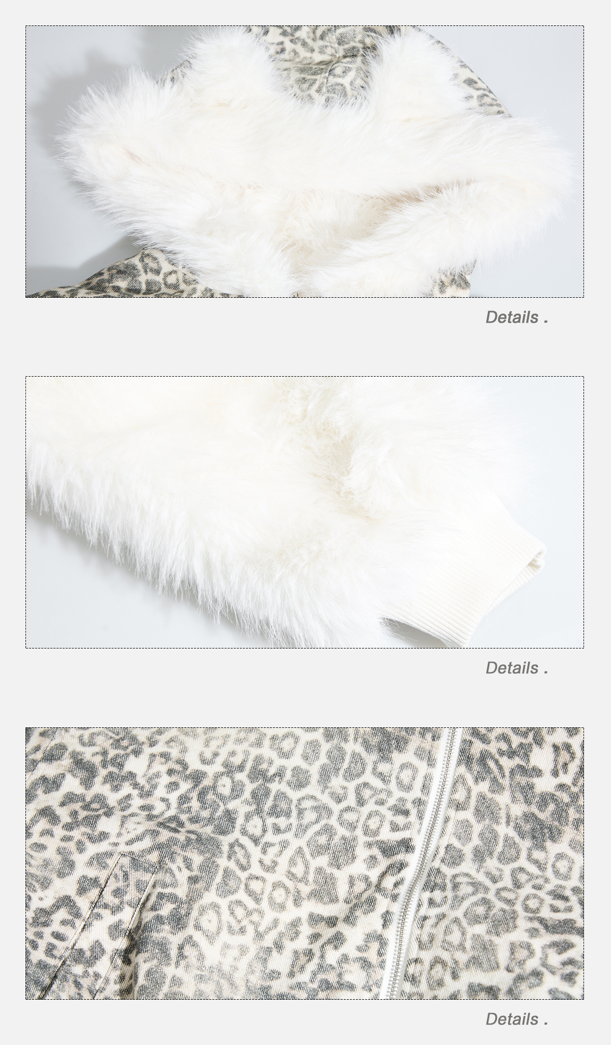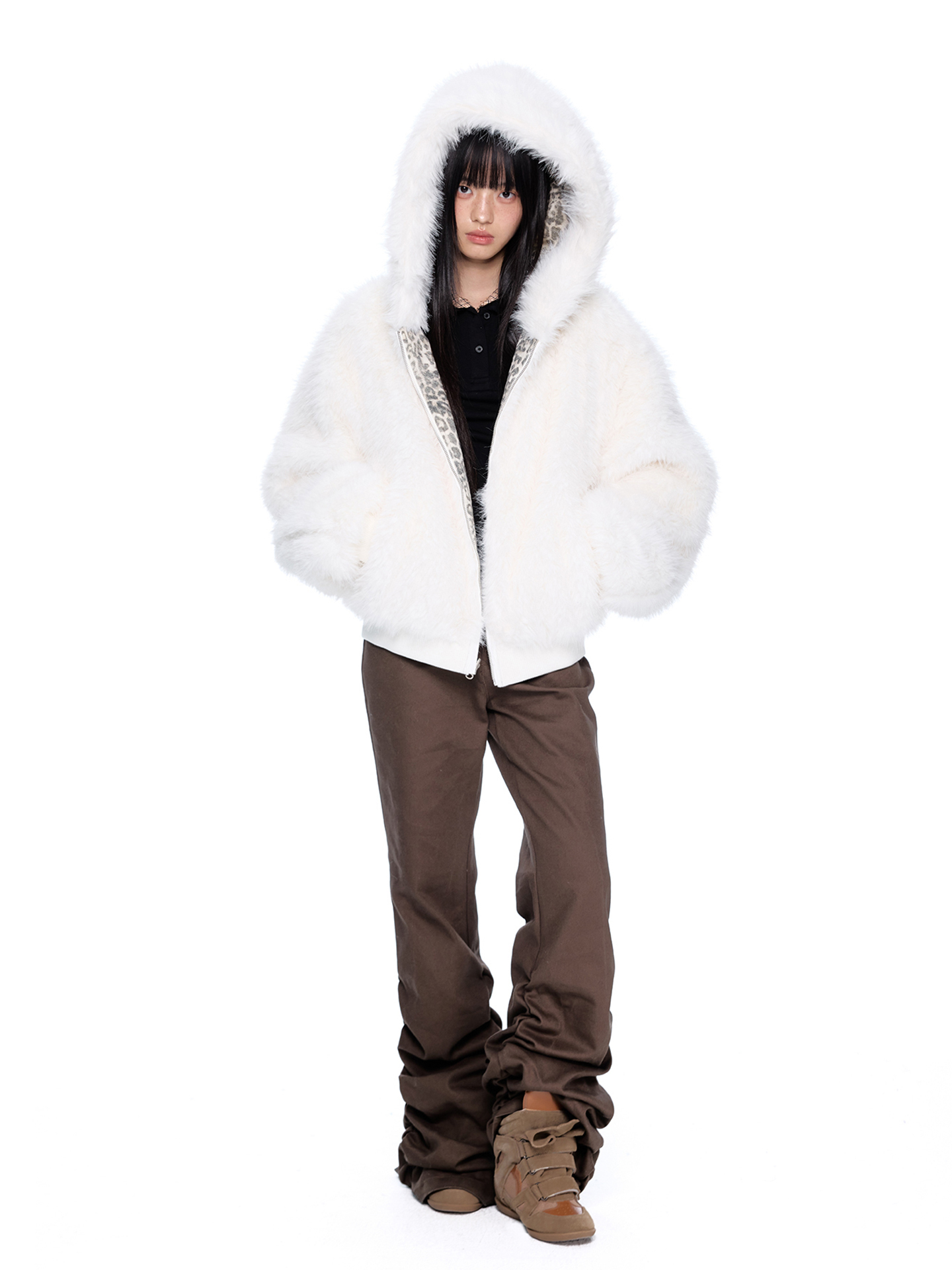 - 스노우 레오파드 패턴 & 화이트 퍼를 모두 활용할 수 있는 리버서블(양면 착용) 디자인