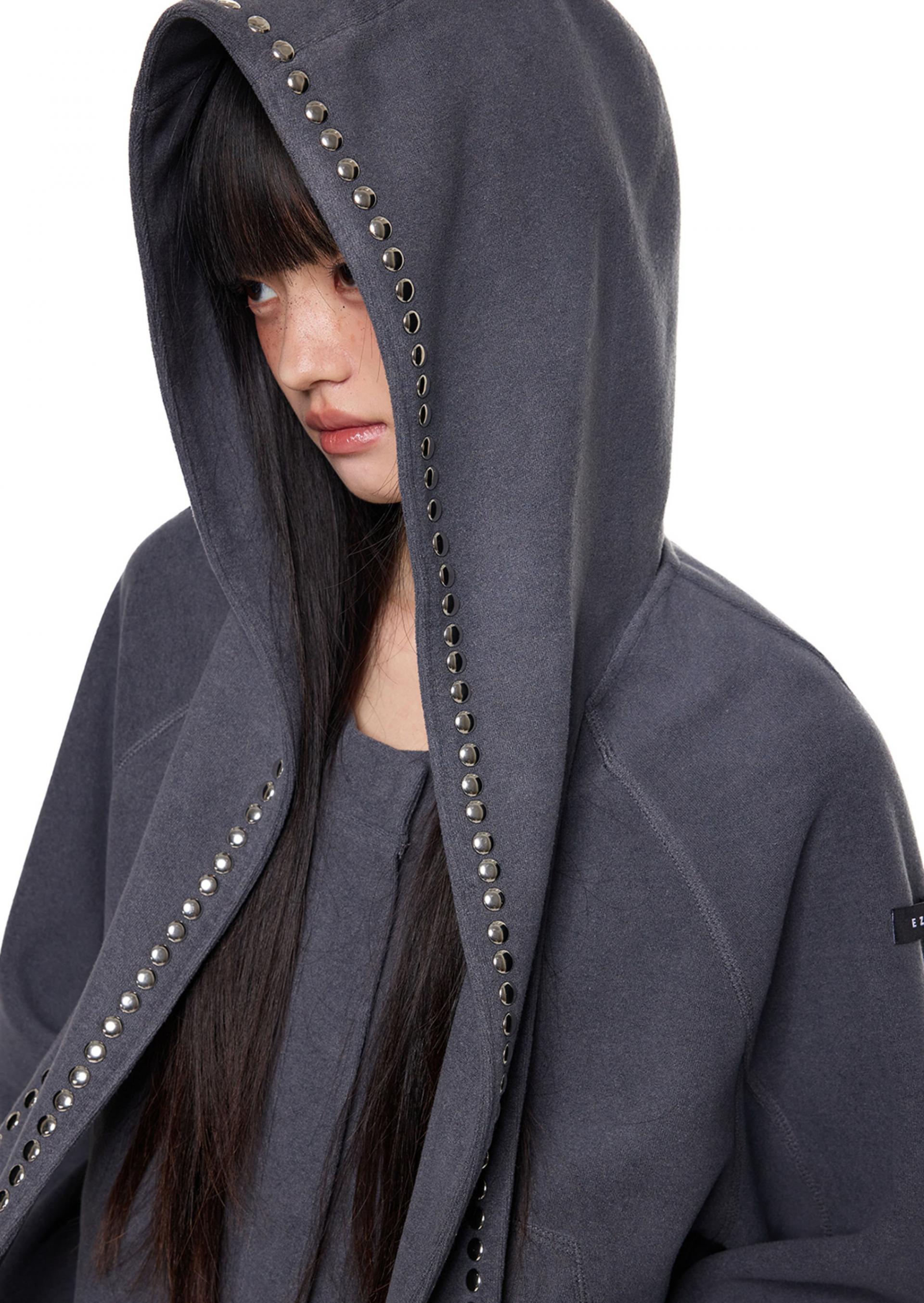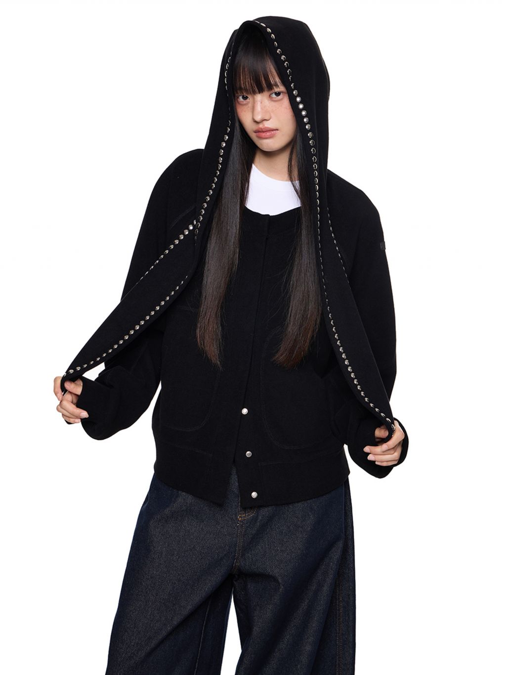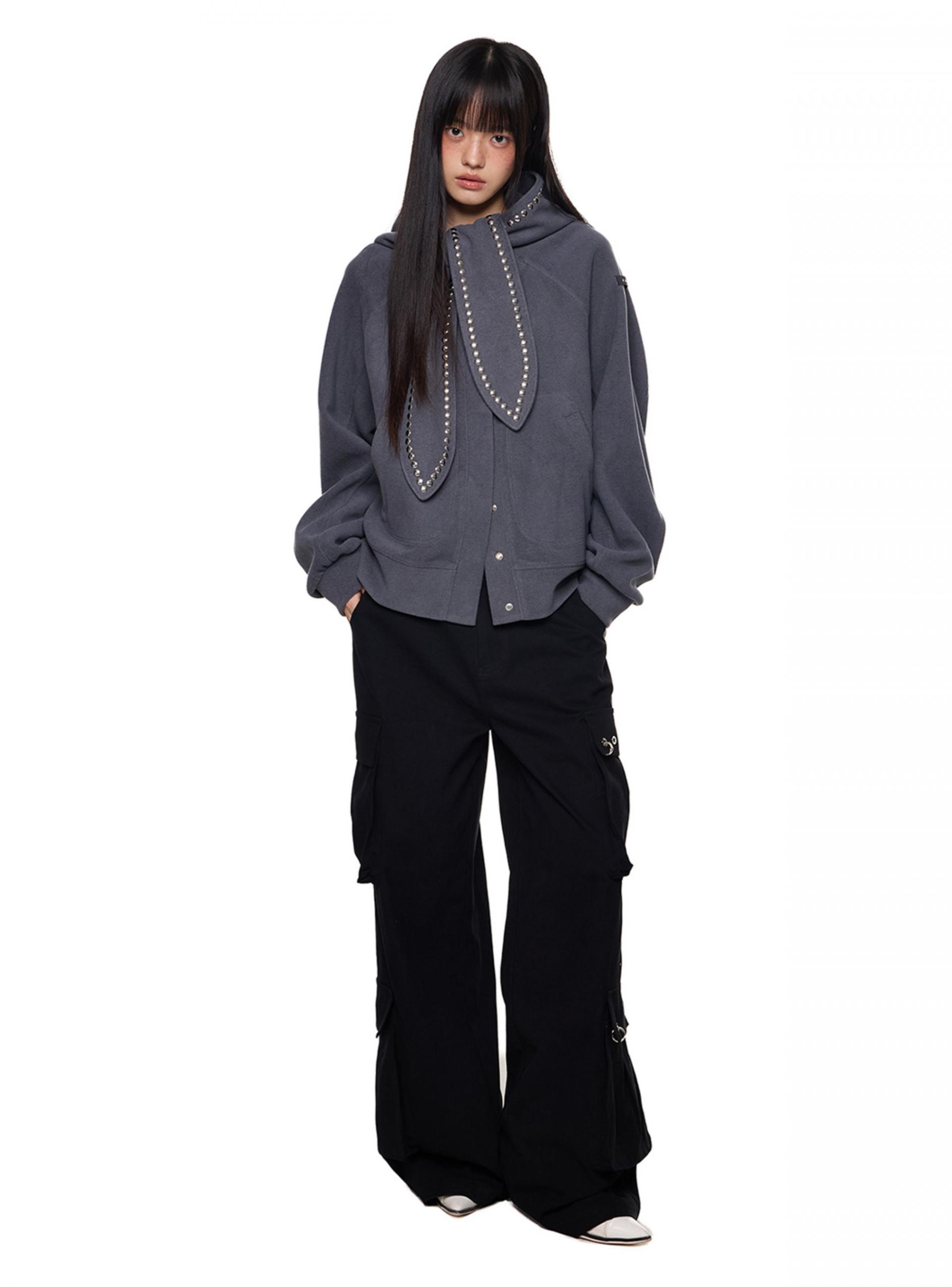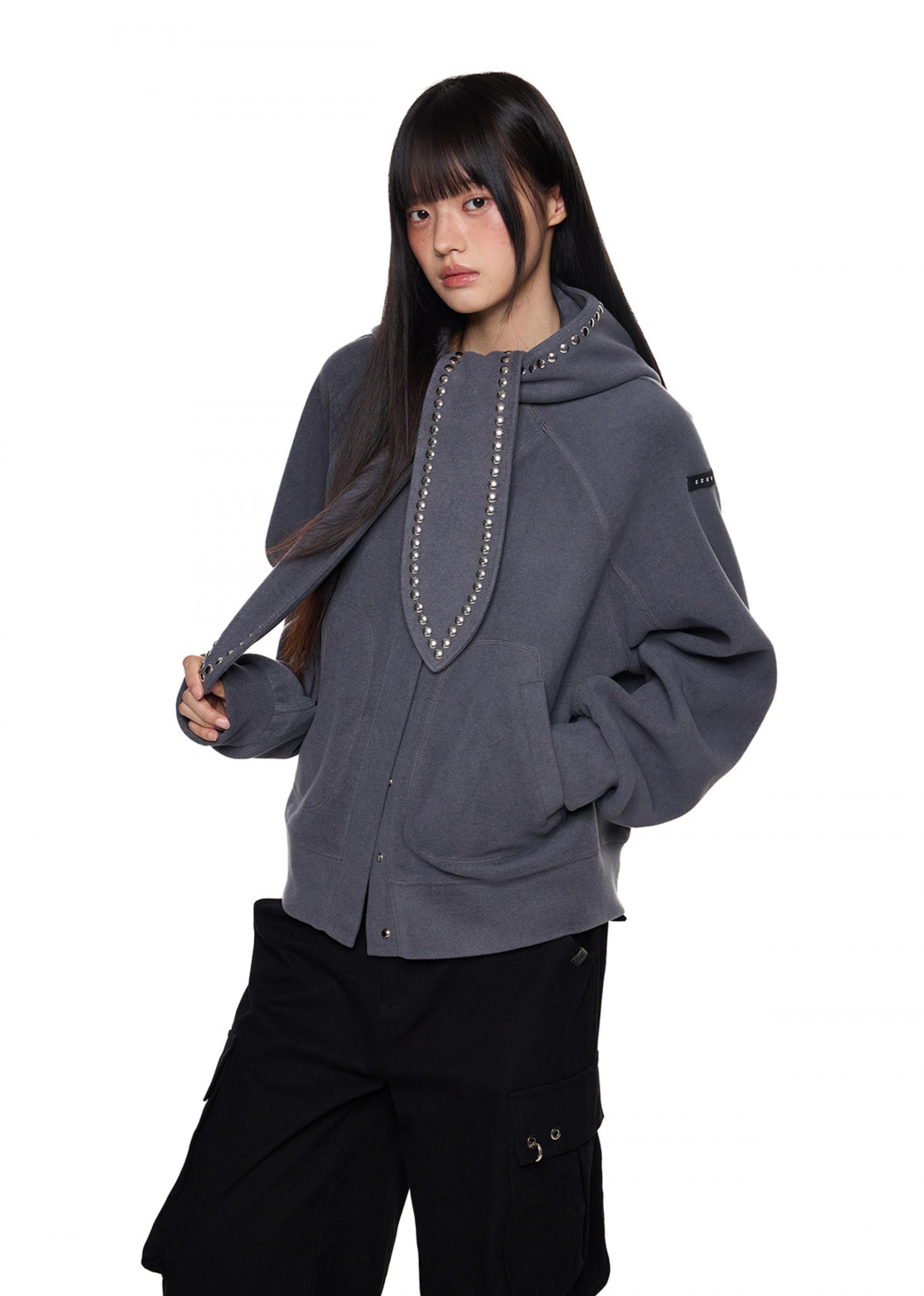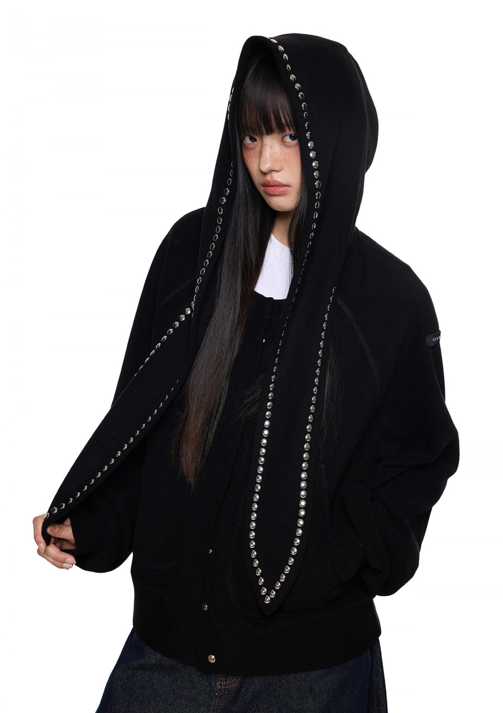 스카프처럼 길게 떨어지는 스트랩 후드에 스터드 라인을 더해 키치하고 존재감 있는 실루엣을 완성한 후디 가디건입니다.