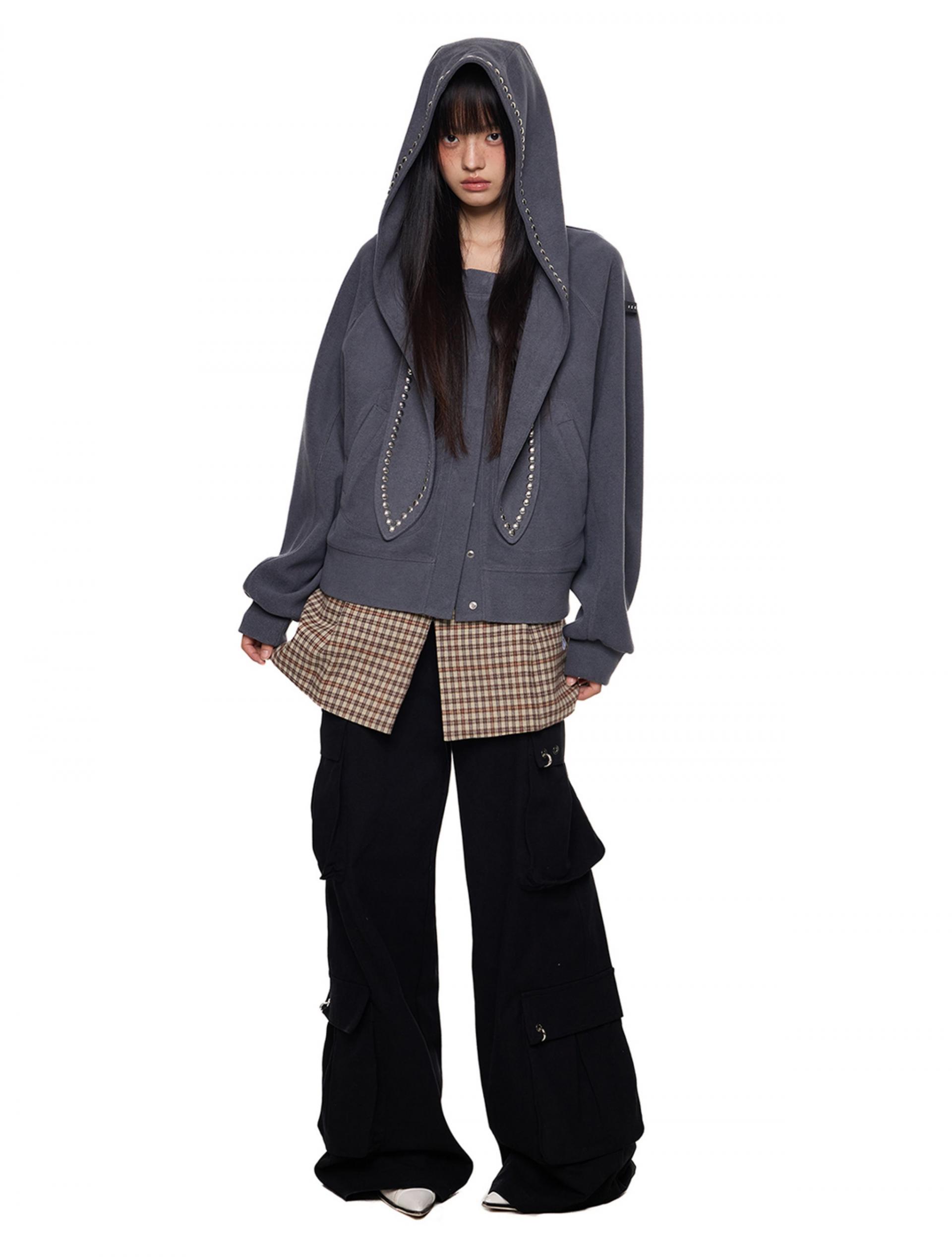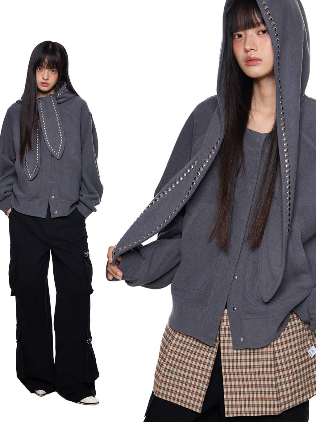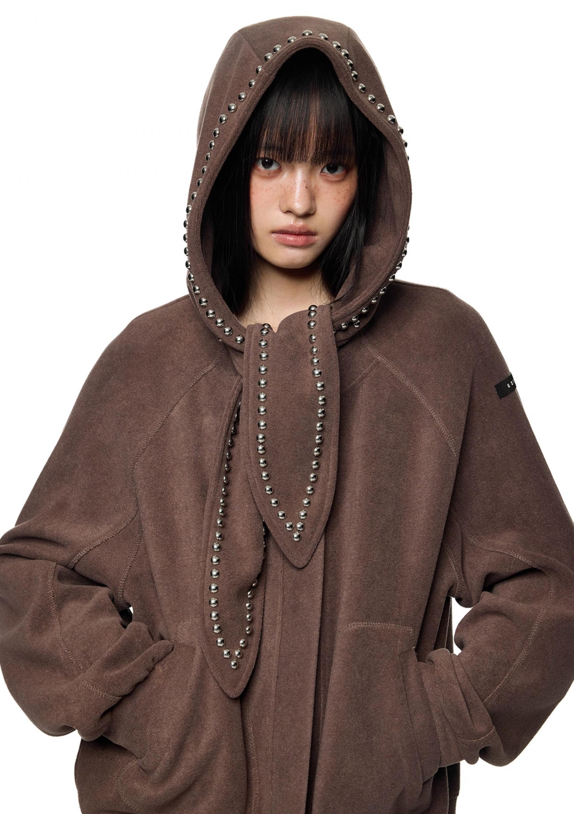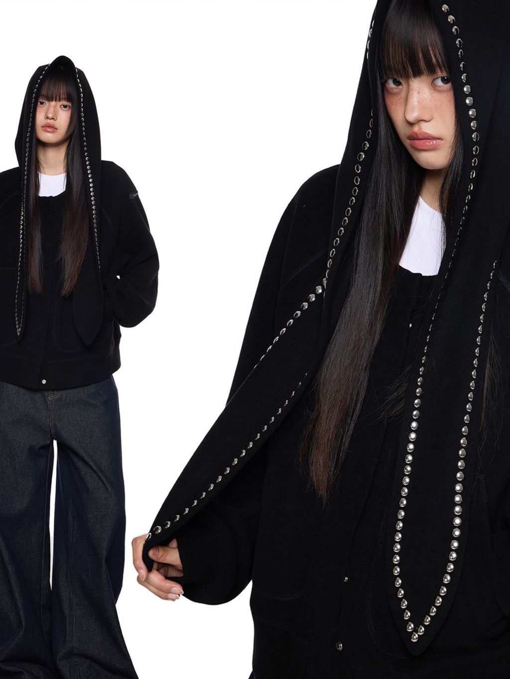 스카프처럼 길게 떨어지는 스트랩 후드에 스터드 라인을 더해 키치하고 존재감 있는 실루엣을 완성한 후디 가디건입니다.