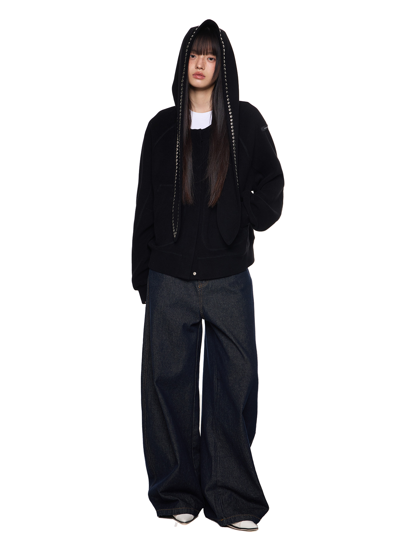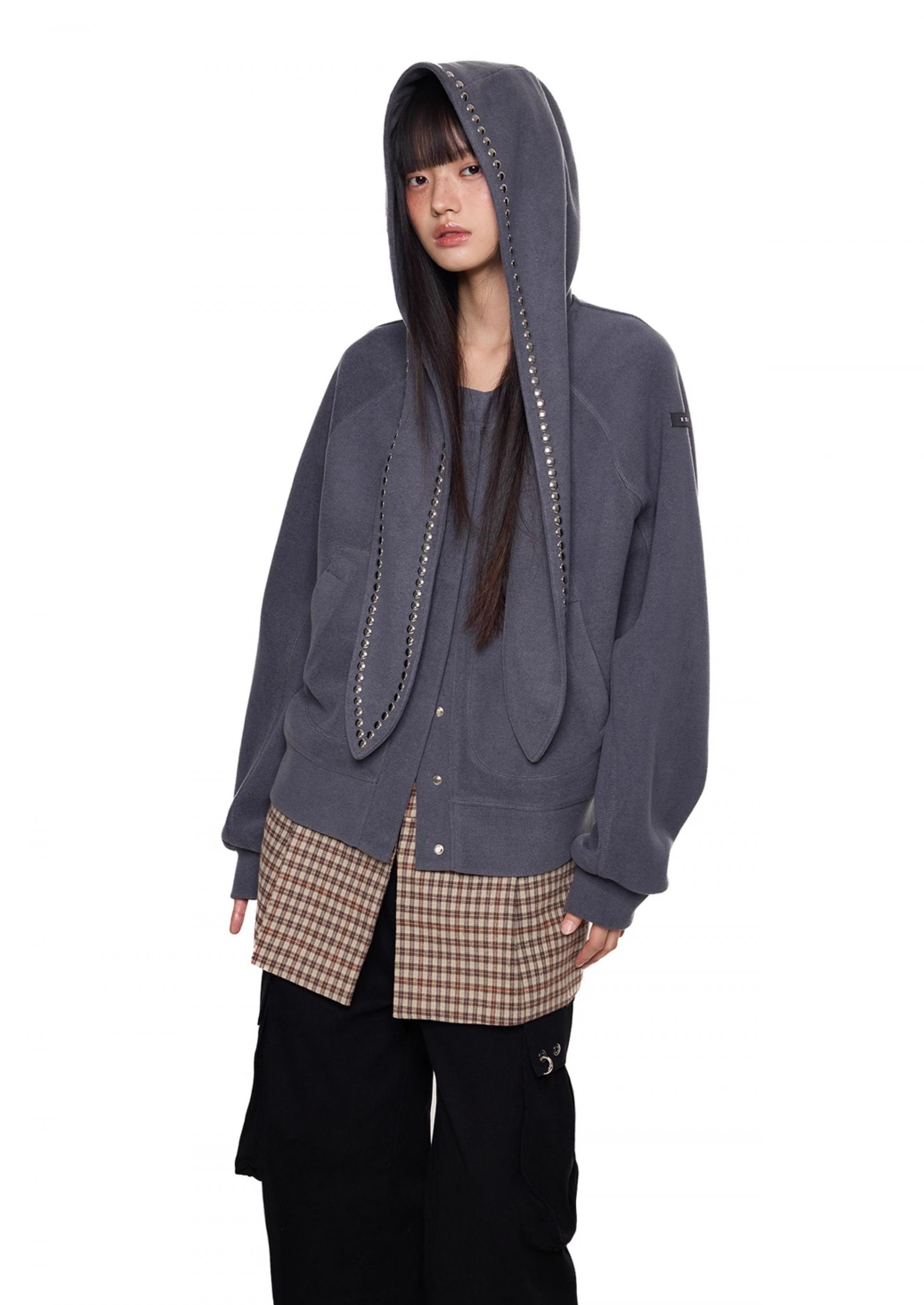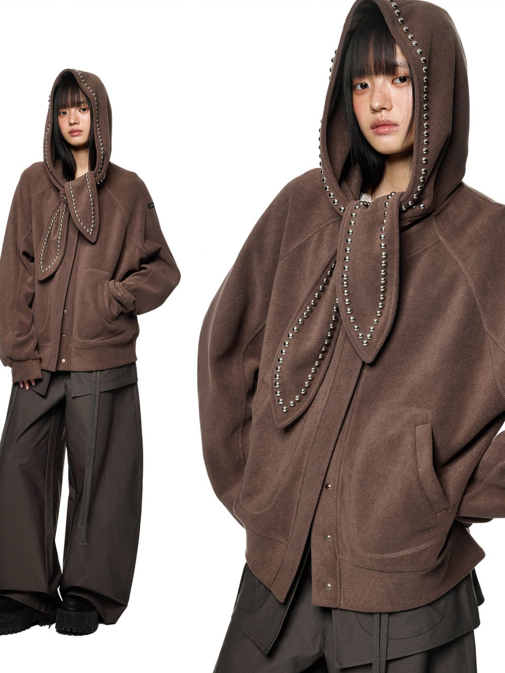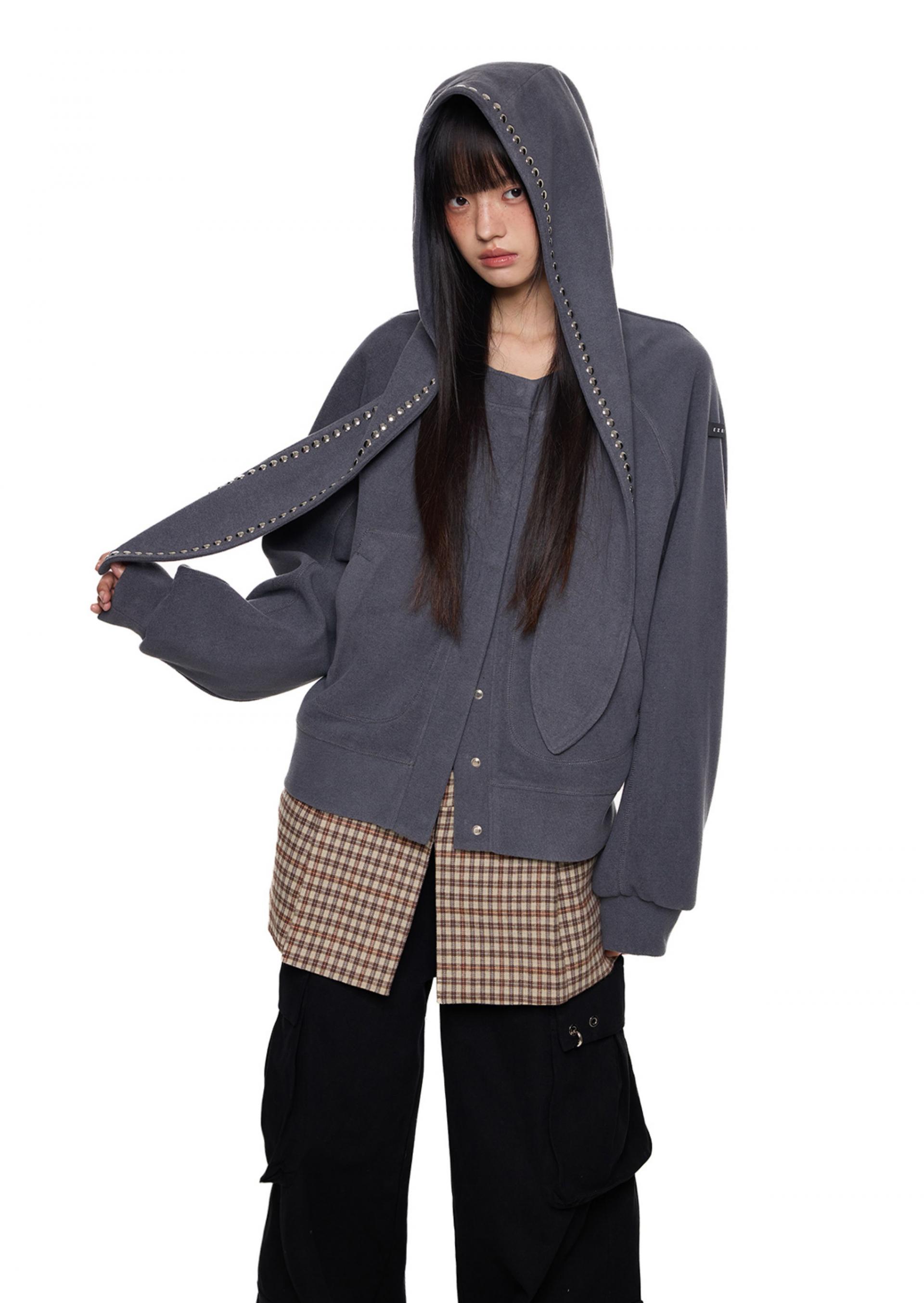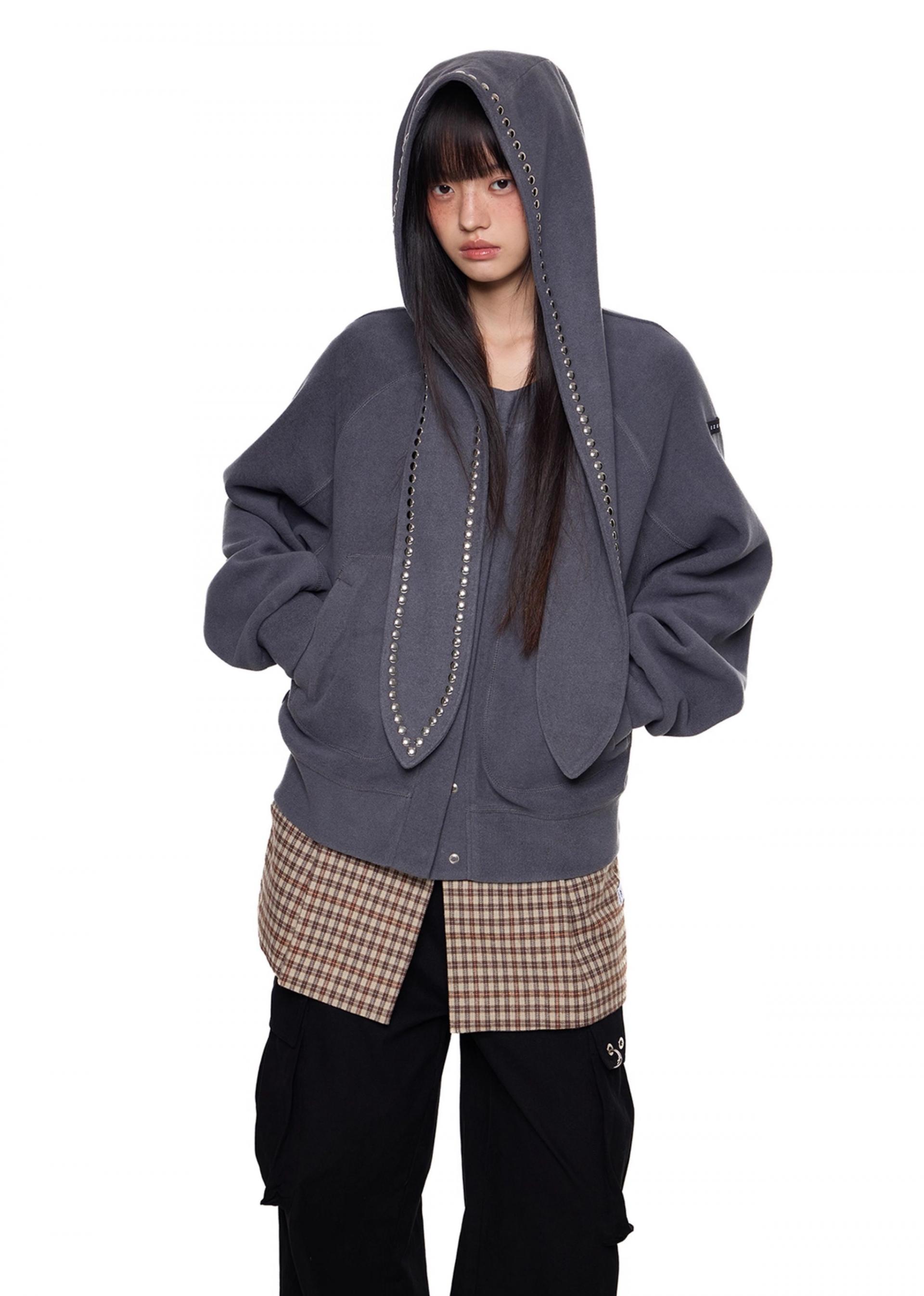 스카프처럼 길게 떨어지는 스트랩 후드에 스터드 라인을 더해 키치하고 존재감 있는 실루엣을 완성한 후디 가디건입니다.