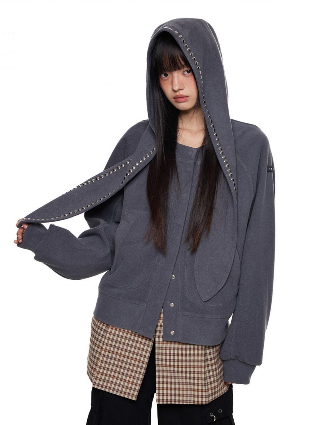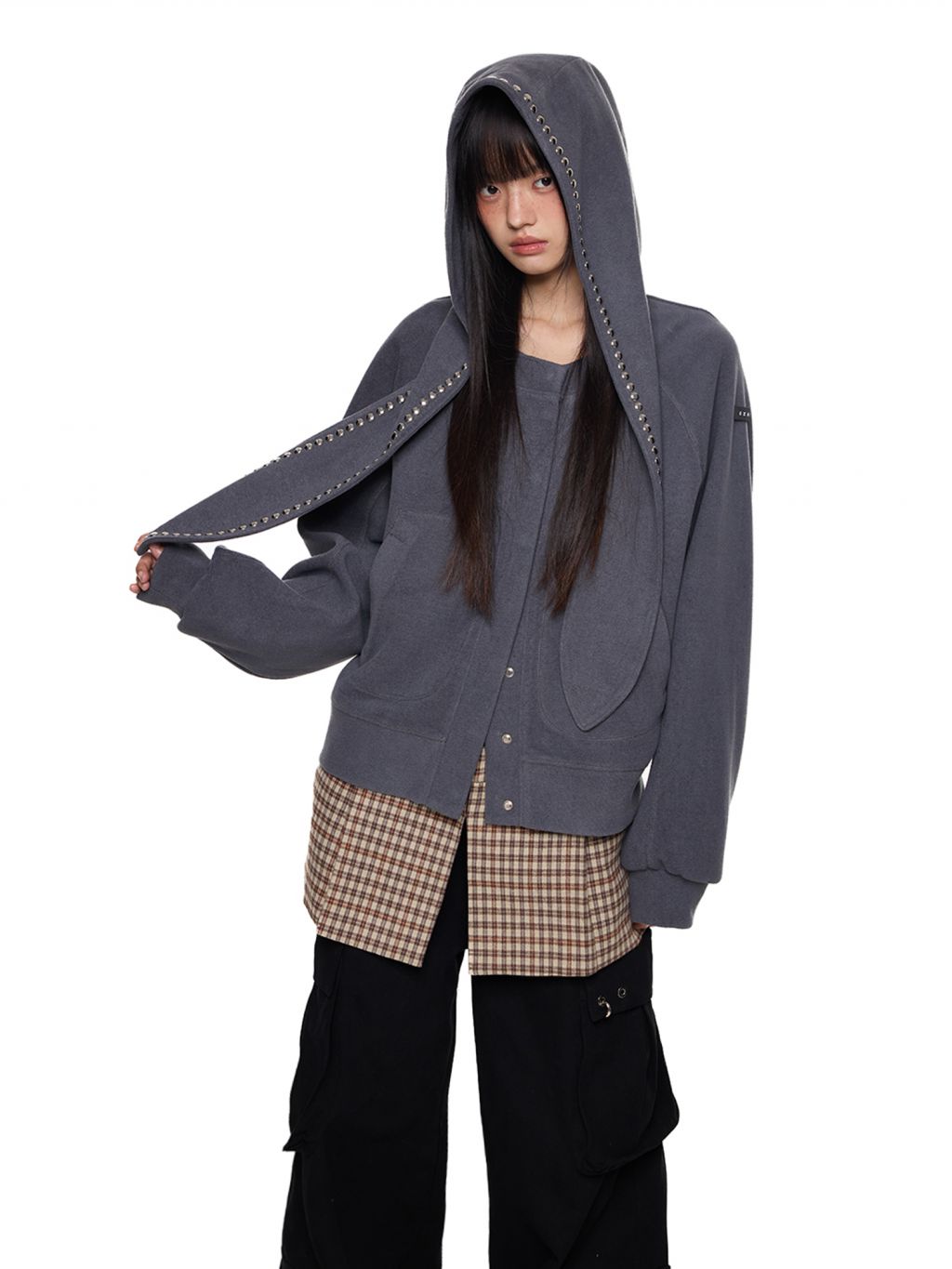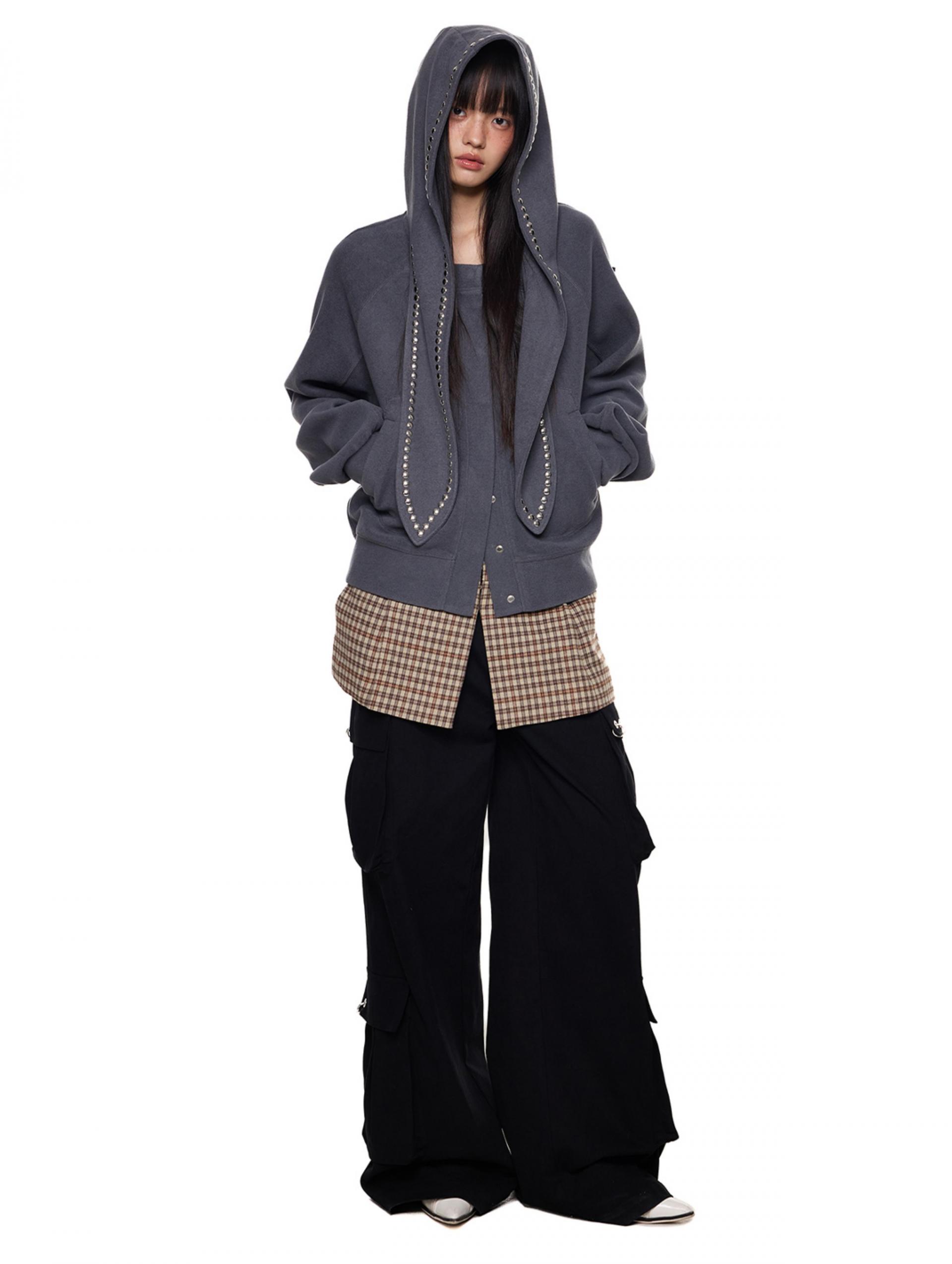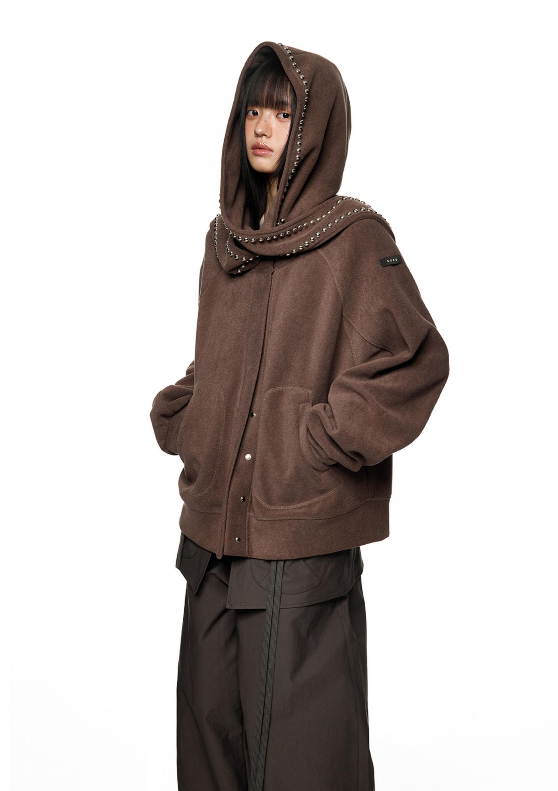 스카프처럼 길게 떨어지는 스트랩 후드에 스터드 라인을 더해 키치하고 존재감 있는 실루엣을 완성한 후디 가디건입니다.