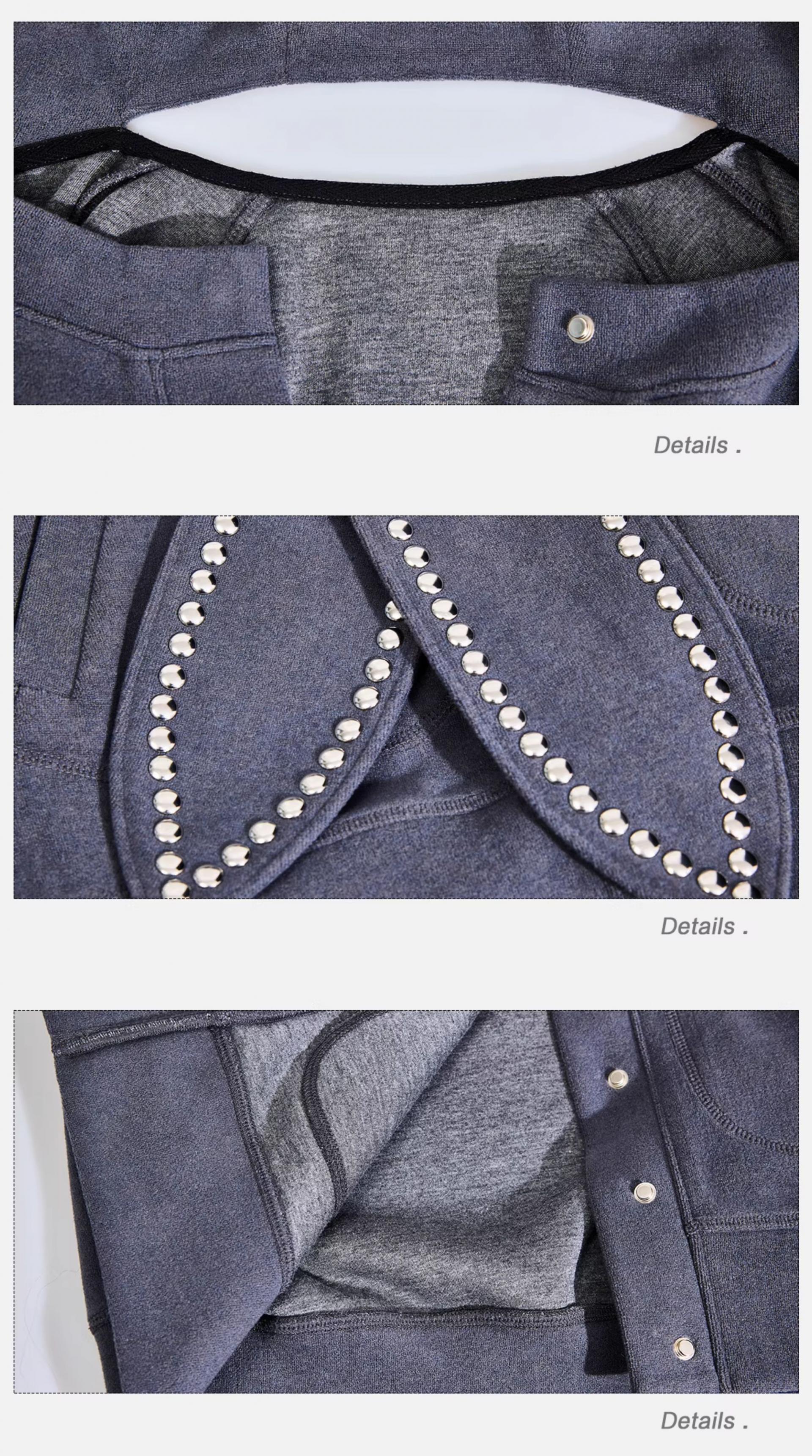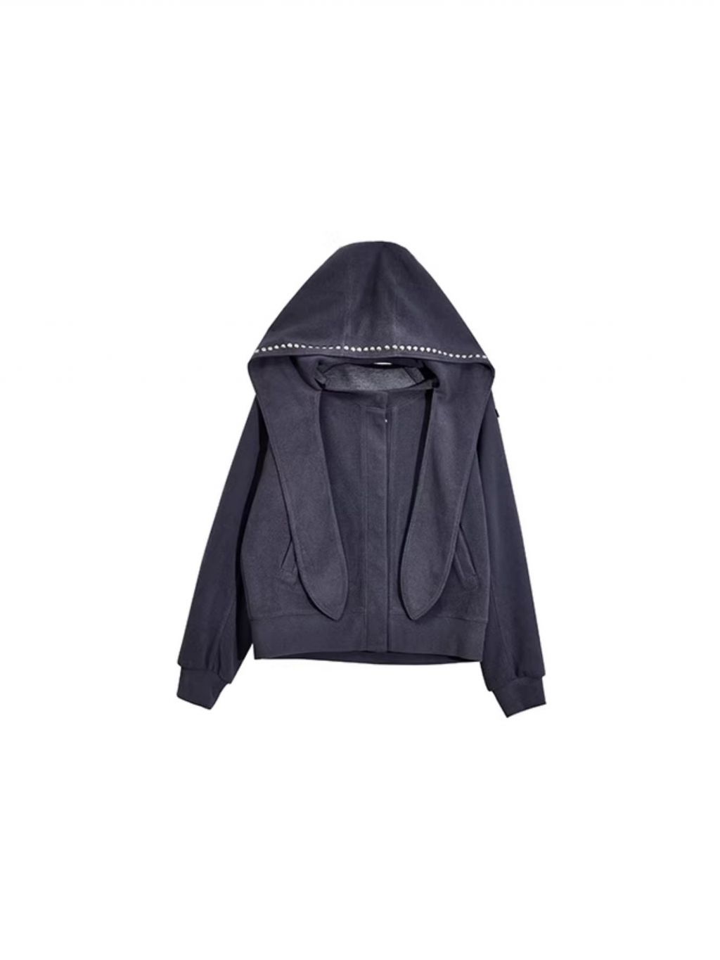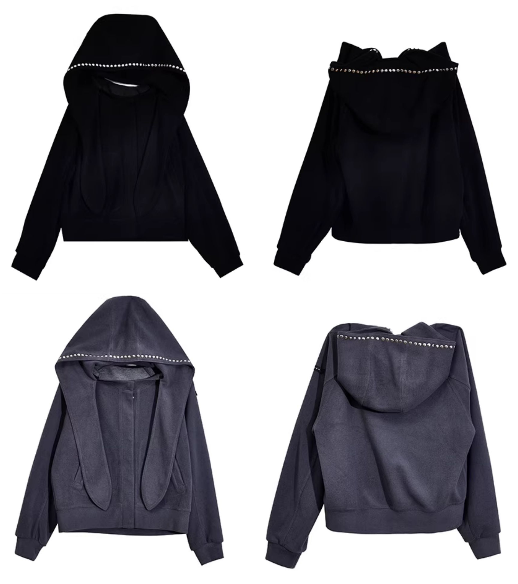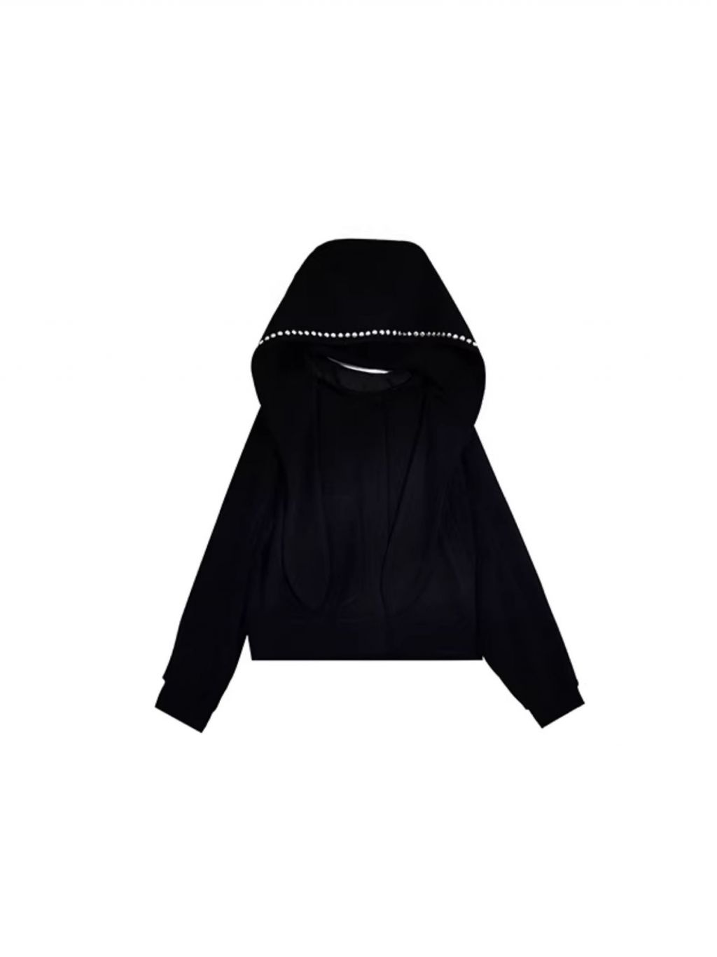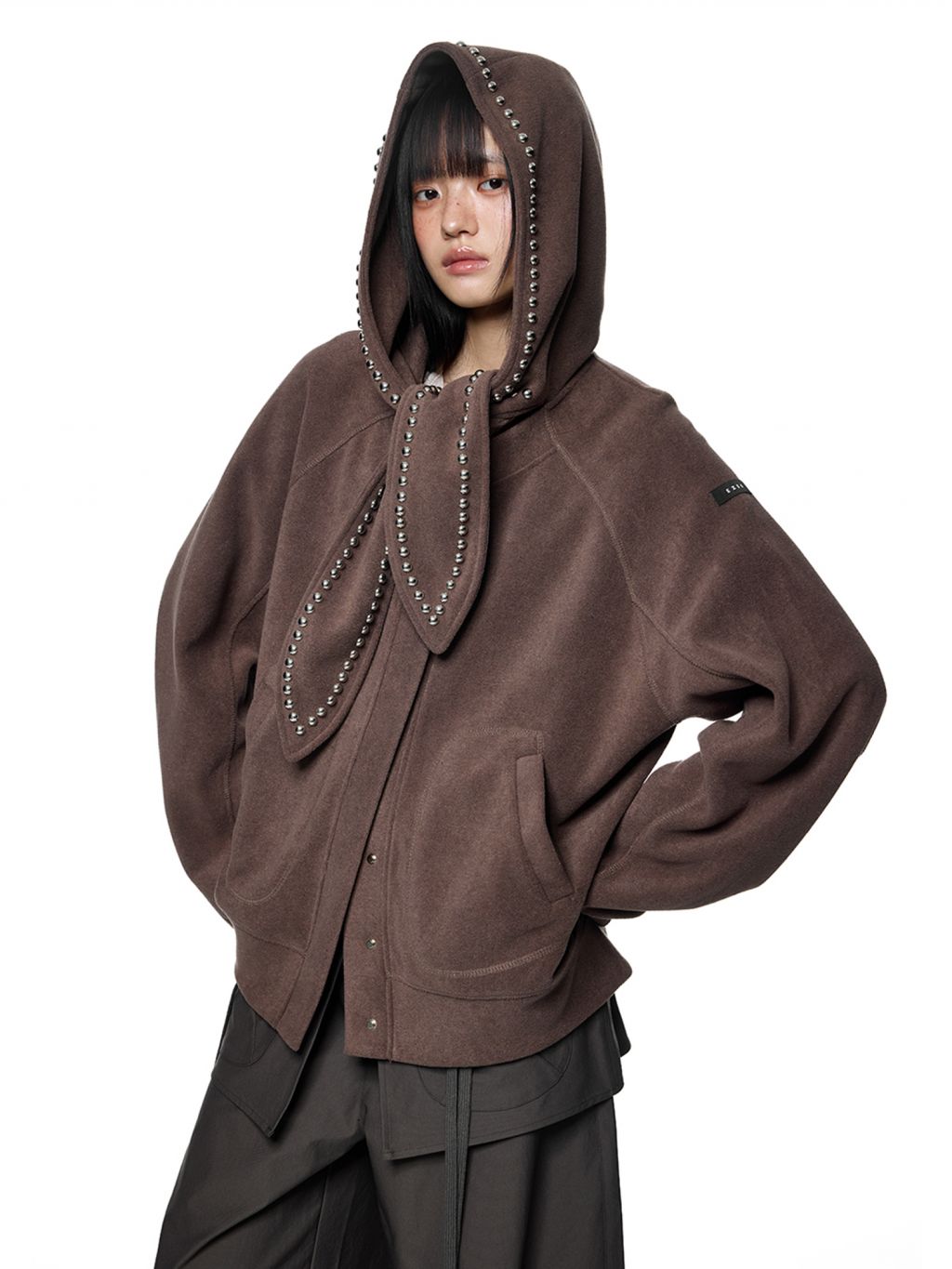 스카프처럼 길게 떨어지는 스트랩 후드에 스터드 라인을 더해 키치하고 존재감 있는 실루엣을 완성한 후디 가디건입니다.