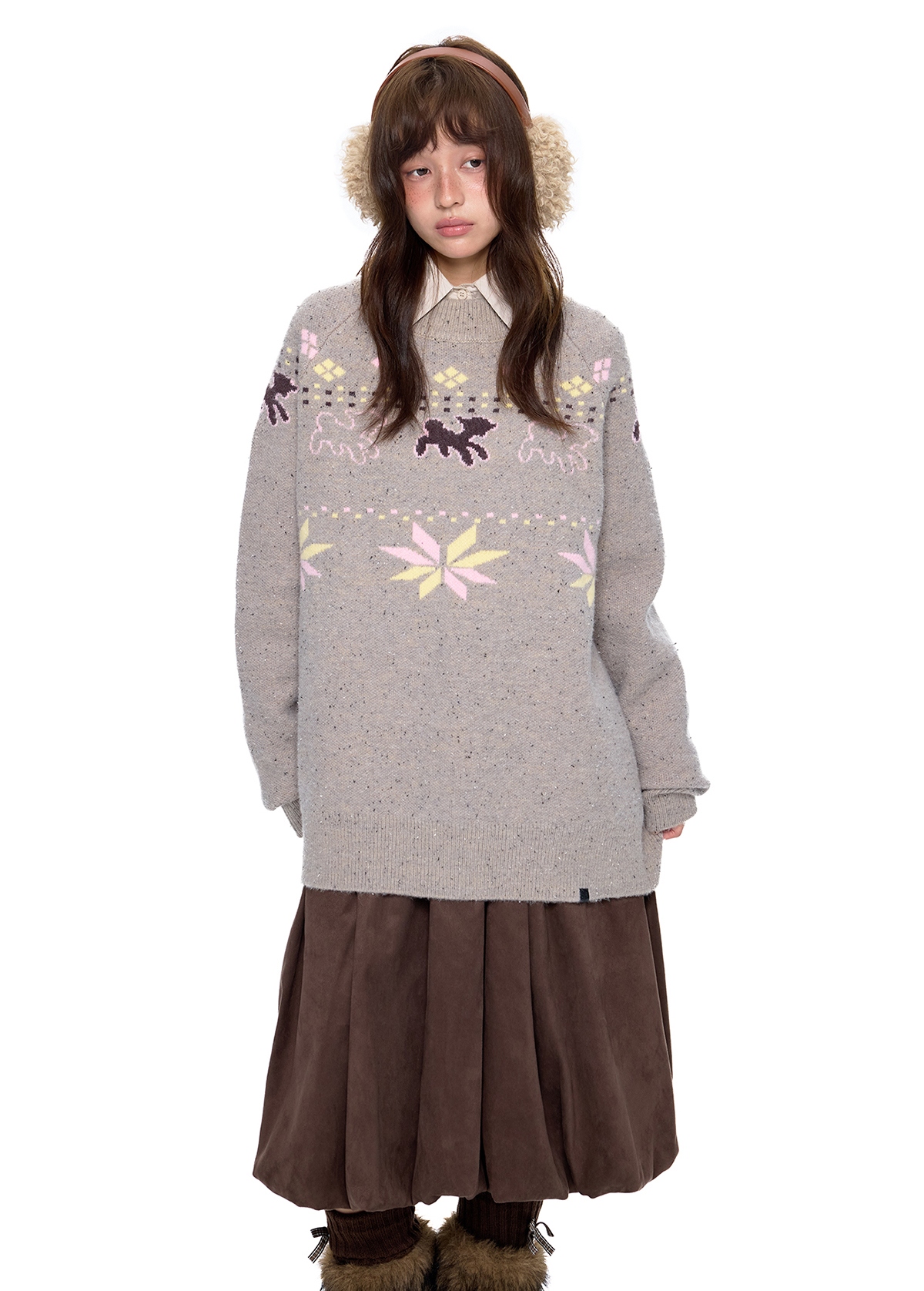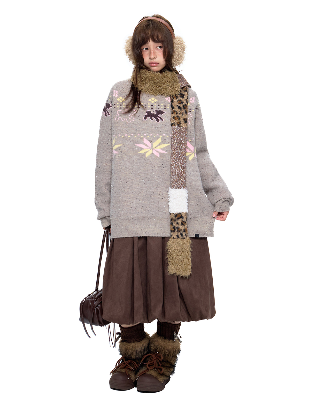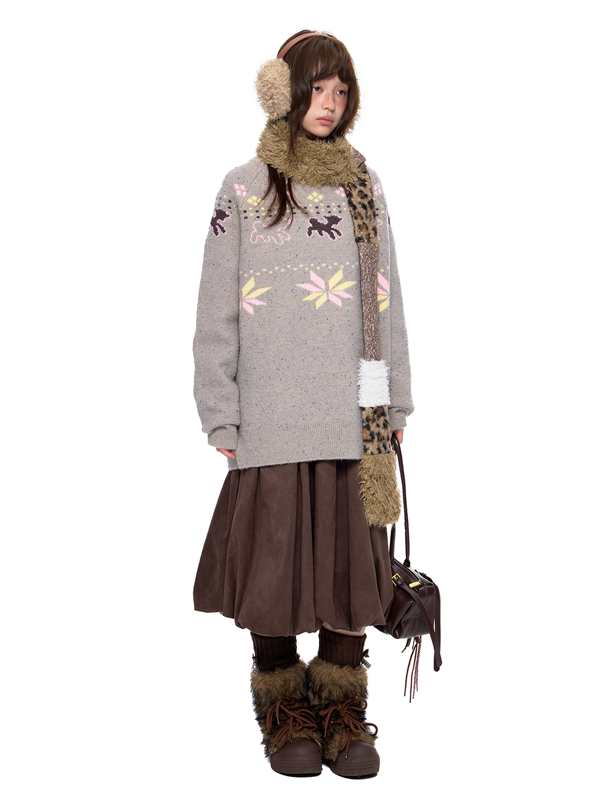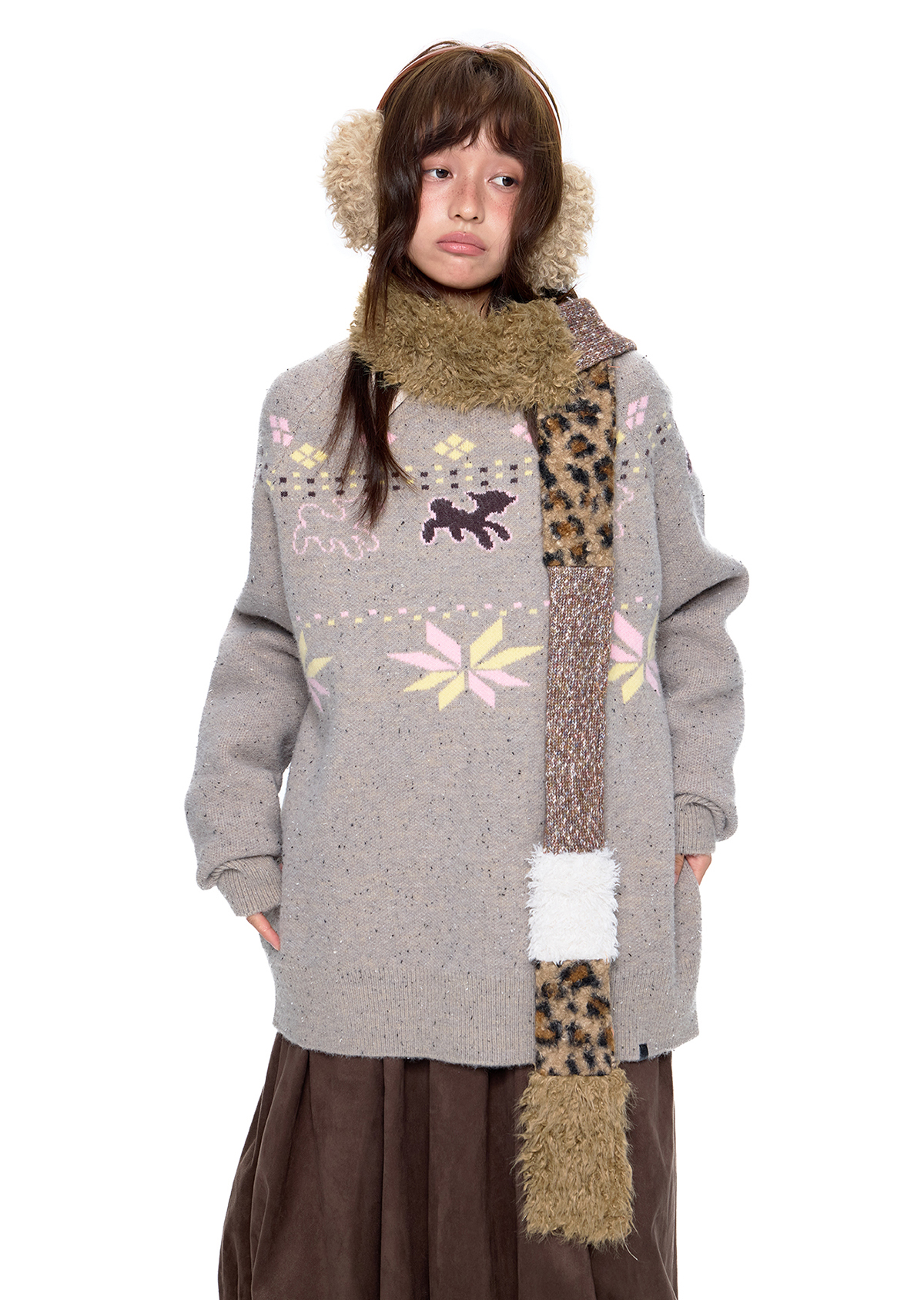 포근한 네프 원사와 강아지·스노우 패턴이 포인트인 오버핏 니트 스웨터입니다.