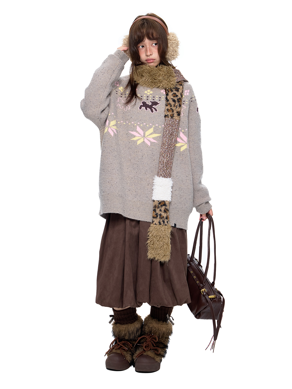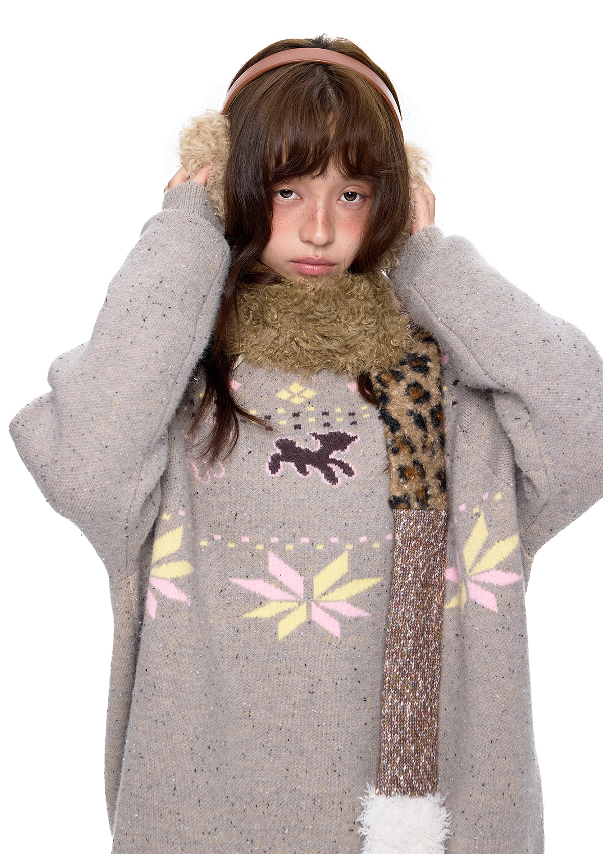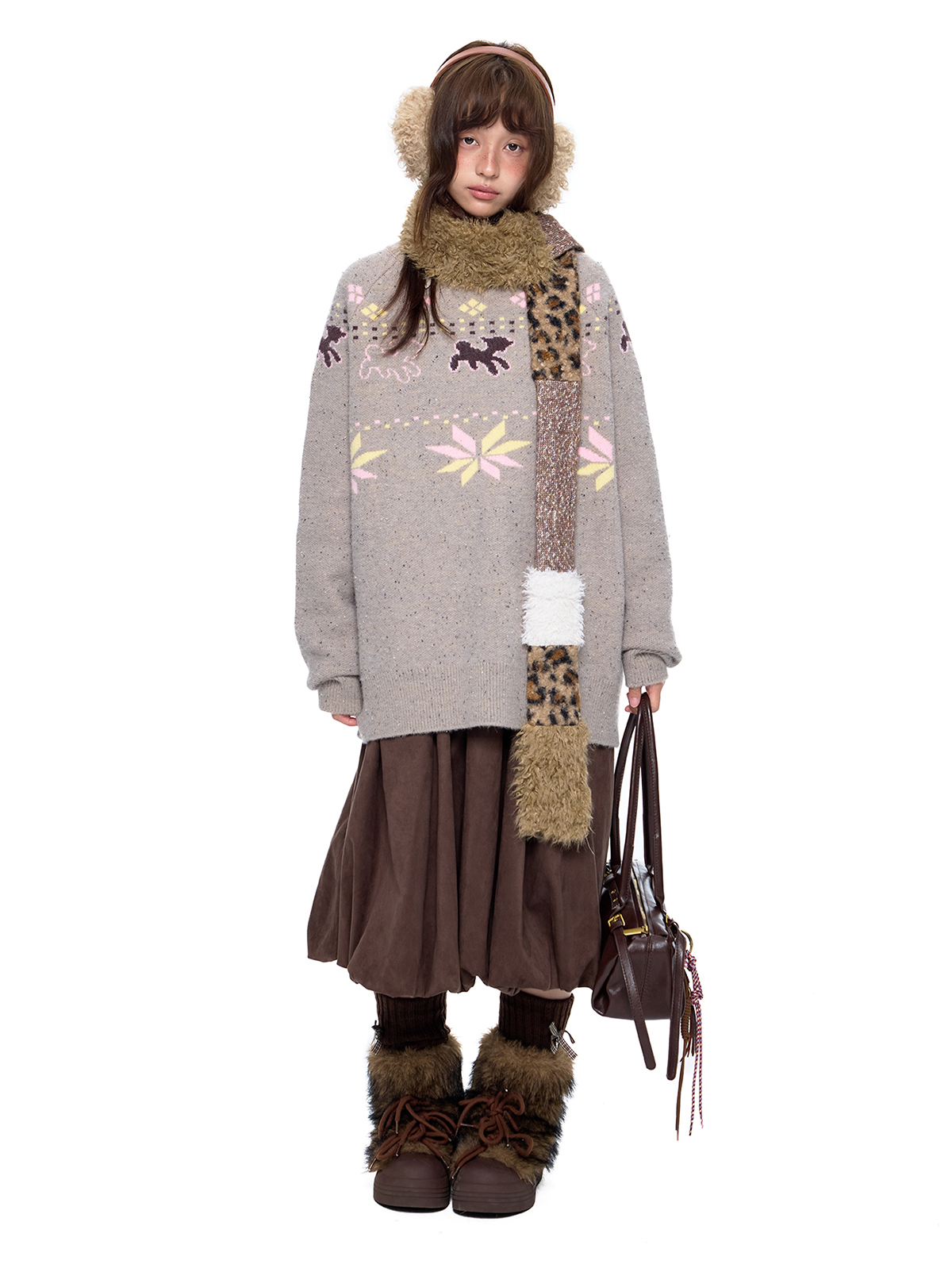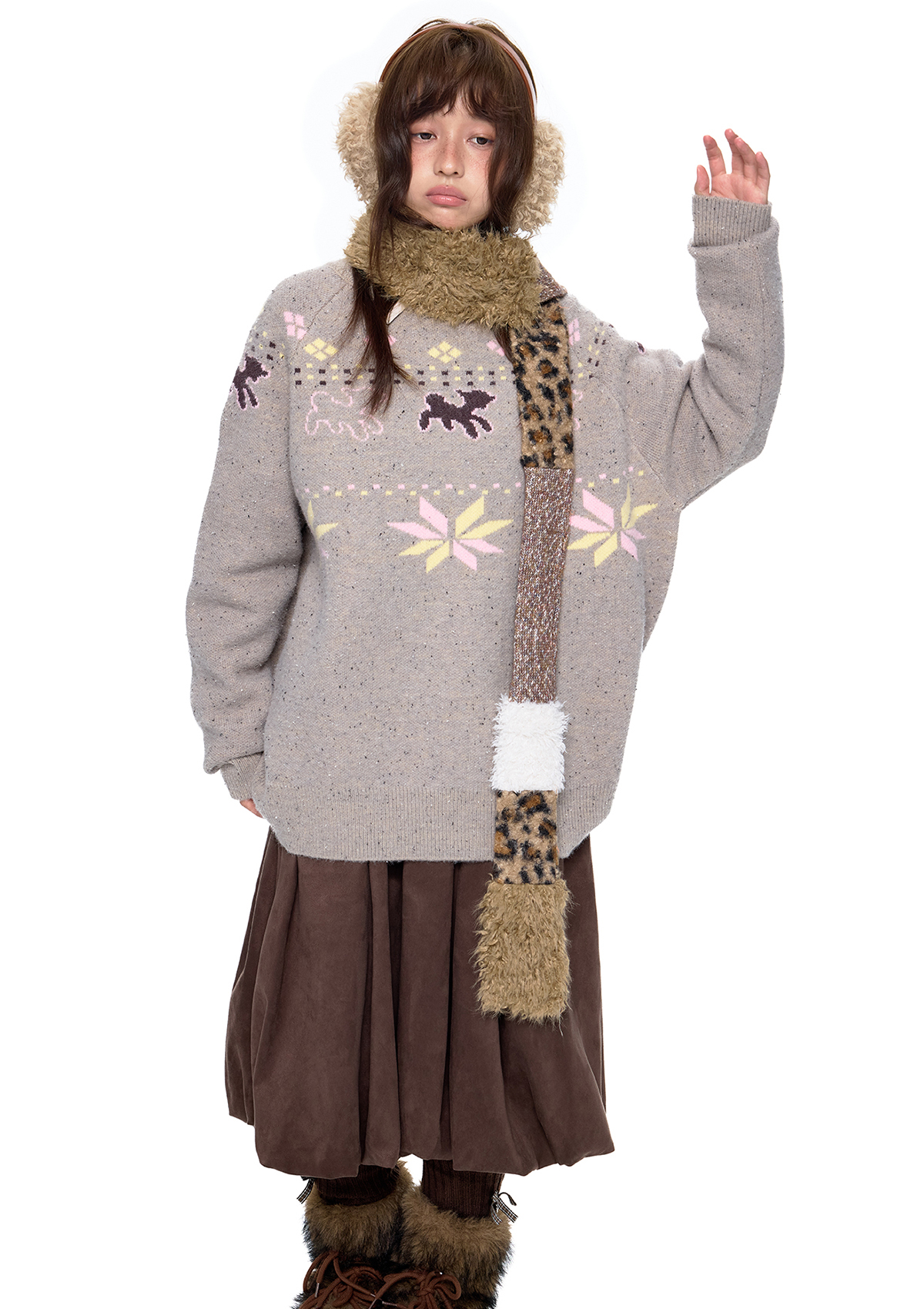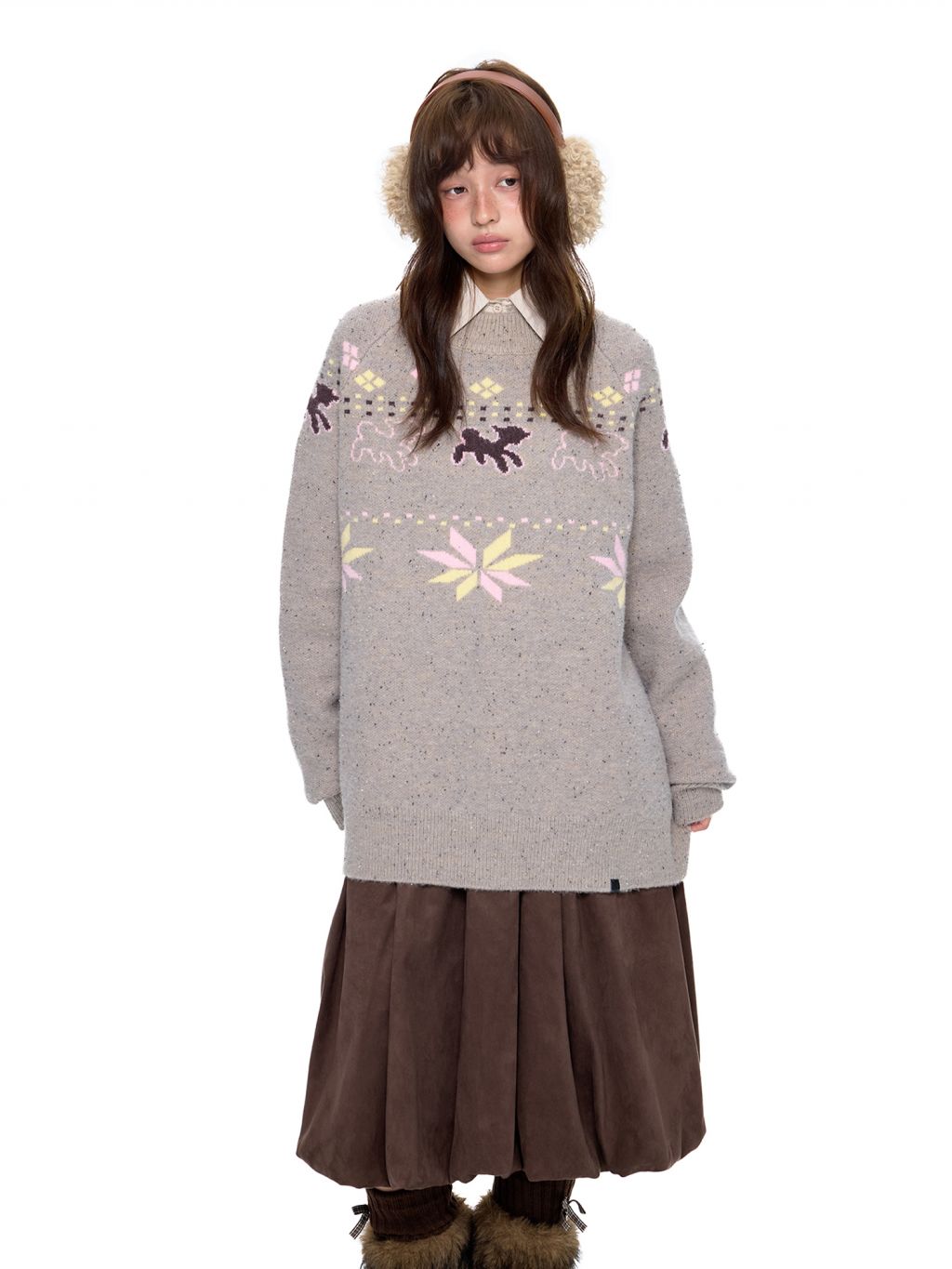 포근한 네프 원사와 강아지·스노우 패턴이 포인트인 오버핏 니트 스웨터입니다.