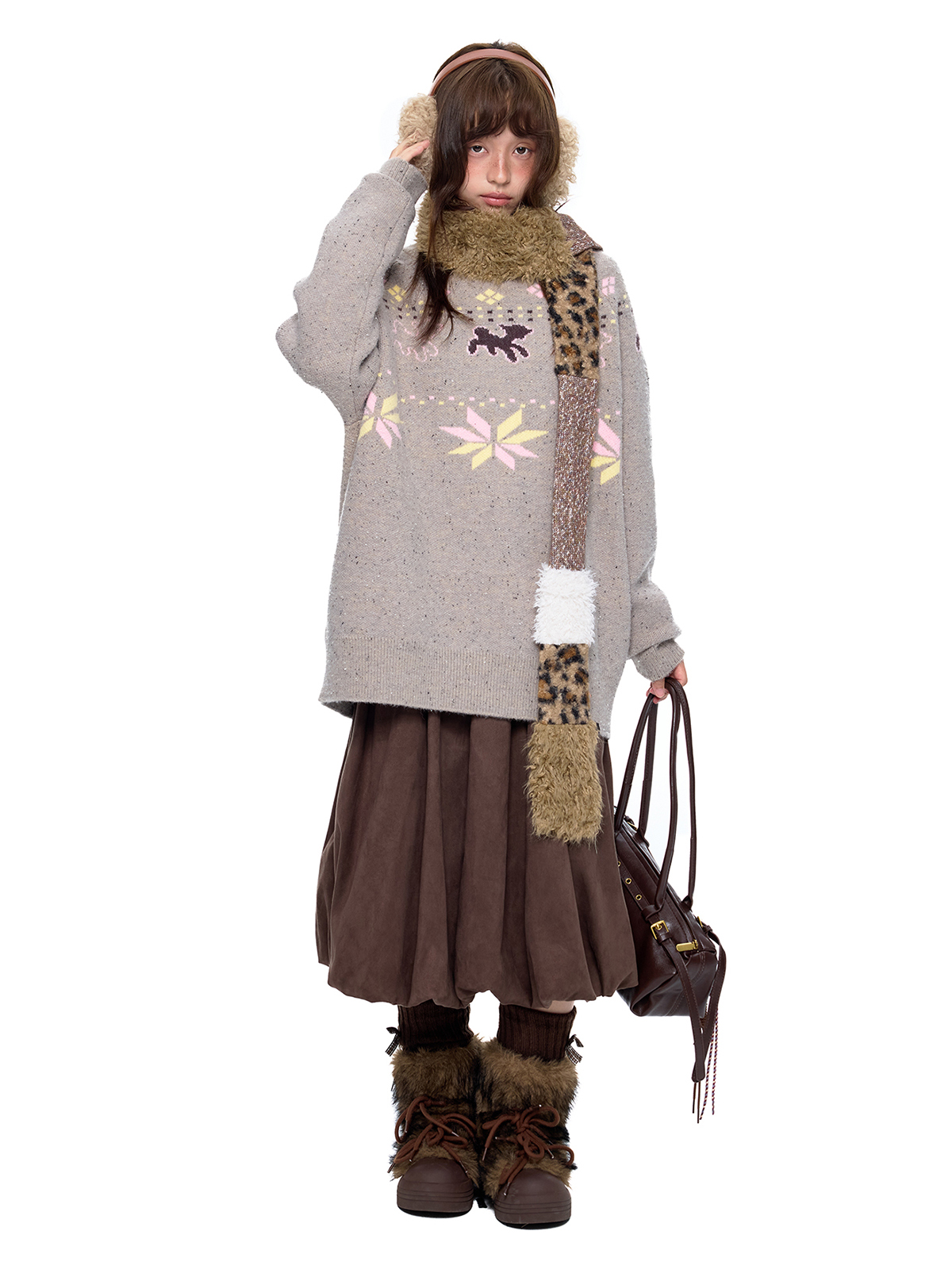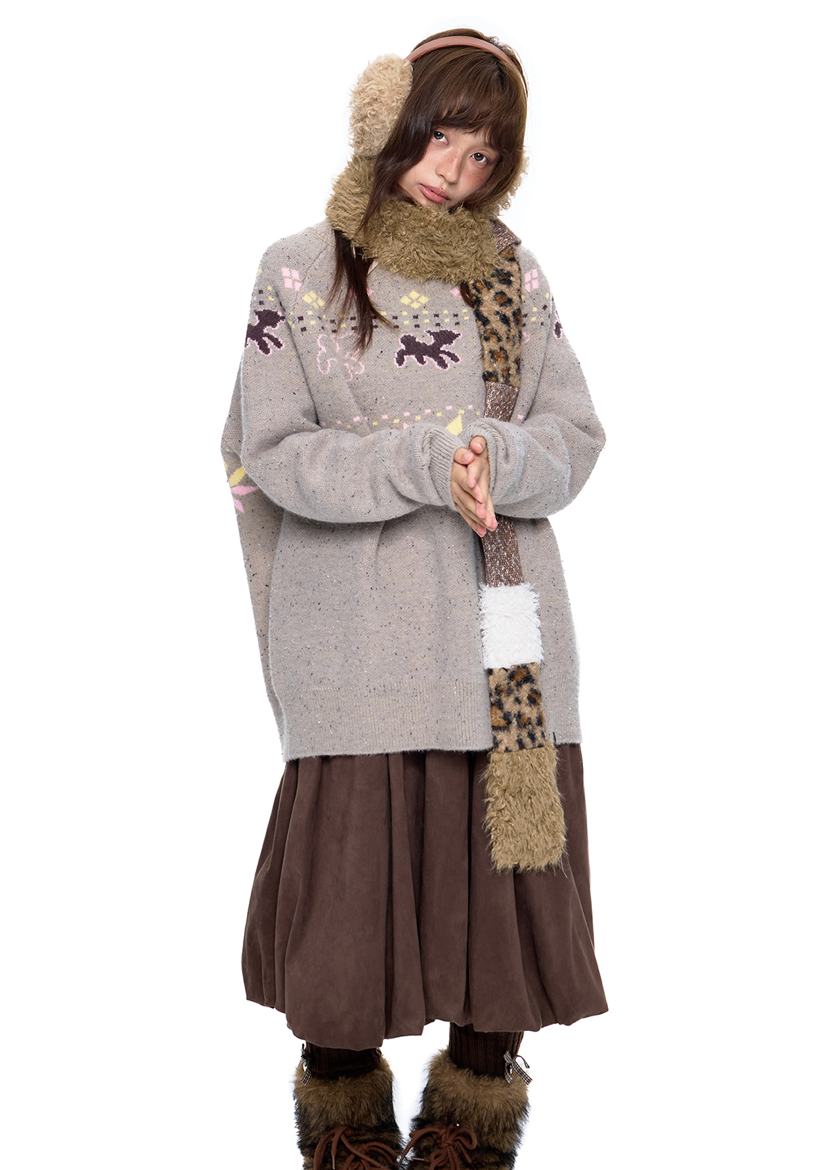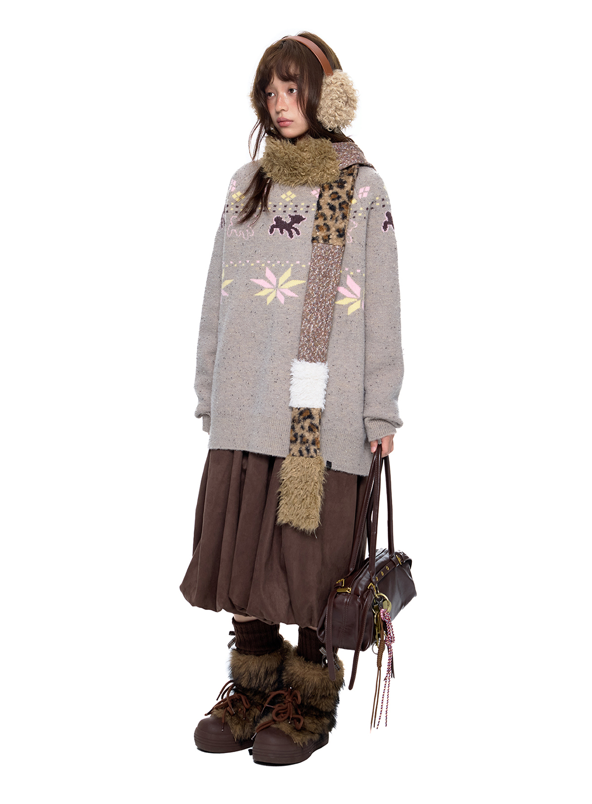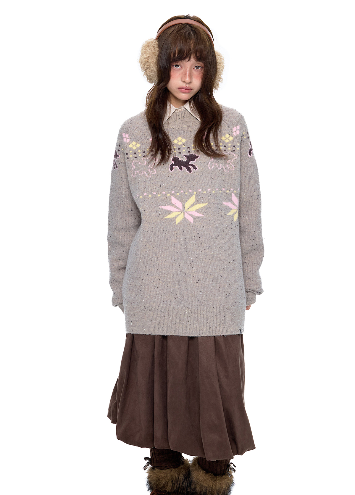 포근한 네프 원사와 강아지·스노우 패턴이 포인트인 오버핏 니트 스웨터입니다.