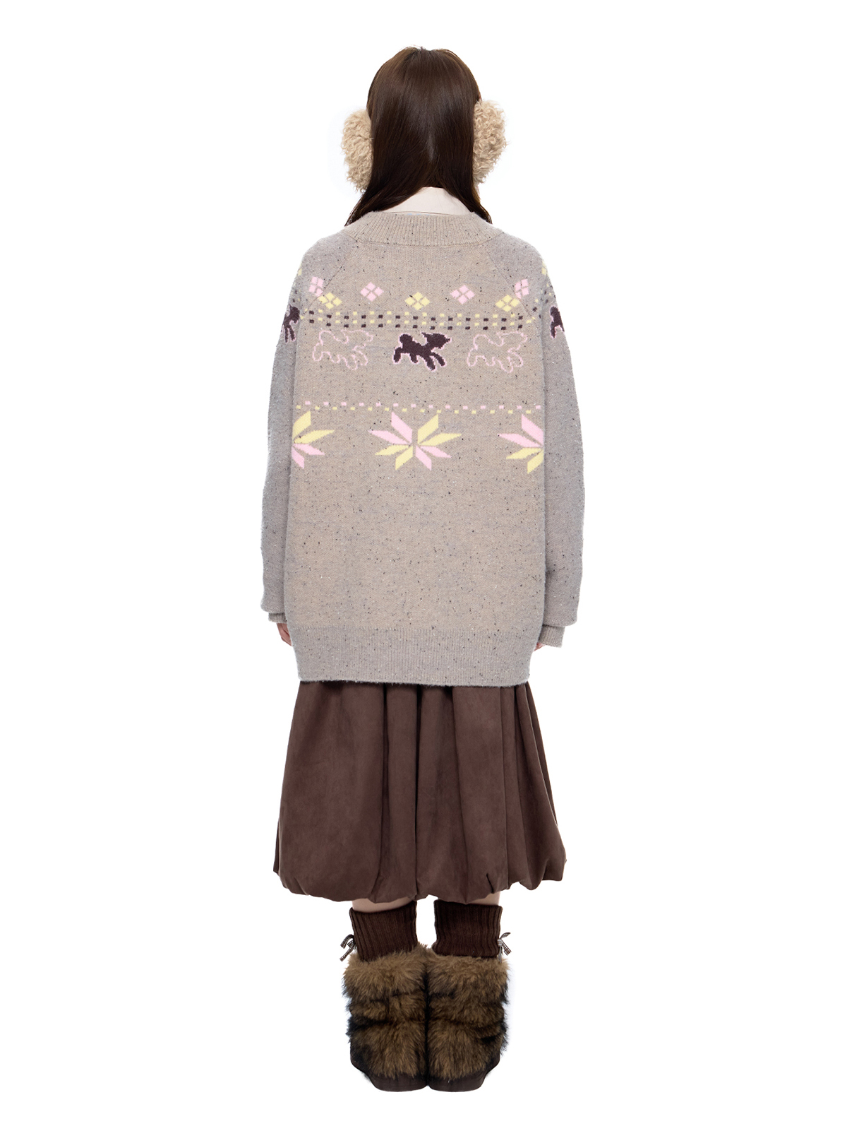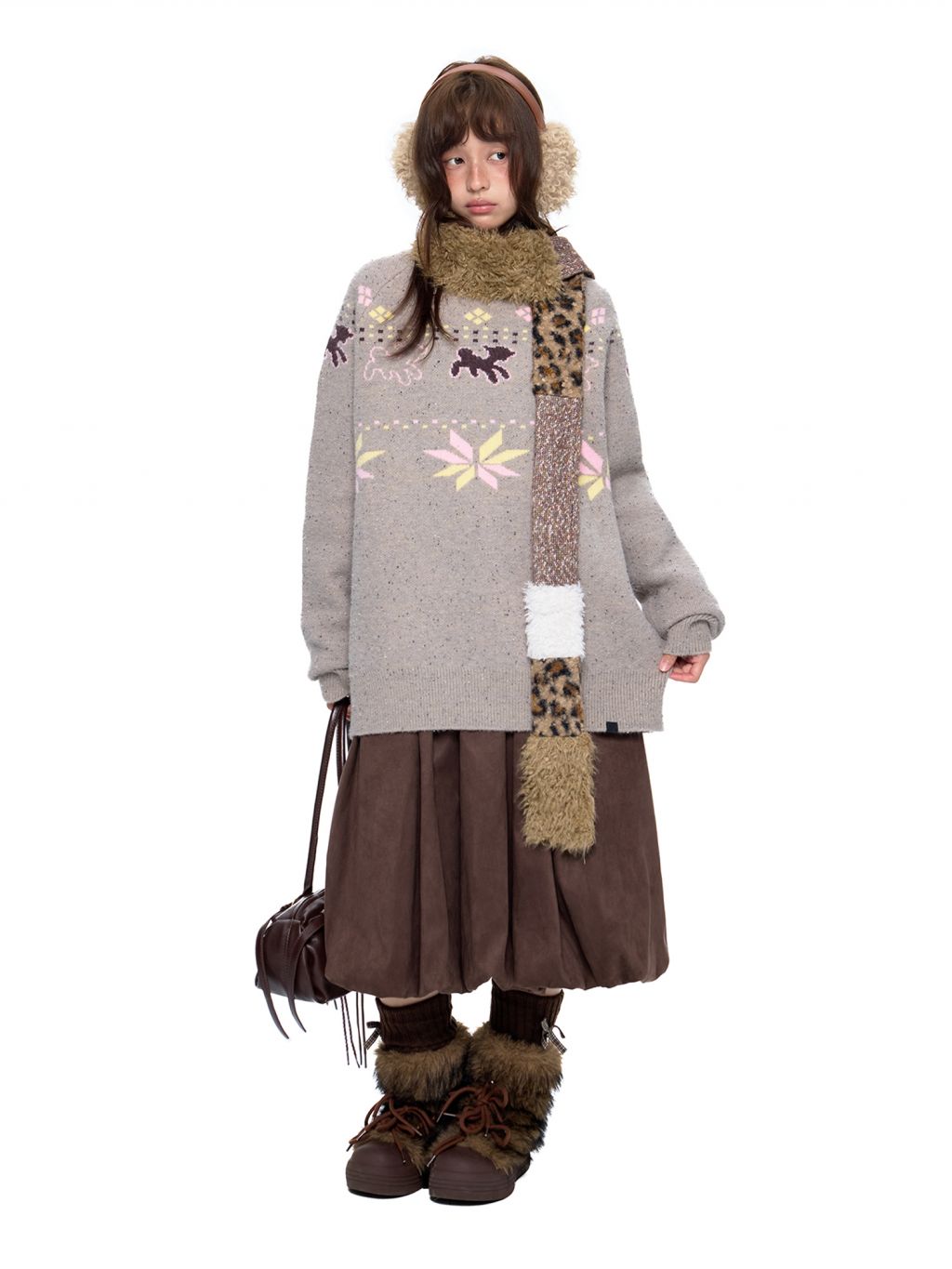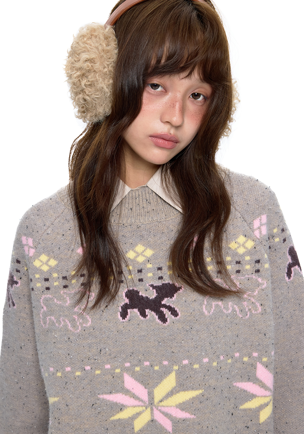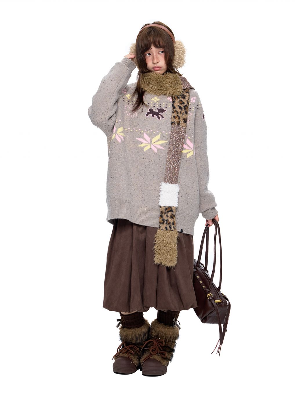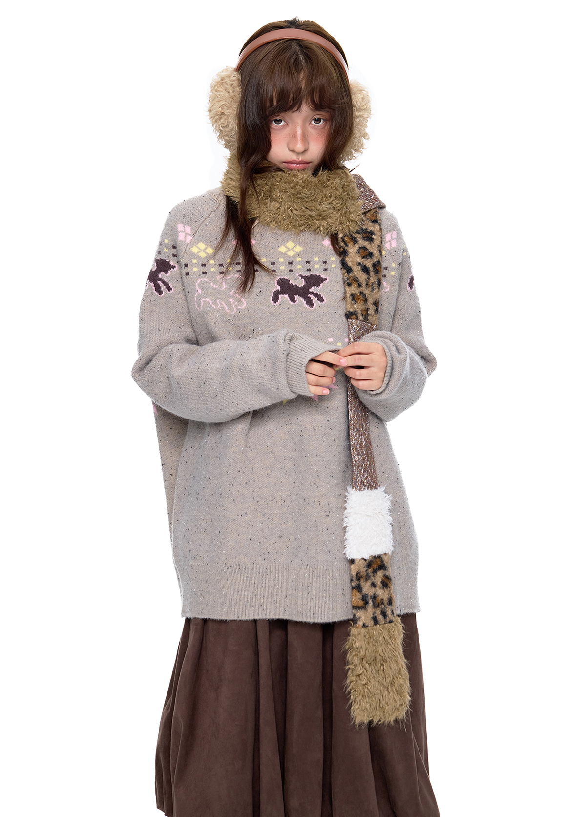 포근한 네프 원사와 강아지·스노우 패턴이 포인트인 오버핏 니트 스웨터입니다.