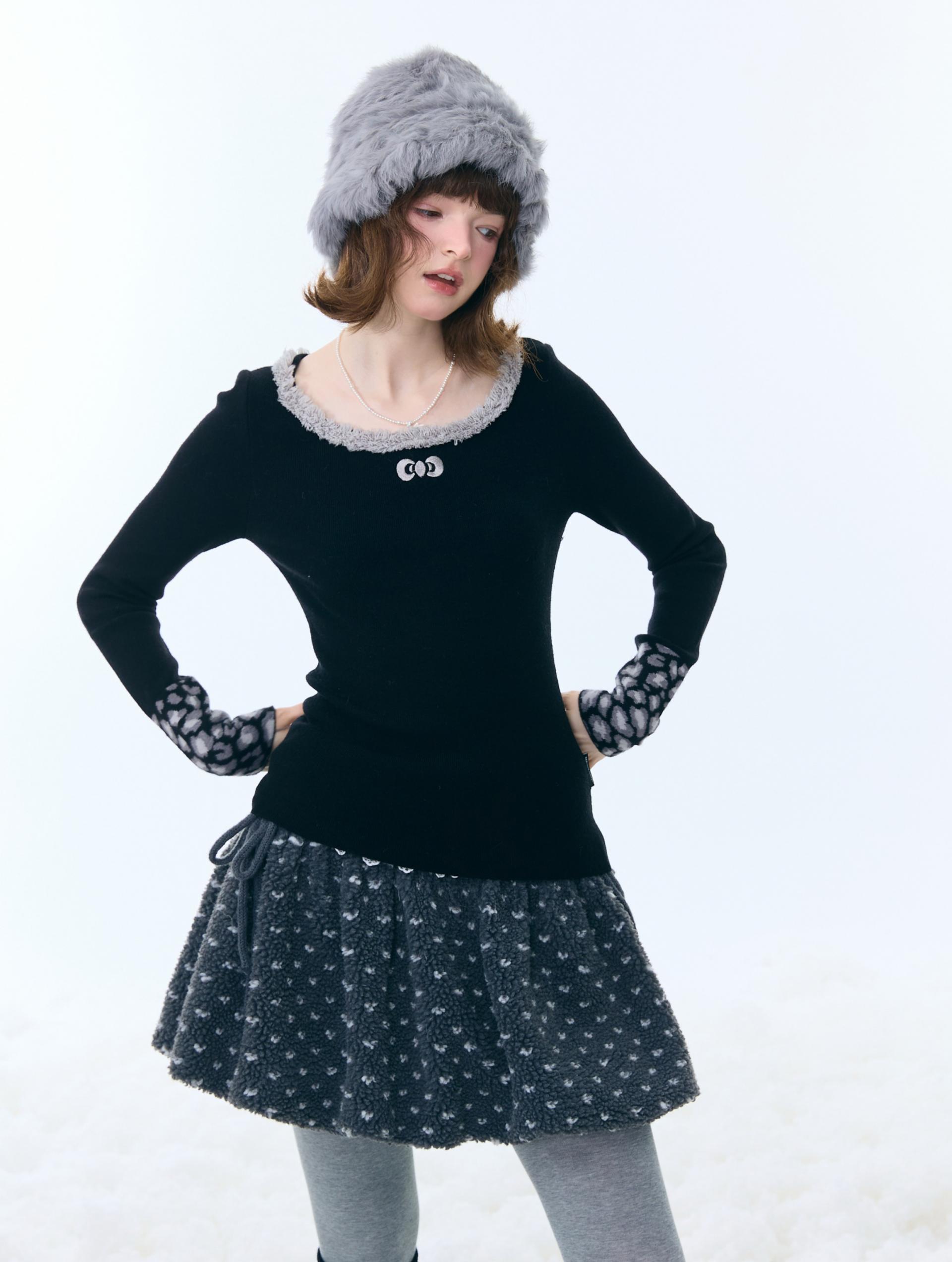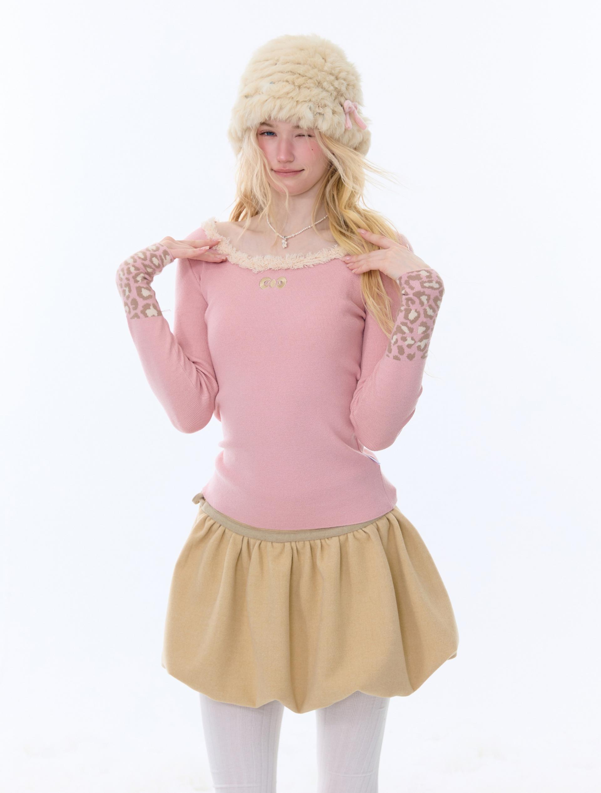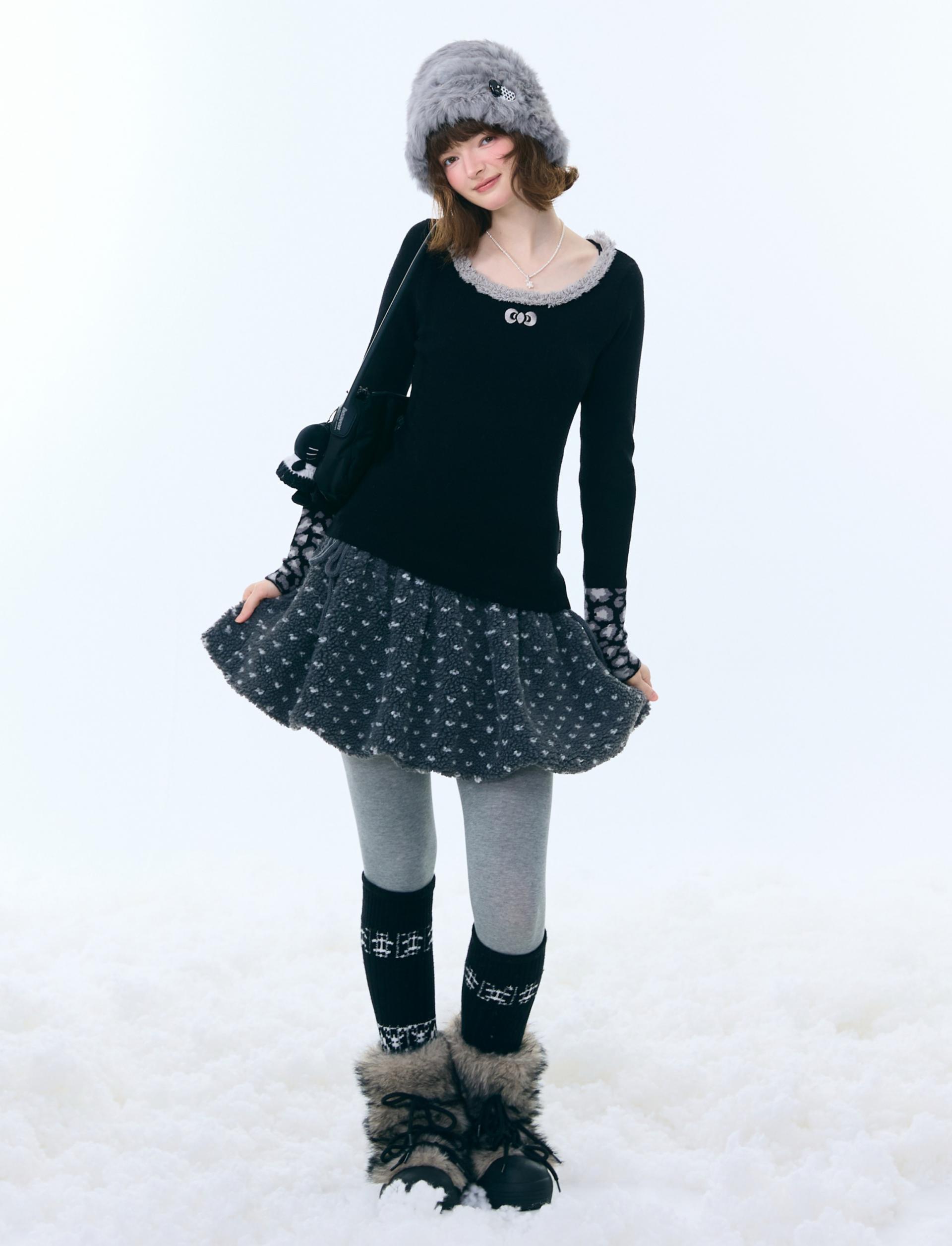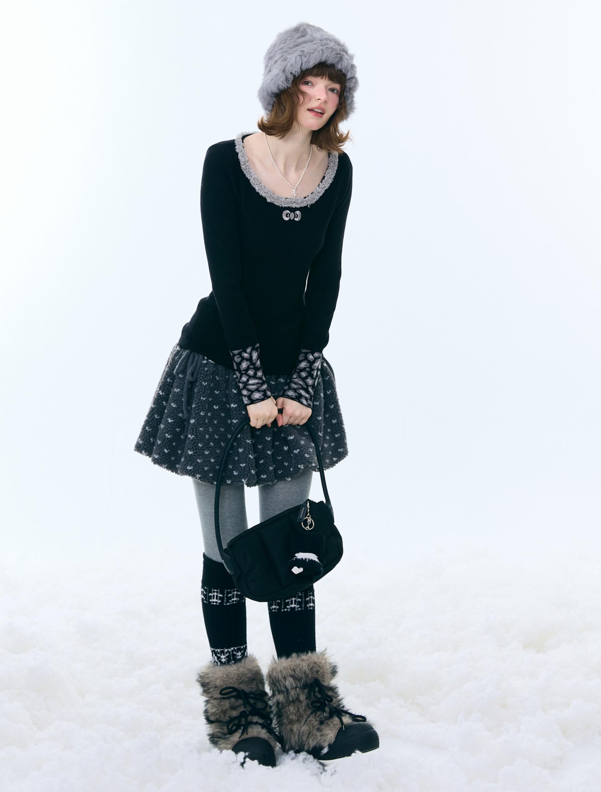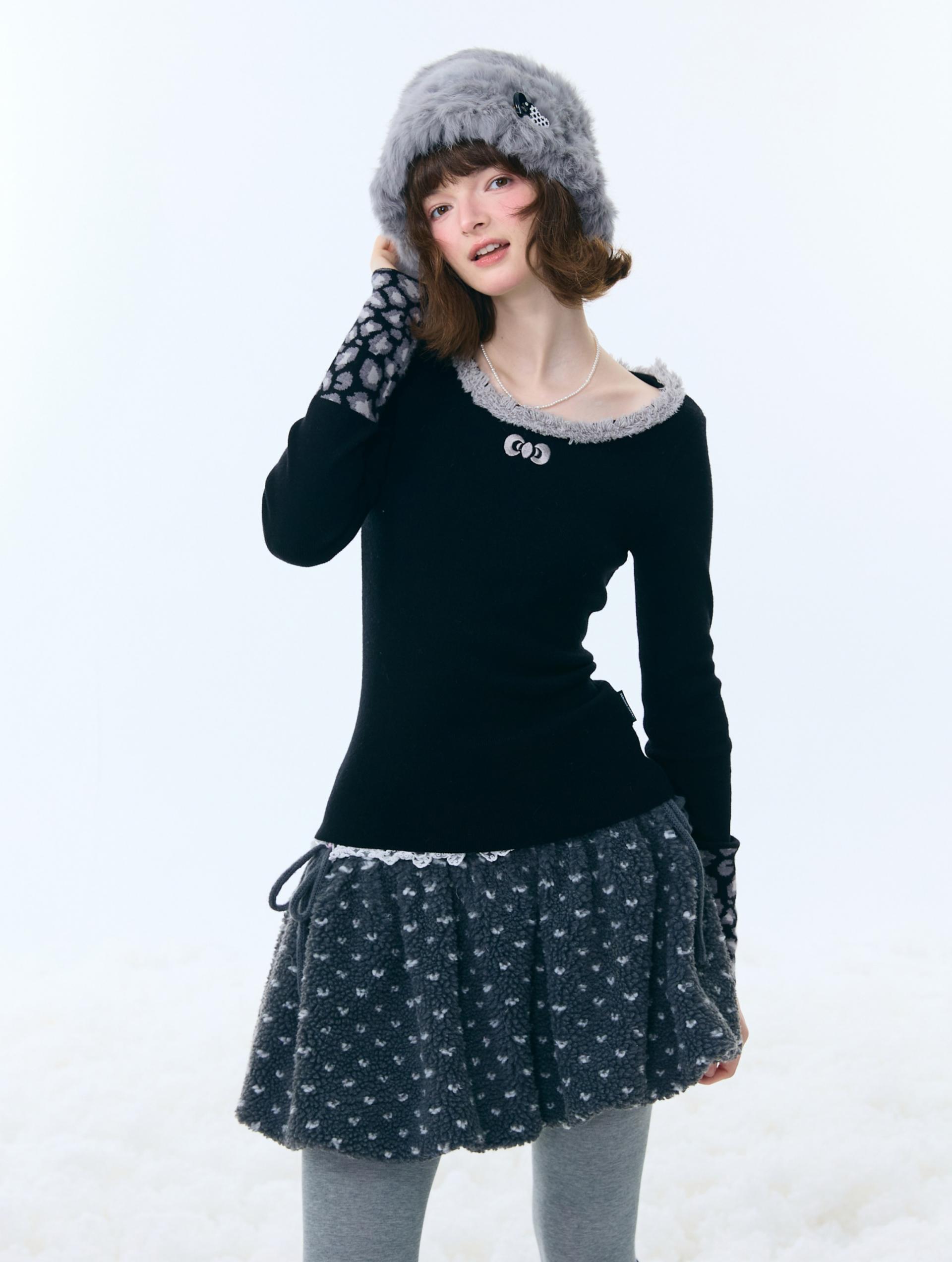 은은한 퍼 트림과 레오파드 커프 디테일로 겨울 코디에 포인트를 더해주는 러블리 니트 탑입니다.