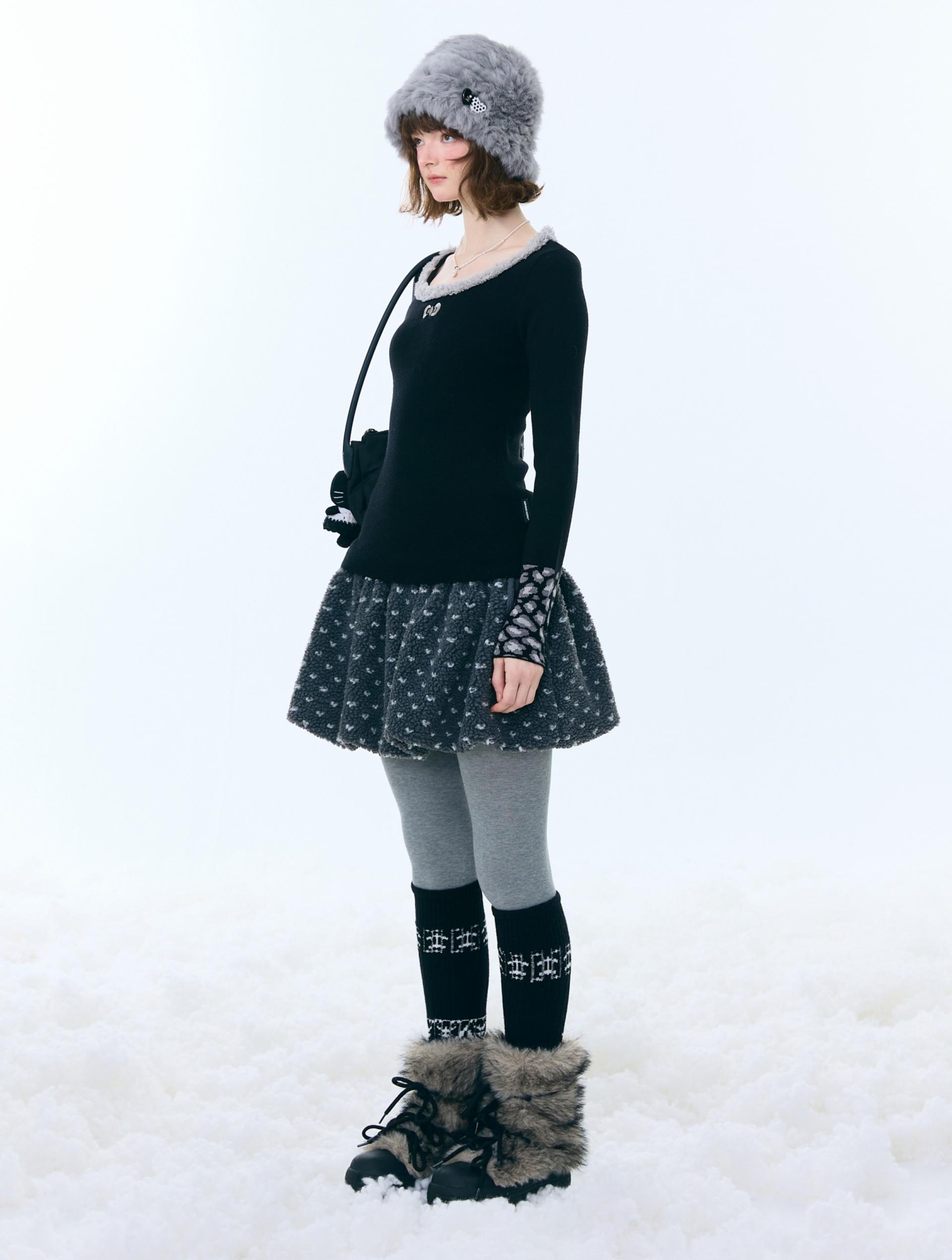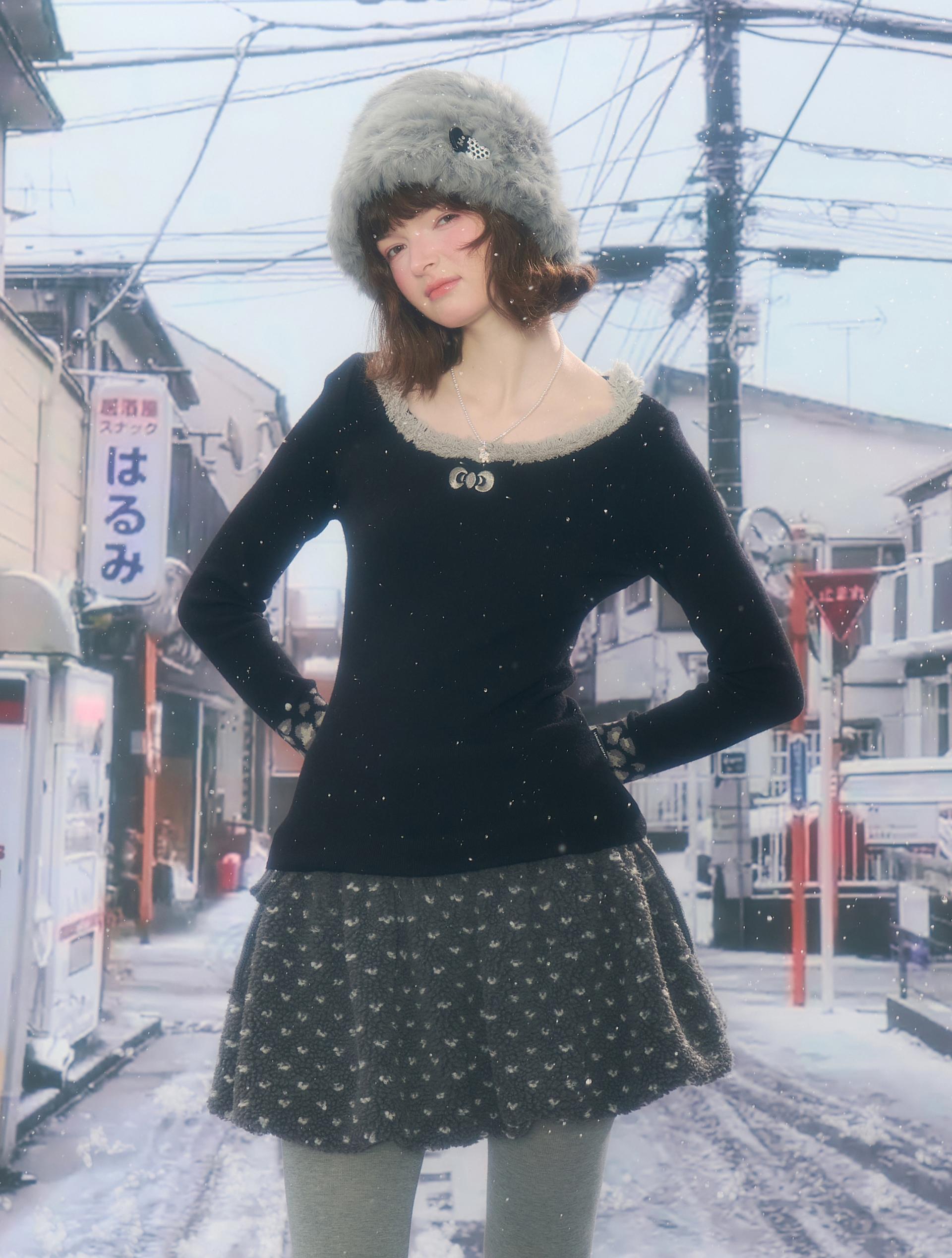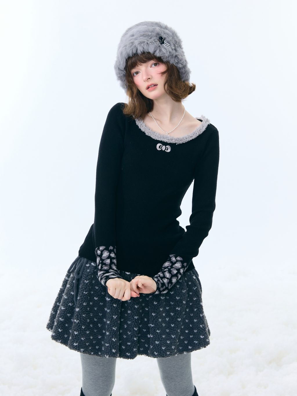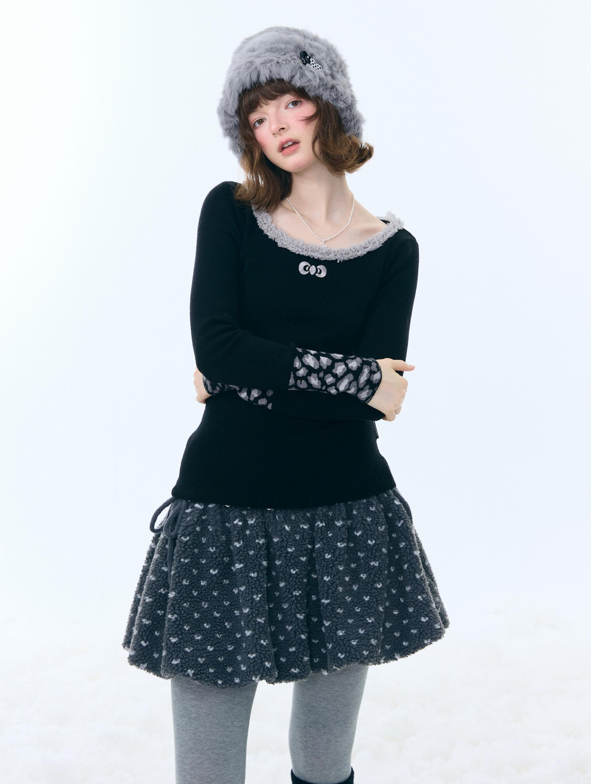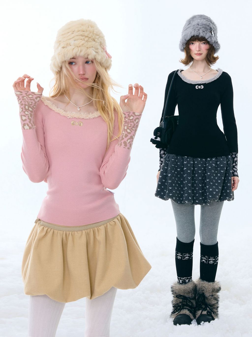 은은한 퍼 트림과 레오파드 커프 디테일로 겨울 코디에 포인트를 더해주는 러블리 니트 탑입니다.