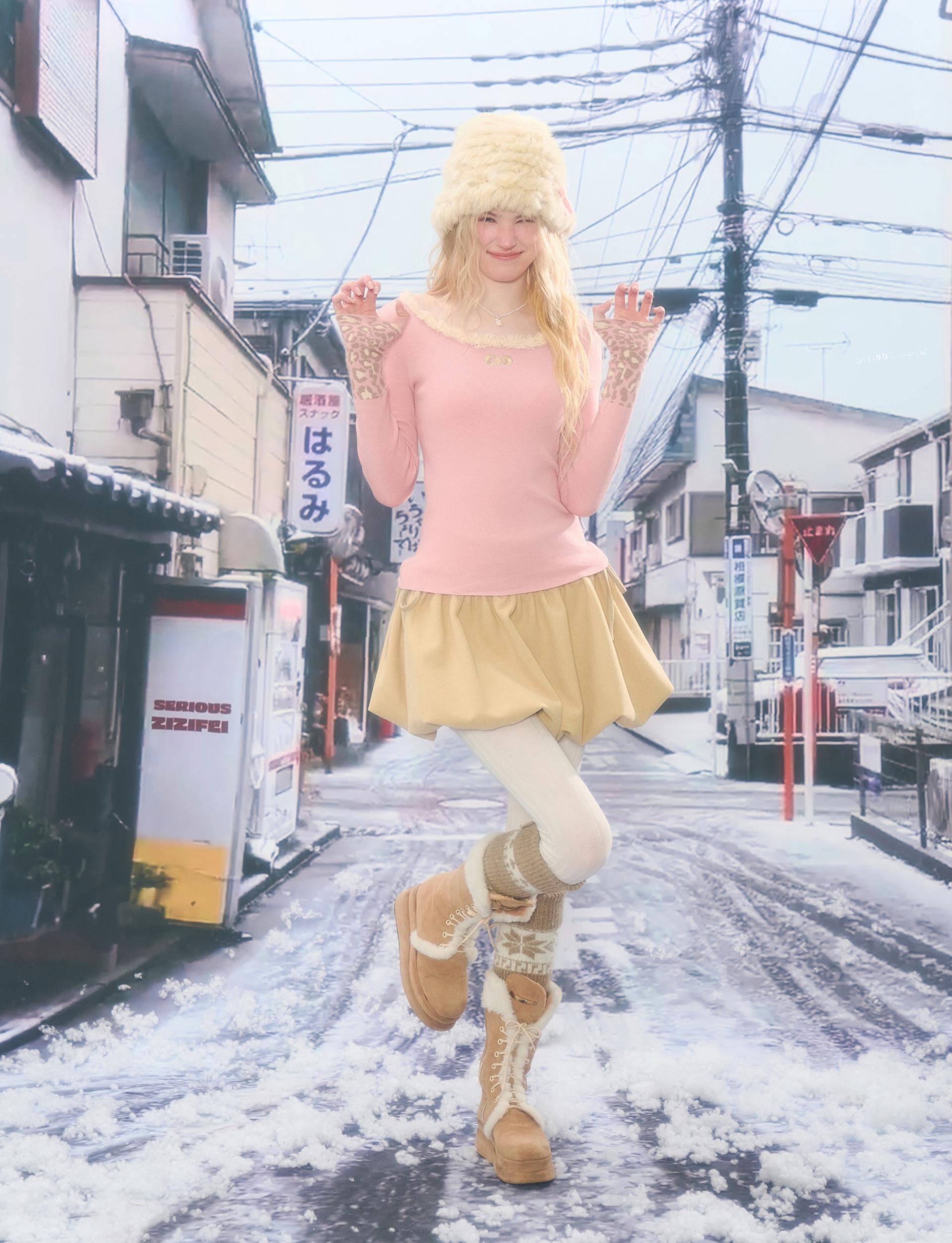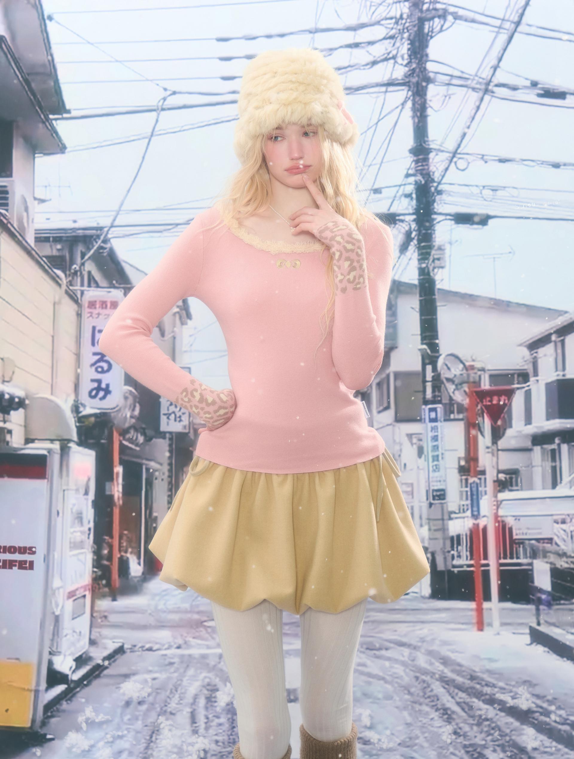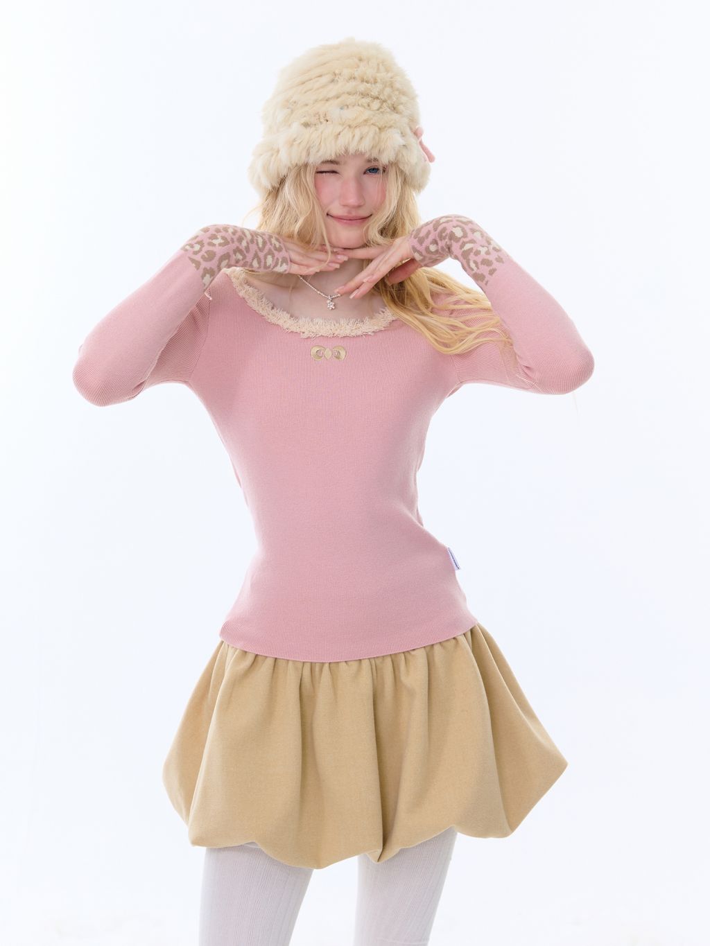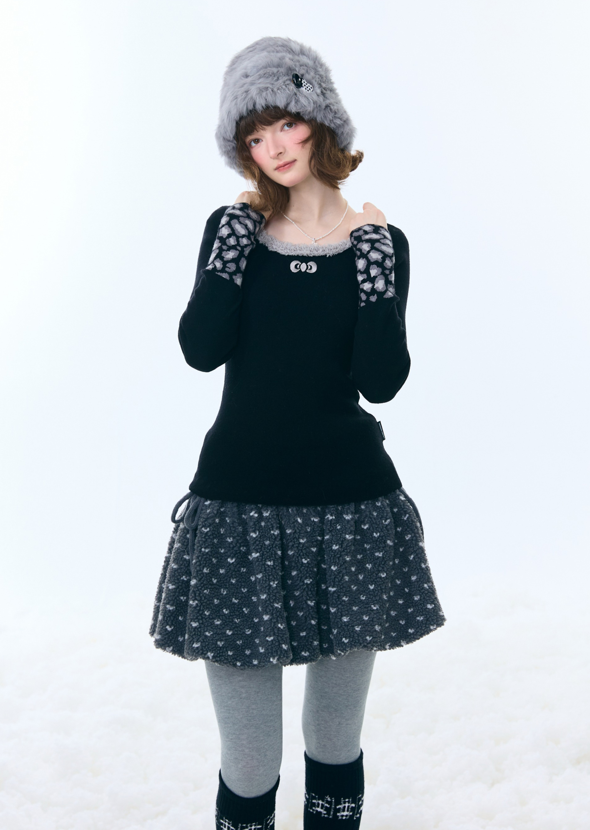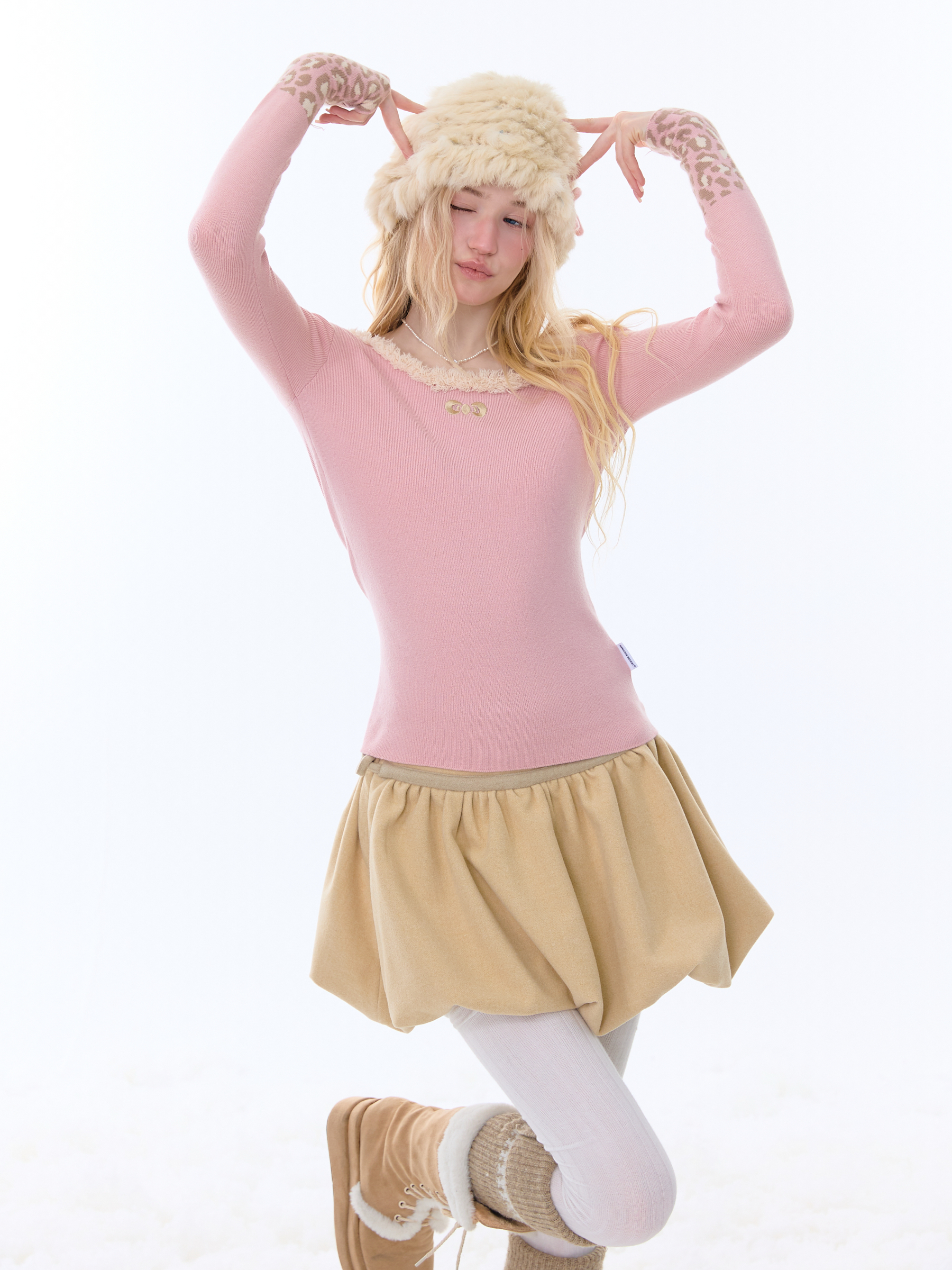 은은한 퍼 트림과 레오파드 커프 디테일로 겨울 코디에 포인트를 더해주는 러블리 니트 탑입니다.