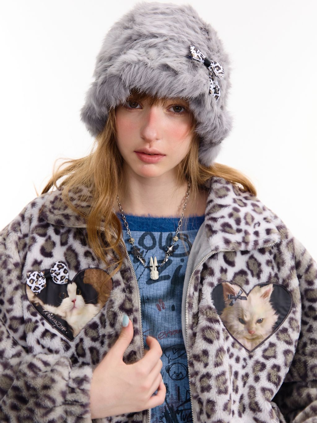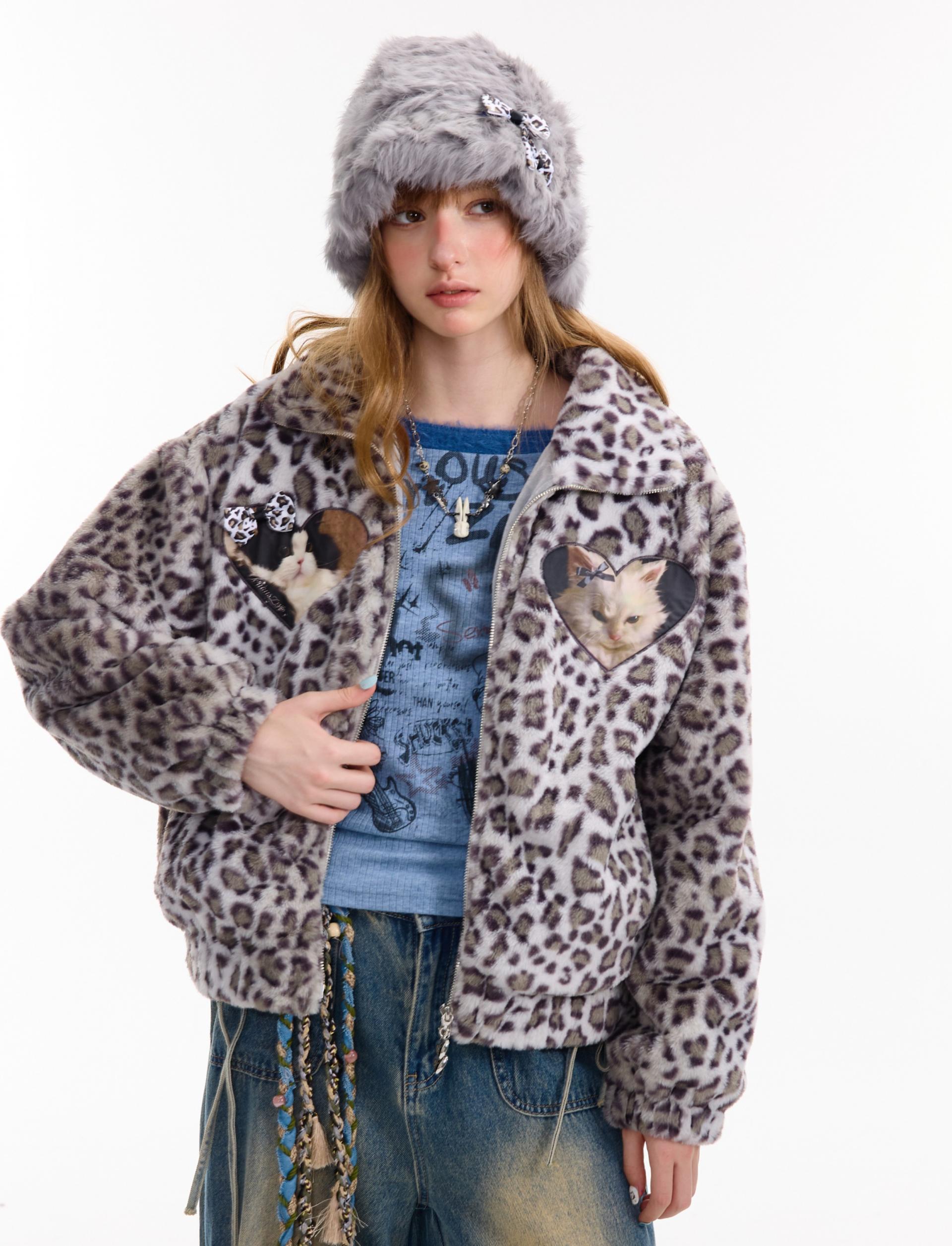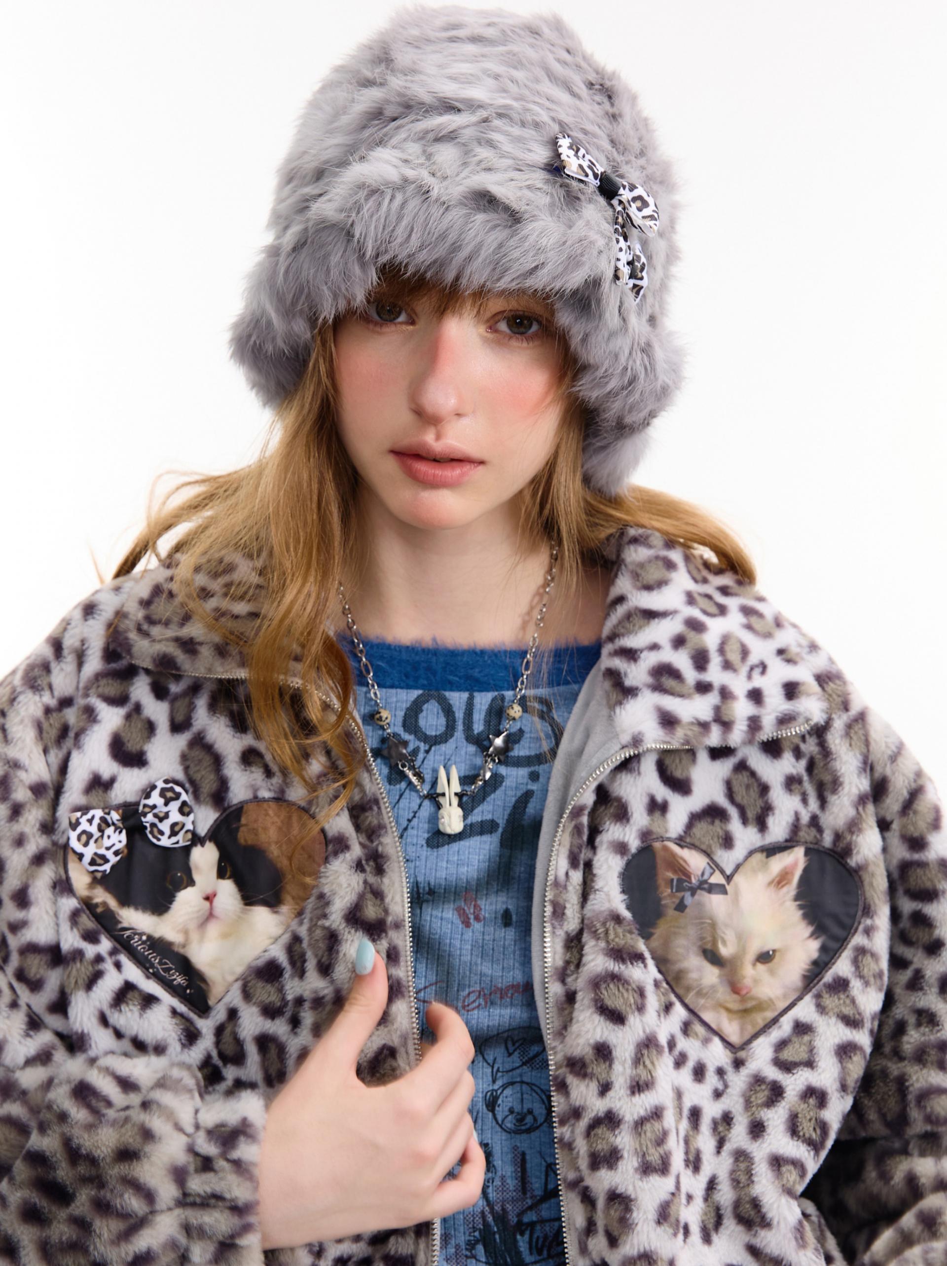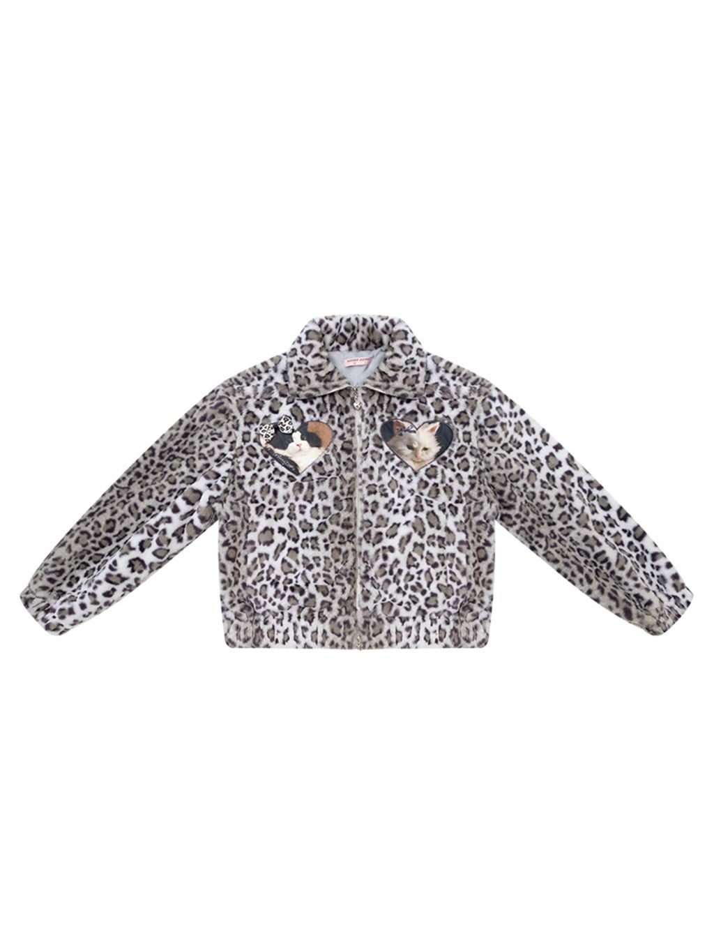 하트 속 고양이 포인트가 사랑스러움을 극대화한 레오파드 퍼 자켓입니다.