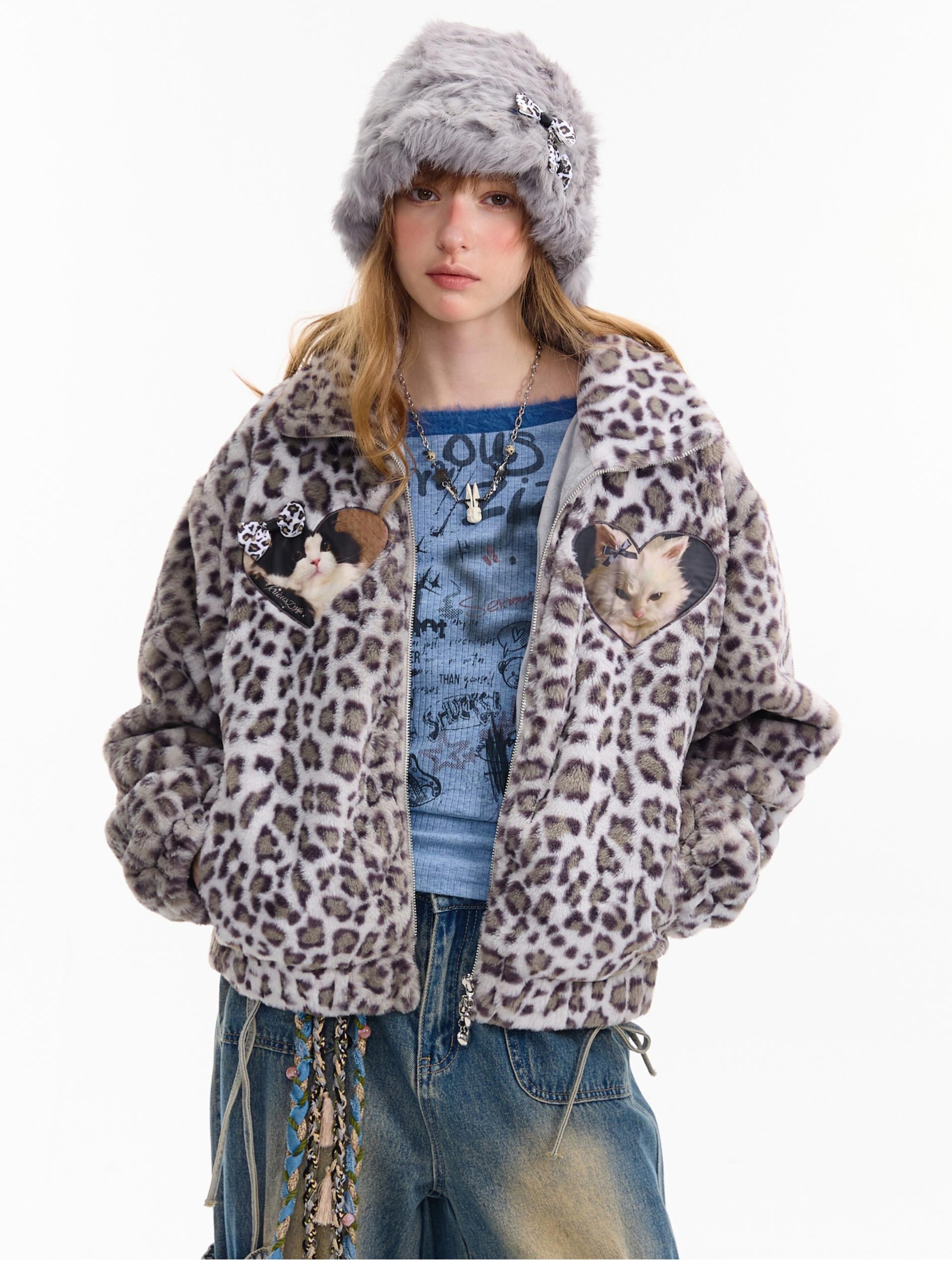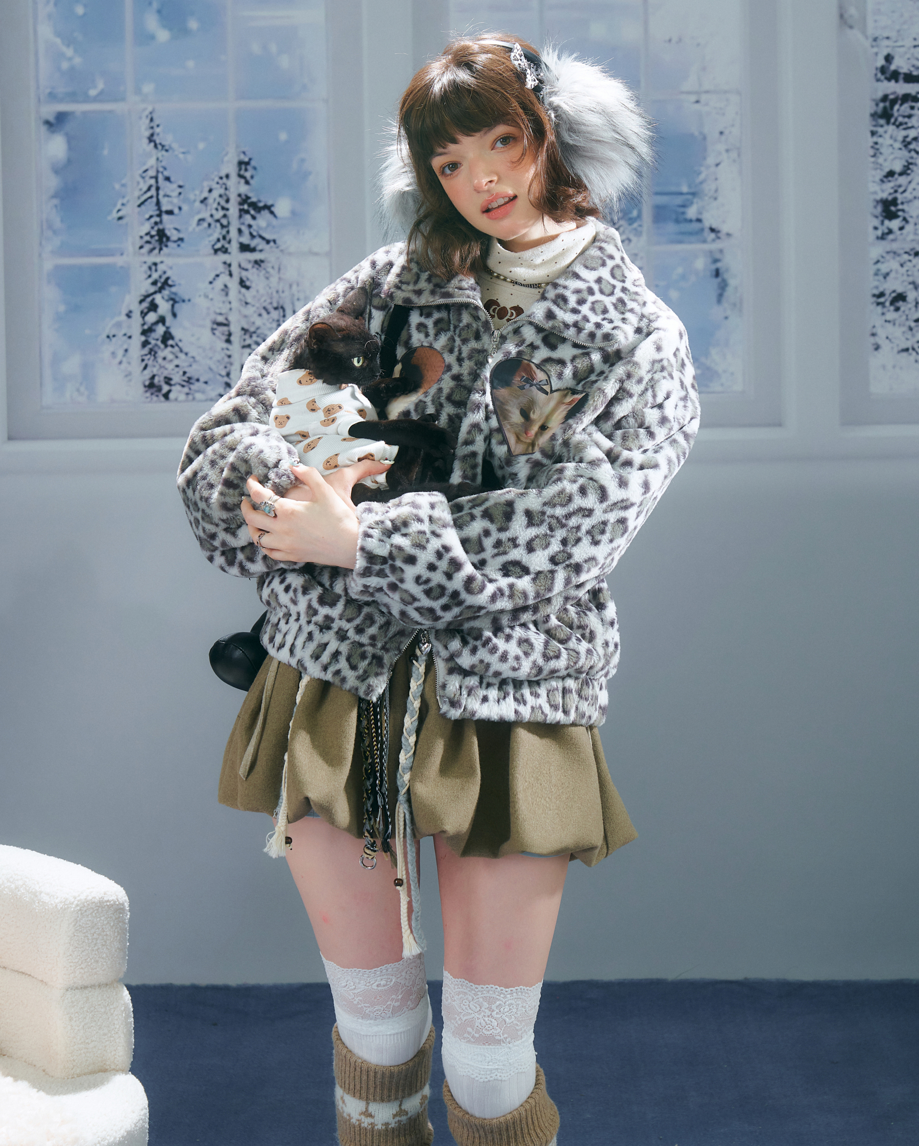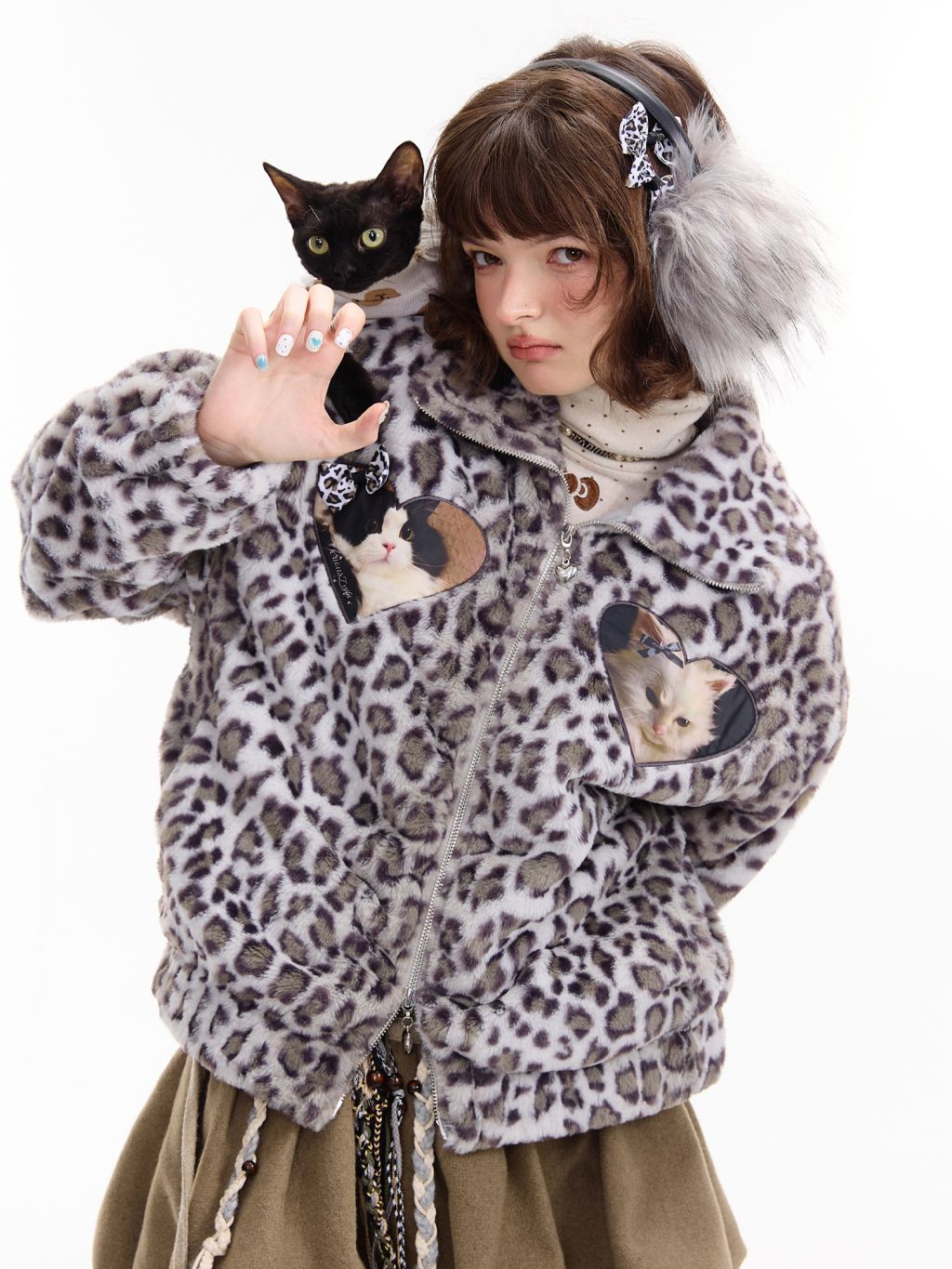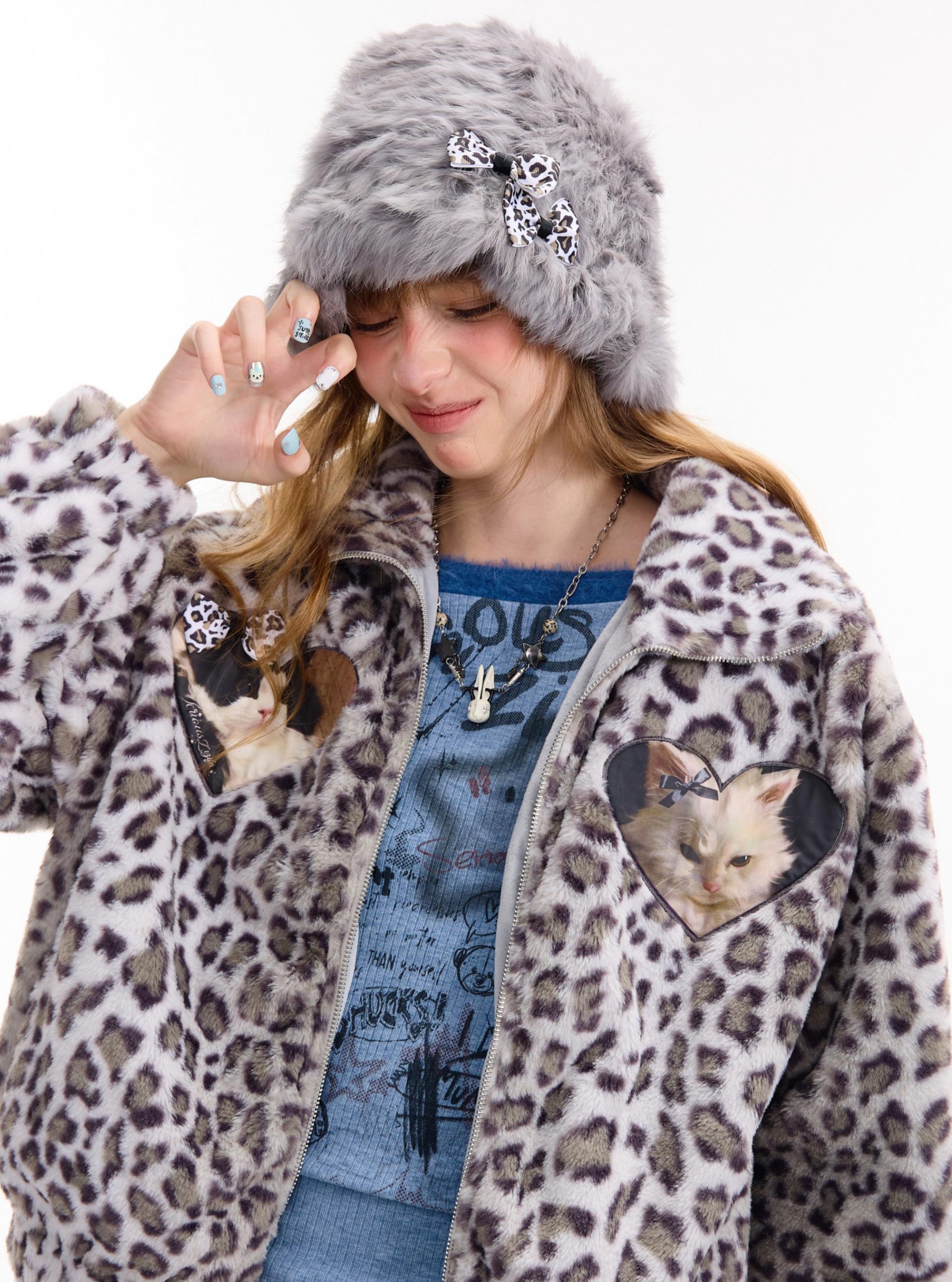 하트 속 고양이 포인트가 사랑스러움을 극대화한 레오파드 퍼 자켓입니다.