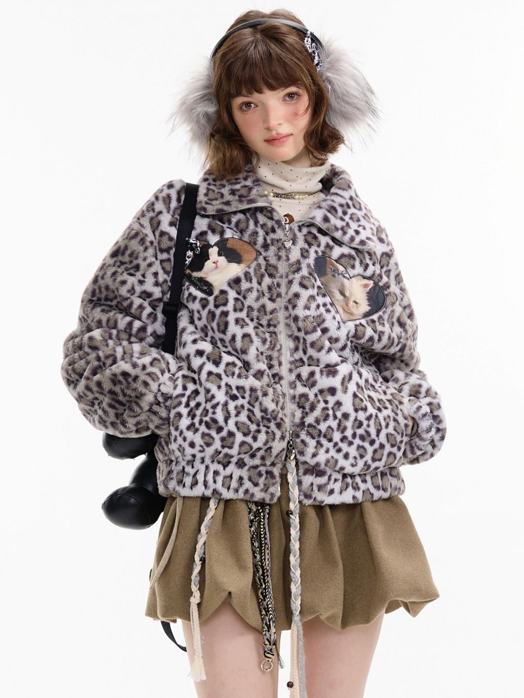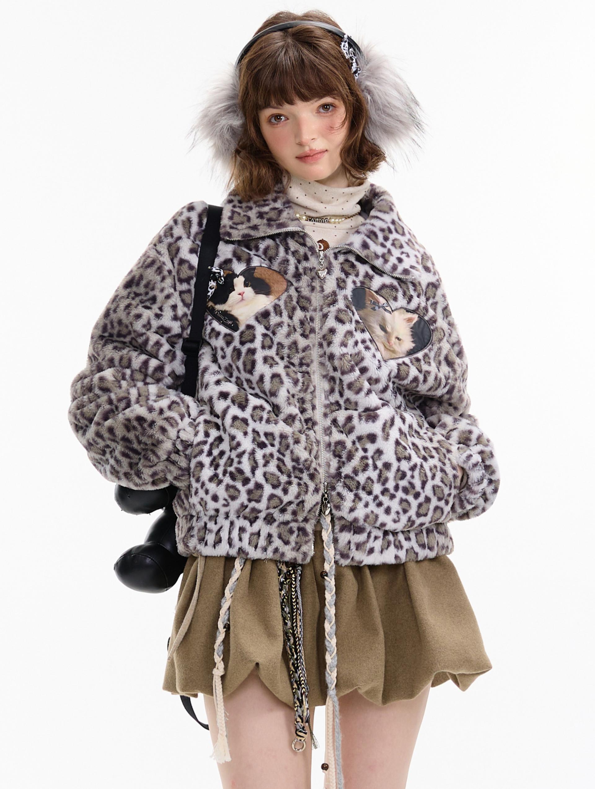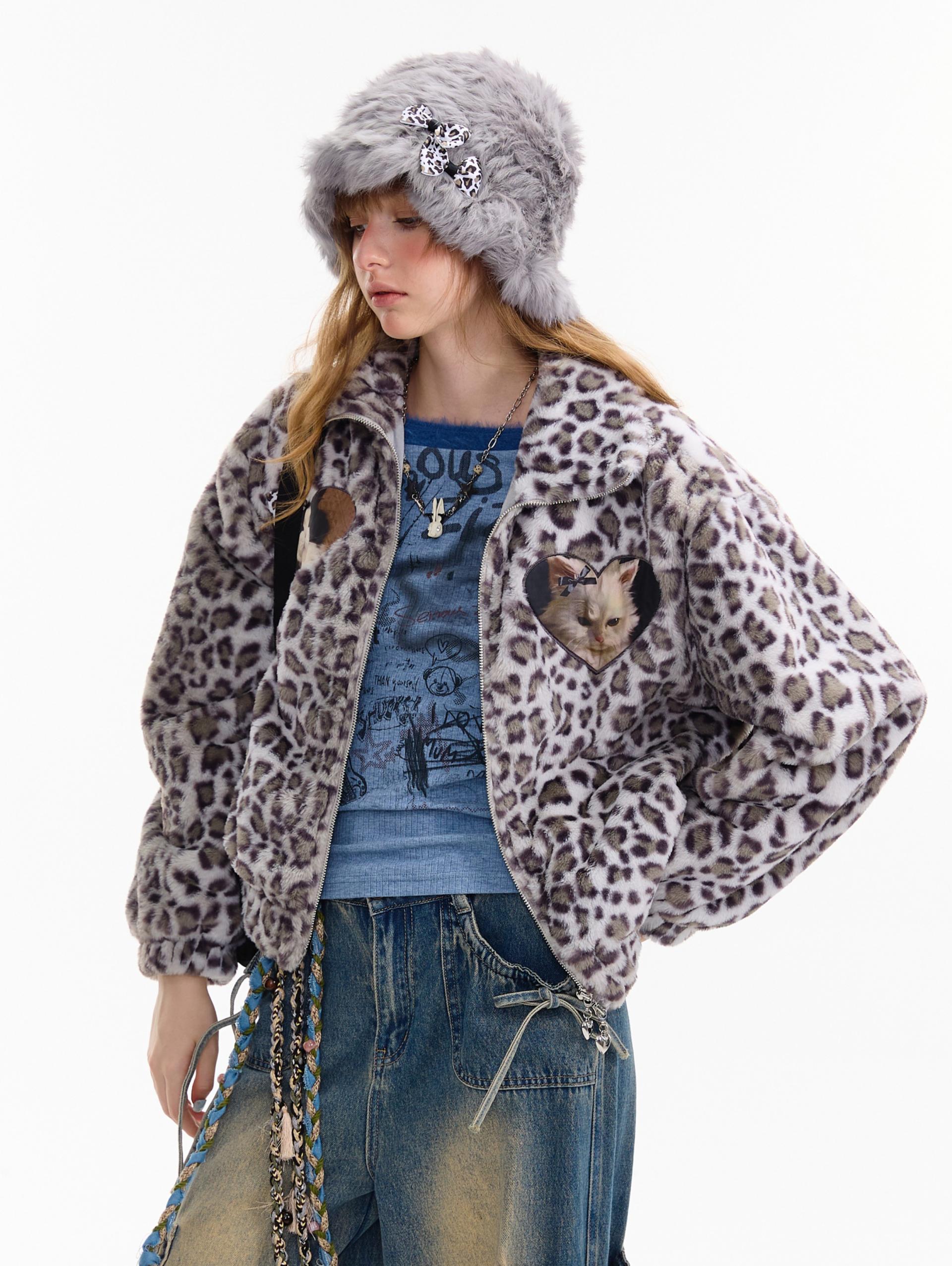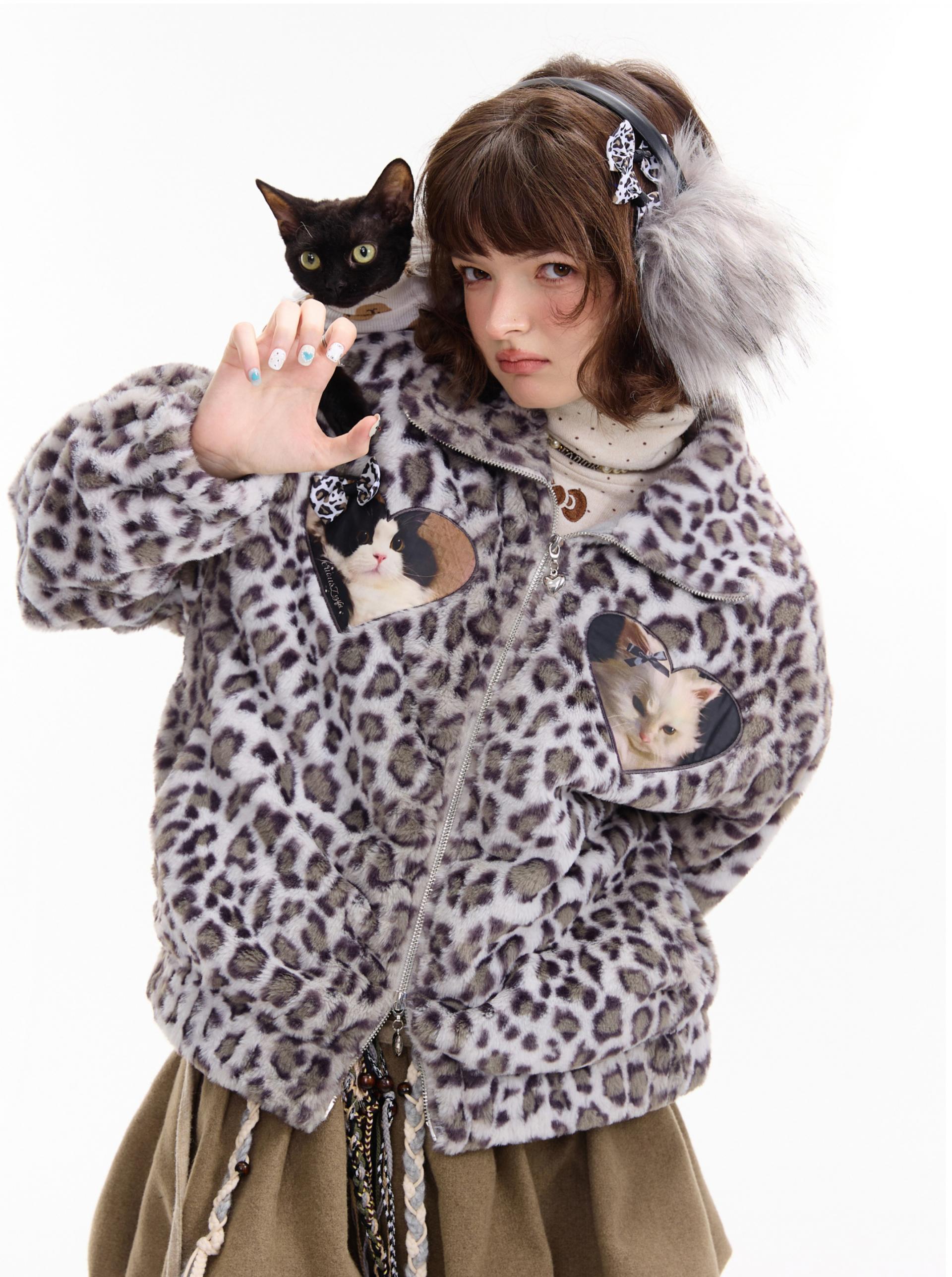 하트 속 고양이 포인트가 사랑스러움을 극대화한 레오파드 퍼 자켓입니다.