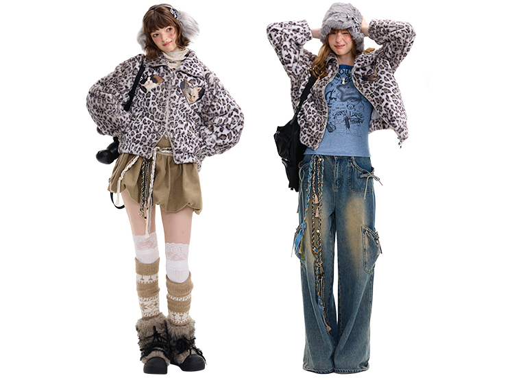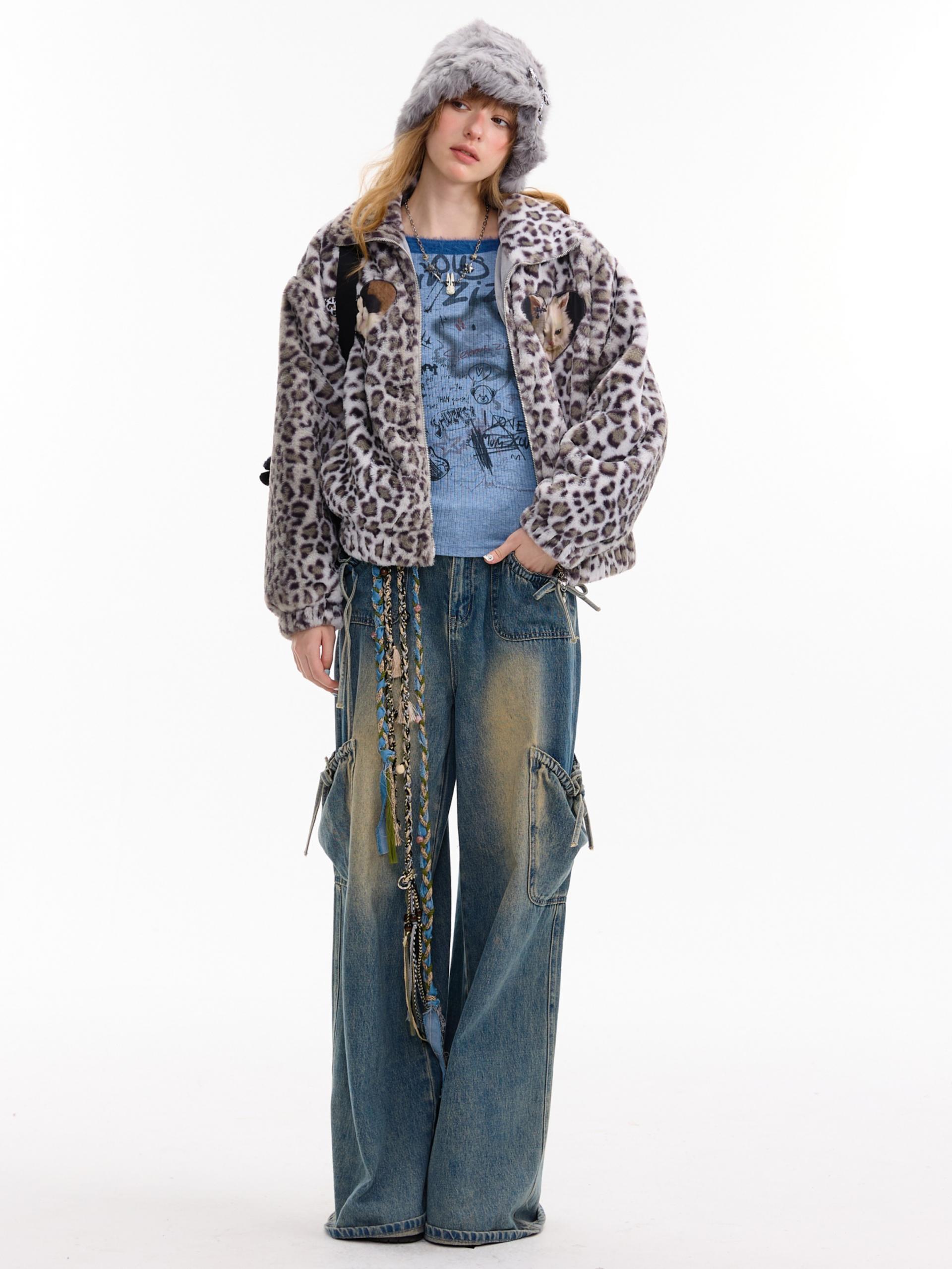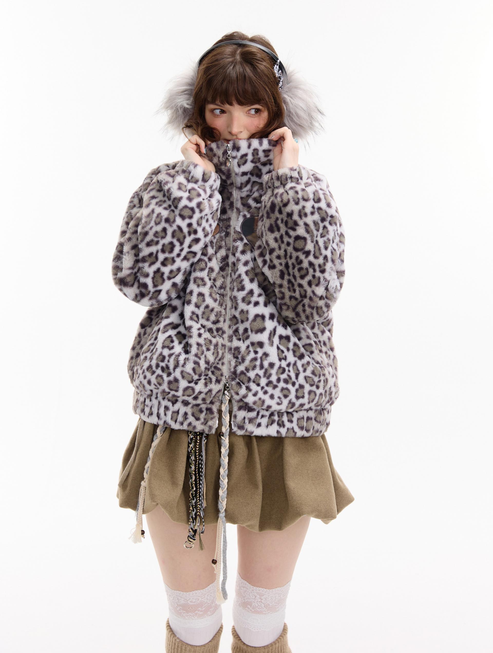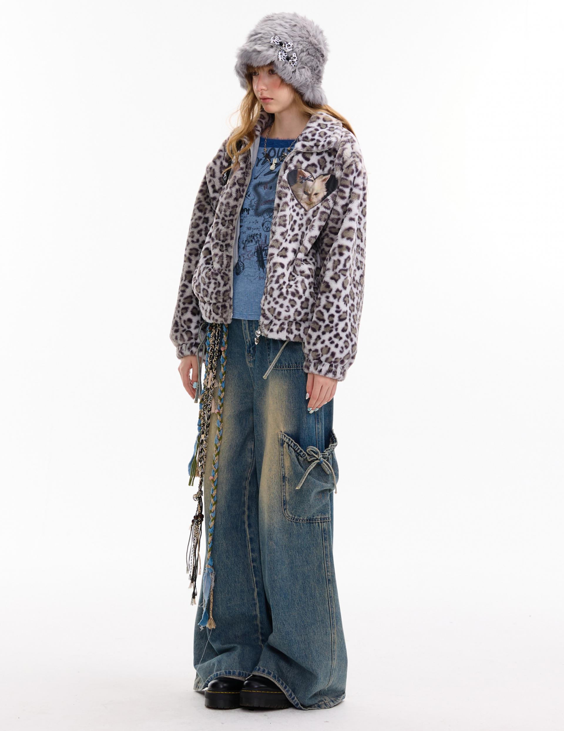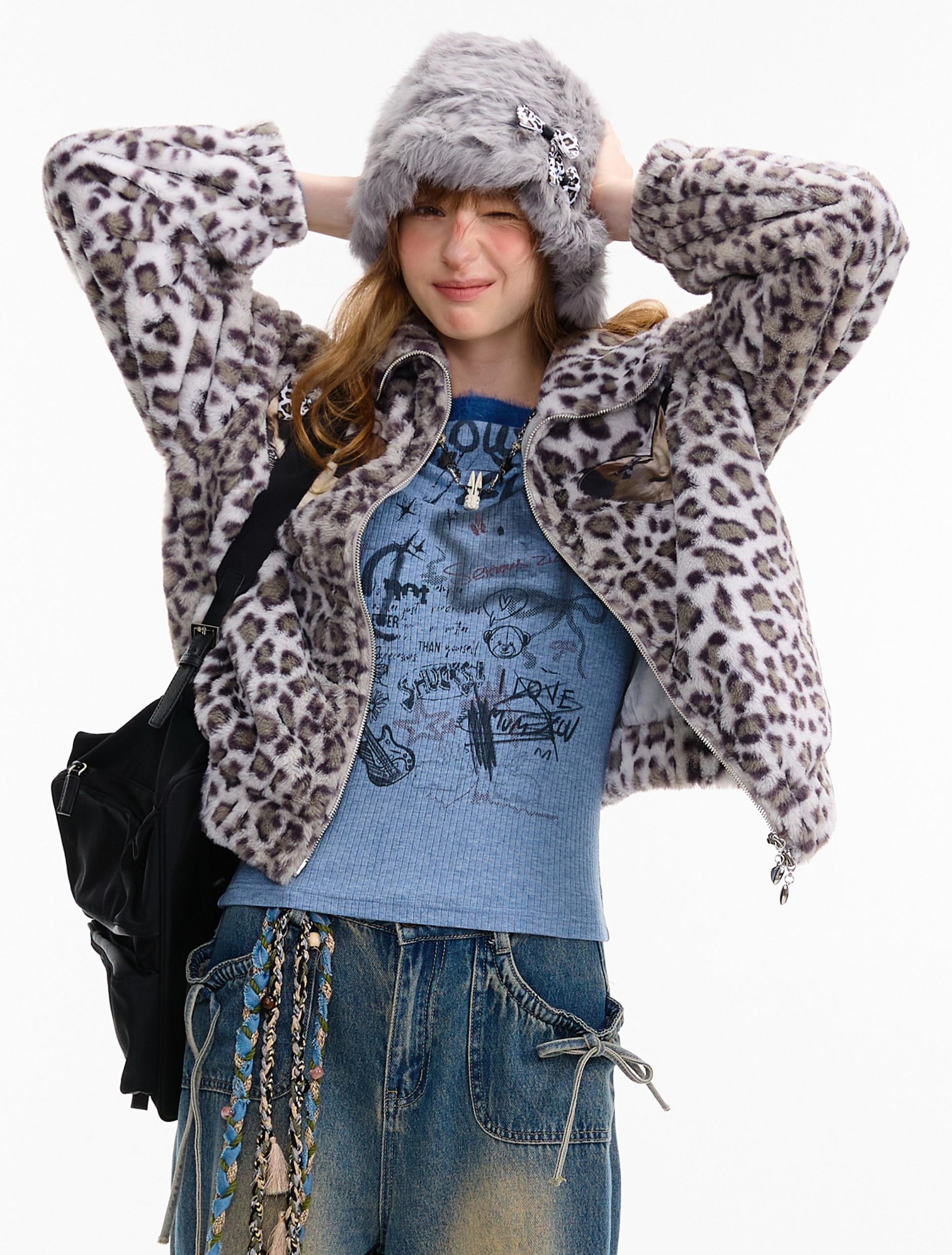 하트 속 고양이 포인트가 사랑스러움을 극대화한 레오파드 퍼 자켓입니다.