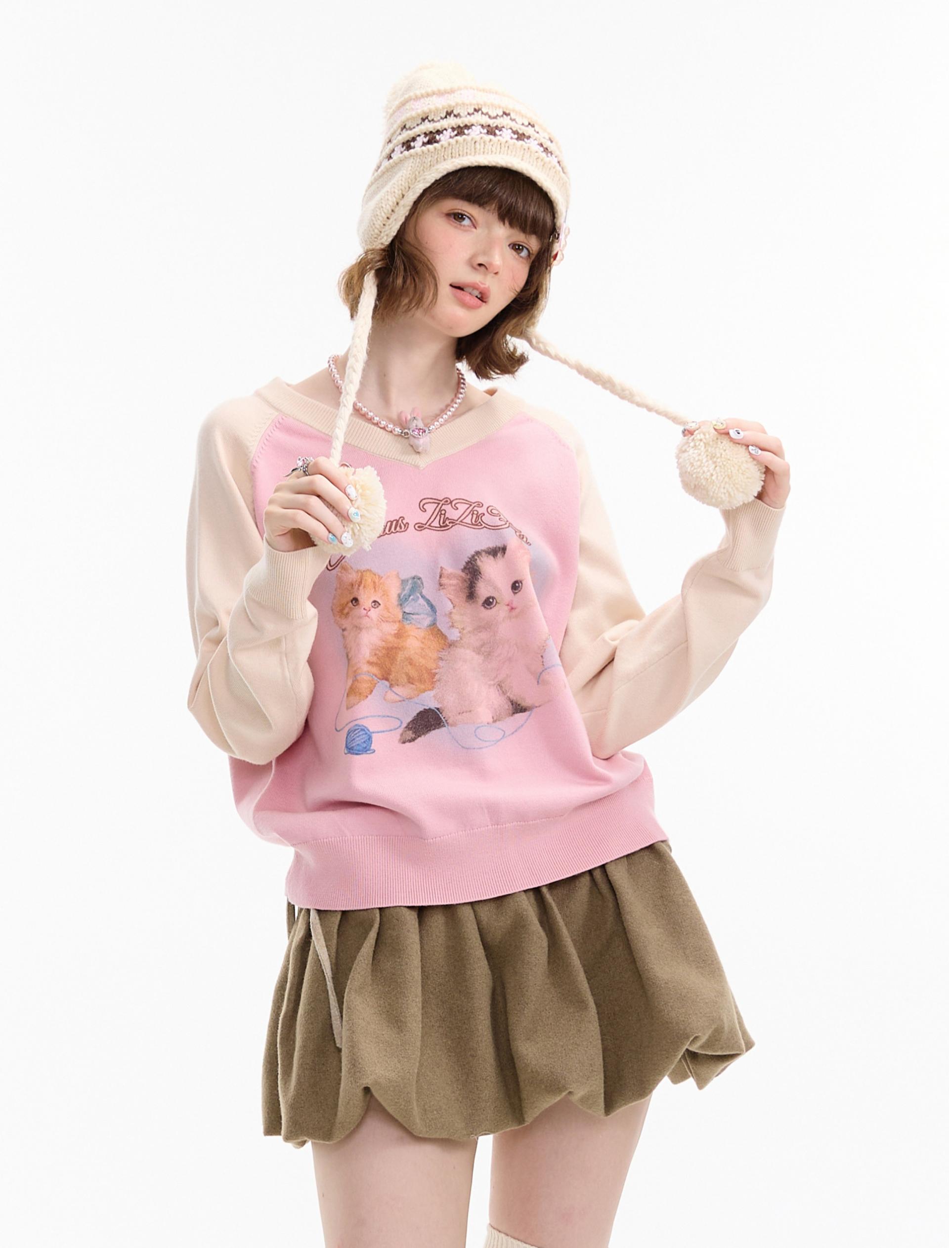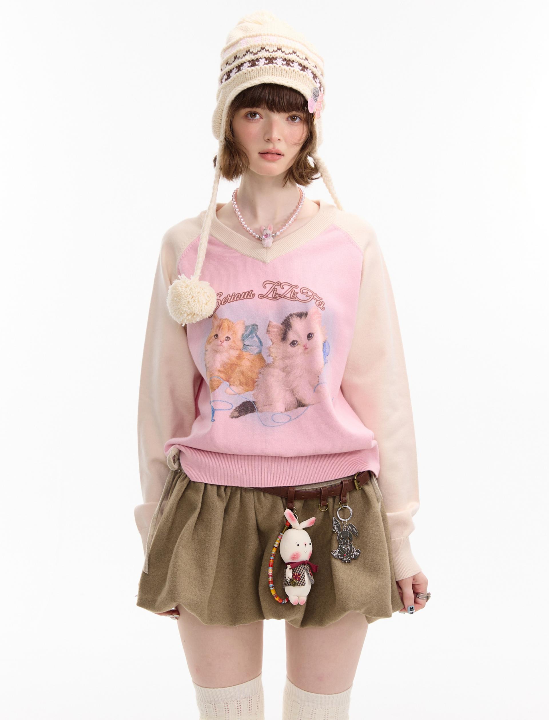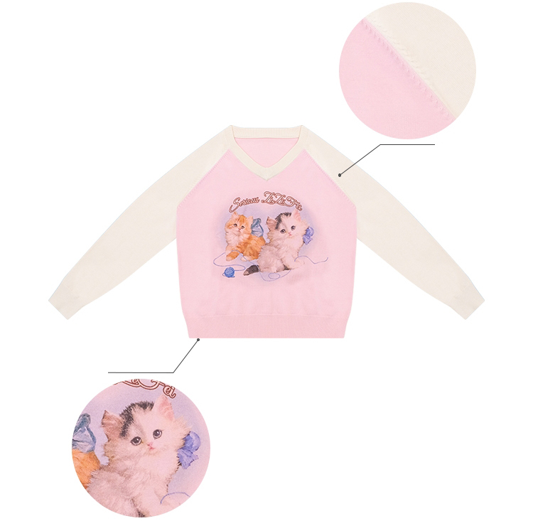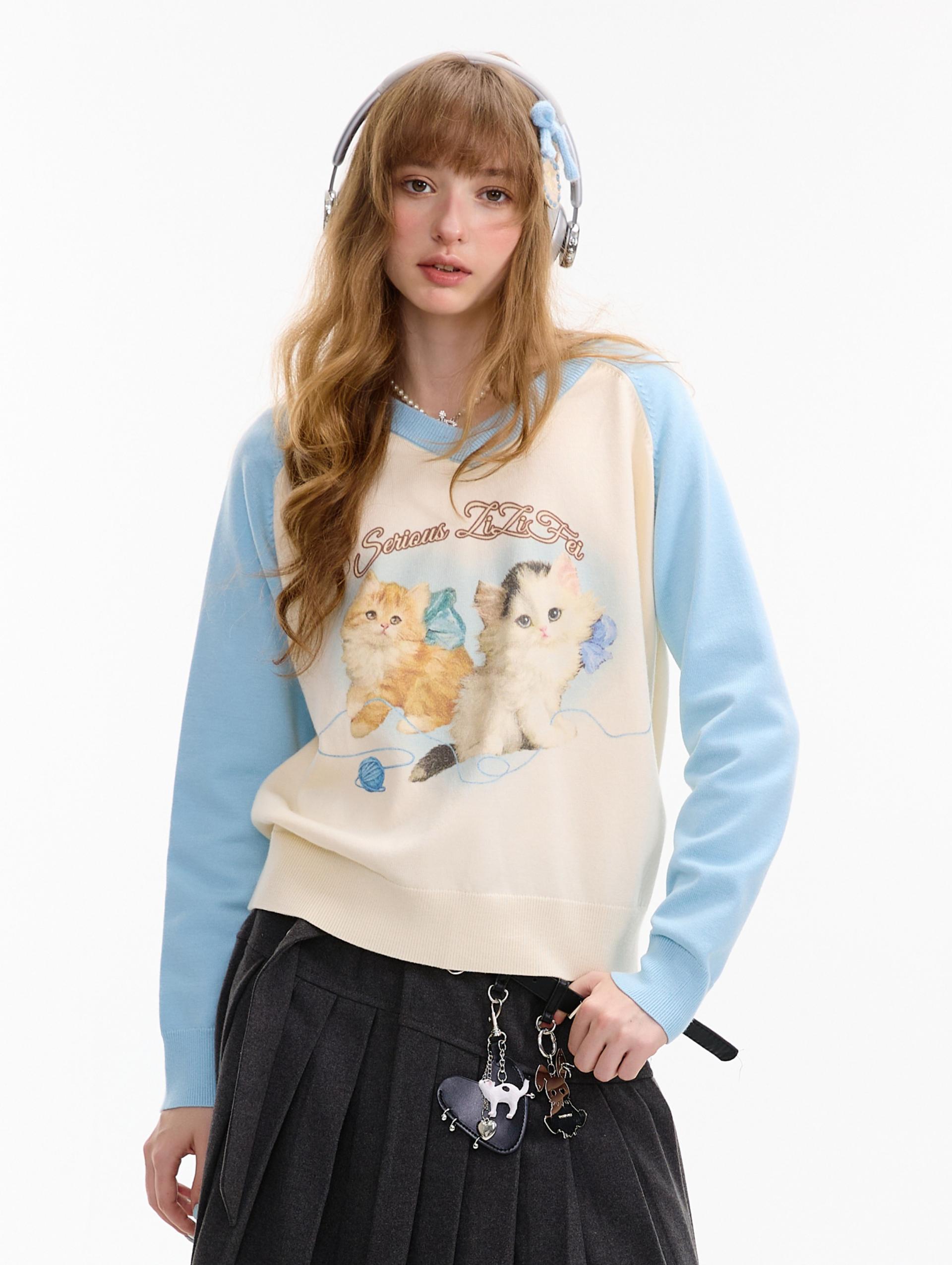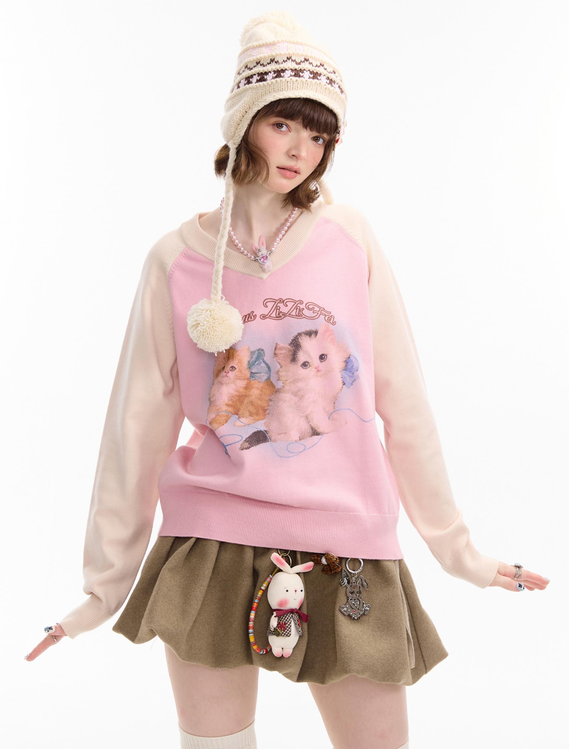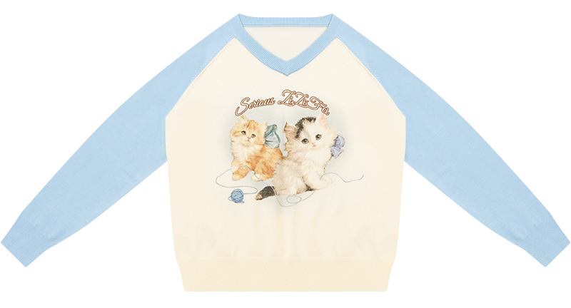 사랑스러운 고양이 그래픽과 배색 래글런 디자인으로 겨울 무드를 한껏 살린 니트 풀오버입니다.