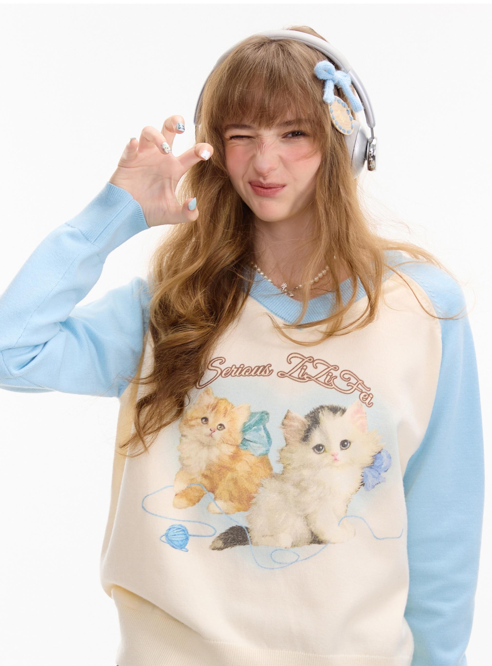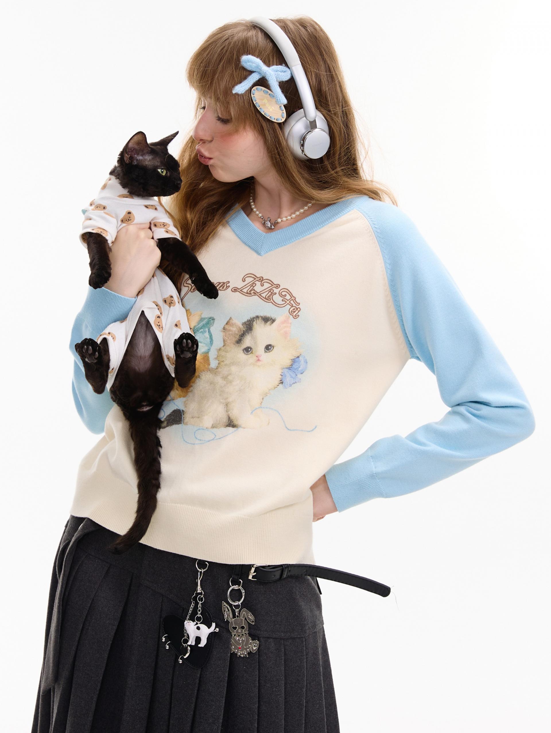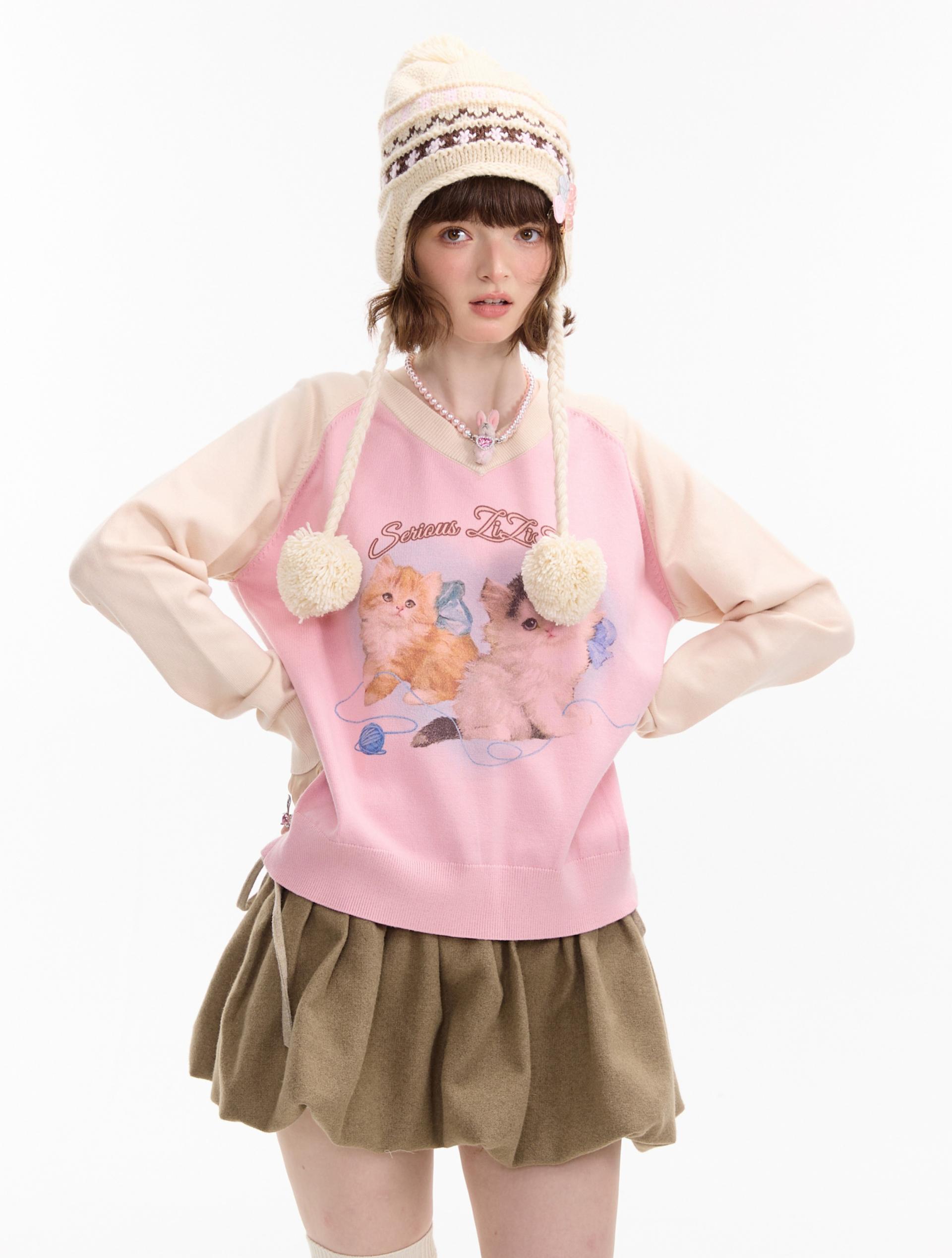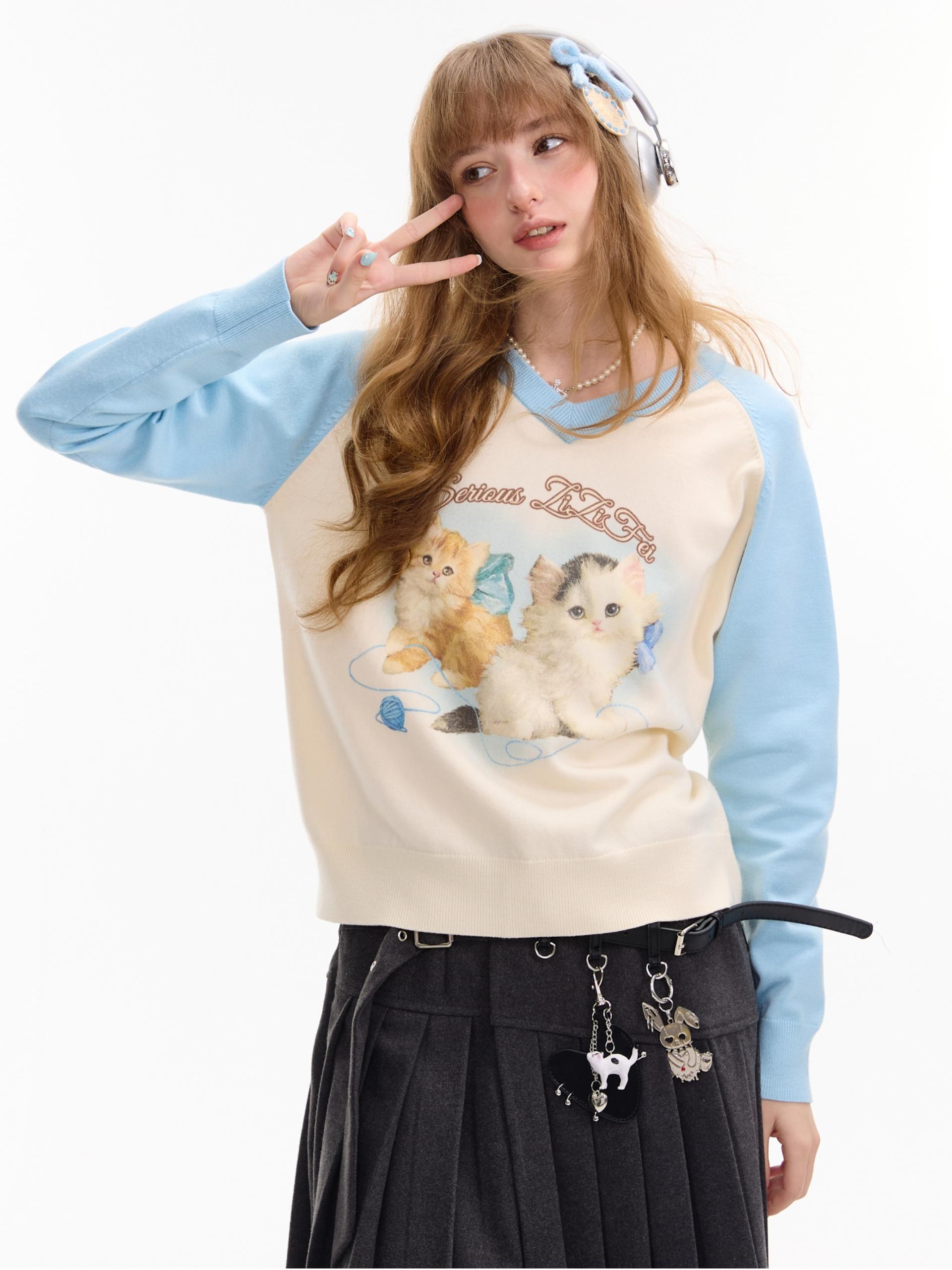 사랑스러운 고양이 그래픽과 배색 래글런 디자인으로 겨울 무드를 한껏 살린 니트 풀오버입니다.