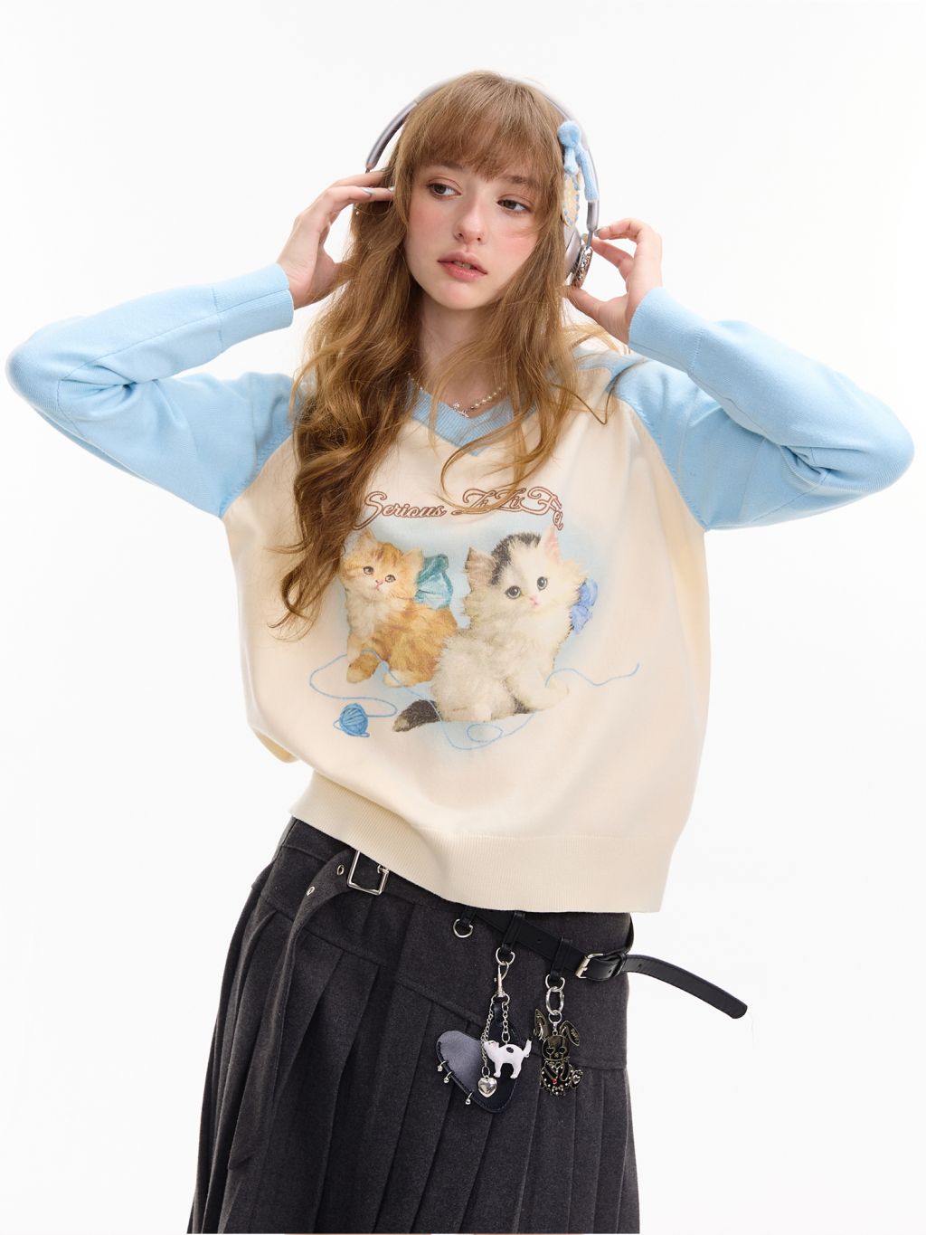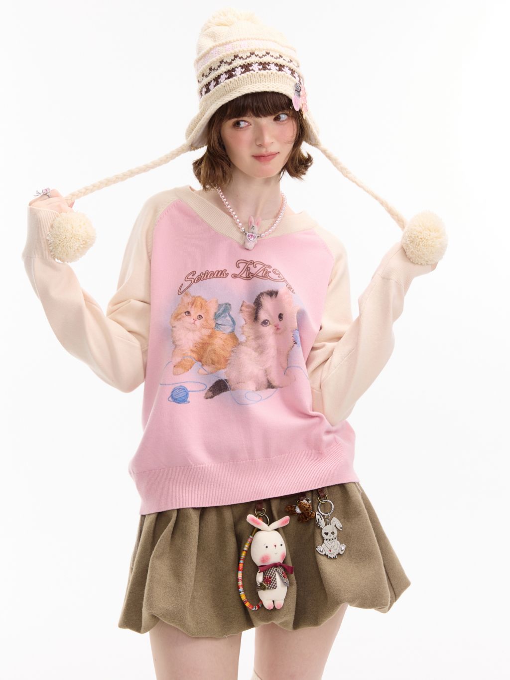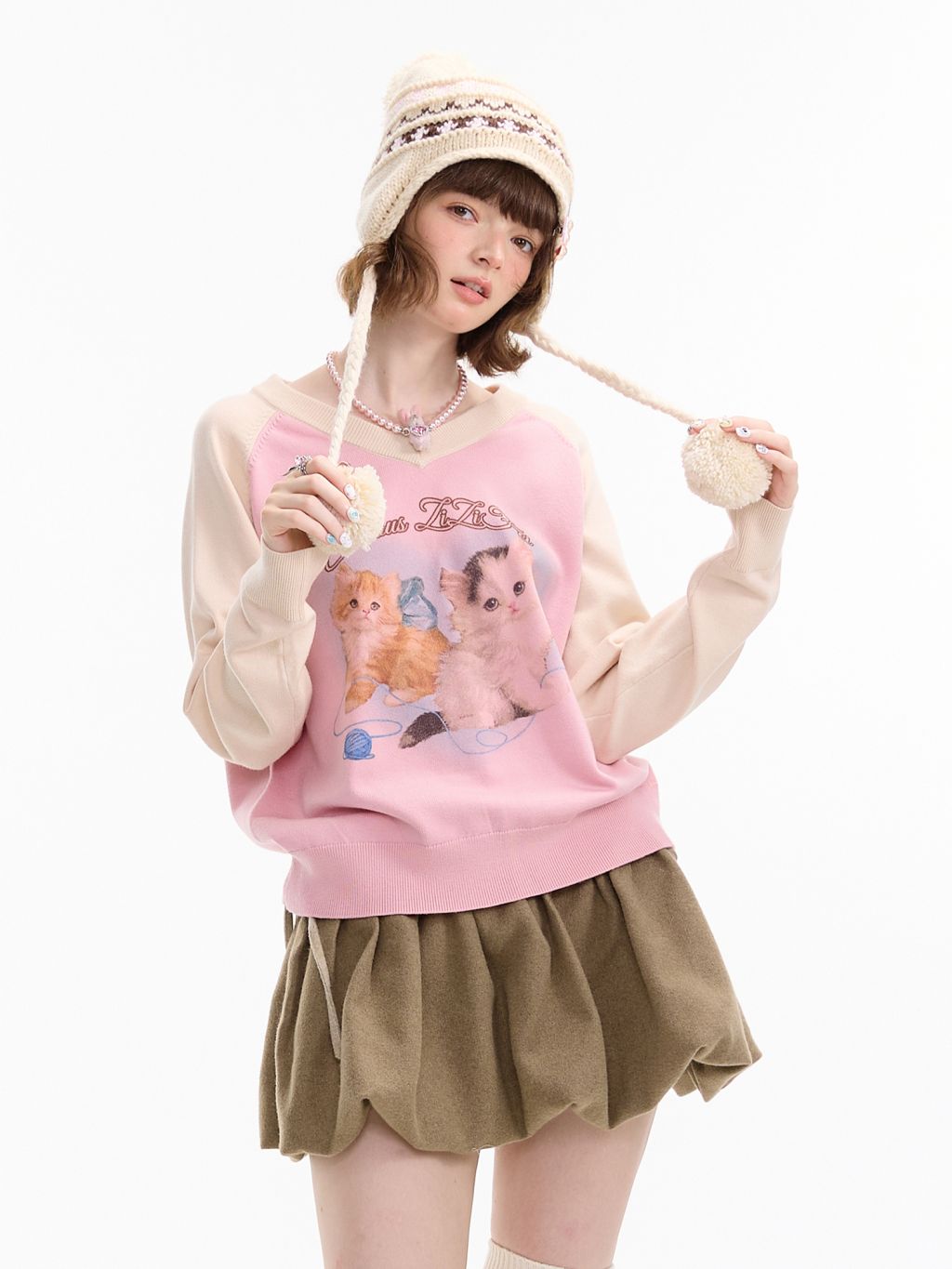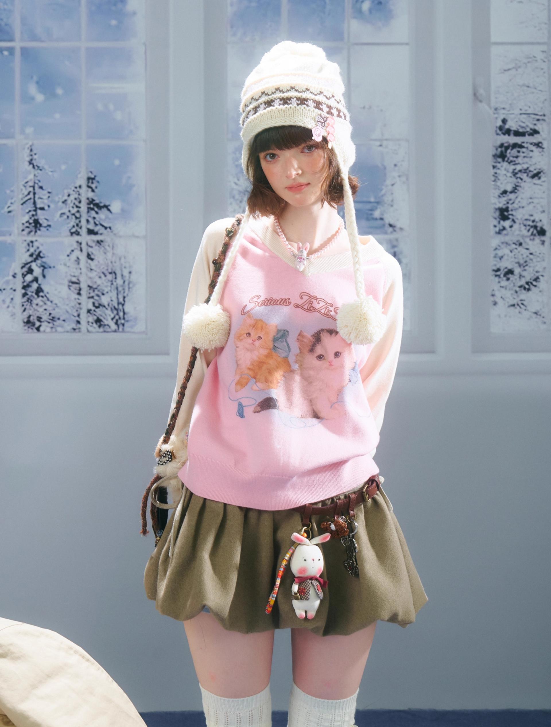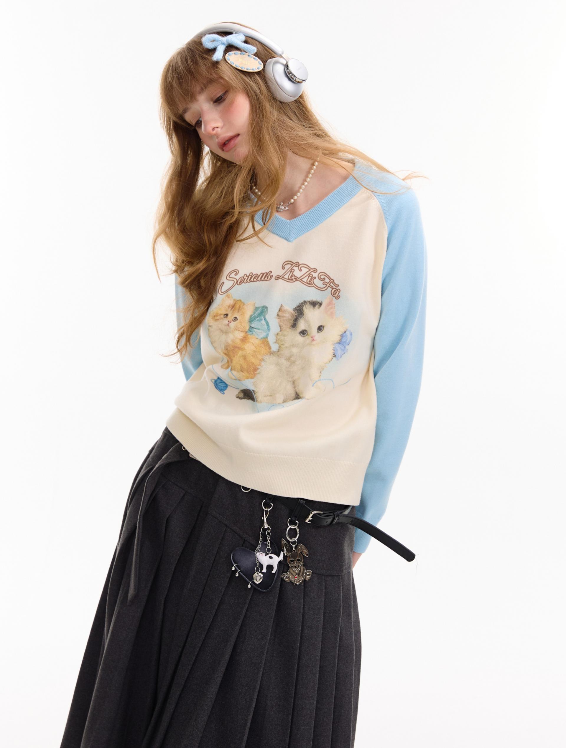 사랑스러운 고양이 그래픽과 배색 래글런 디자인으로 겨울 무드를 한껏 살린 니트 풀오버입니다.
