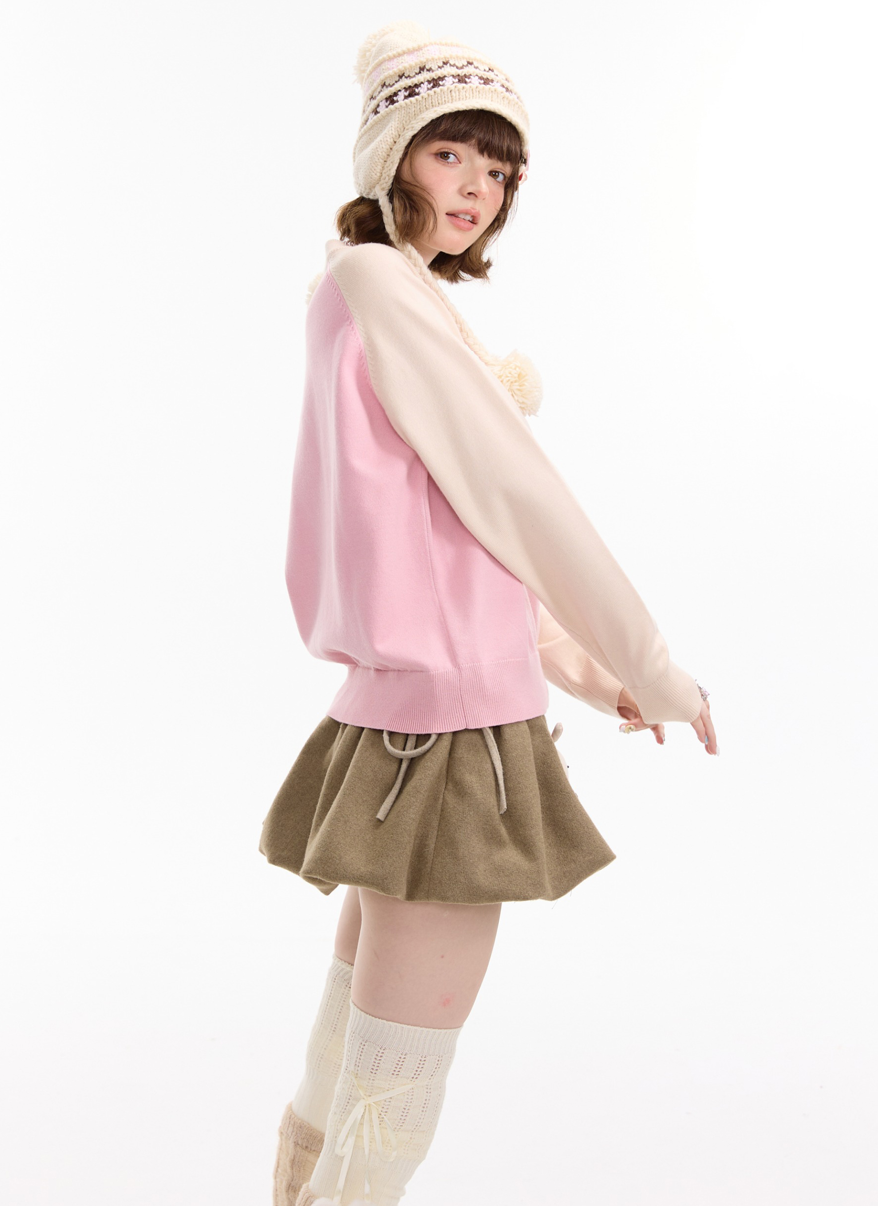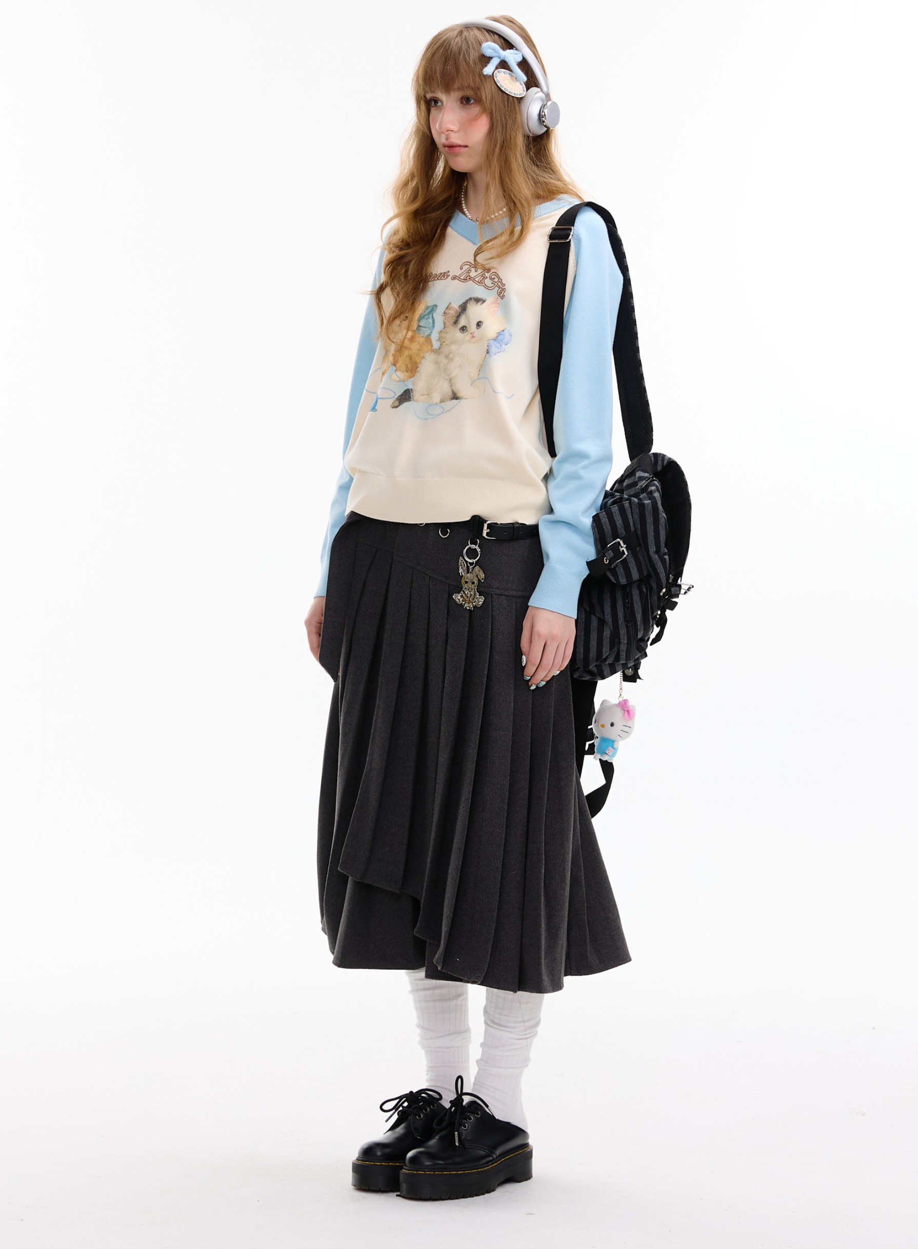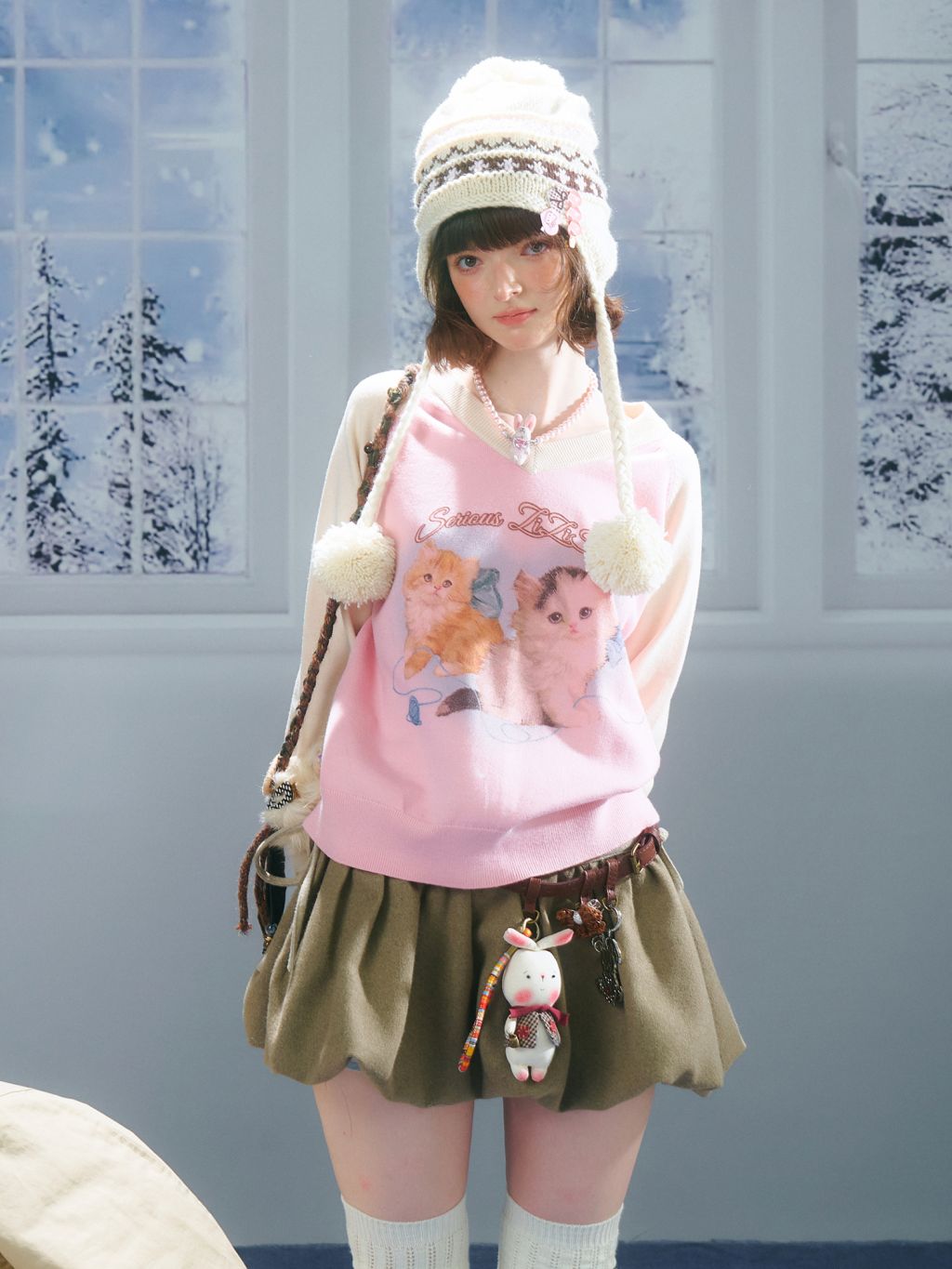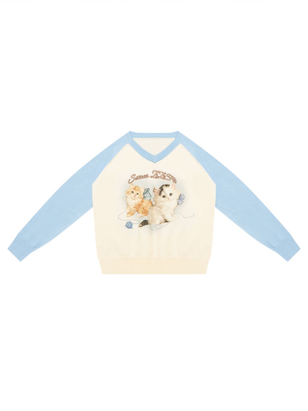 사랑스러운 고양이 그래픽과 배색 래글런 디자인으로 겨울 무드를 한껏 살린 니트 풀오버입니다.