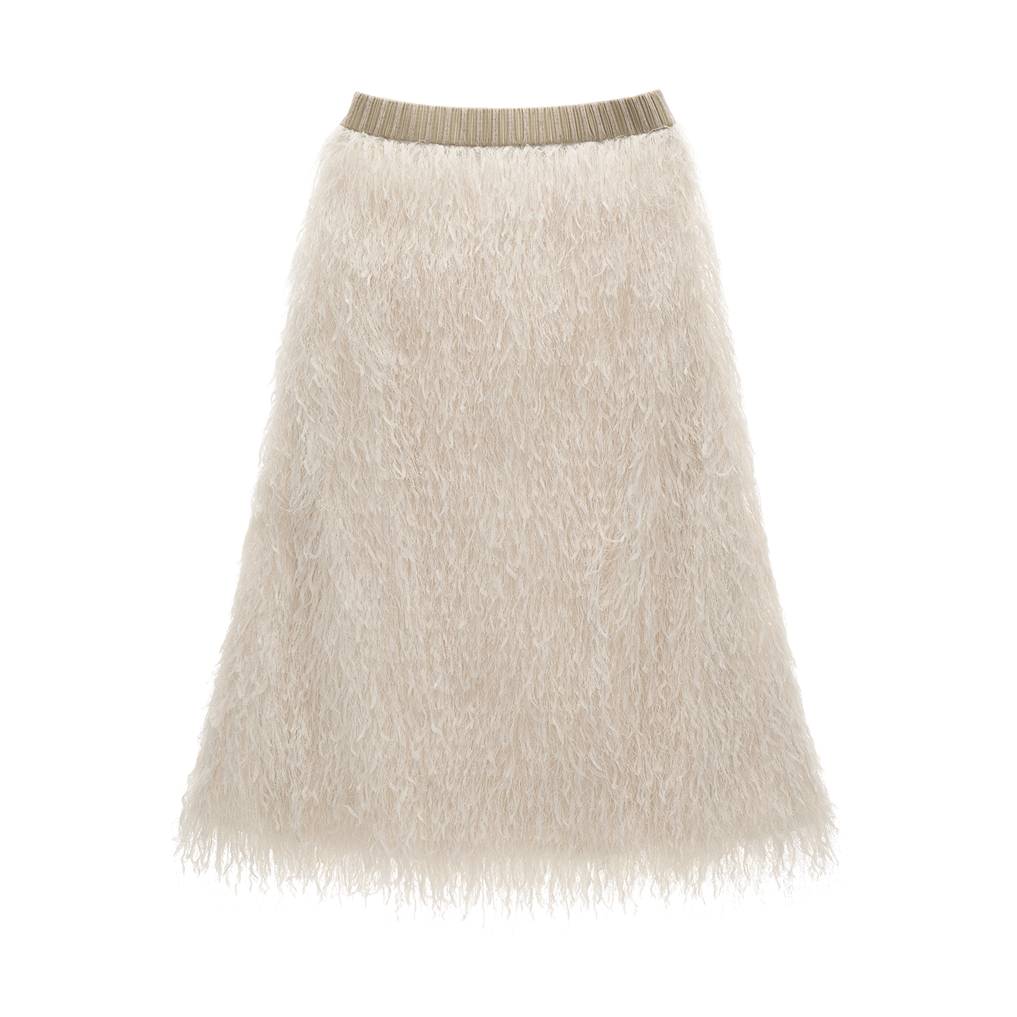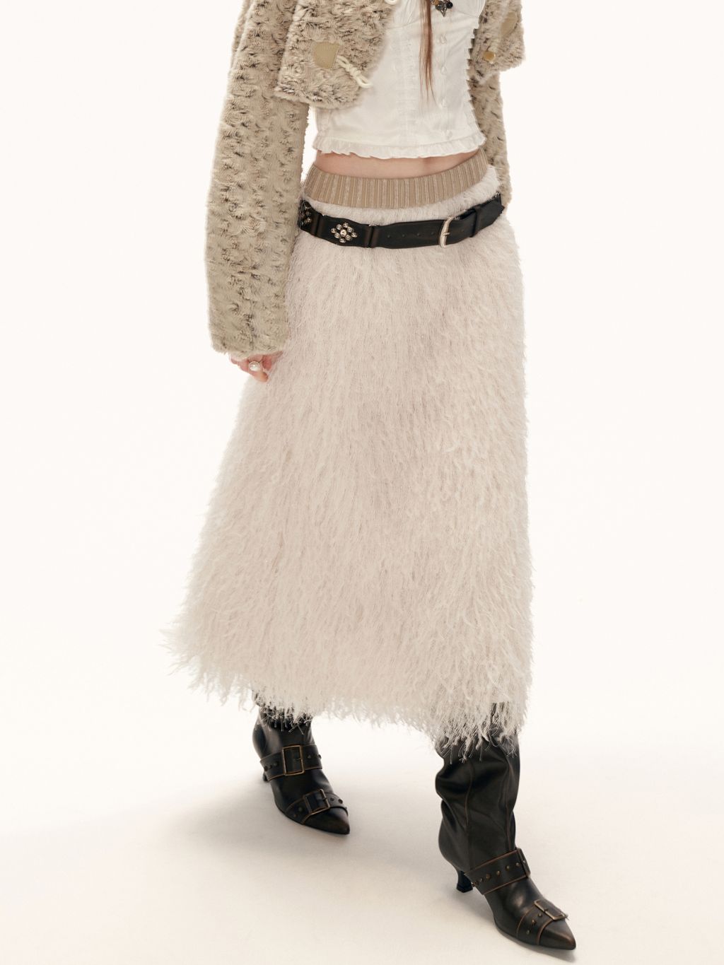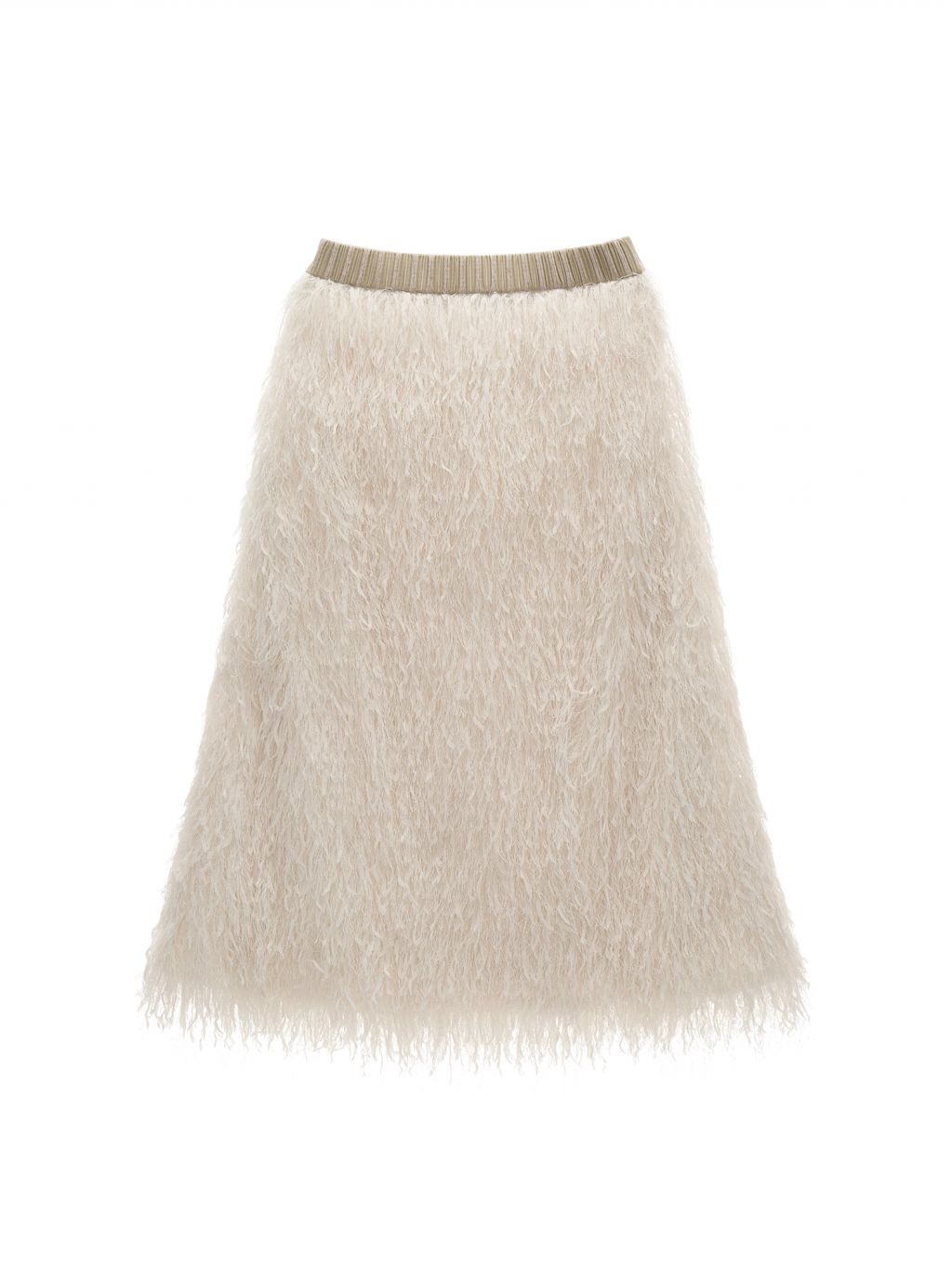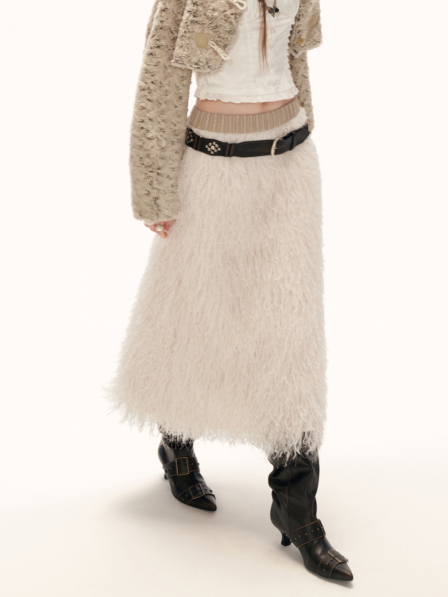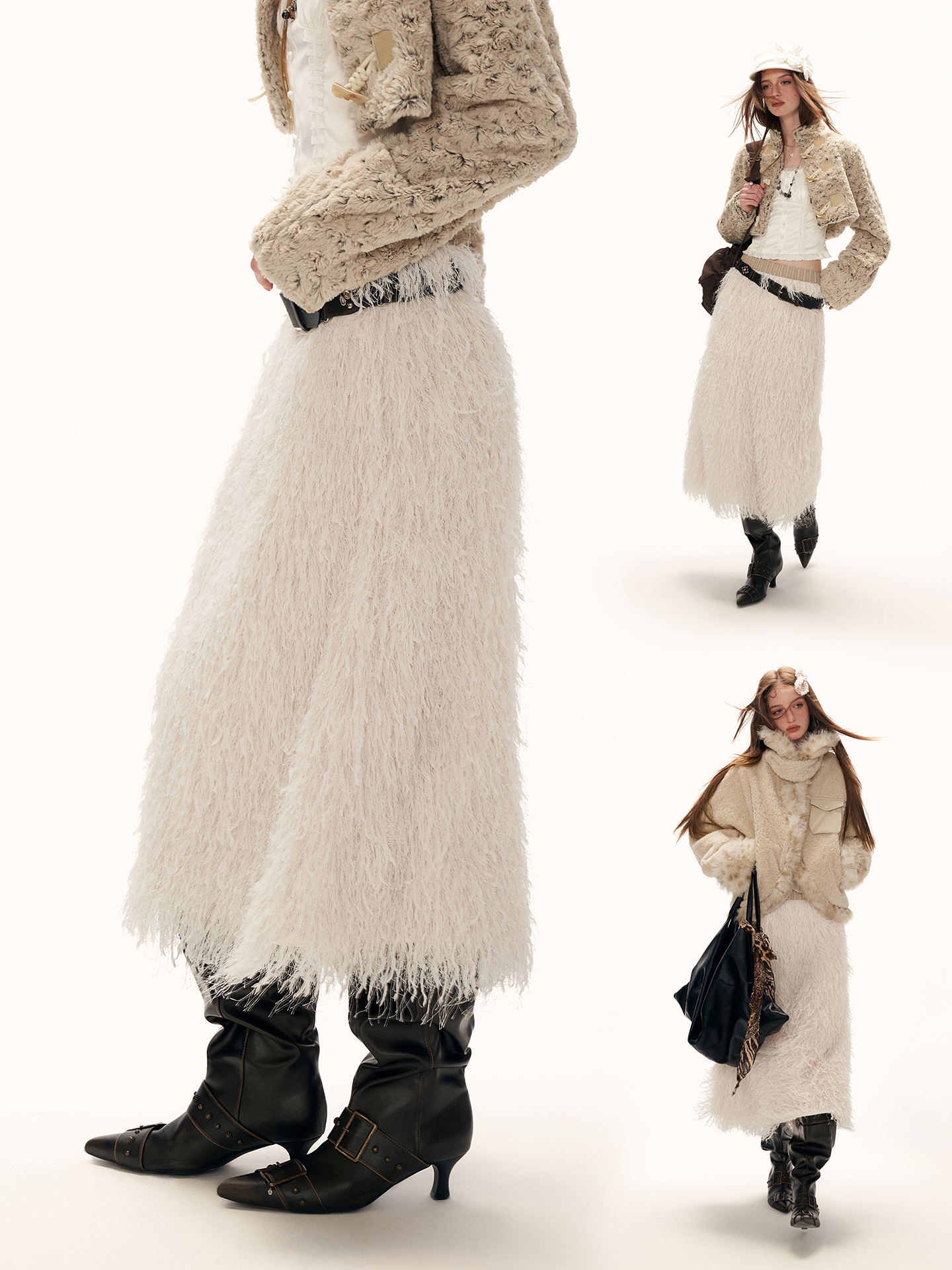 풍성한 퍼 프린지 텍스처로 시즌 무드를 고급스럽게 완성하는 윈터 스커트입니다.