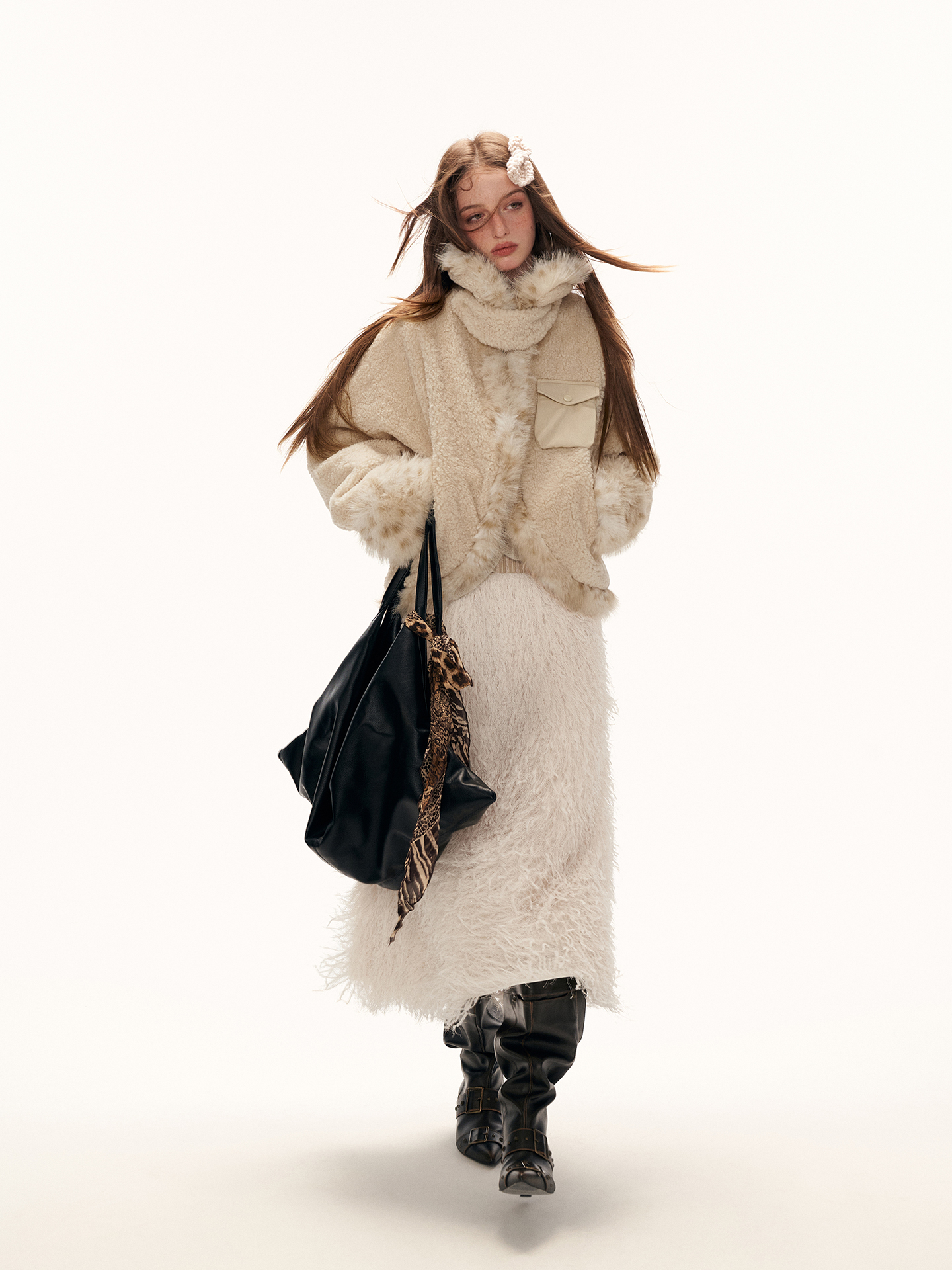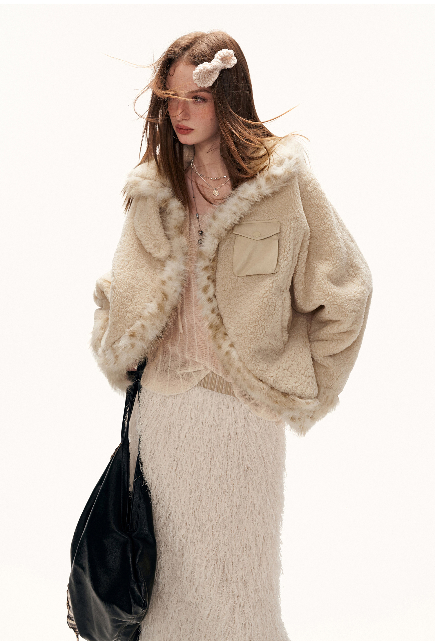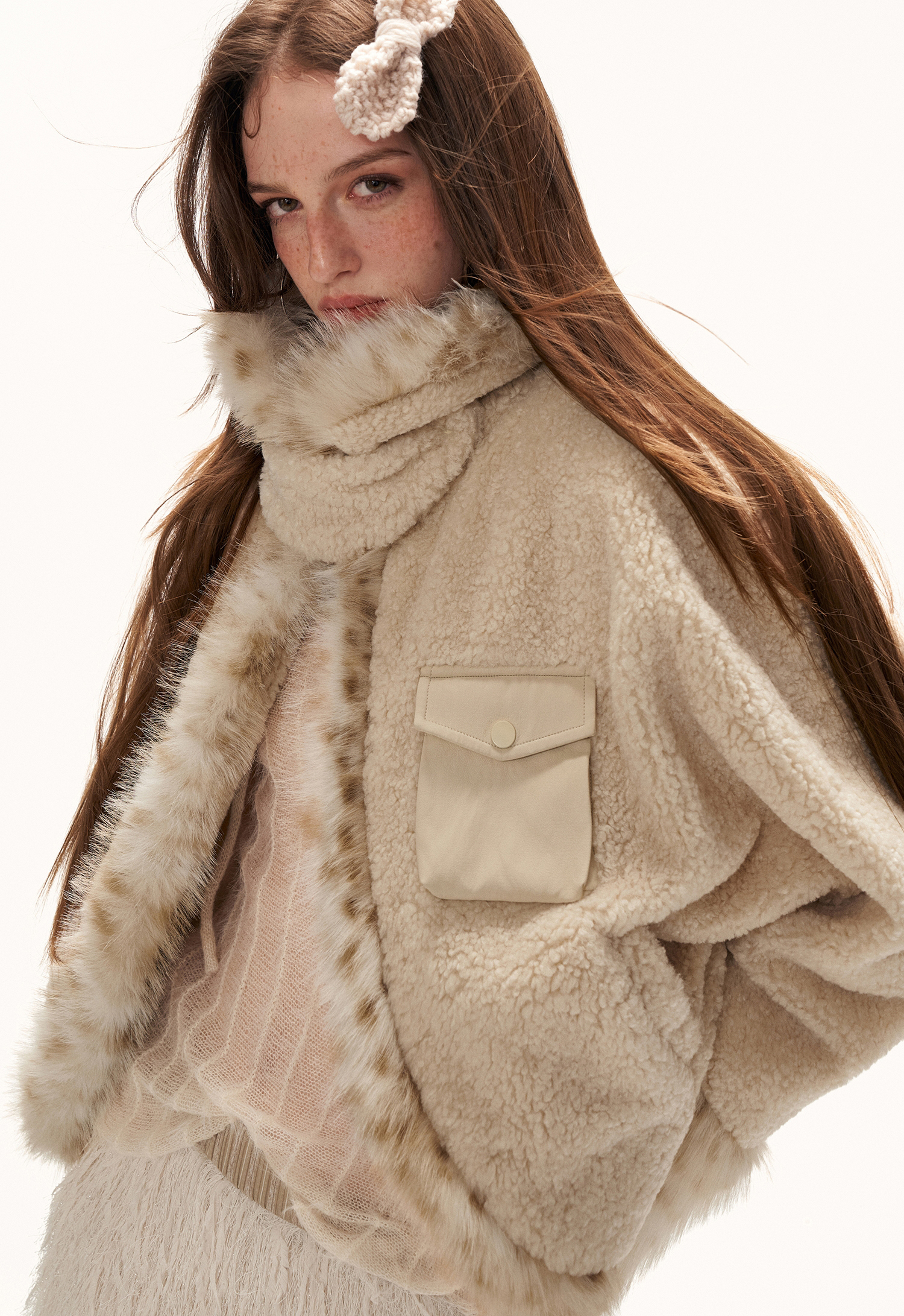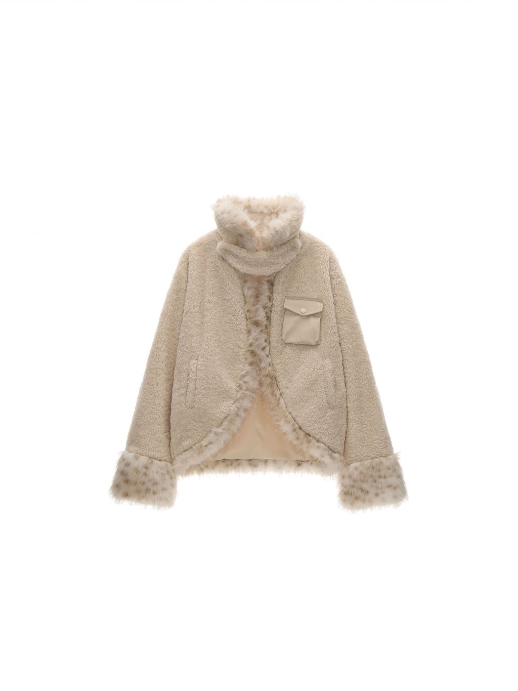 레오파드 퍼 트리밍과 포근한 셰르파 텍스처가 어우러진 키치한 무드의 크롭 윈터 재킷입니다.