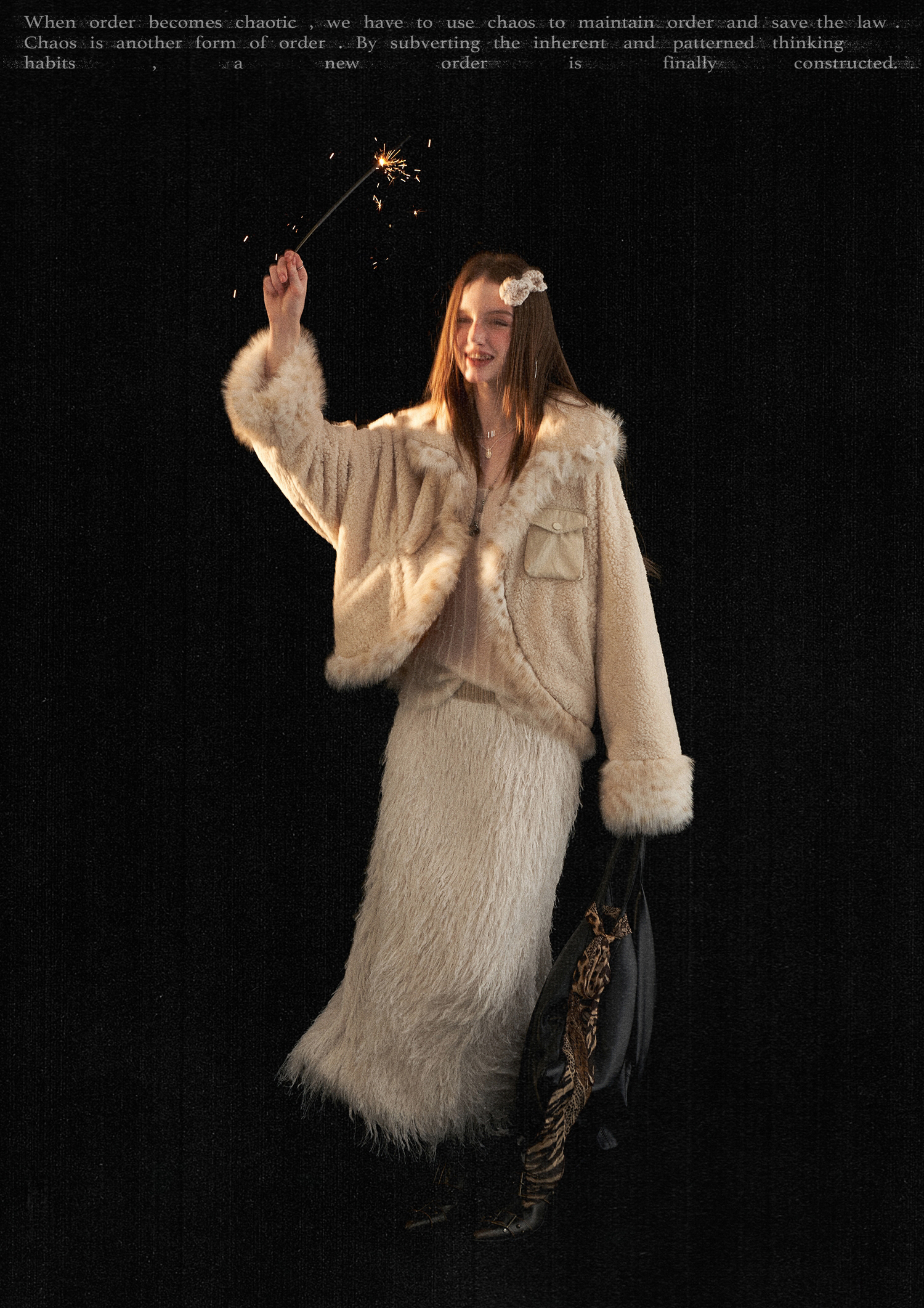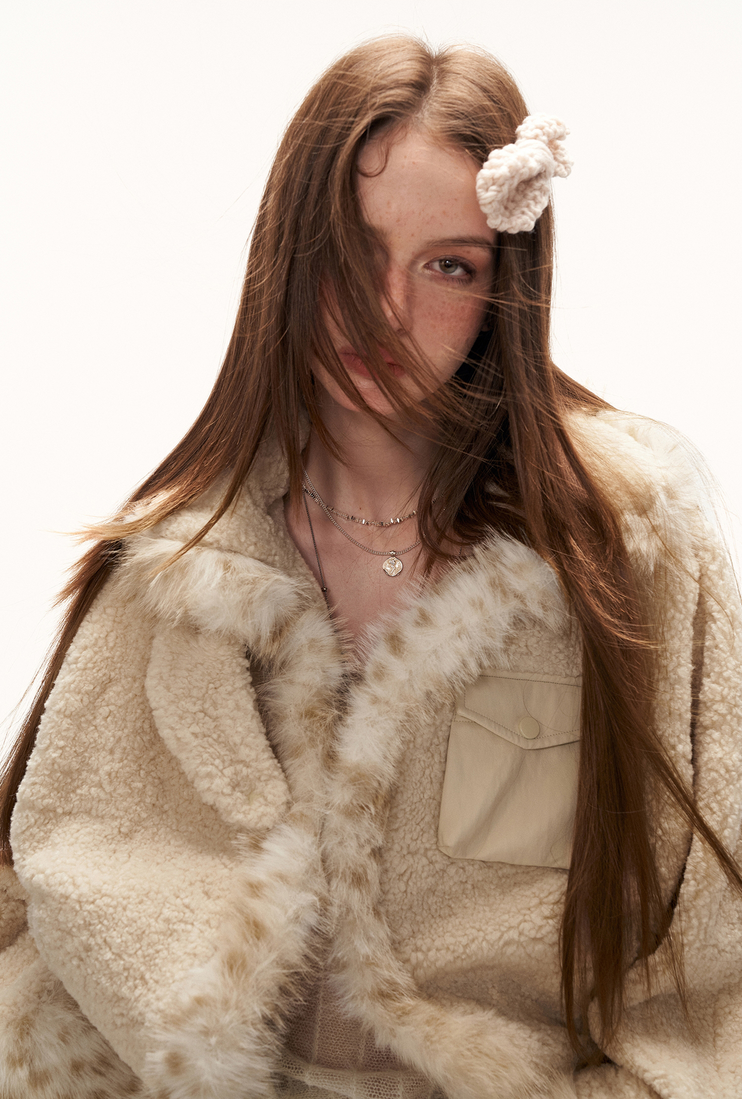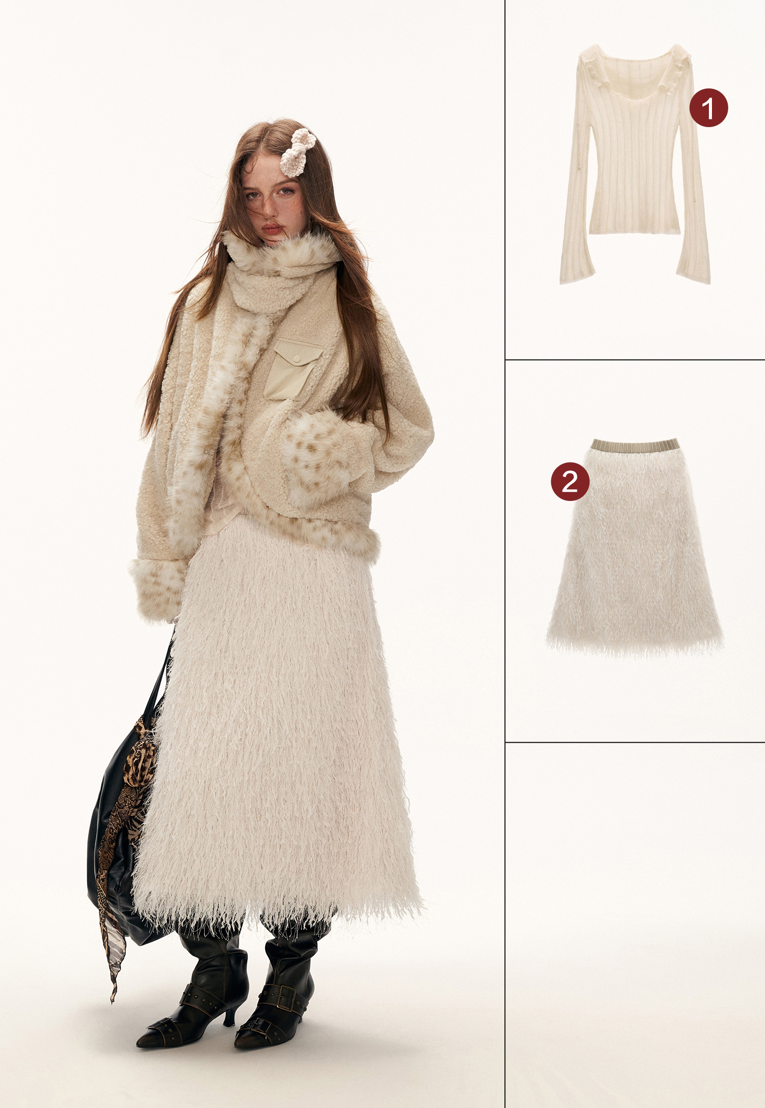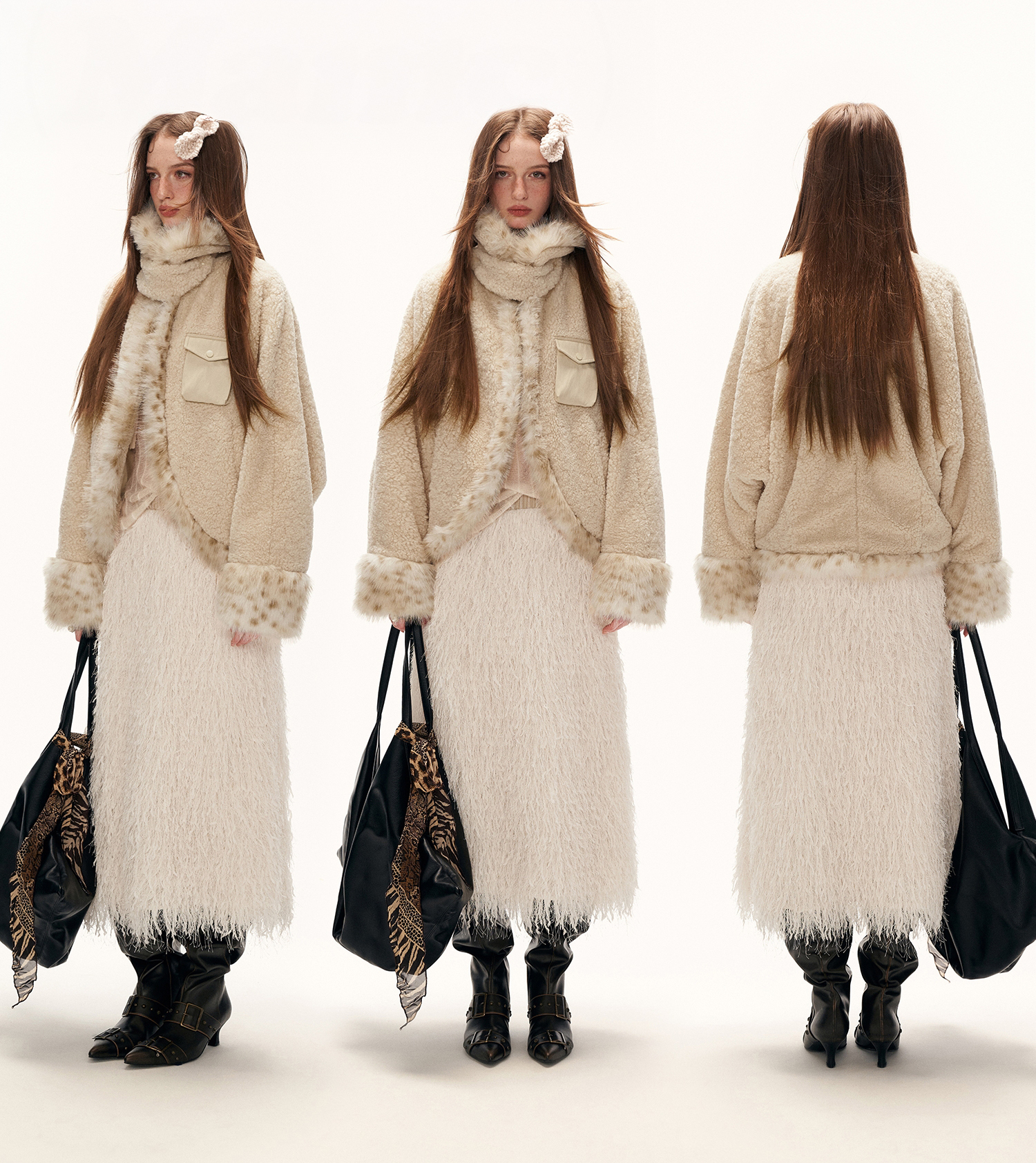 레오파드 퍼 트리밍과 포근한 셰르파 텍스처가 어우러진 키치한 무드의 크롭 윈터 재킷입니다.