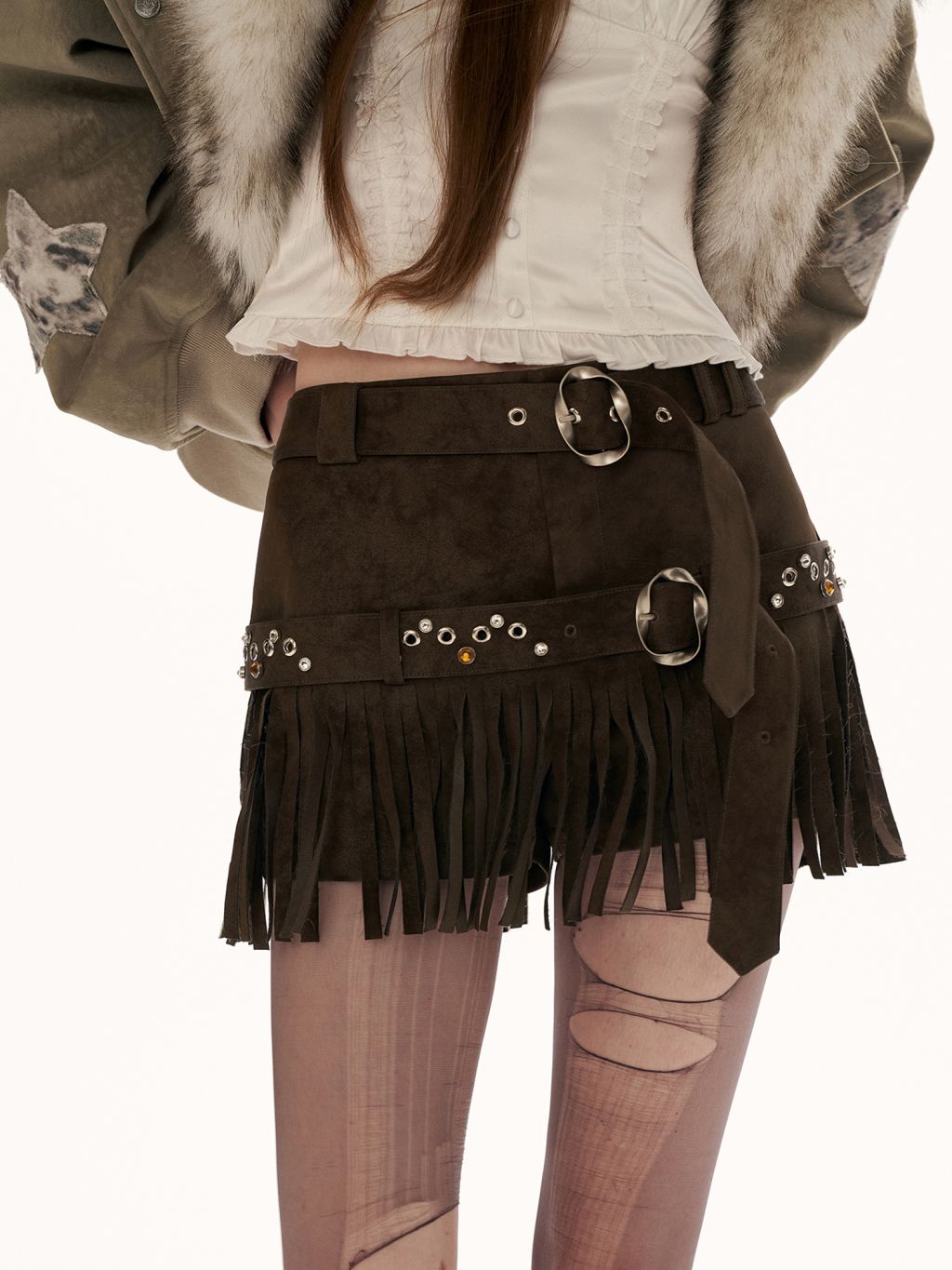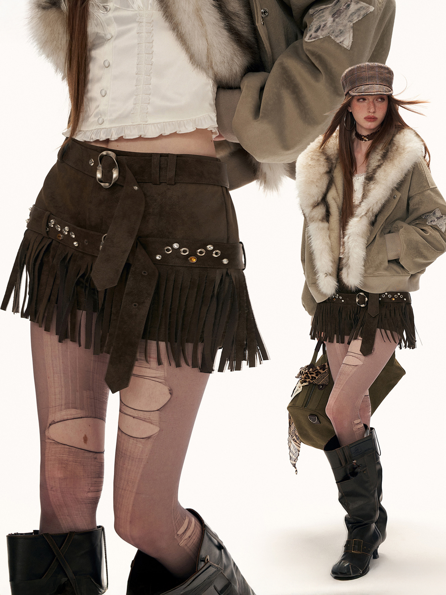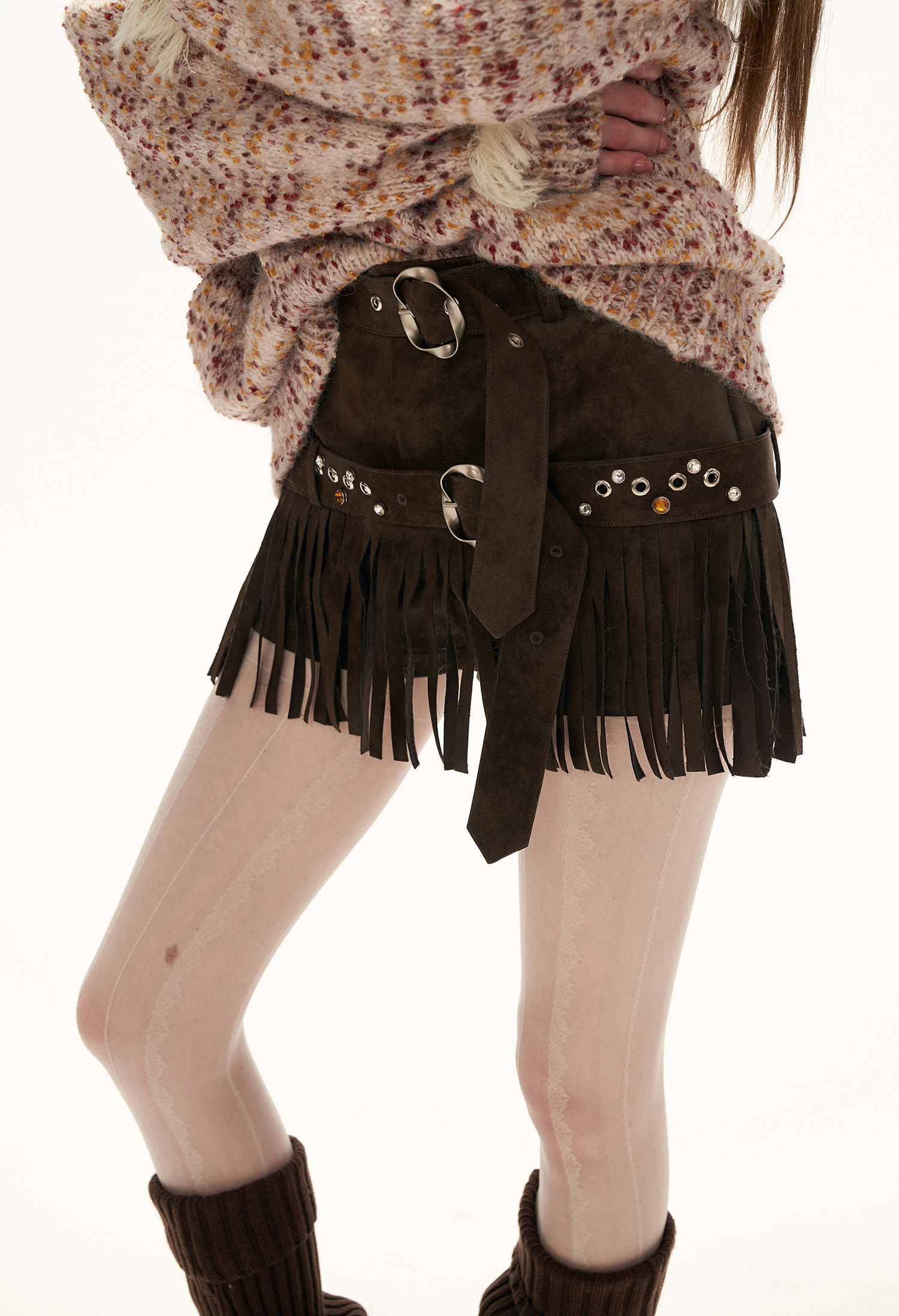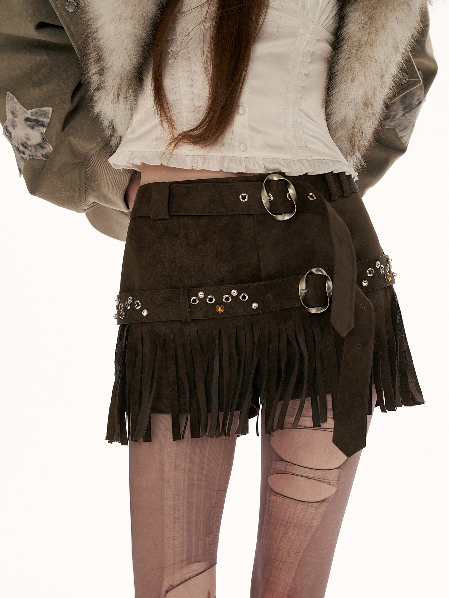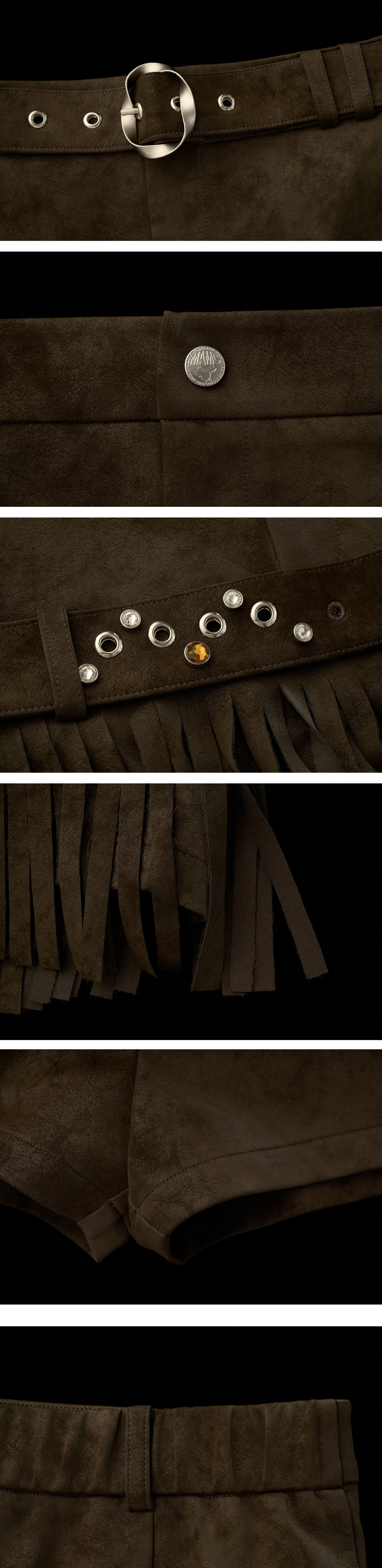 메탈 리벳과 롱 프린지 디테일로 강렬한 웨스턴 무드를 완성하는 미니 스커트입니다.