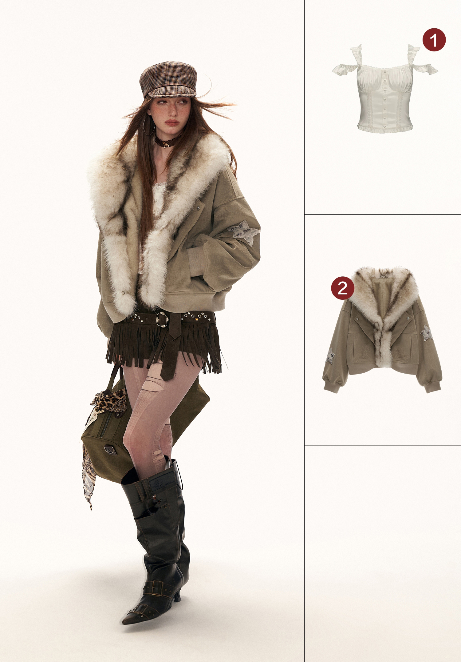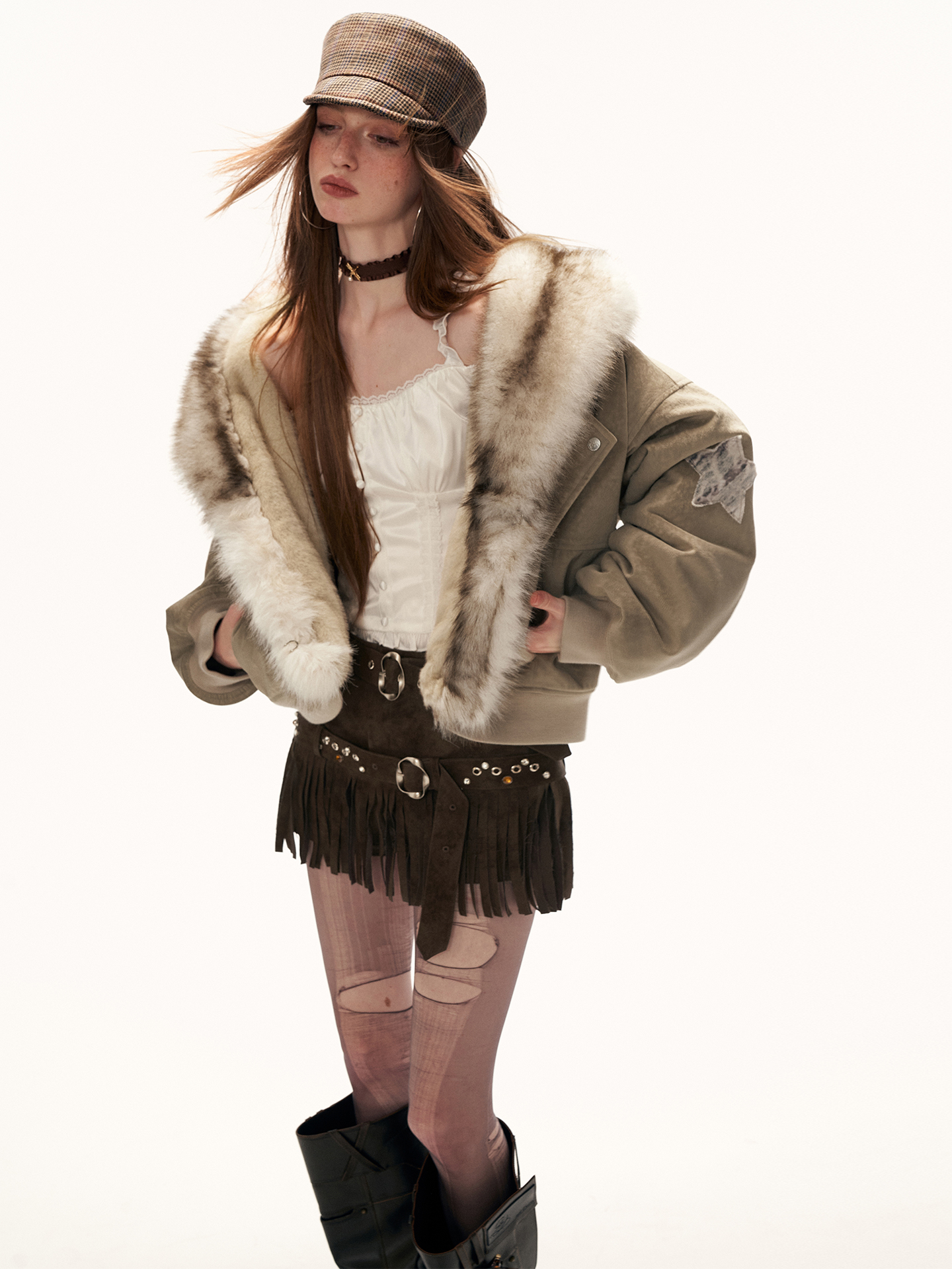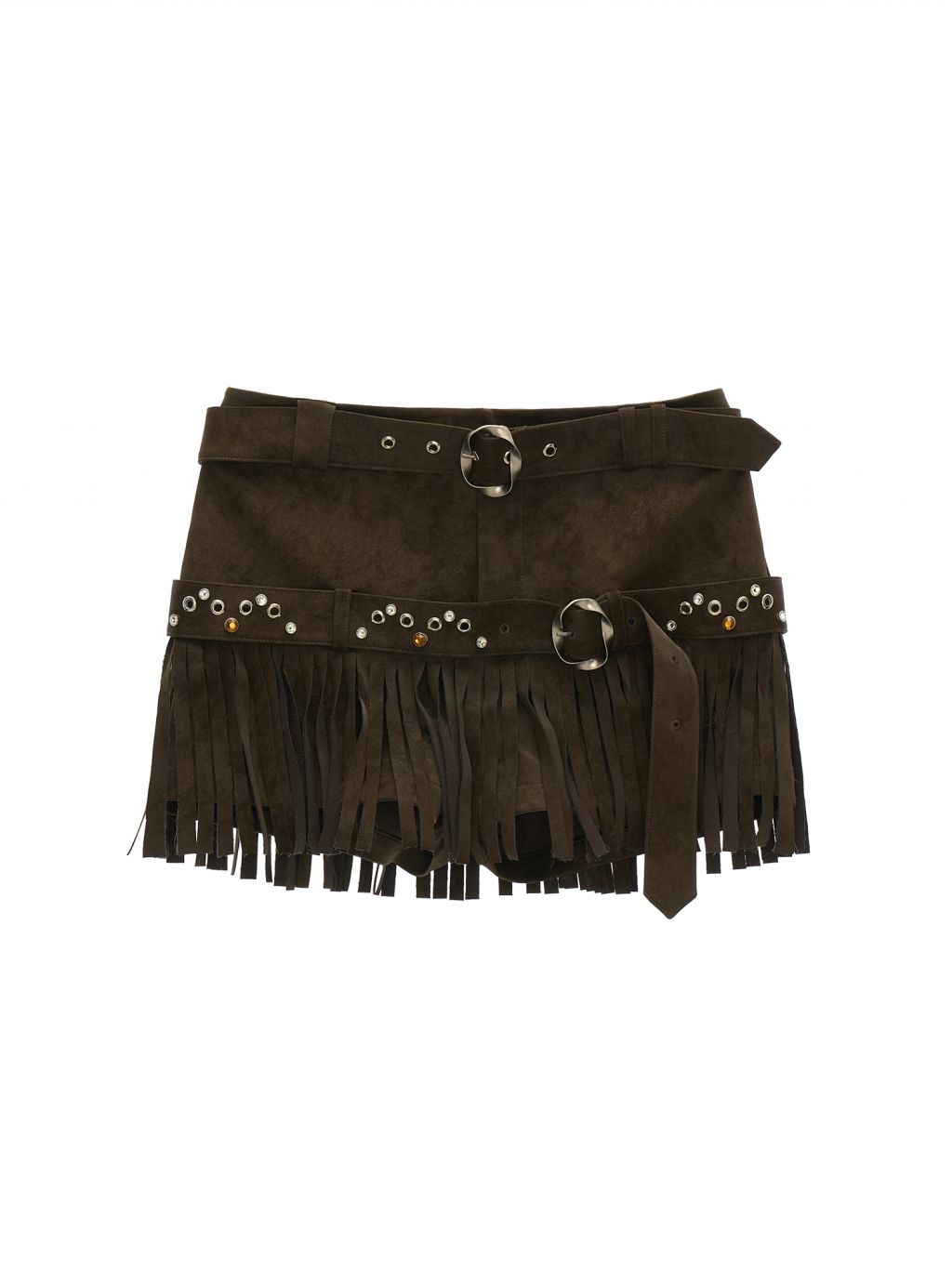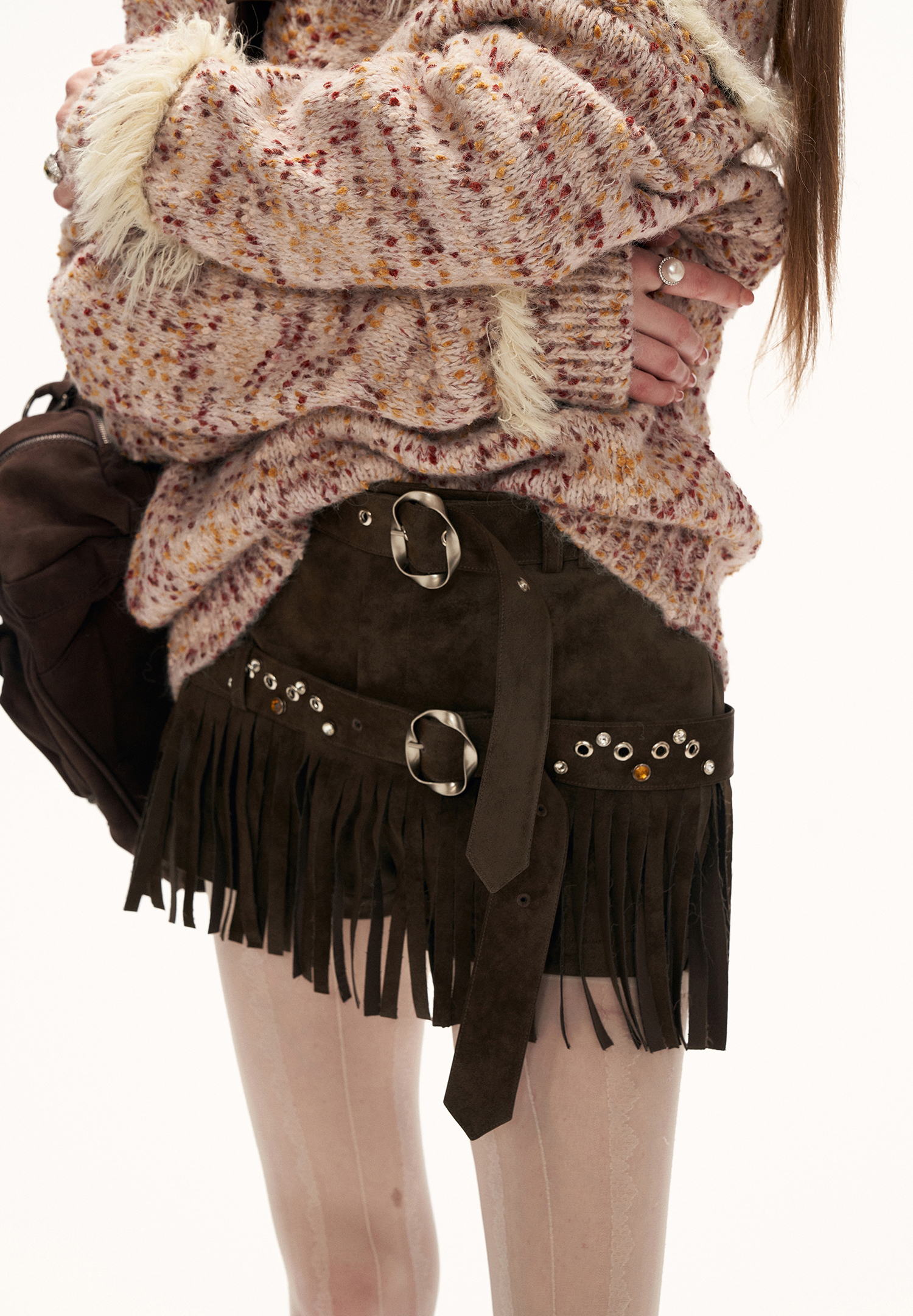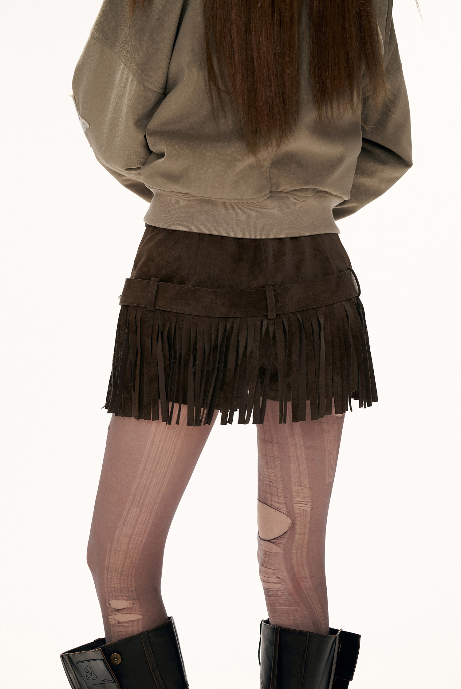 메탈 리벳과 롱 프린지 디테일로 강렬한 웨스턴 무드를 완성하는 미니 스커트입니다.