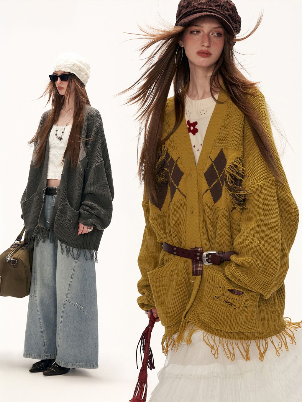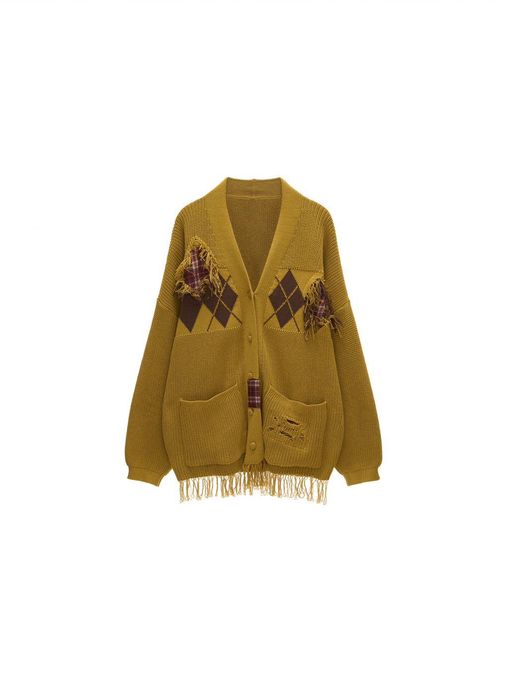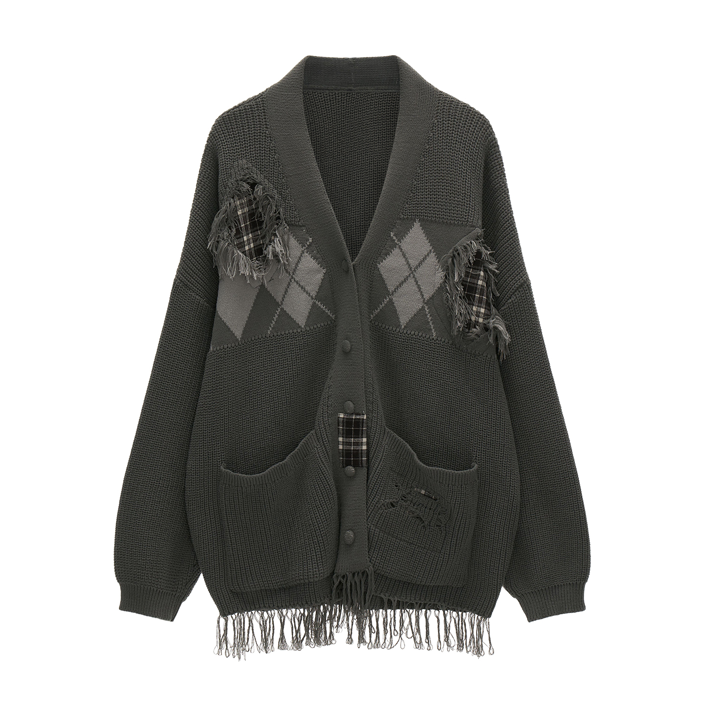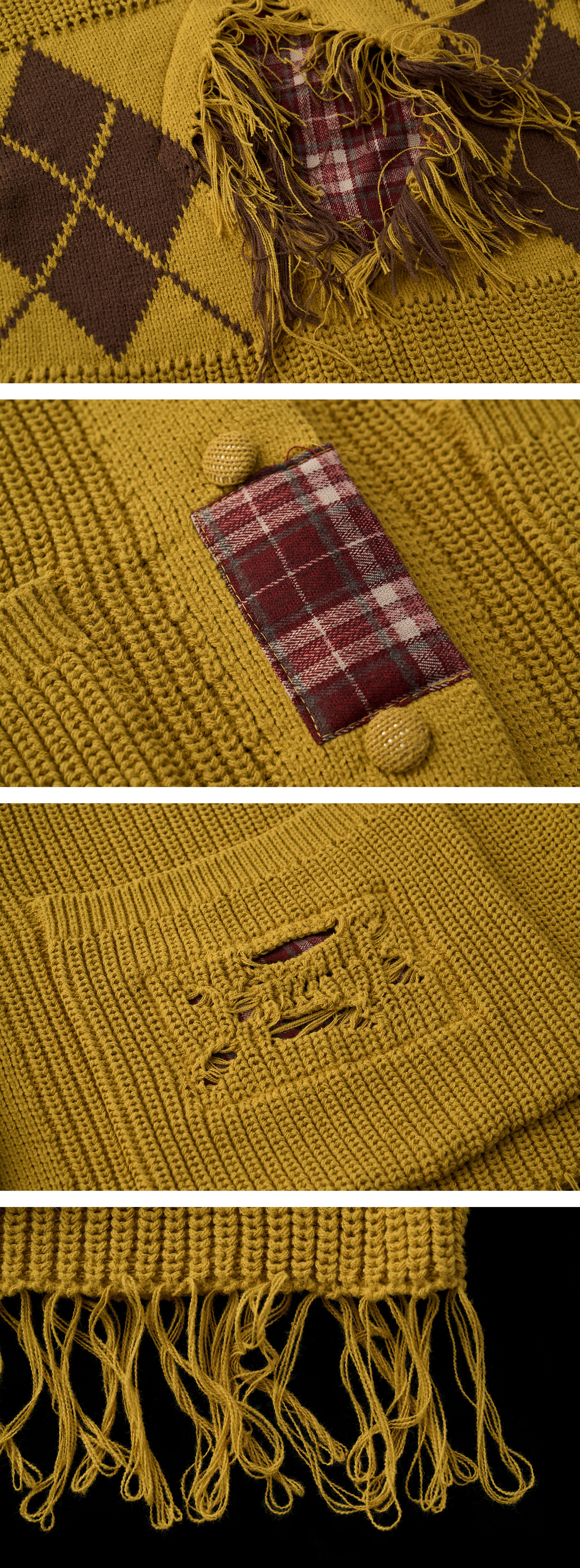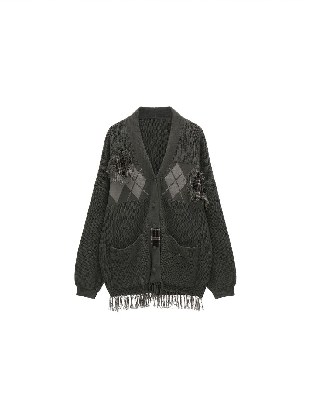 아가일 패턴과 프레이드 패치워크 디테일을 믹스해 빈티지한 그런지 무드를 완성한 오버핏 가디건입니다.