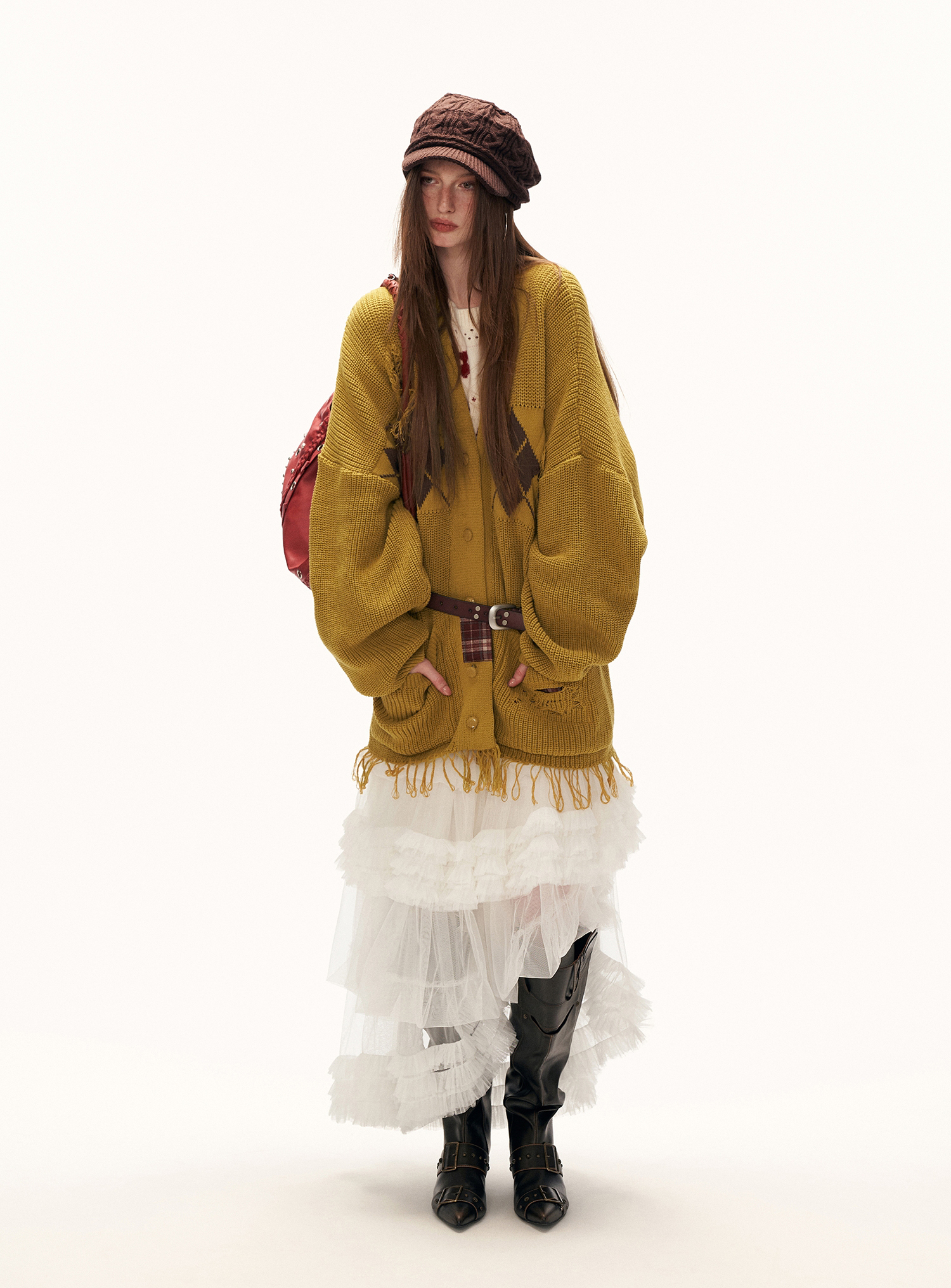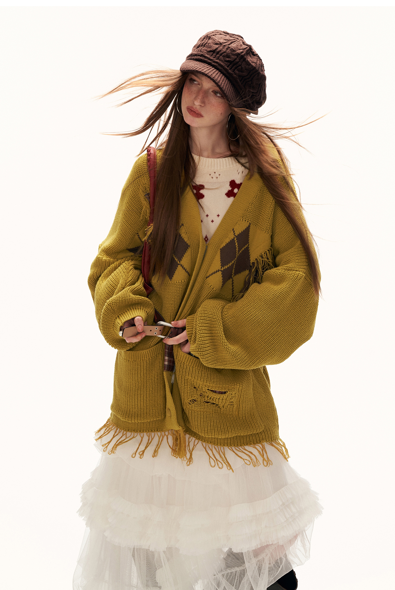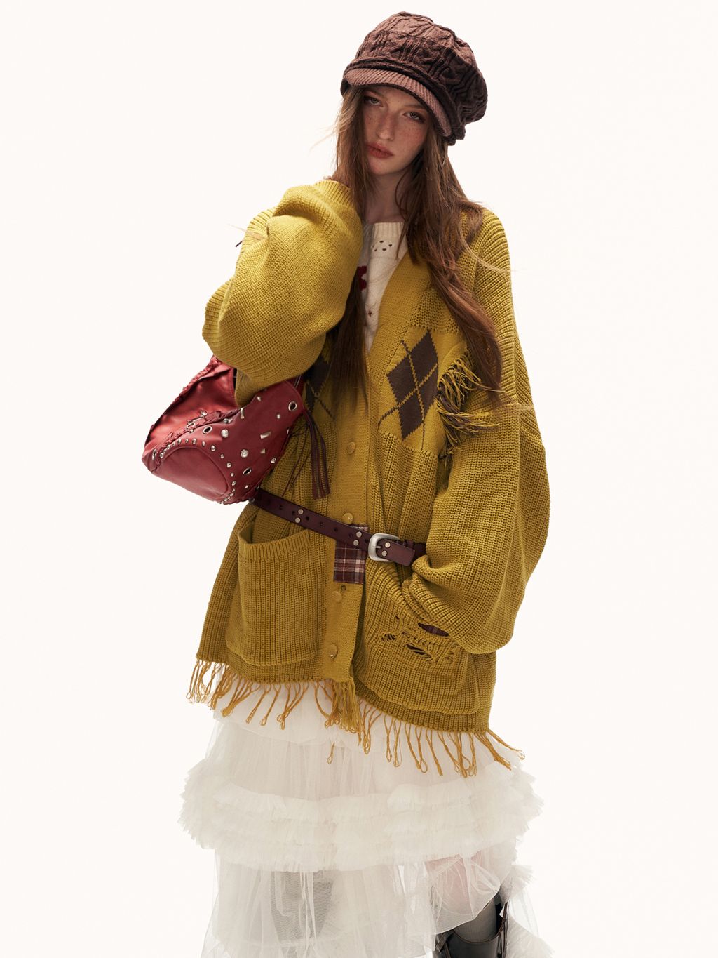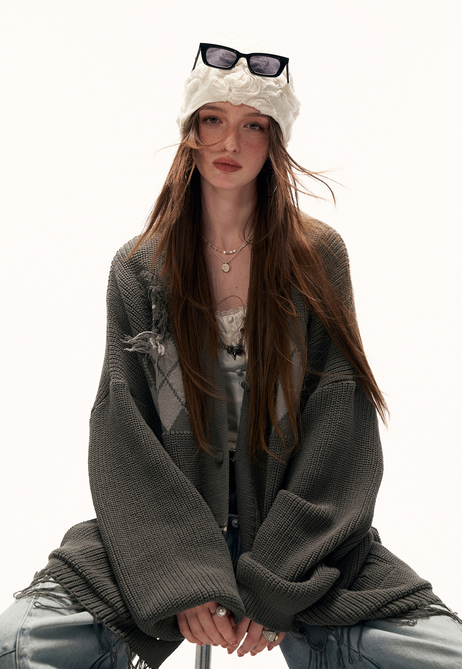 아가일 패턴과 프레이드 패치워크 디테일을 믹스해 빈티지한 그런지 무드를 완성한 오버핏 가디건입니다.