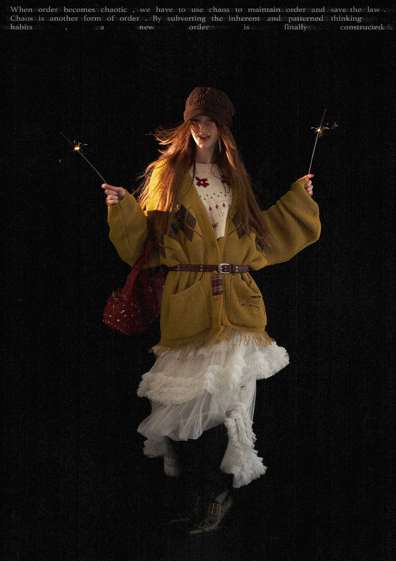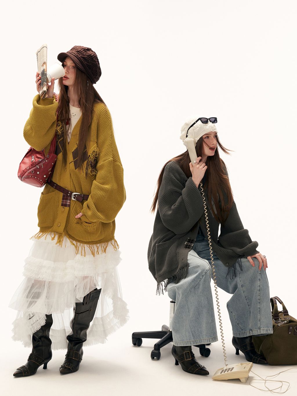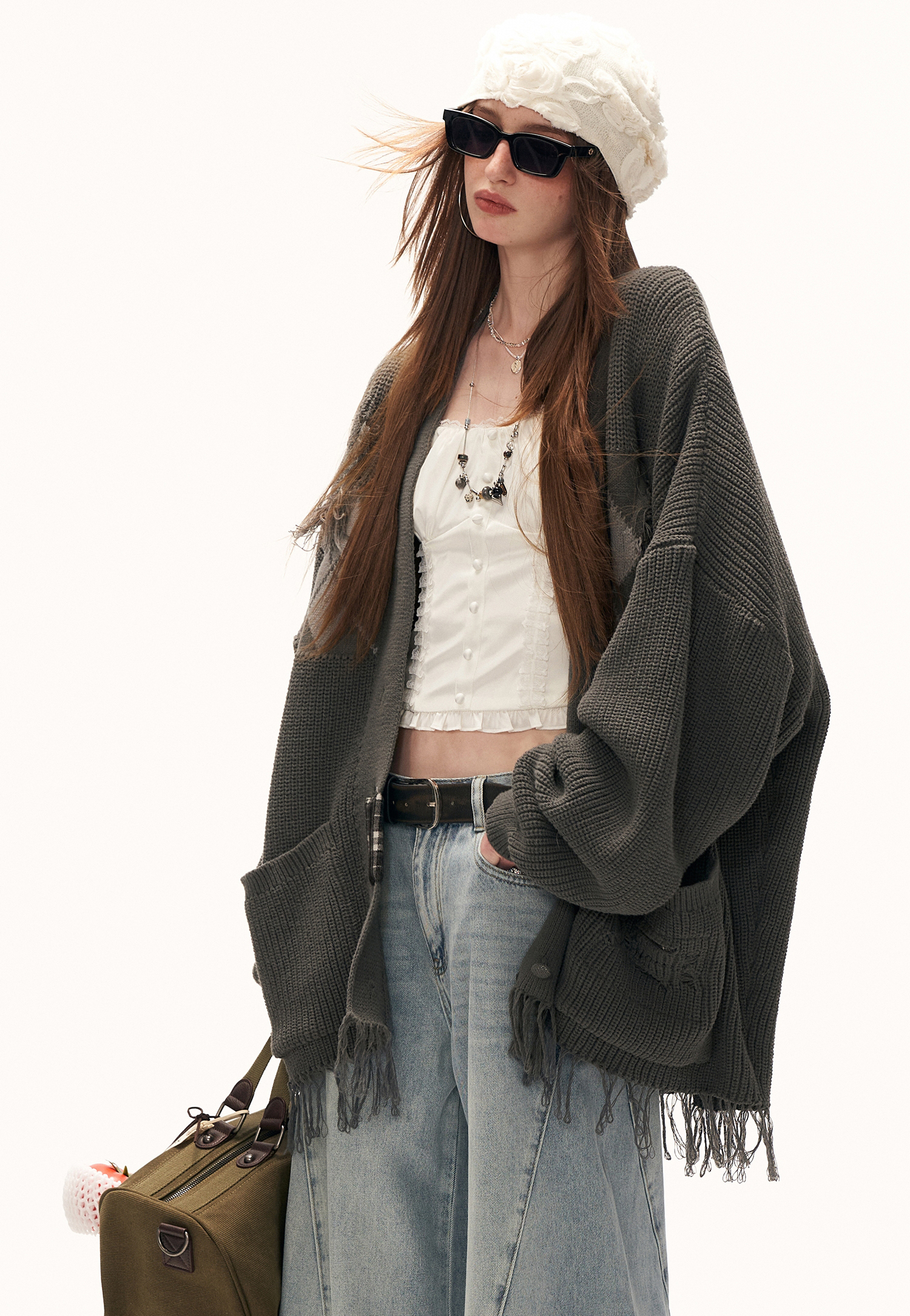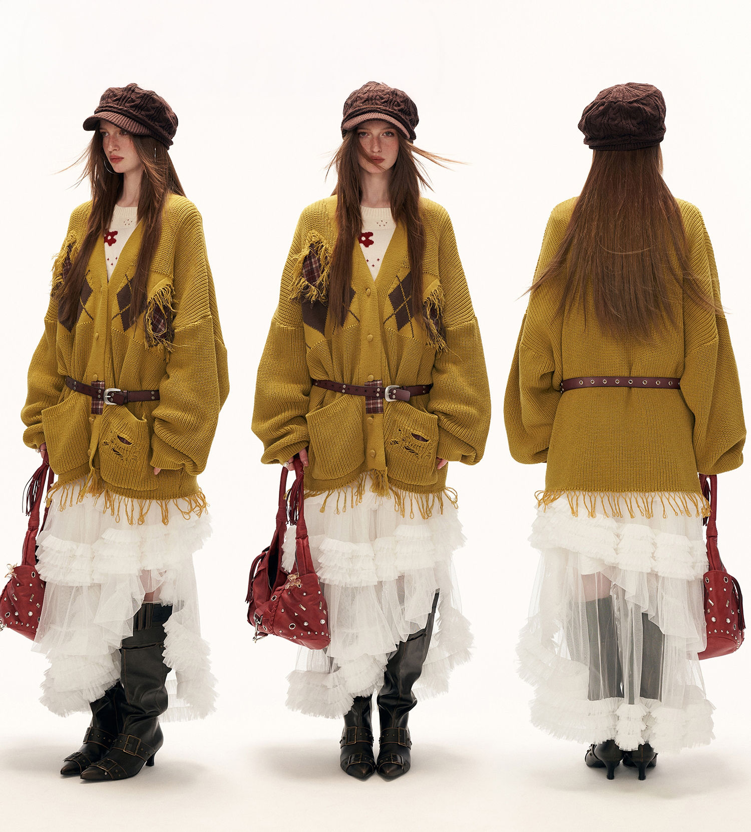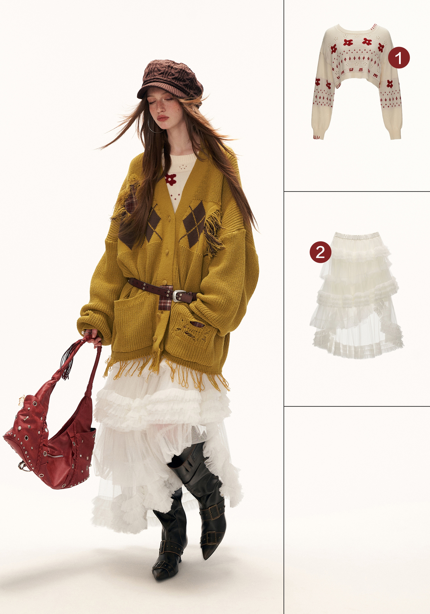 아가일 패턴과 프레이드 패치워크 디테일을 믹스해 빈티지한 그런지 무드를 완성한 오버핏 가디건입니다.