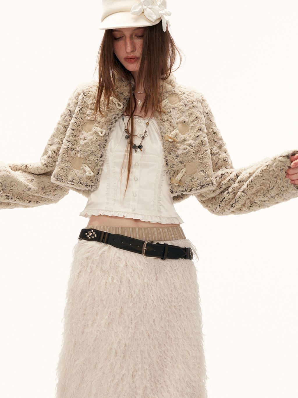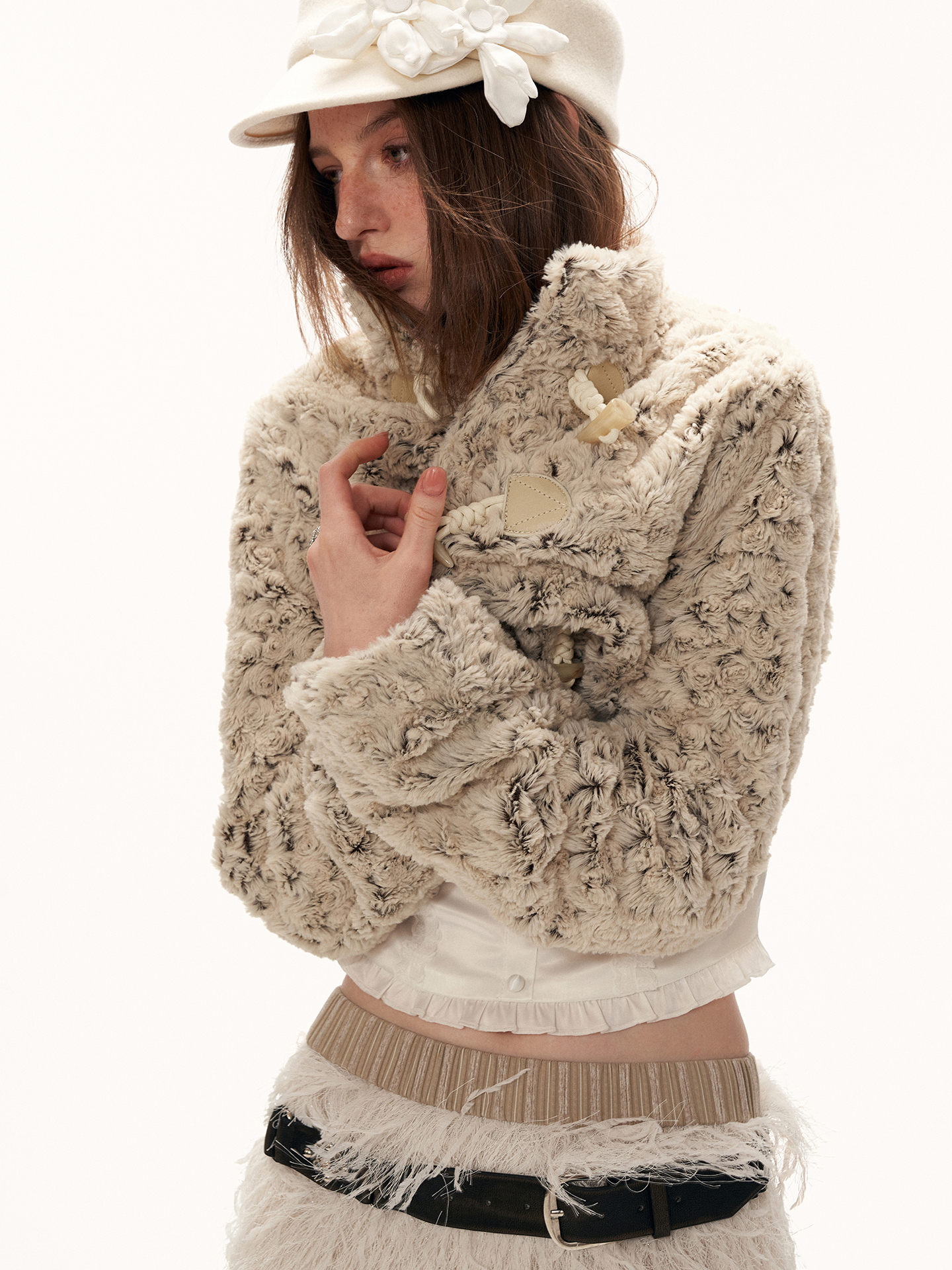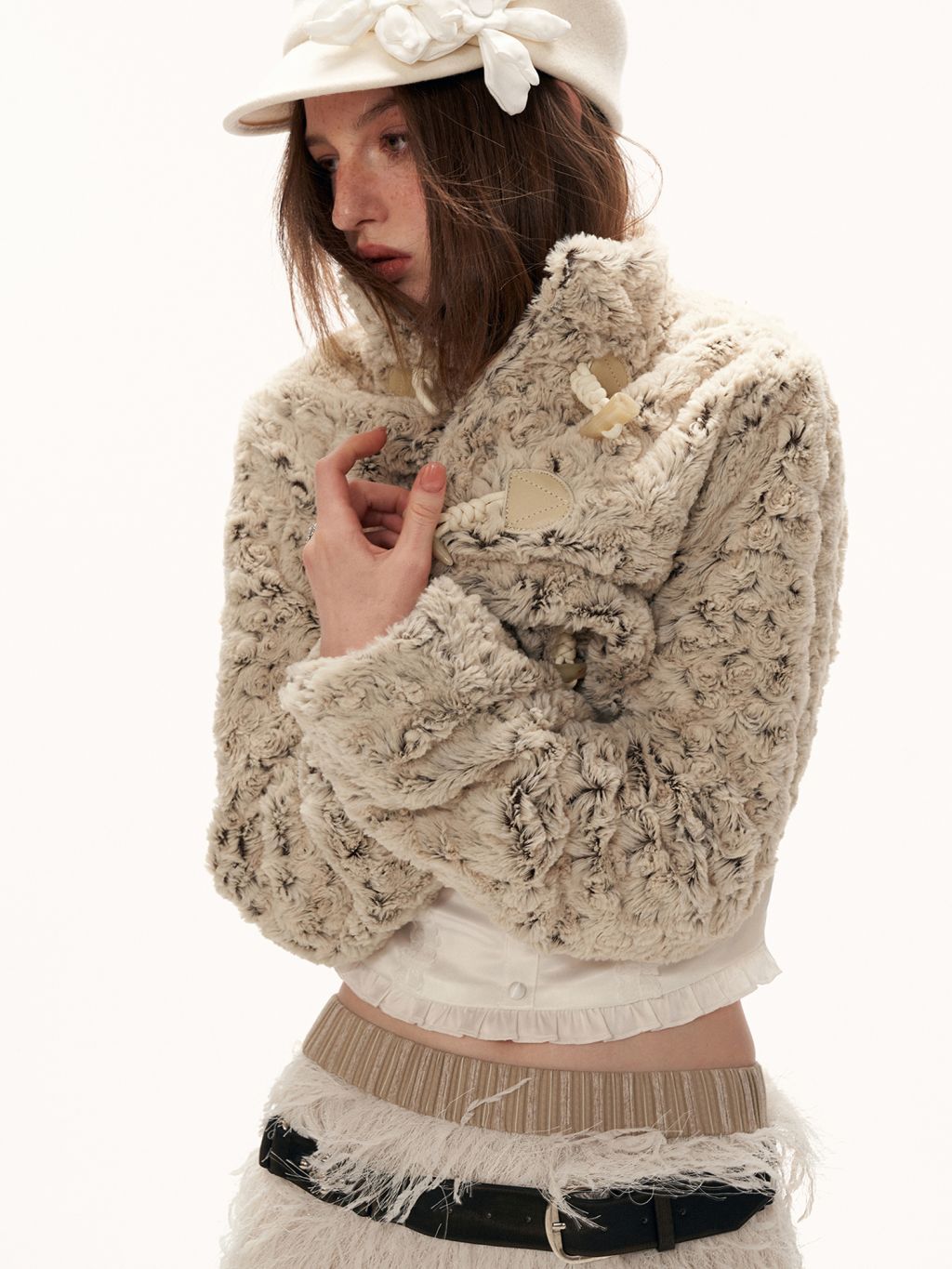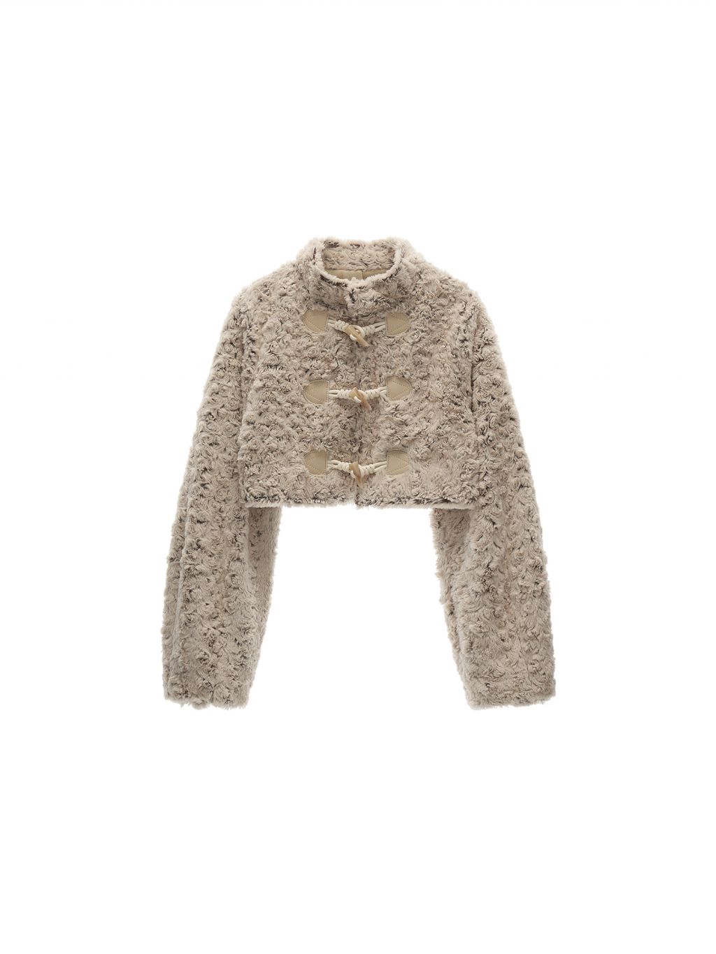 몽글한 퍼 텍스처와 토글 여밈 디테일로 사랑스럽고 빈티지한 무드를 완성한 크롭 재킷입니다.