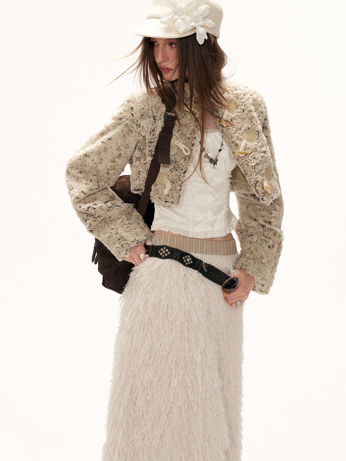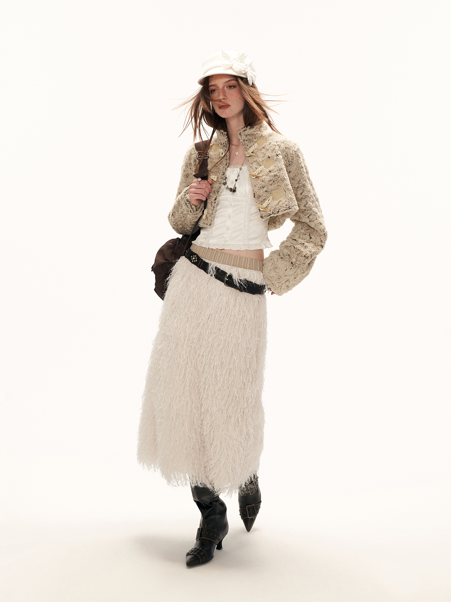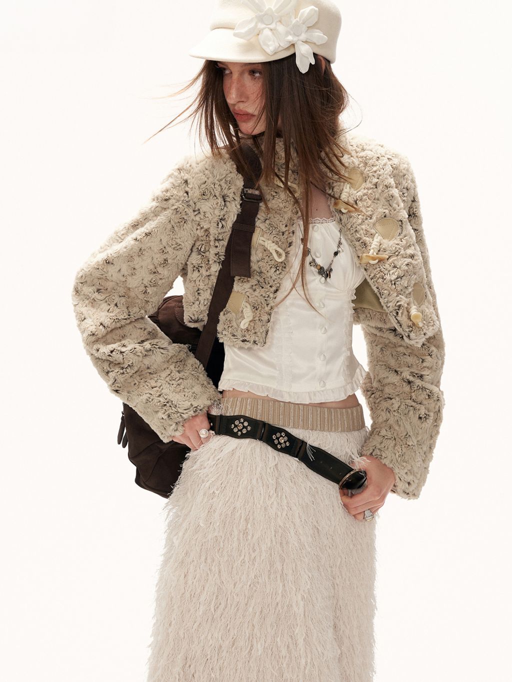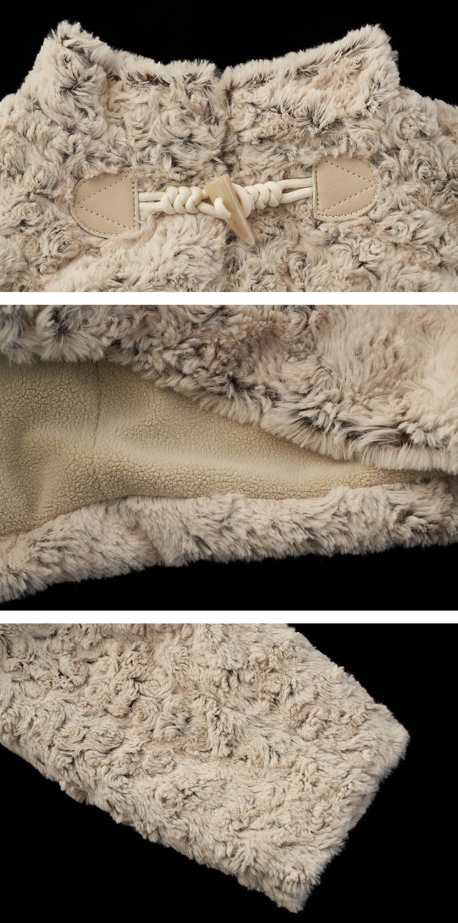 몽글한 퍼 텍스처와 토글 여밈 디테일로 사랑스럽고 빈티지한 무드를 완성한 크롭 재킷입니다.