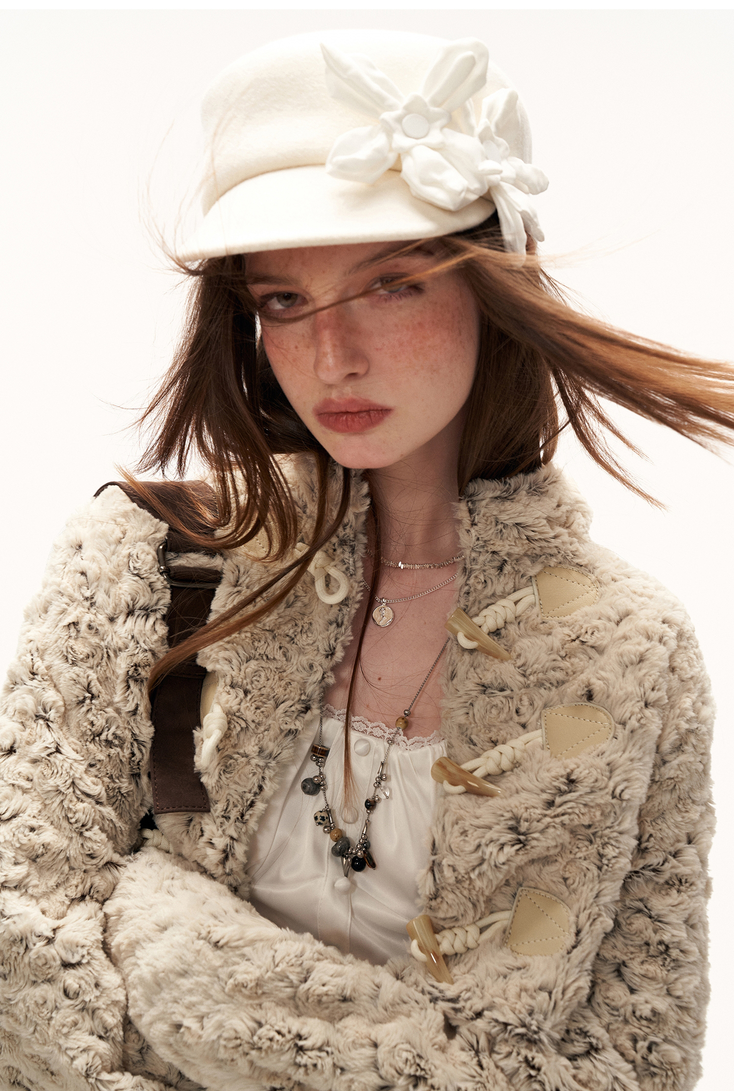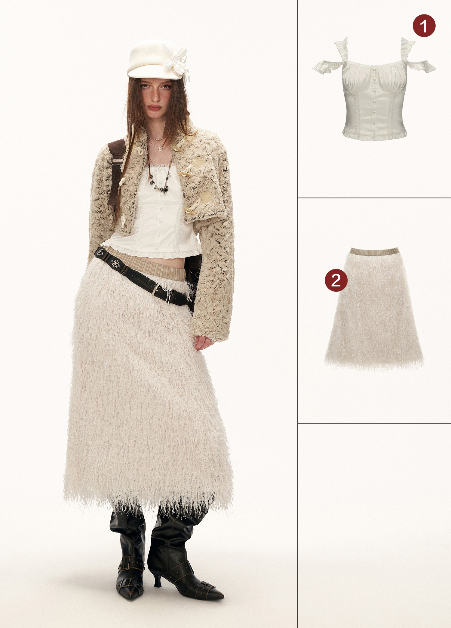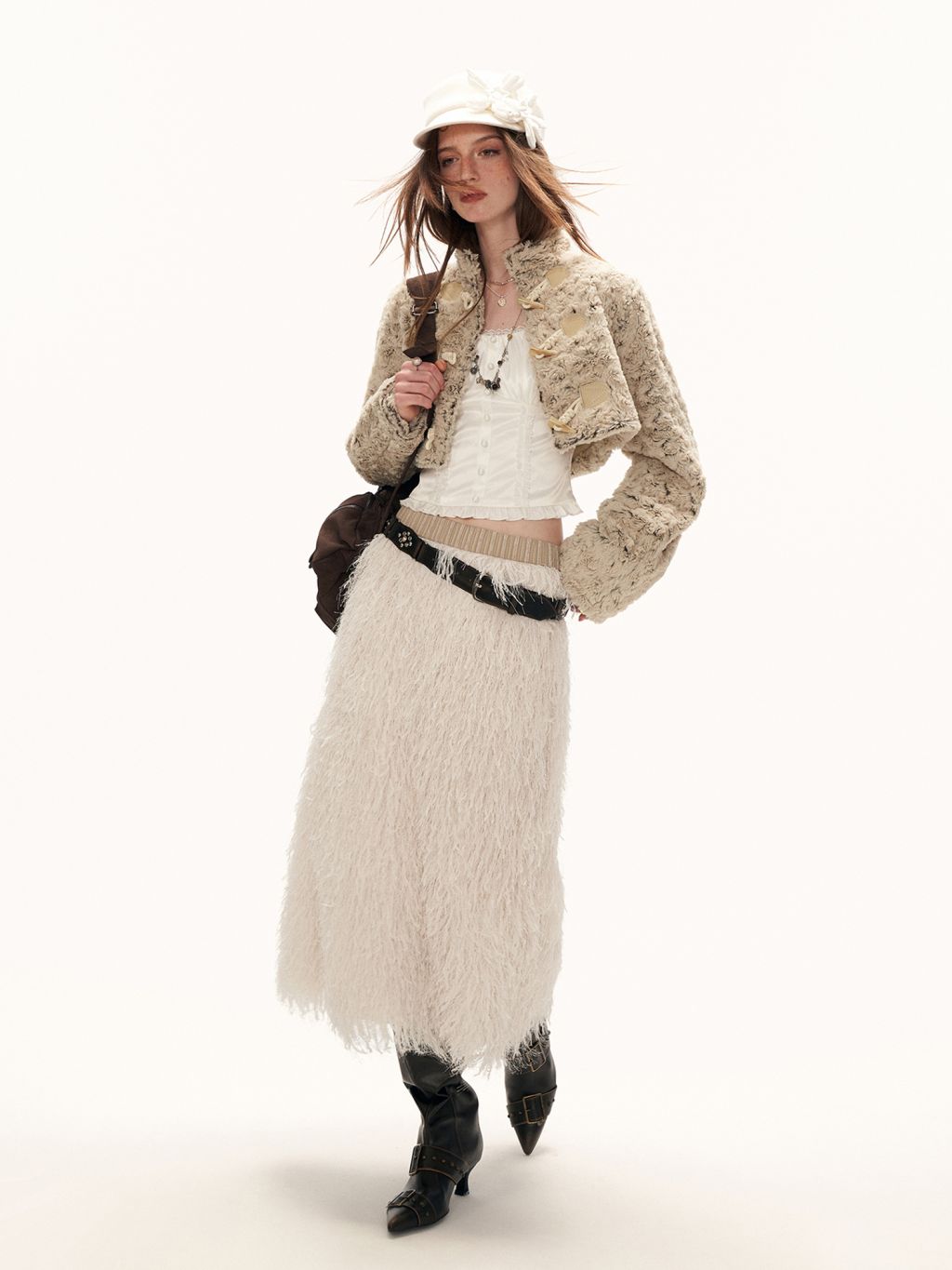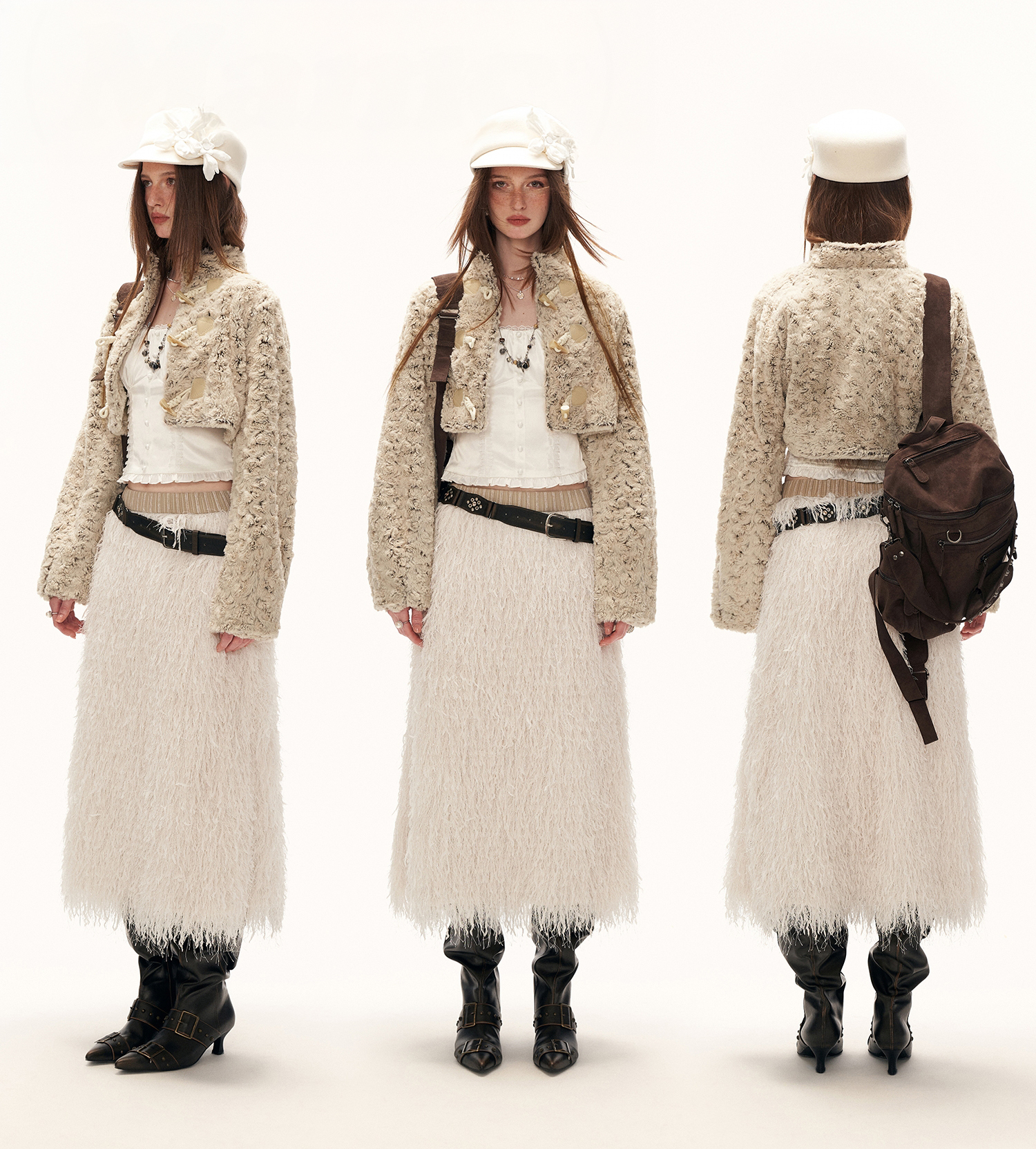 몽글한 퍼 텍스처와 토글 여밈 디테일로 사랑스럽고 빈티지한 무드를 완성한 크롭 재킷입니다.