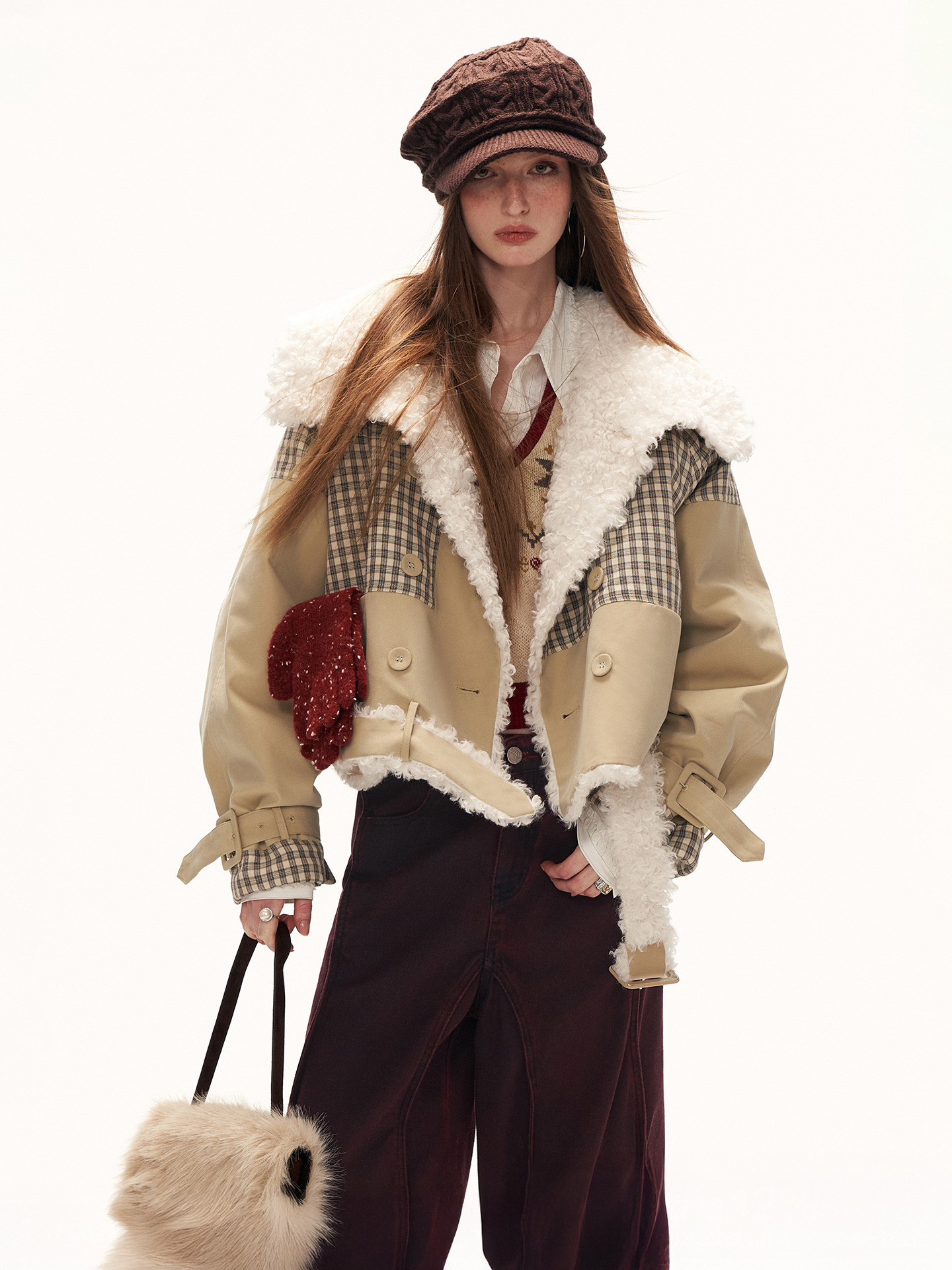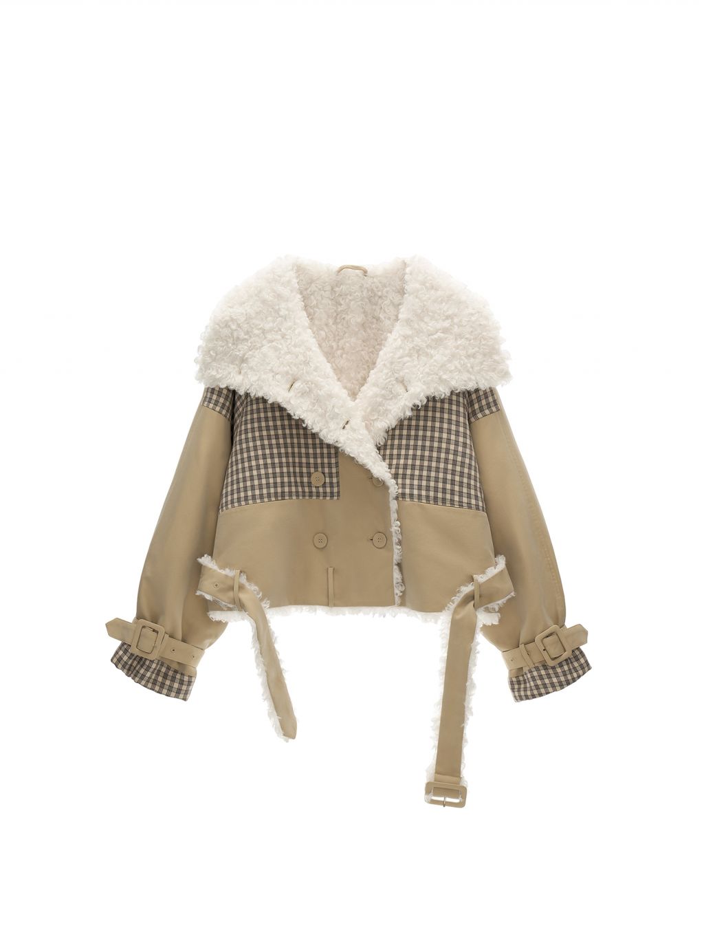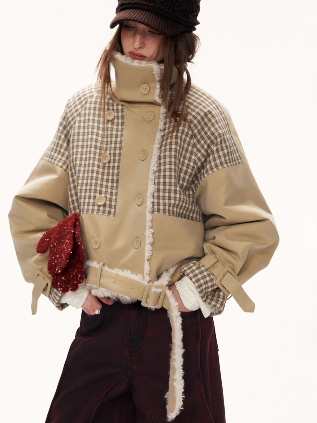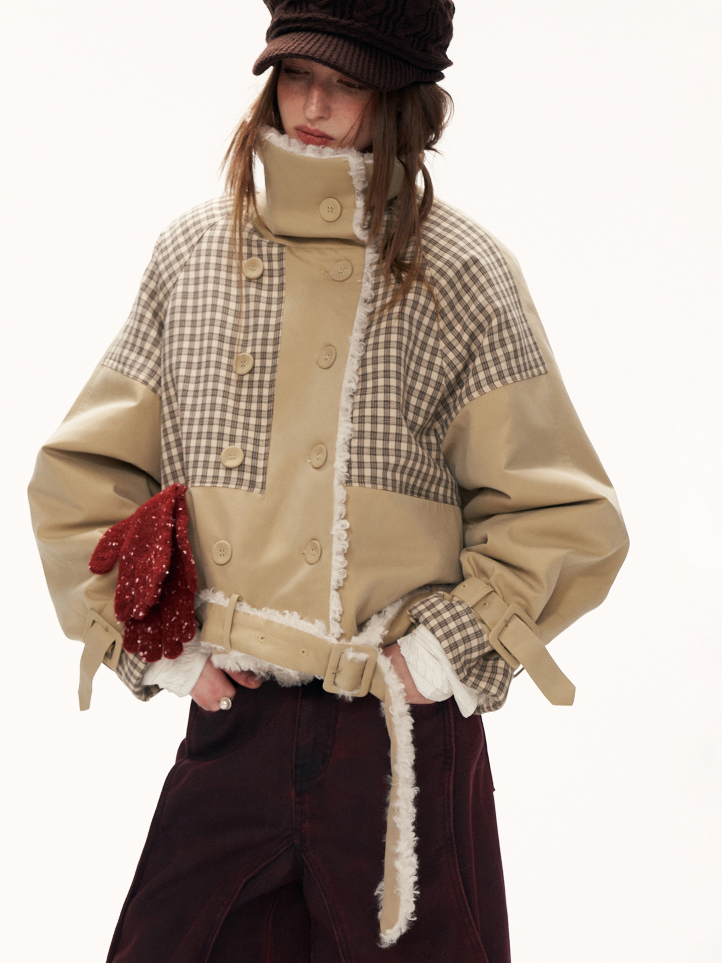 체크 패턴과 셰르파 퍼 트리밍을 믹스해 클래식한 무드에 구조적인 실루엣을 더한 벨티드 재킷입니다.