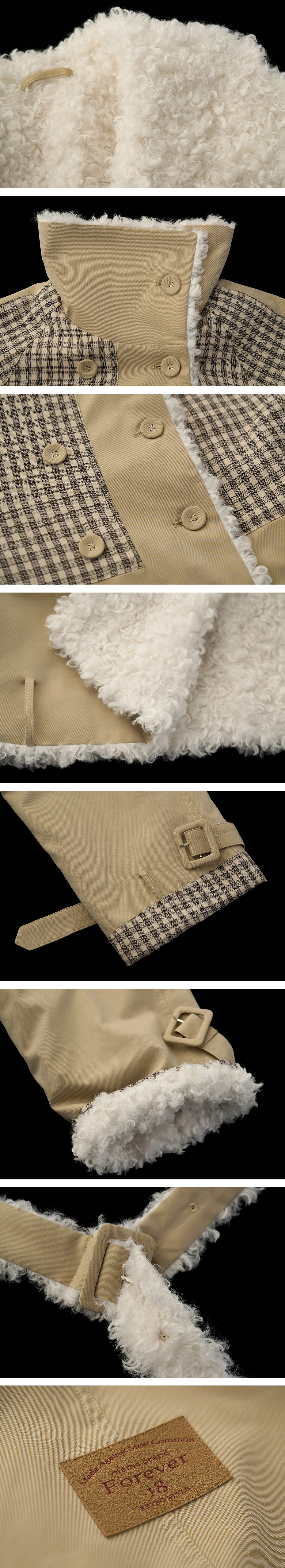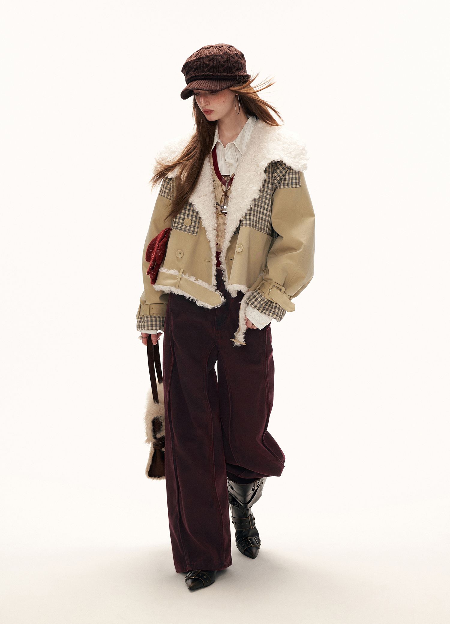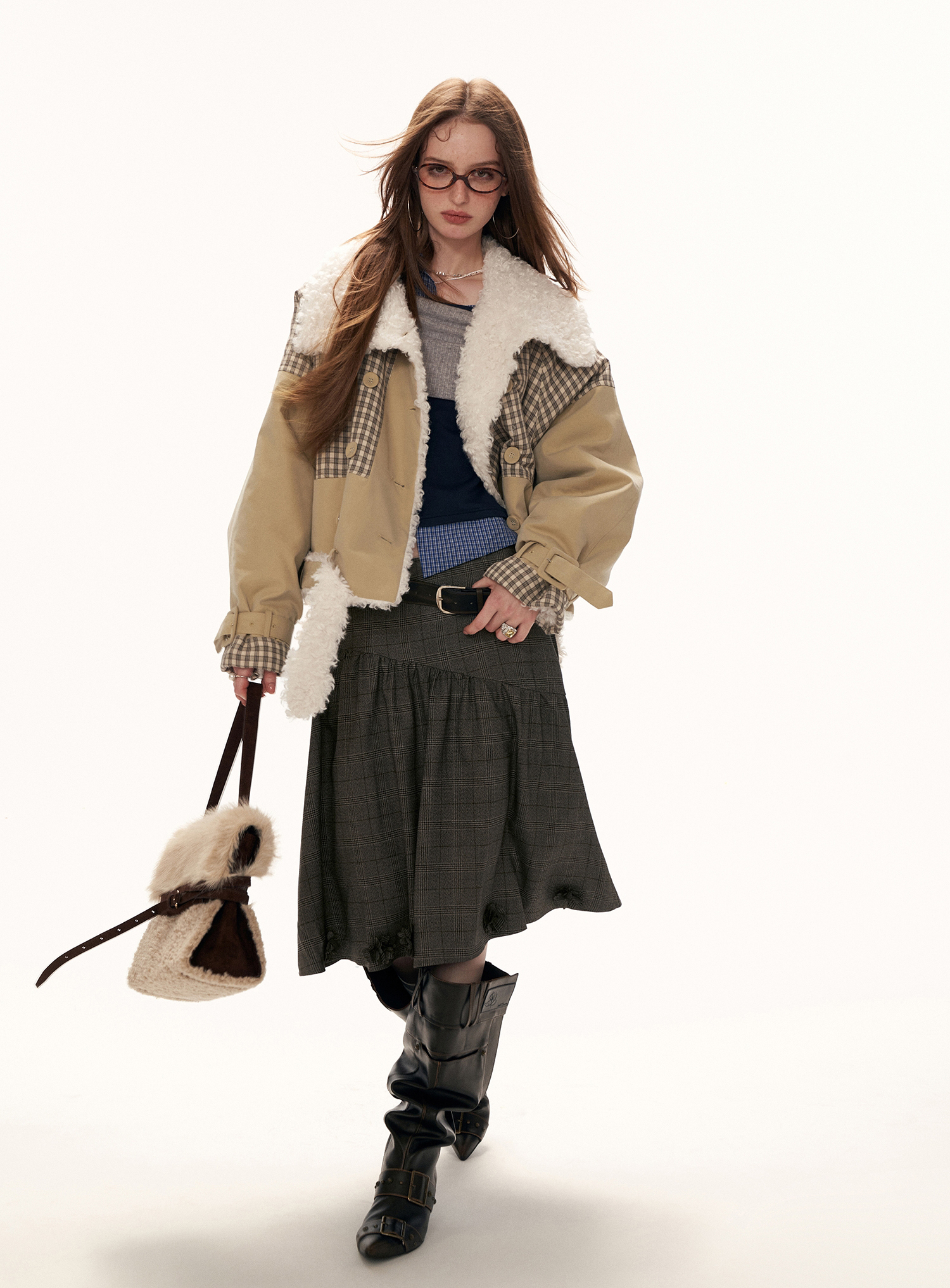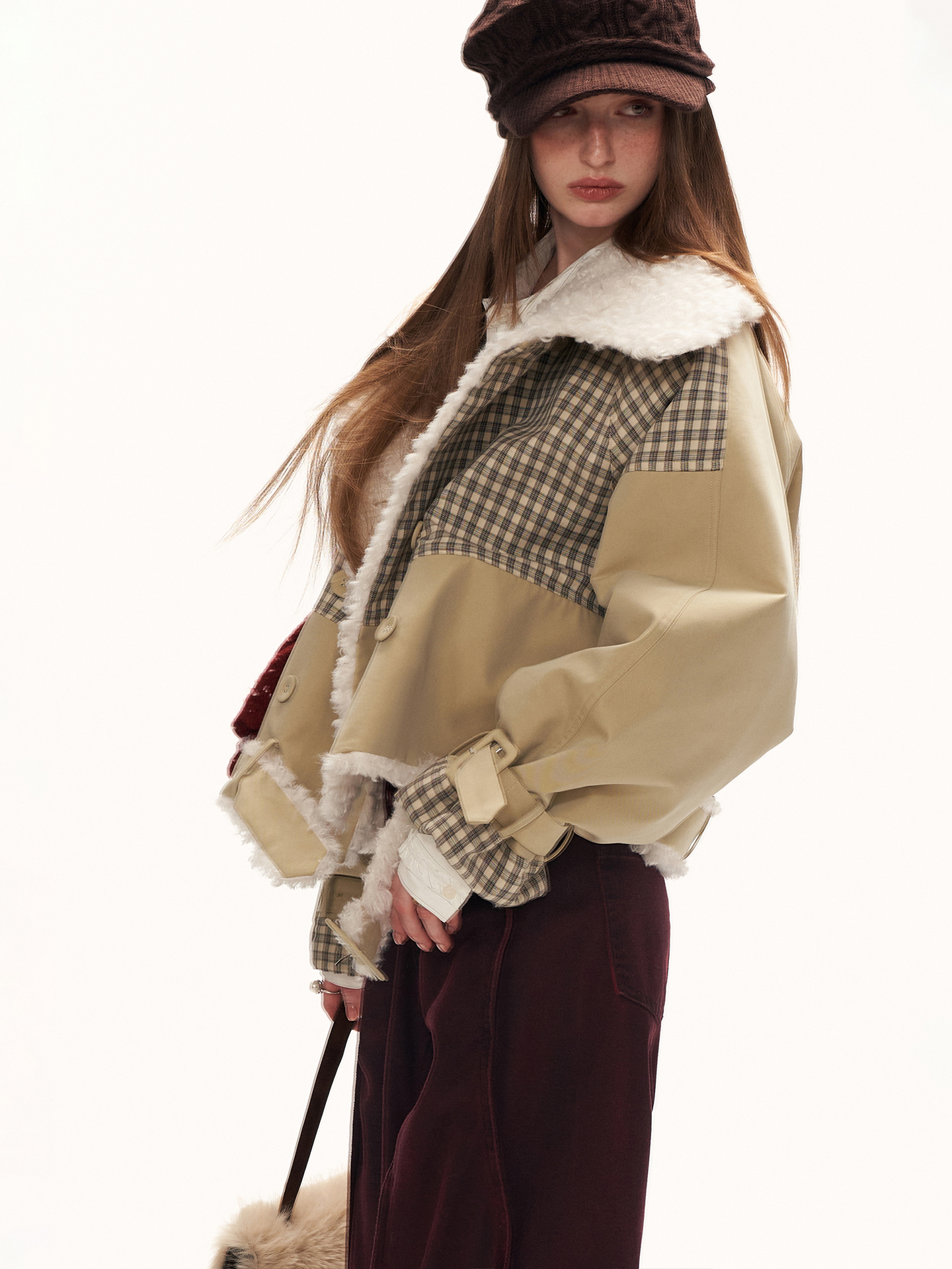체크 패턴과 셰르파 퍼 트리밍을 믹스해 클래식한 무드에 구조적인 실루엣을 더한 벨티드 재킷입니다.