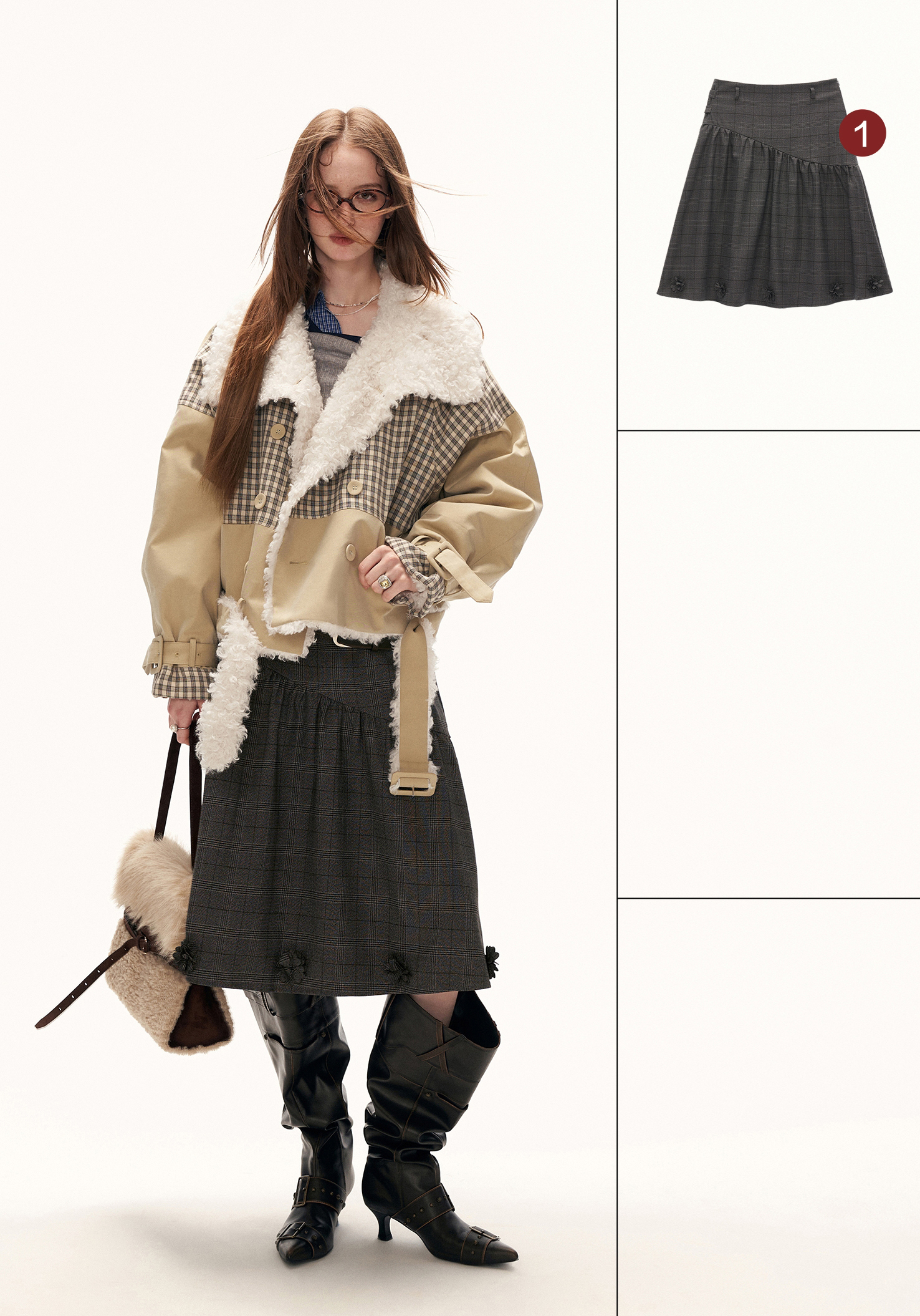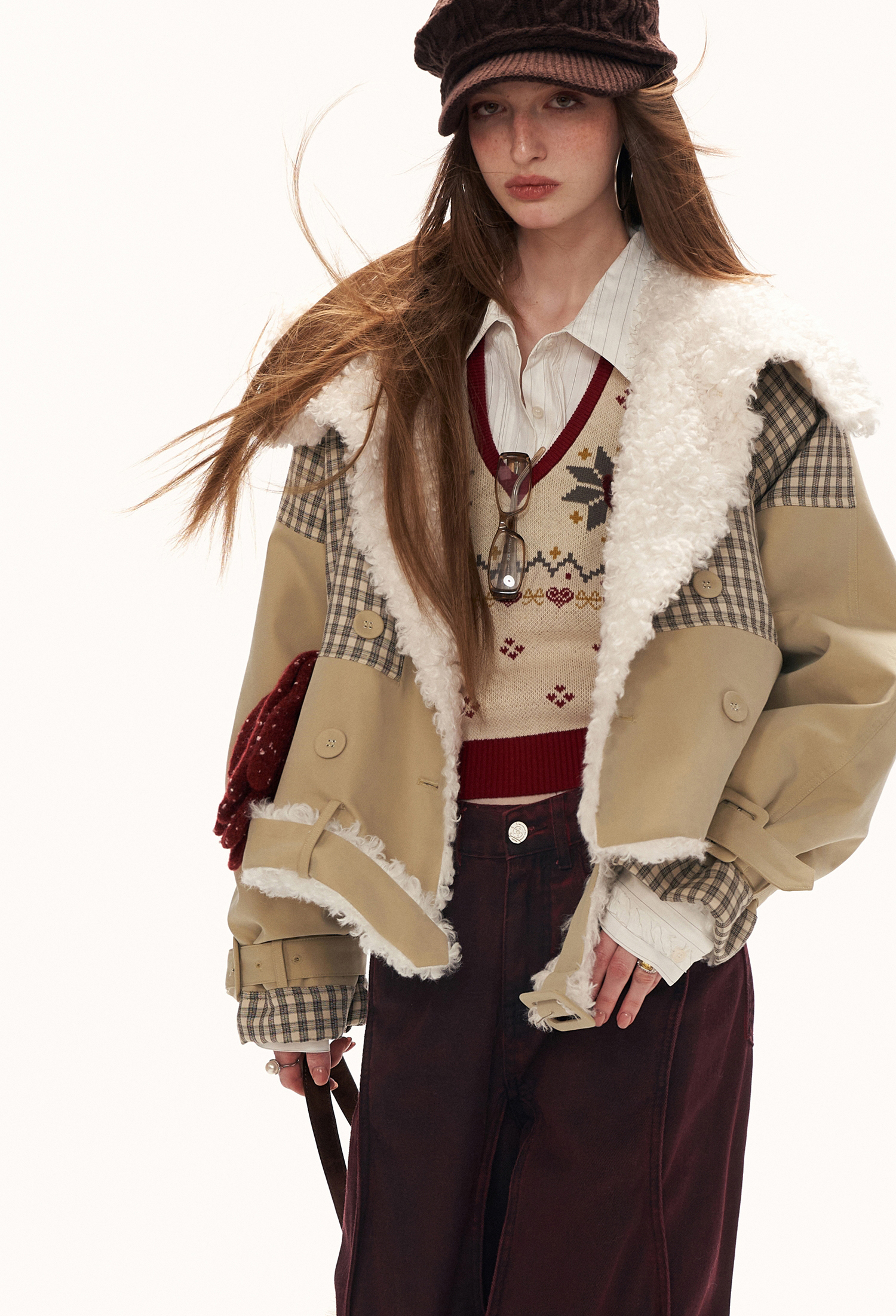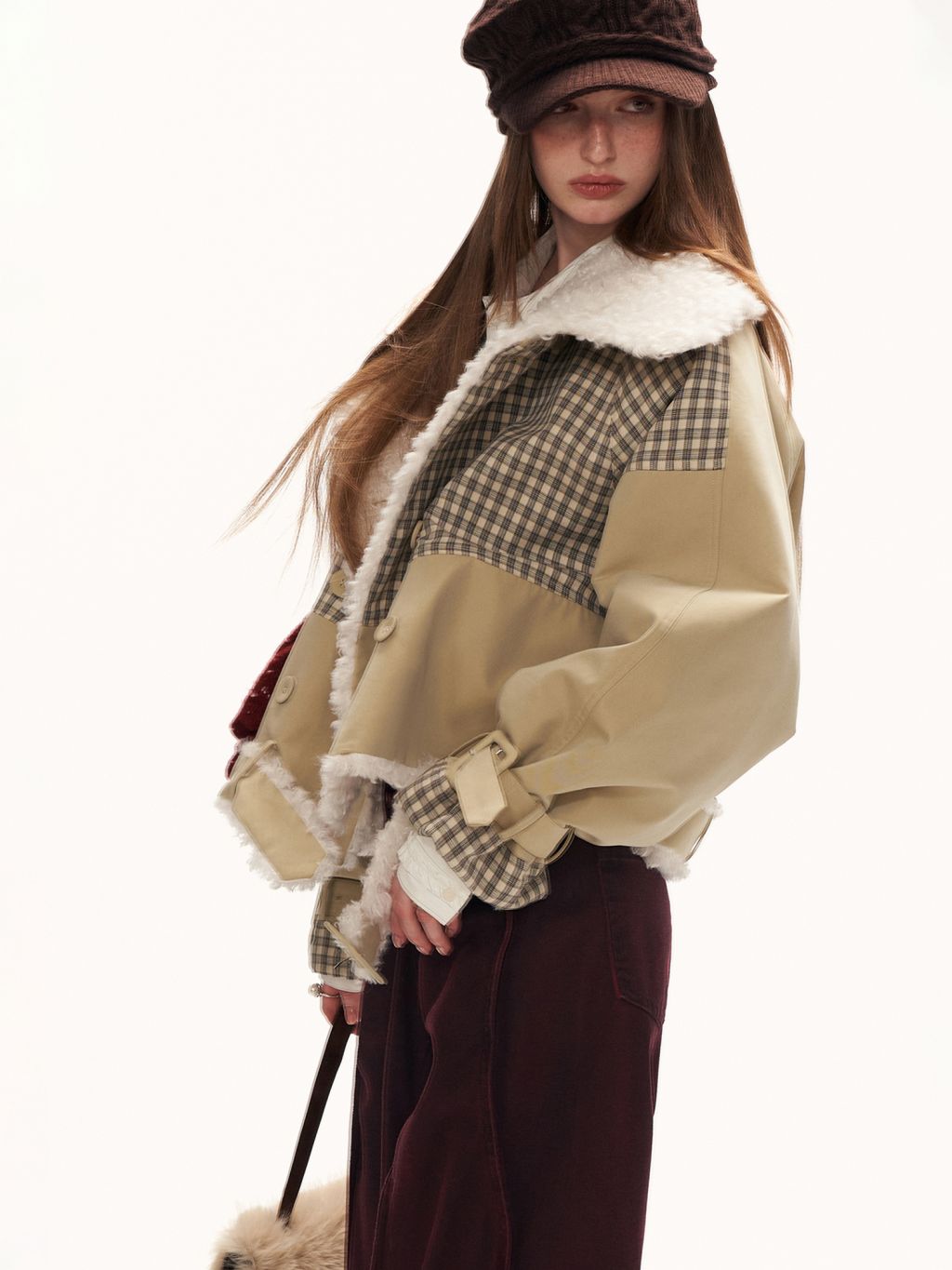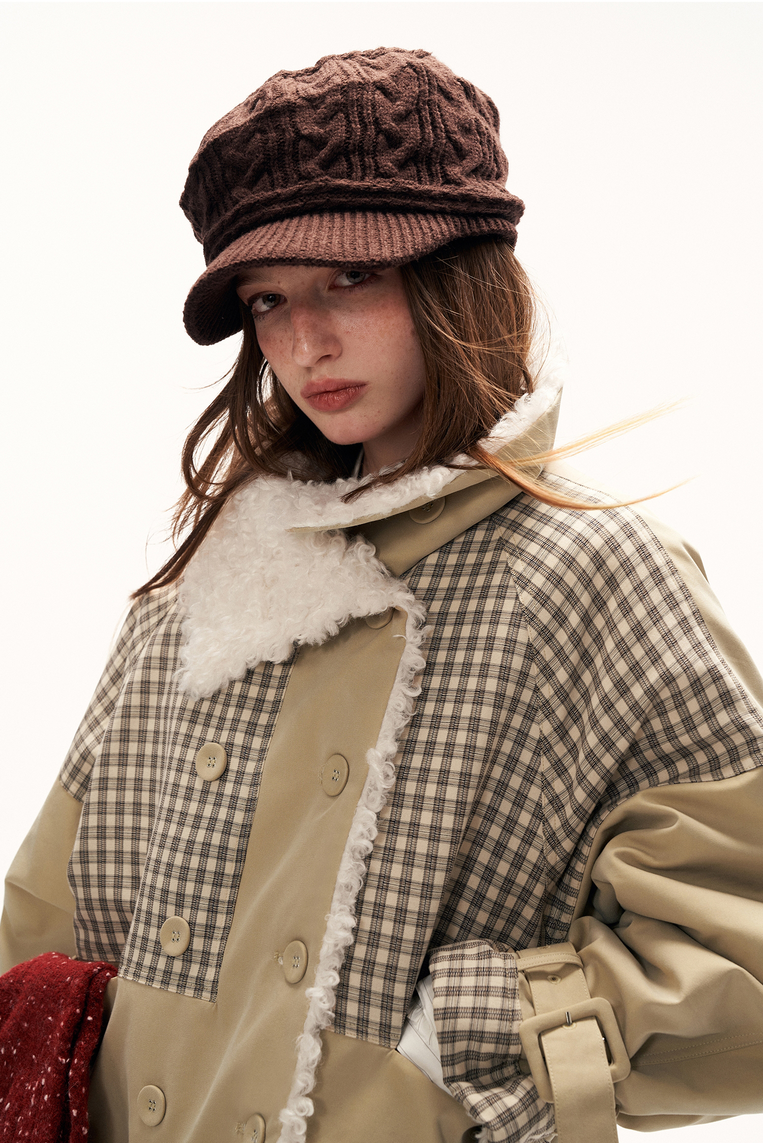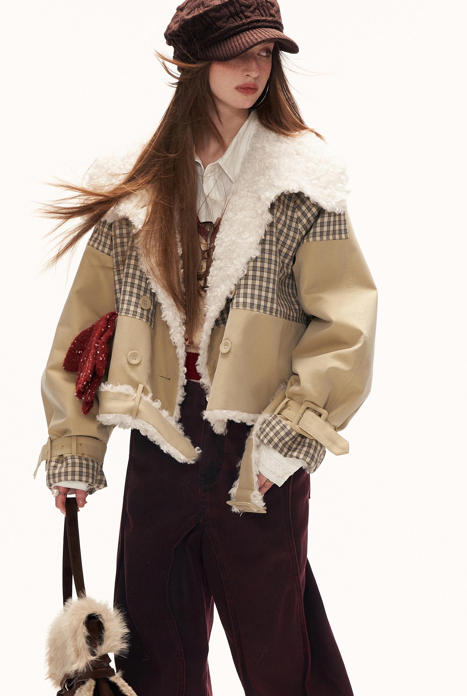 체크 패턴과 셰르파 퍼 트리밍을 믹스해 클래식한 무드에 구조적인 실루엣을 더한 벨티드 재킷입니다.