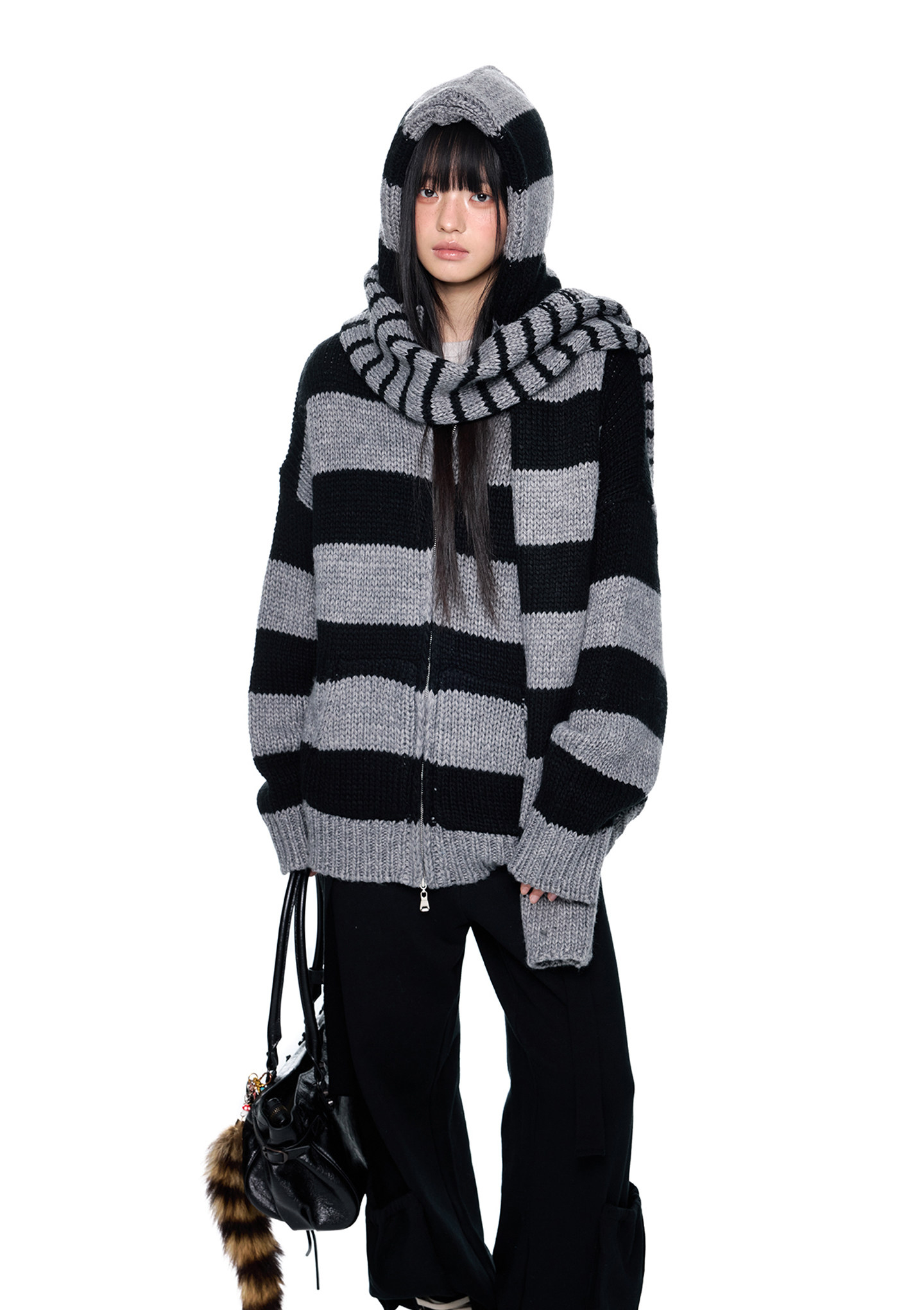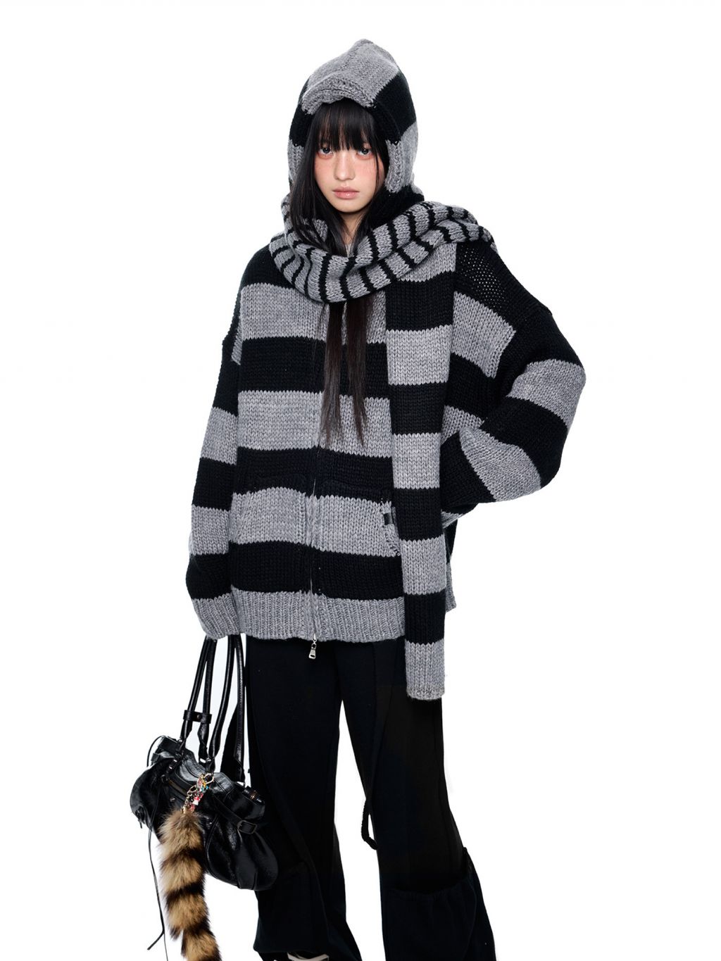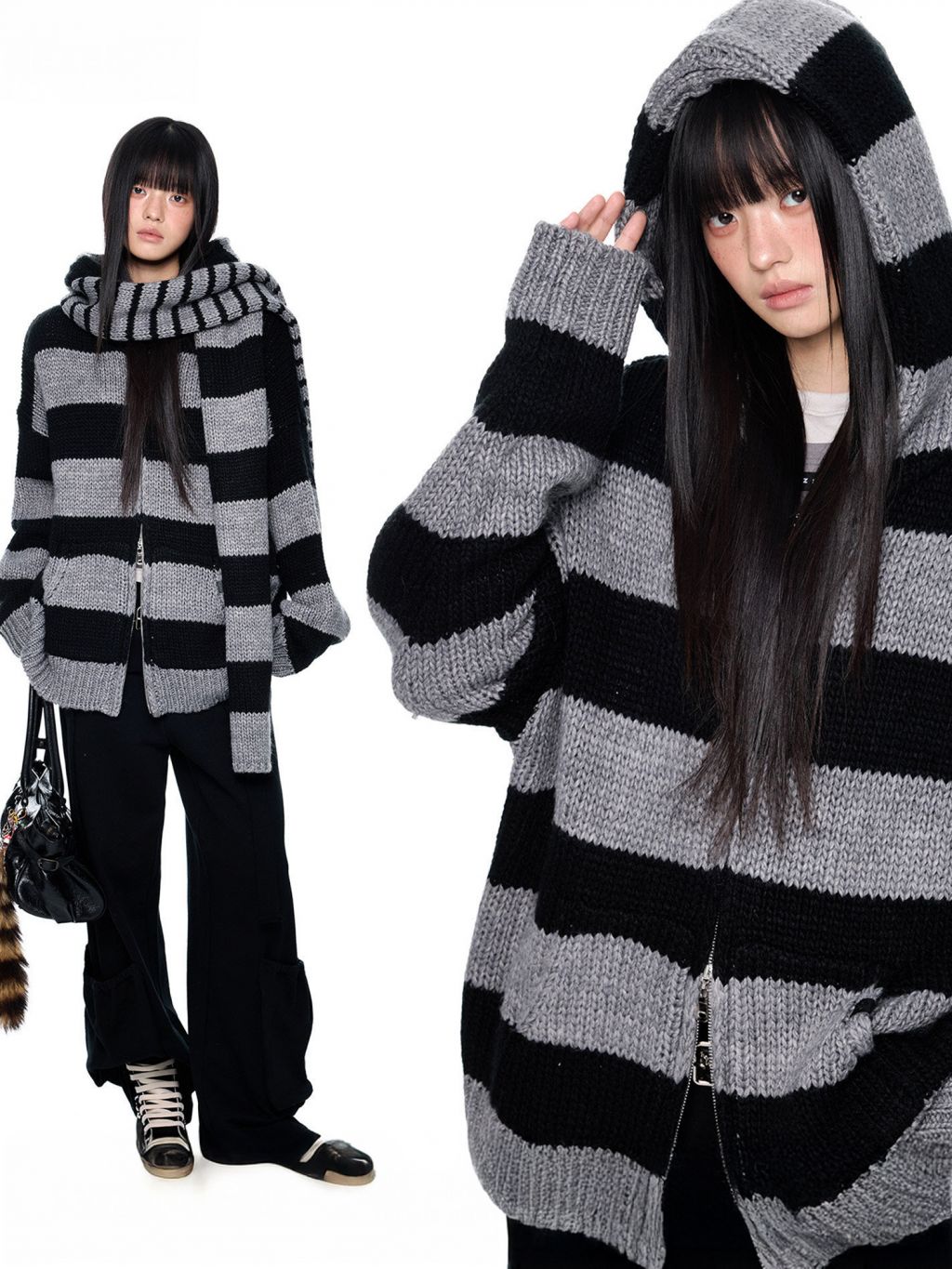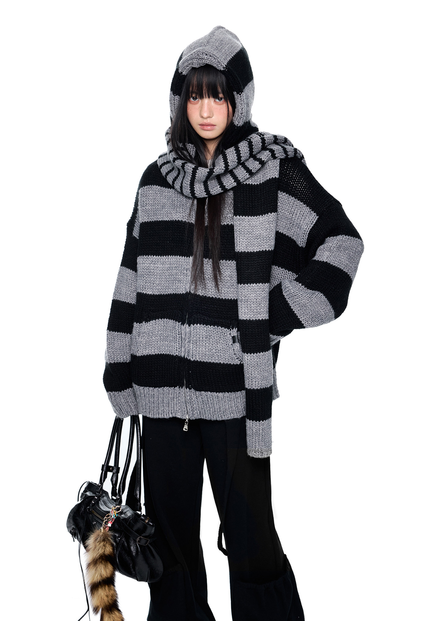 스트라이프 니트 후디에 머플러 디테일을 더해, 레이어드 없이도 스타일이 완성되는 아이템입니다.