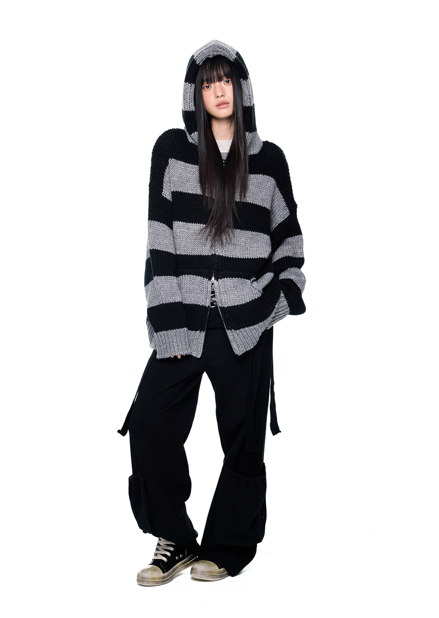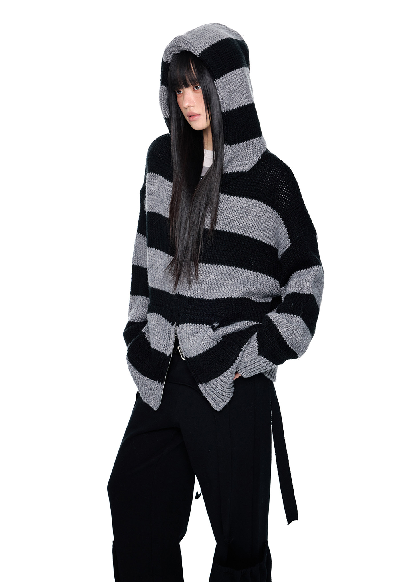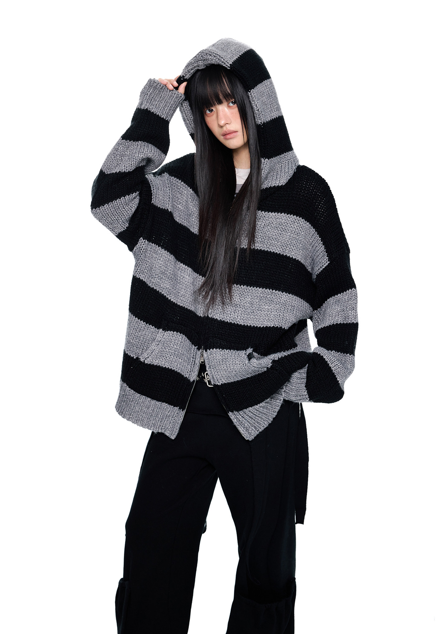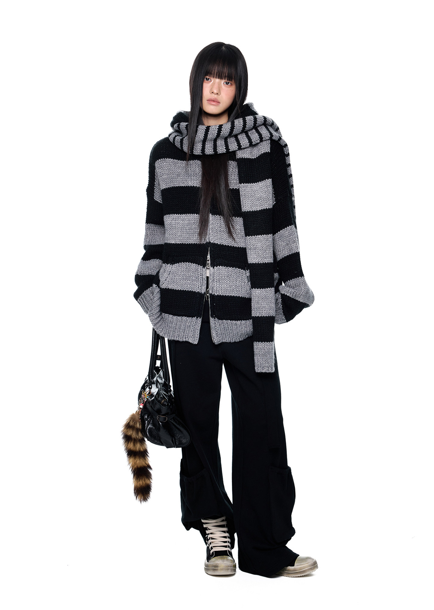 스트라이프 니트 후디에 머플러 디테일을 더해, 레이어드 없이도 스타일이 완성되는 아이템입니다.