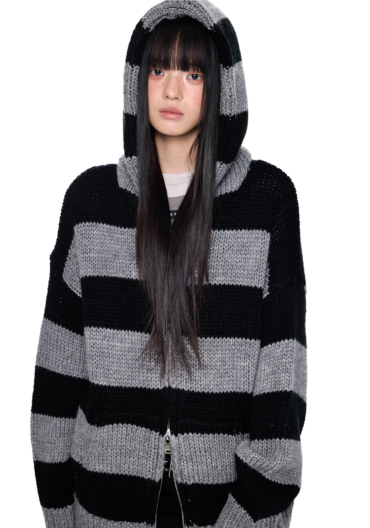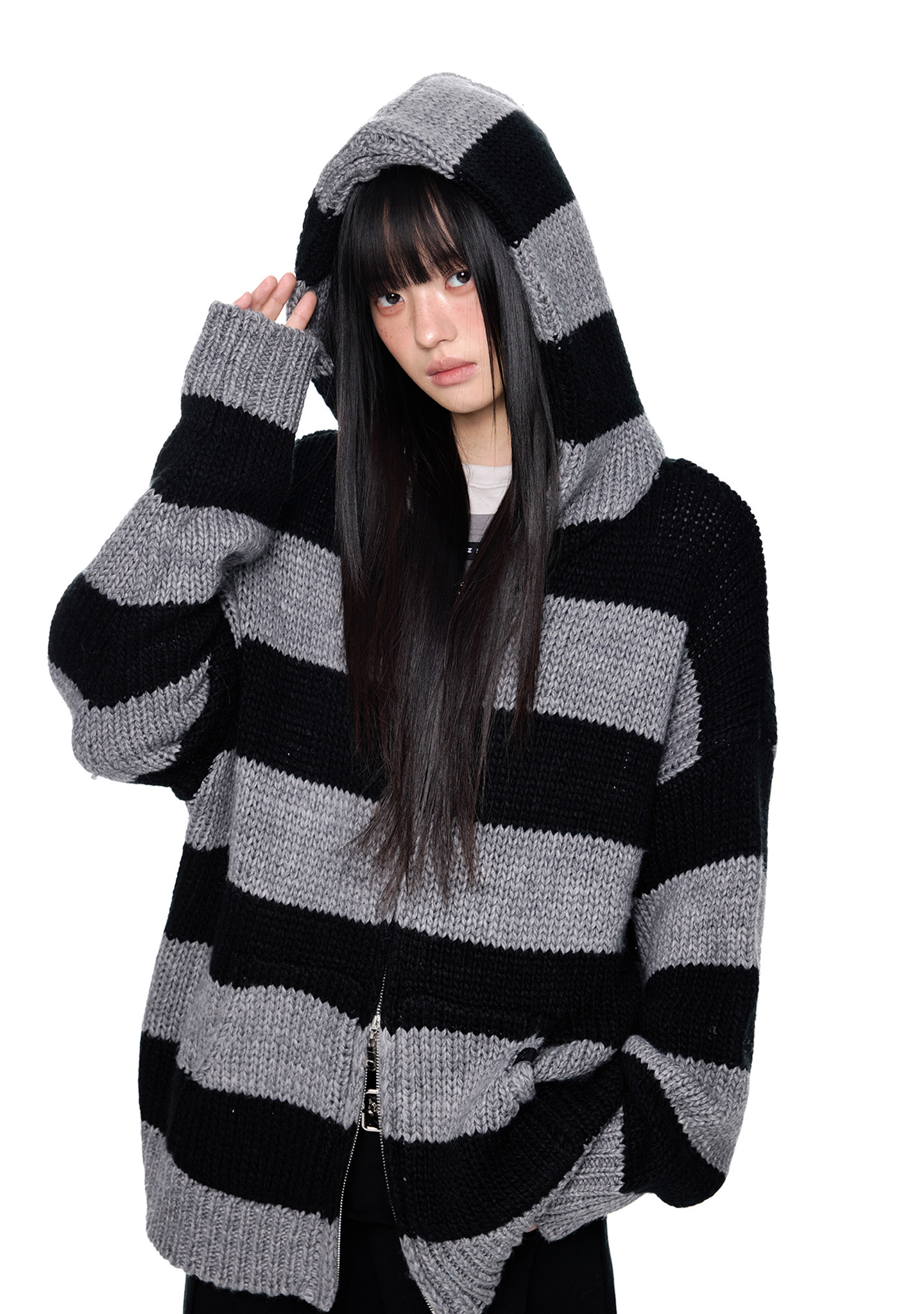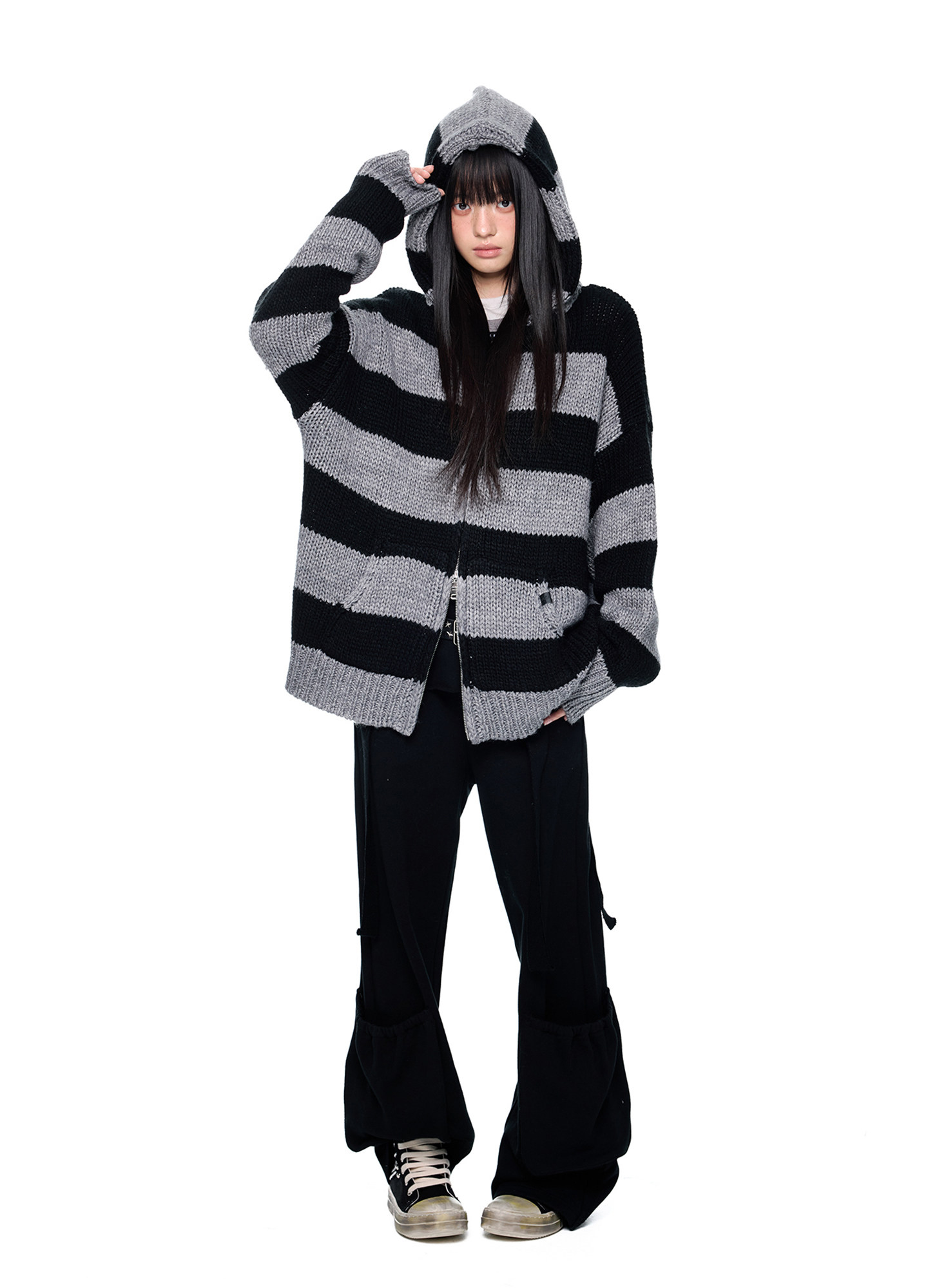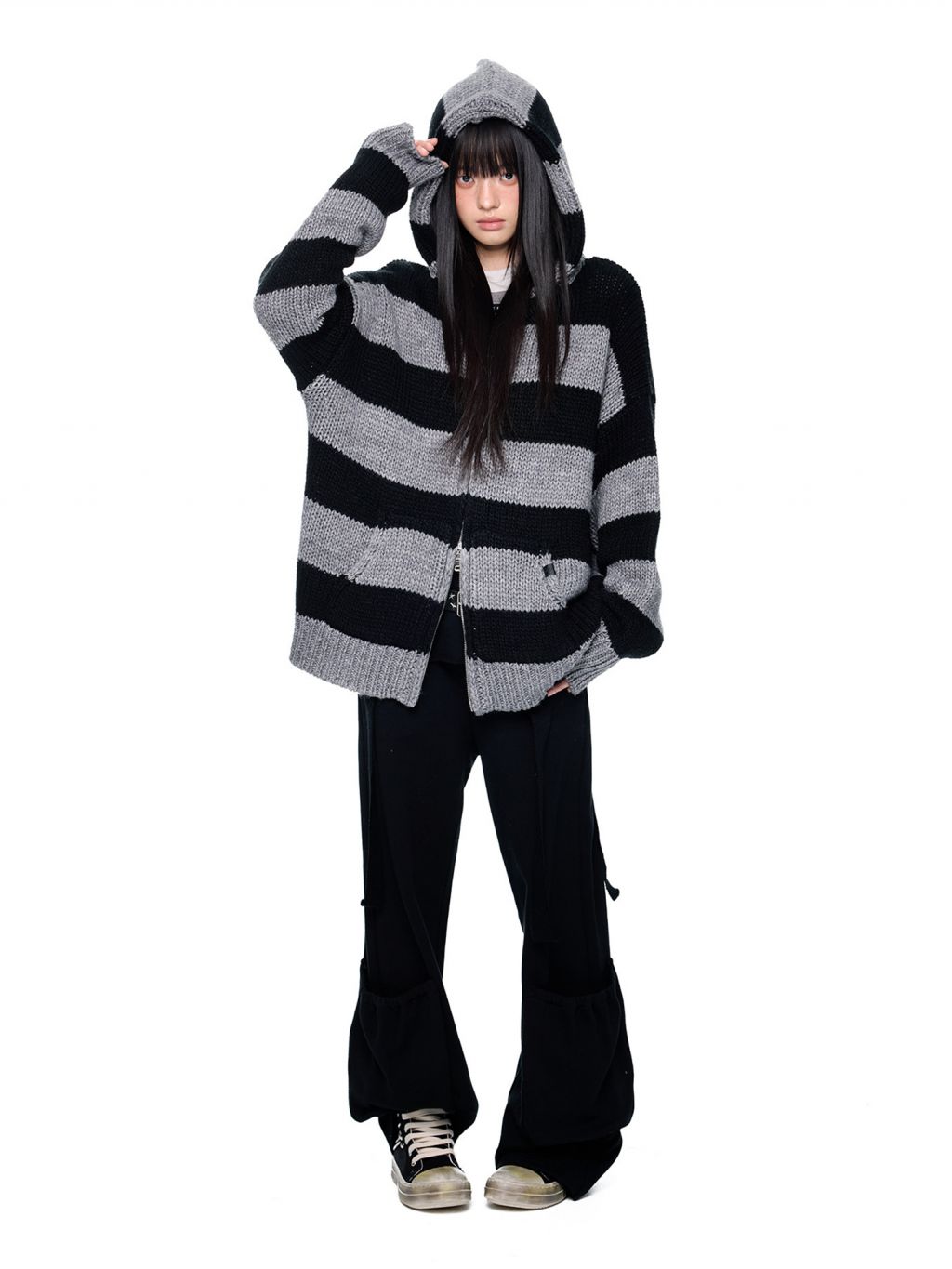 스트라이프 니트 후디에 머플러 디테일을 더해, 레이어드 없이도 스타일이 완성되는 아이템입니다.