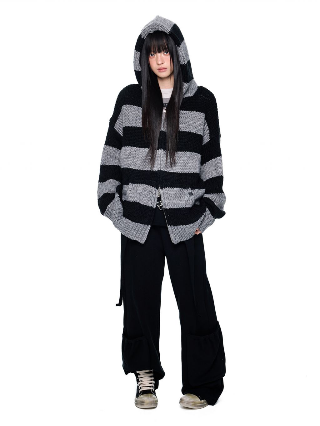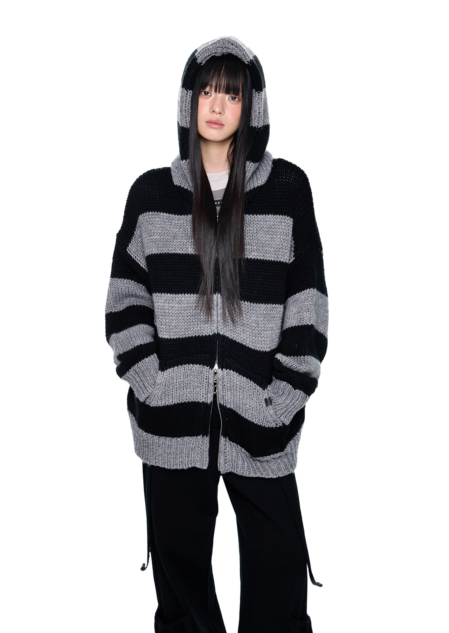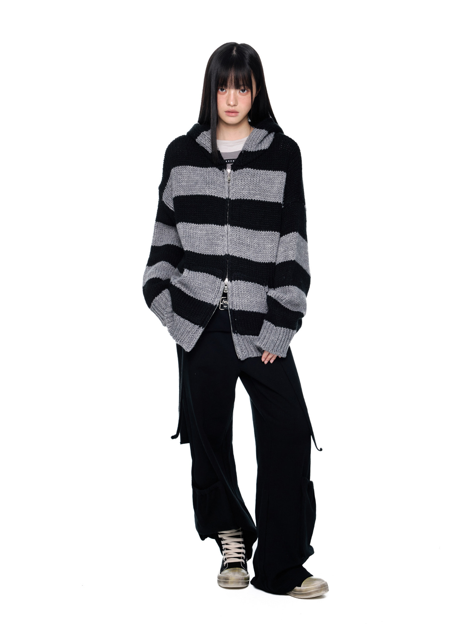 - 블랙 & 그레이 스트라이프 패턴으로 그런지하면서도 차분한 무드 연출