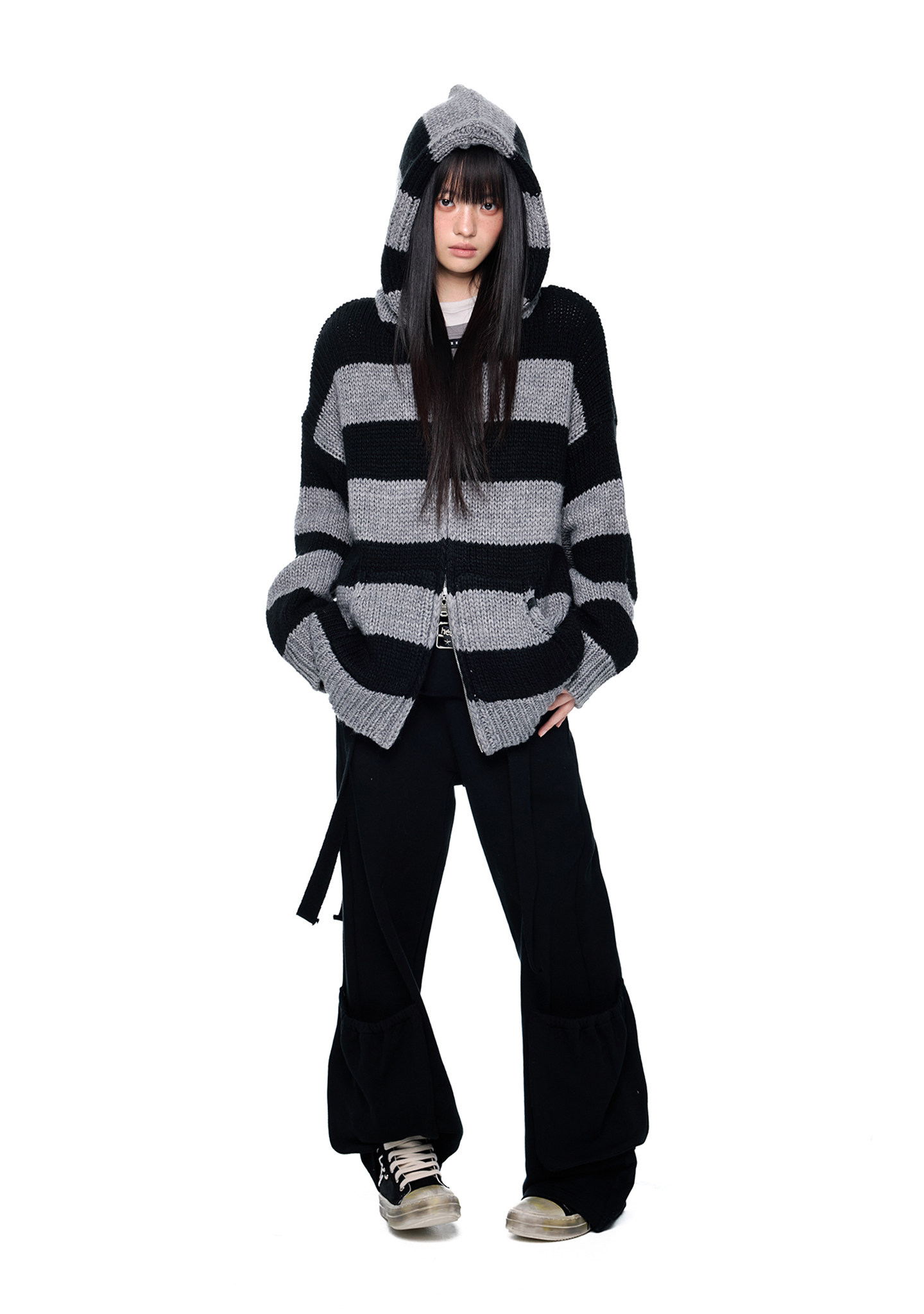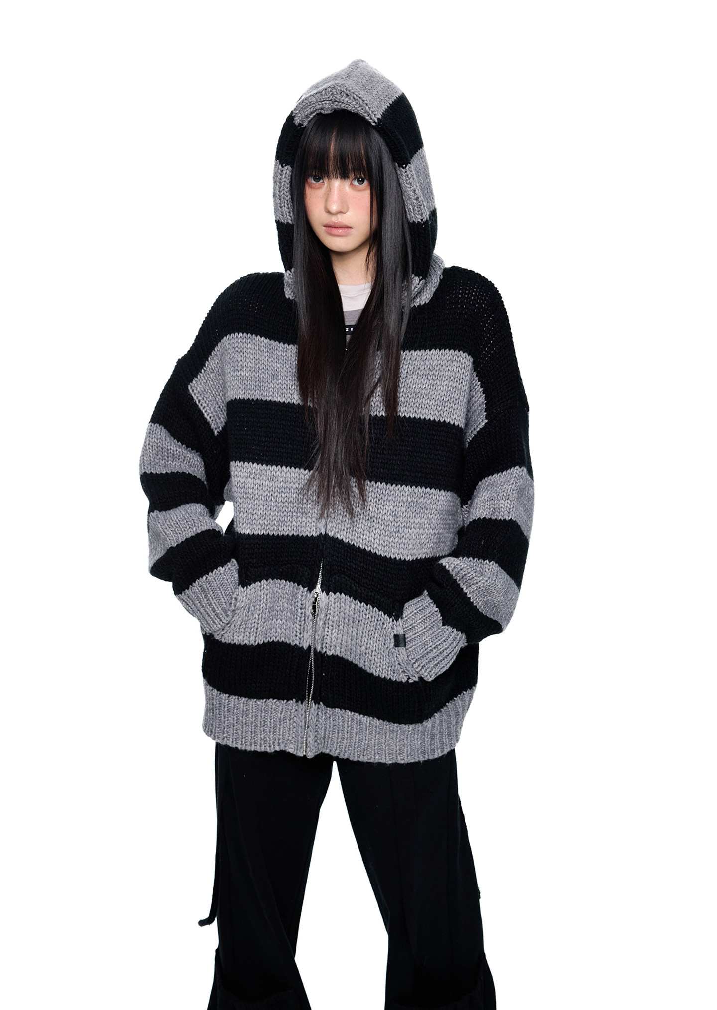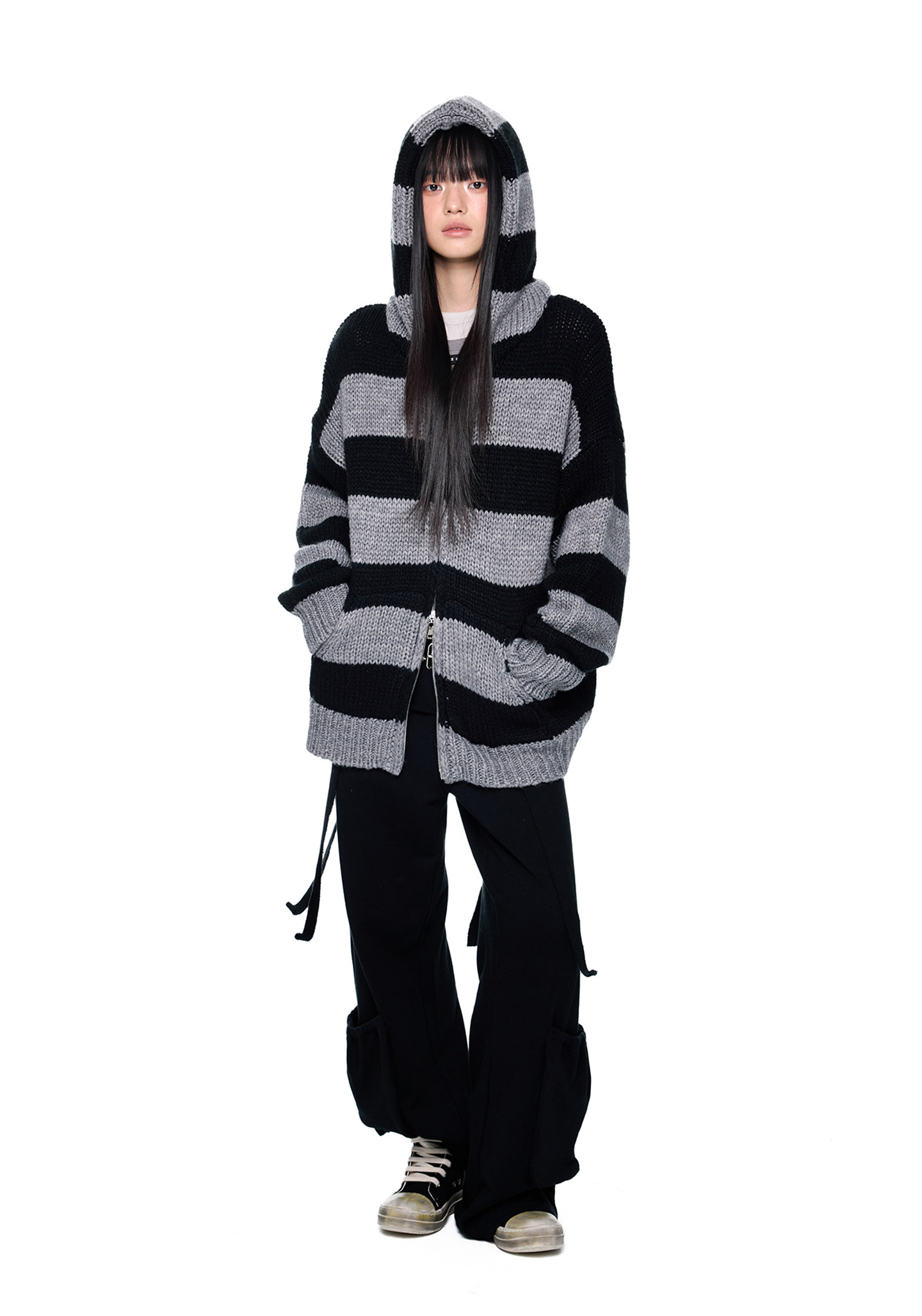 - 블랙 & 그레이 스트라이프 패턴으로 그런지하면서도 차분한 무드 연출