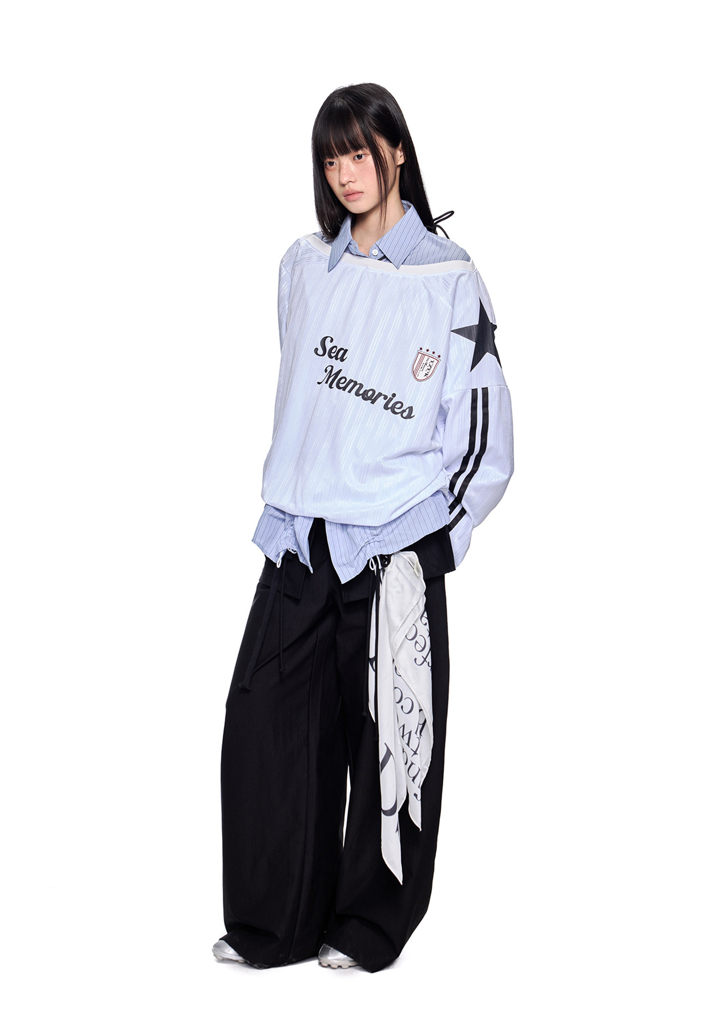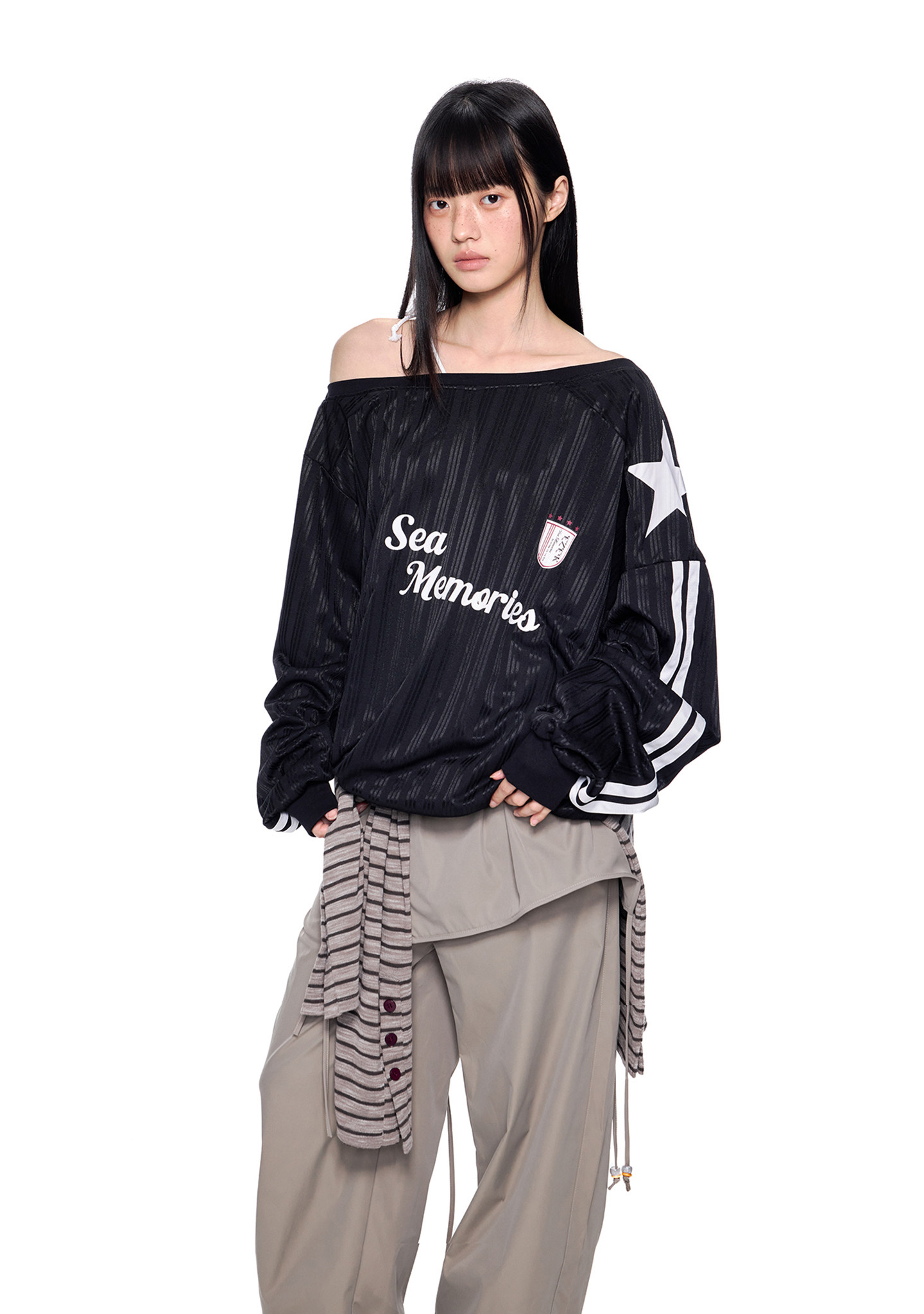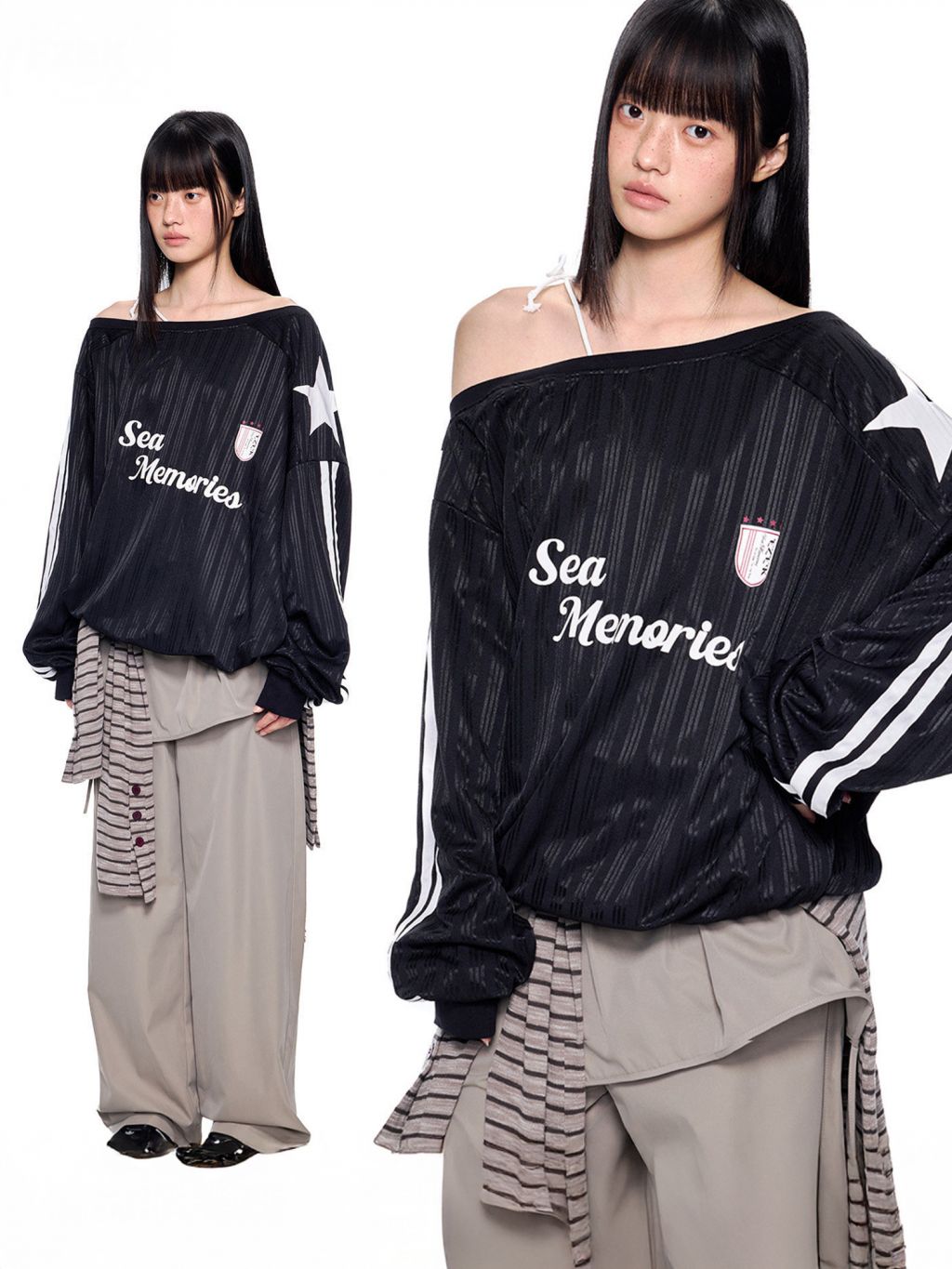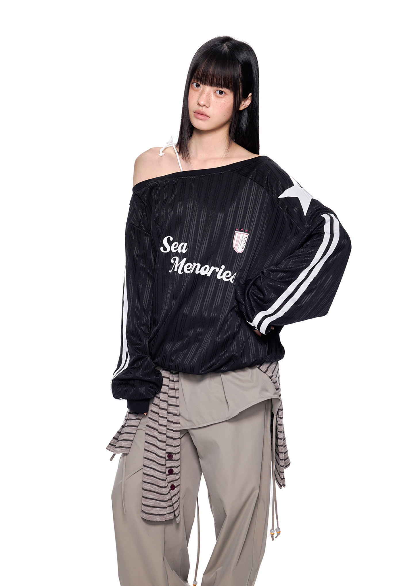 - 소매 라인 스트라이프 & 스타 패치 디테일로 스포티한 무드 강조
