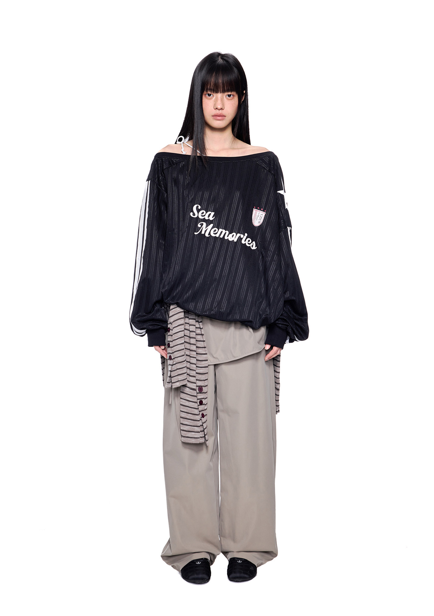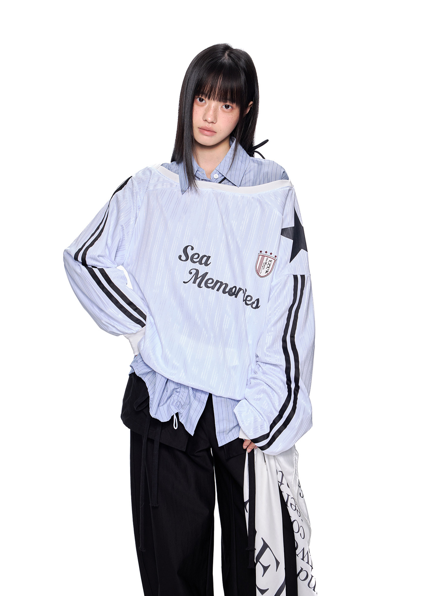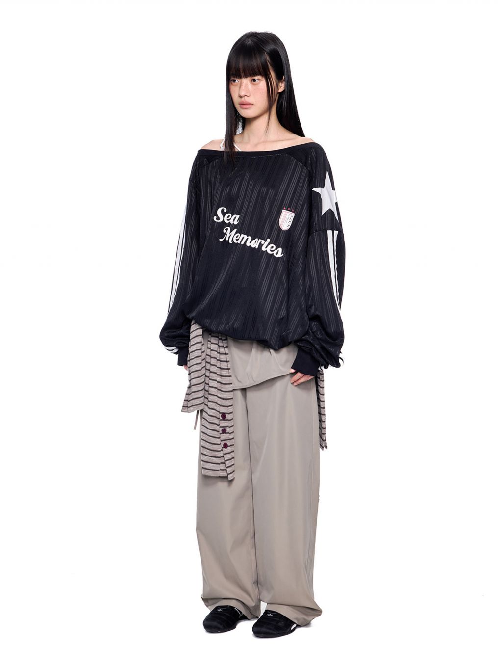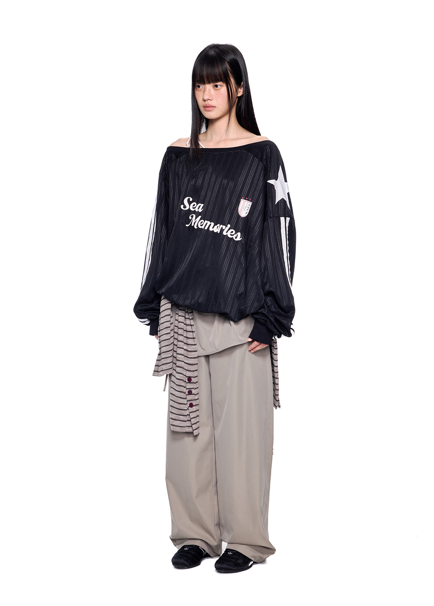 - 소매 라인 스트라이프 & 스타 패치 디테일로 스포티한 무드 강조