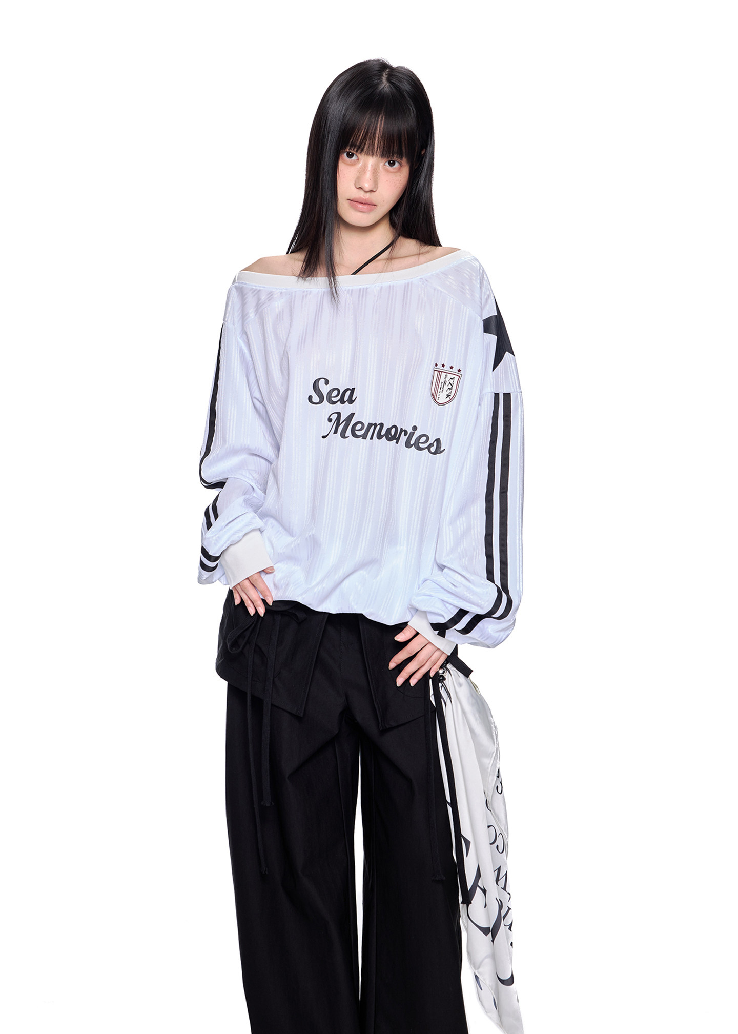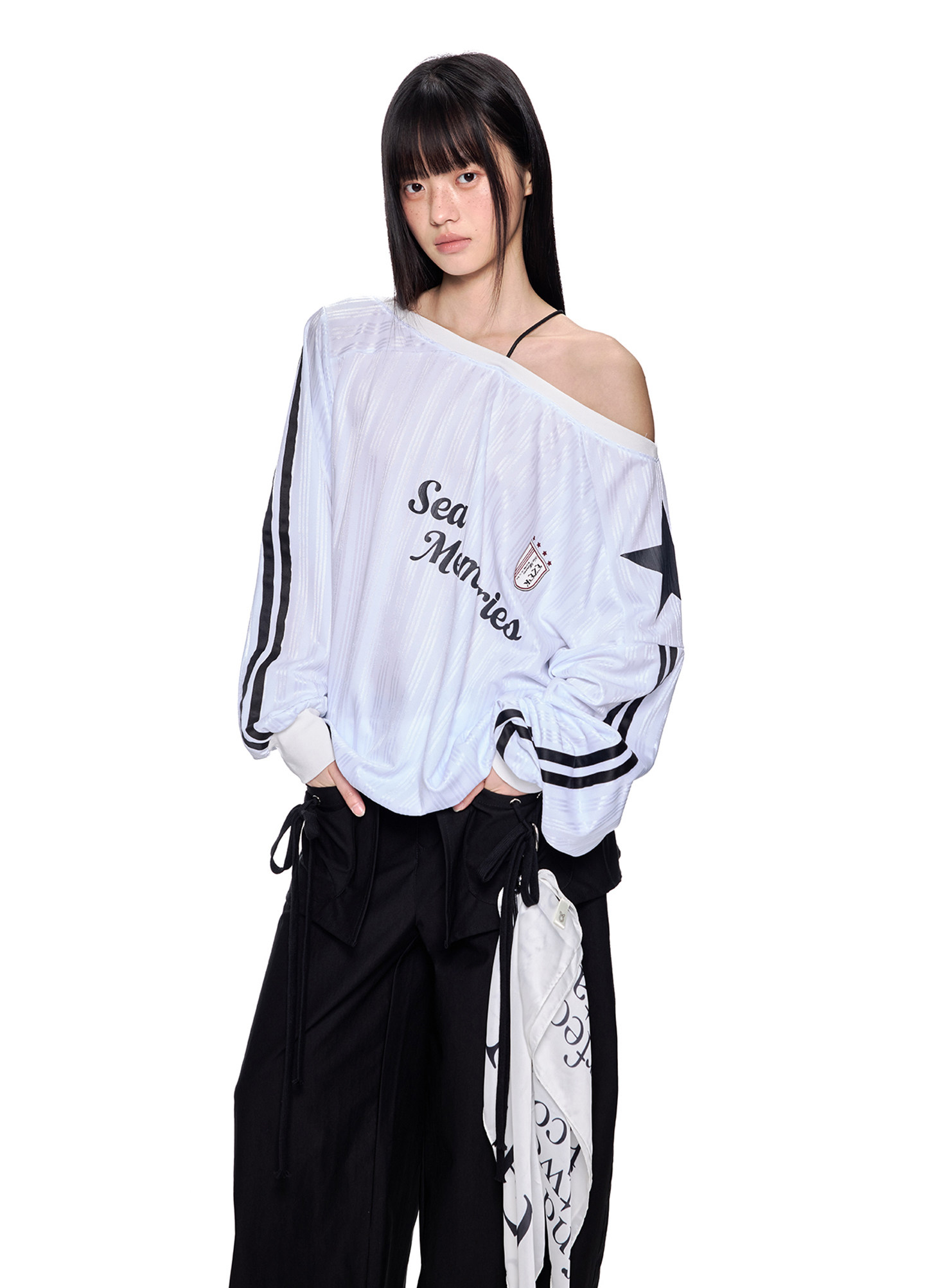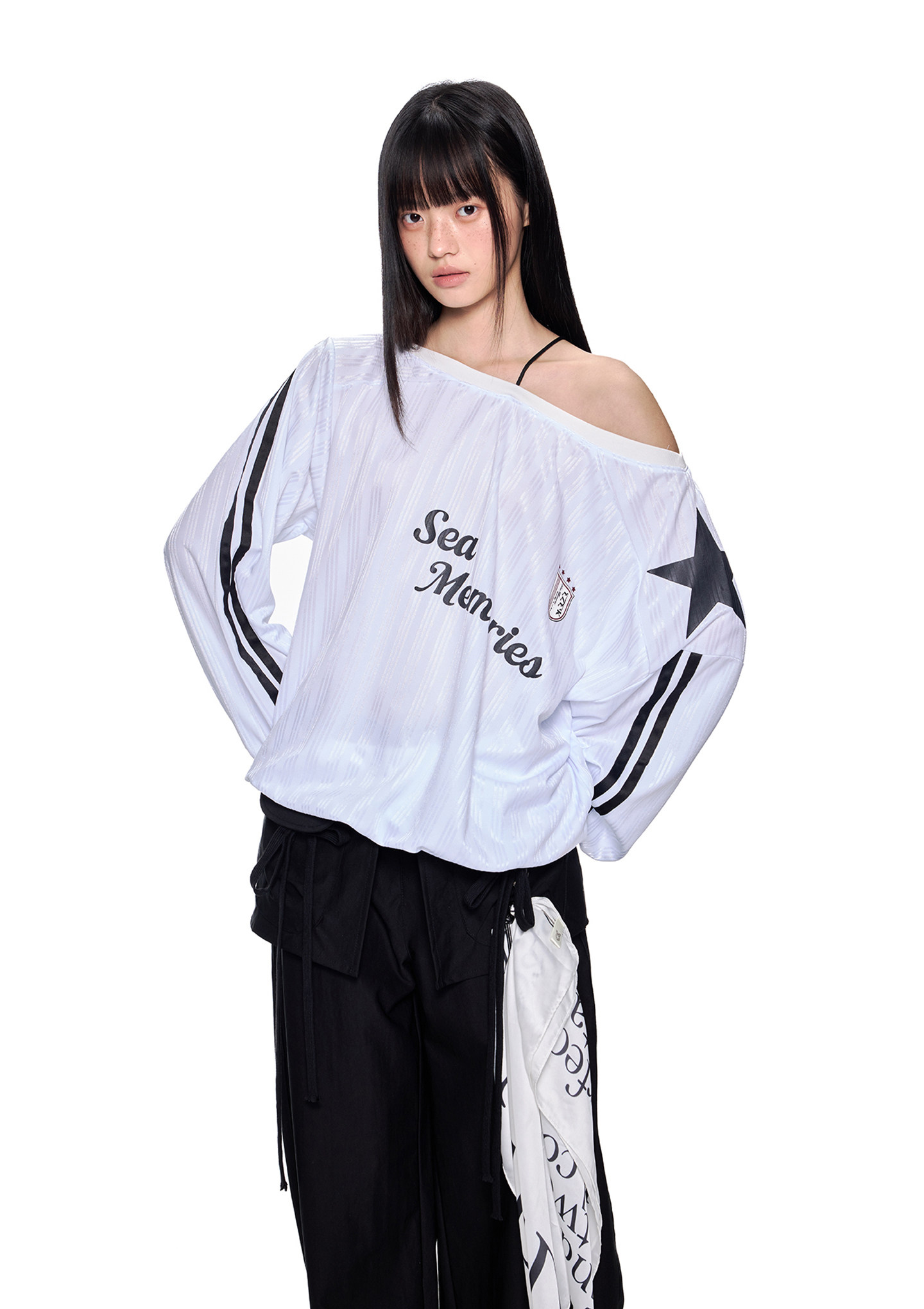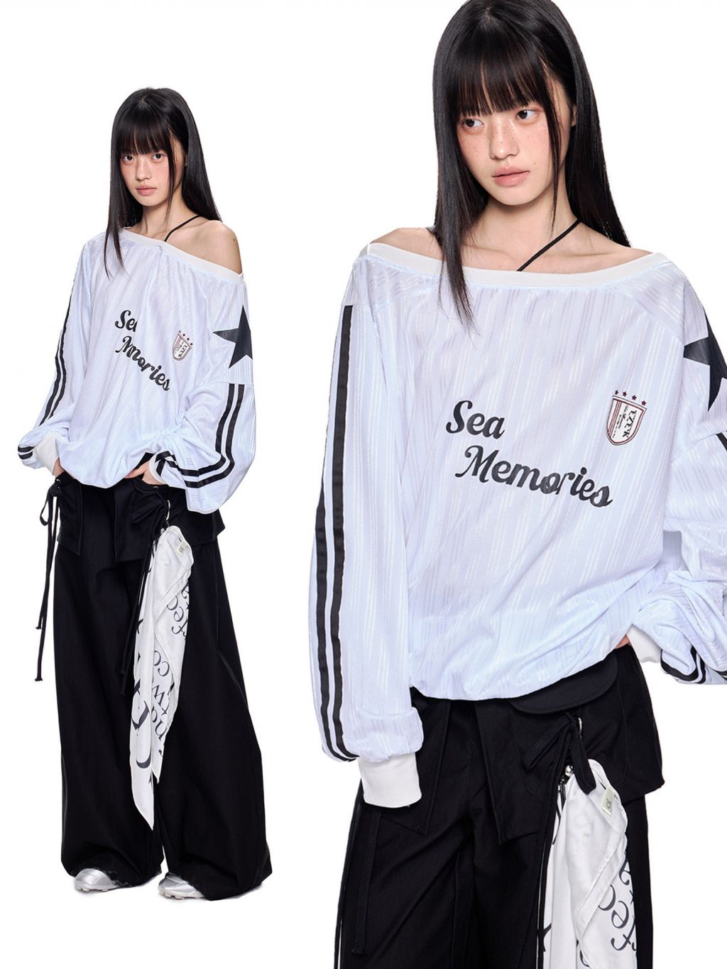 스포티한 그래픽과 오프숄더 실루엣이 결합된 블록코어 무드의 루즈 핏 티셔츠입니다.
