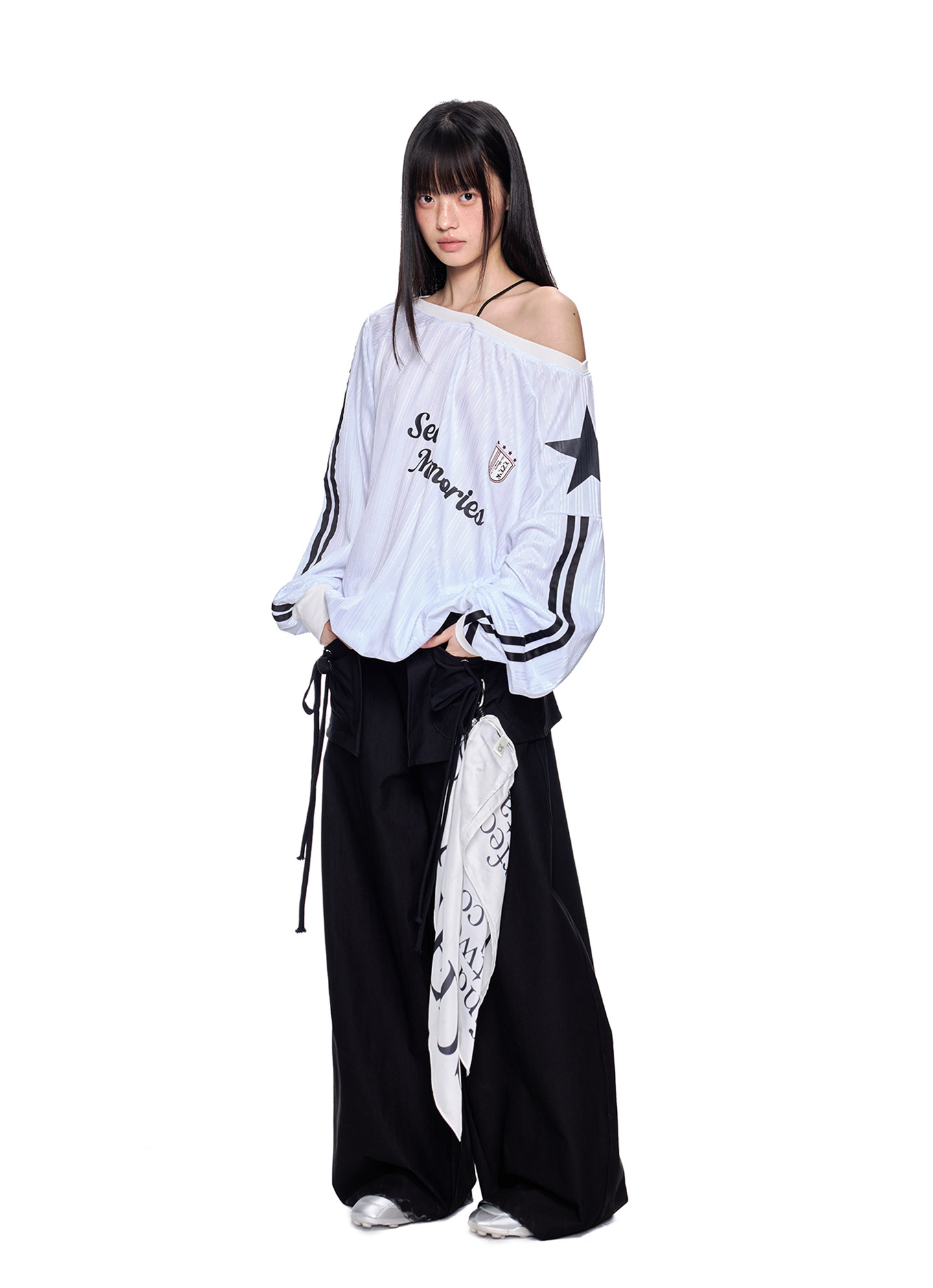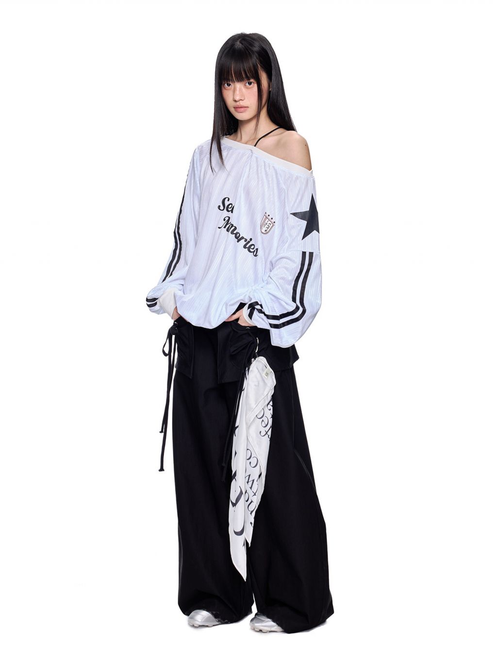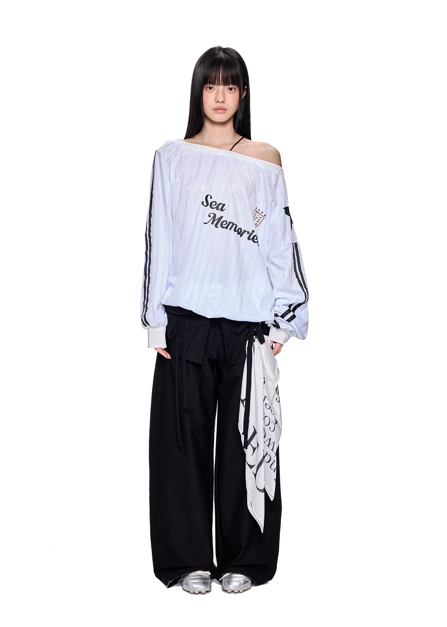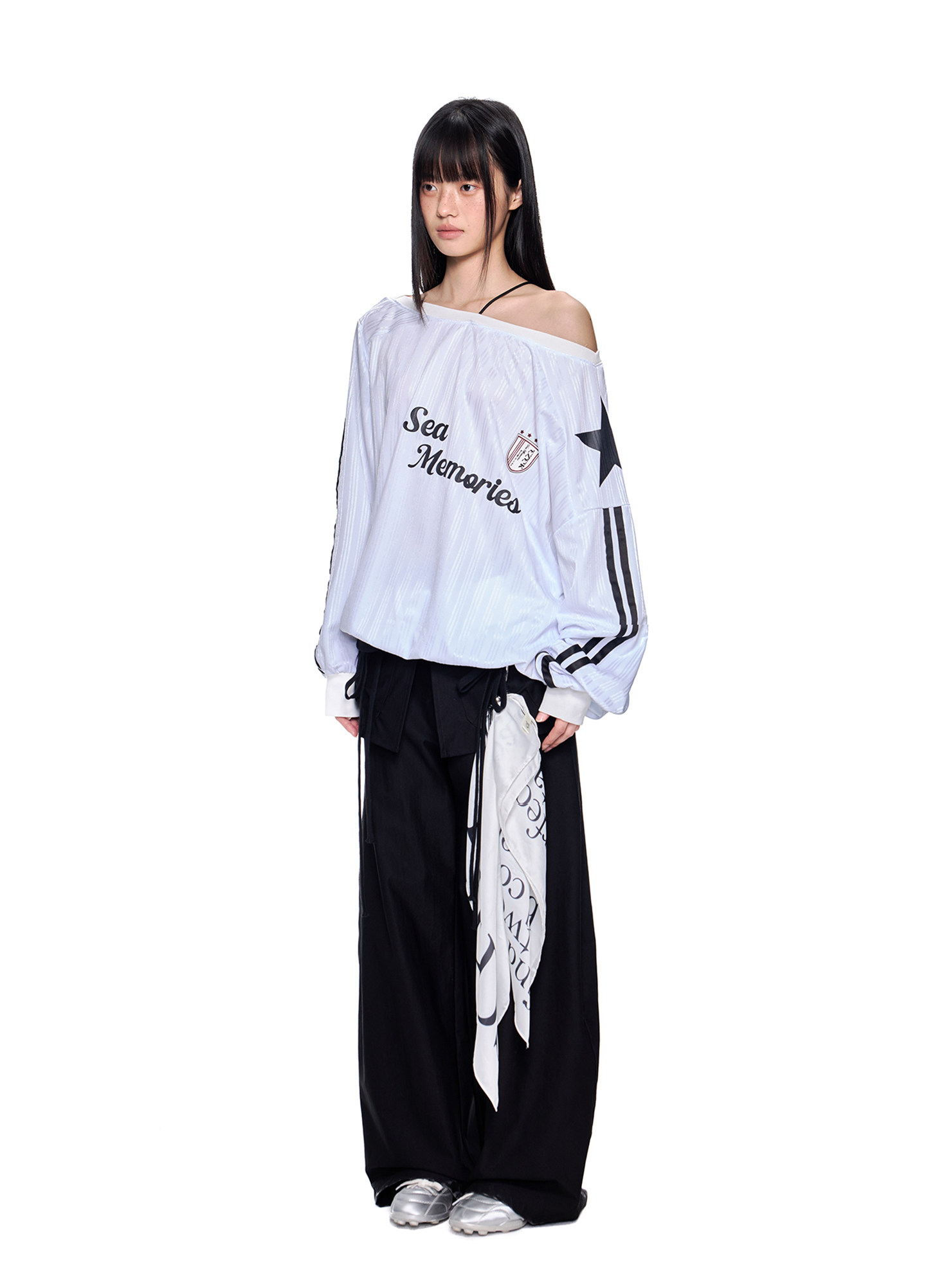 스포티한 그래픽과 오프숄더 실루엣이 결합된 블록코어 무드의 루즈 핏 티셔츠입니다.