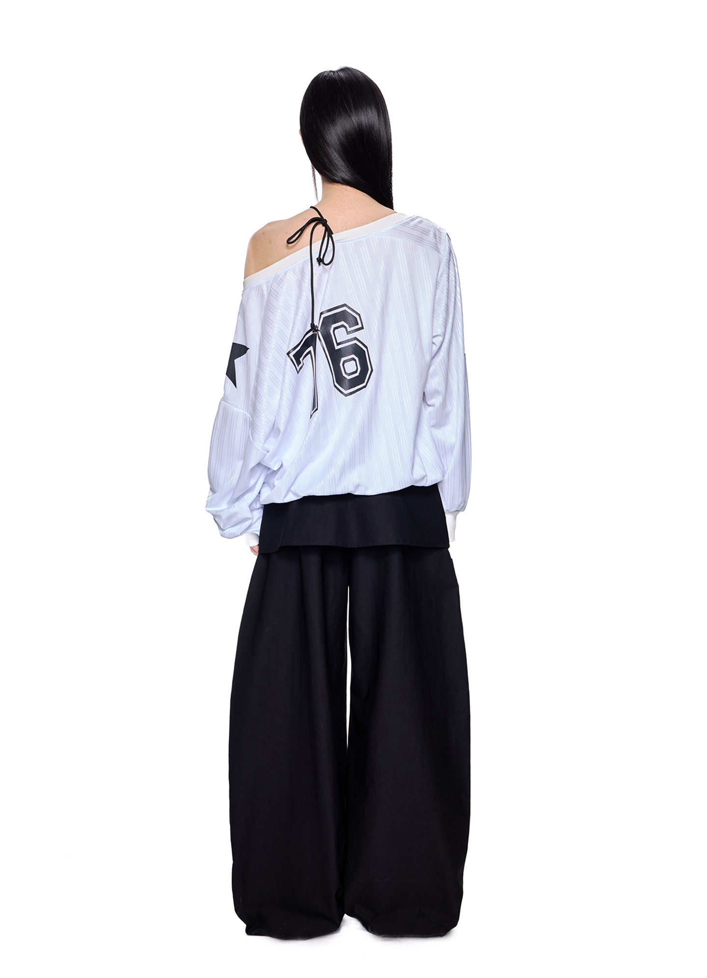 - 자연스럽게 흘러내리는 오프숄더 넥라인으로 쿨한 스타일 연출