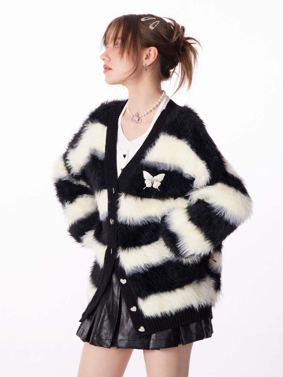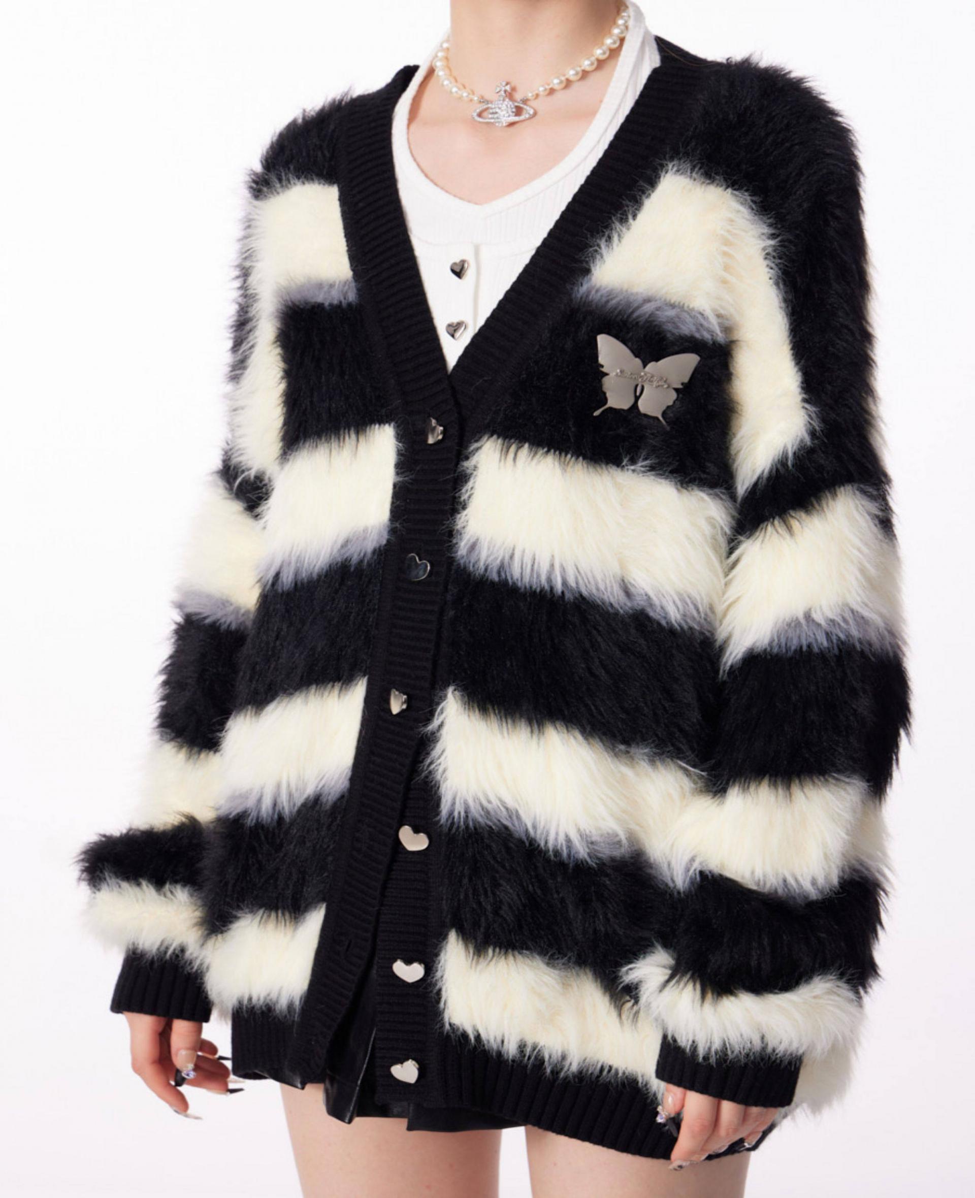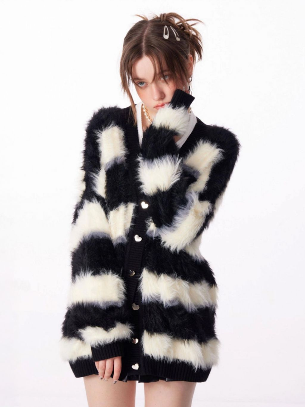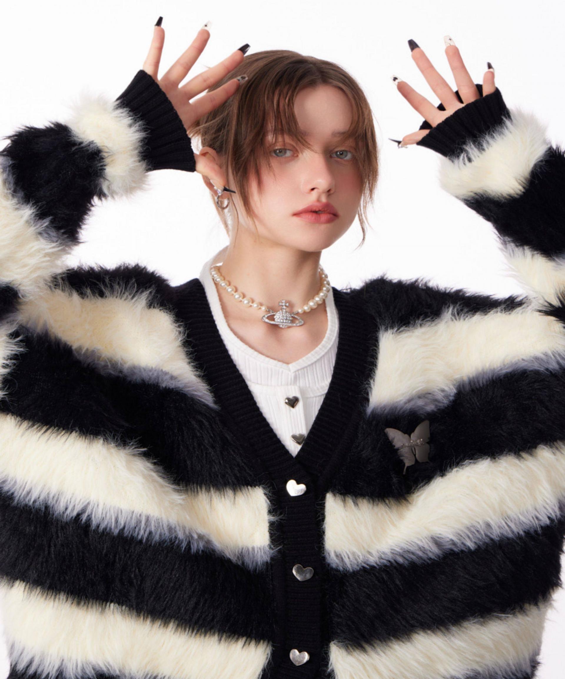 포근한 퍼 텍스처와 스트라이프 패턴이 어우러져, 러블리하면서도 빈티지한 무드를 완성하는 가디건입니다.